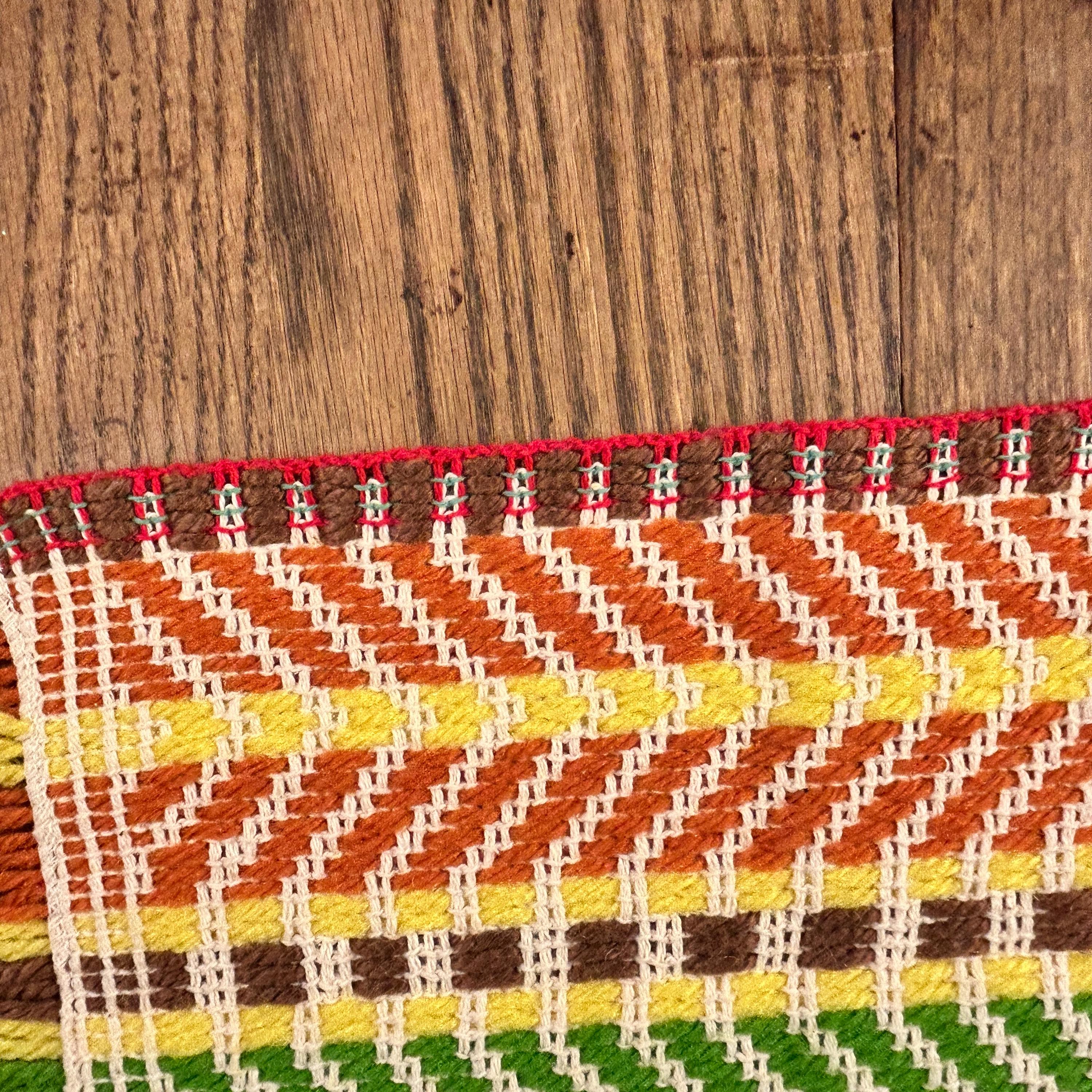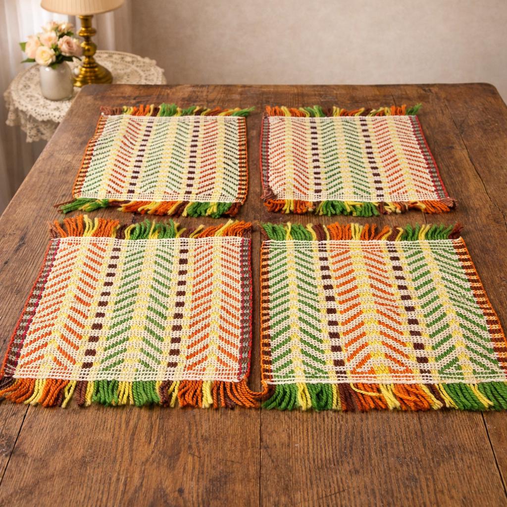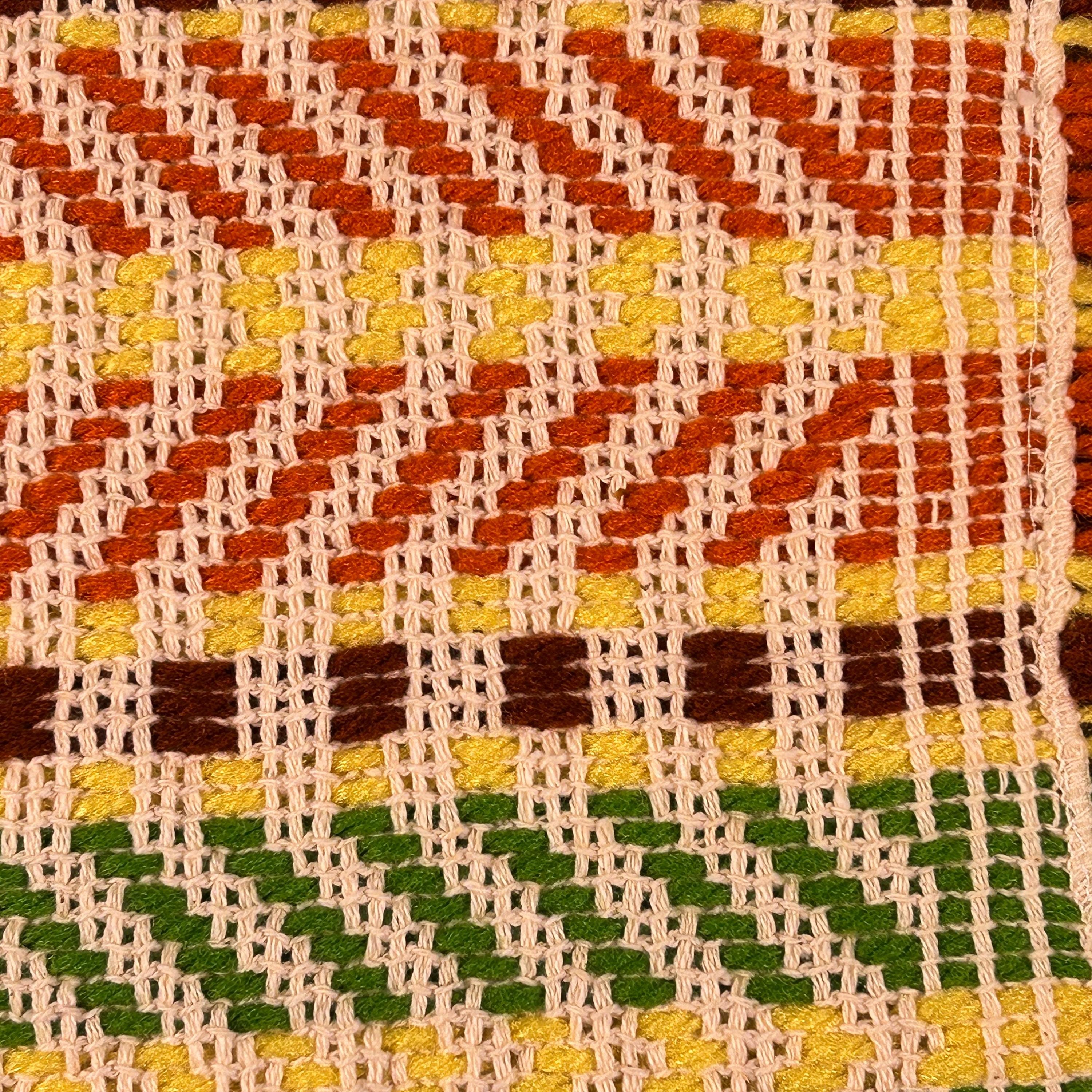 Either way you flip 'em, they're groovy as all get out. These placemats appear to have been handwoven. They are in the classic 70s color scheme - yellow, brown, orange, and green woven with beige yarn to highlight the woven design.
