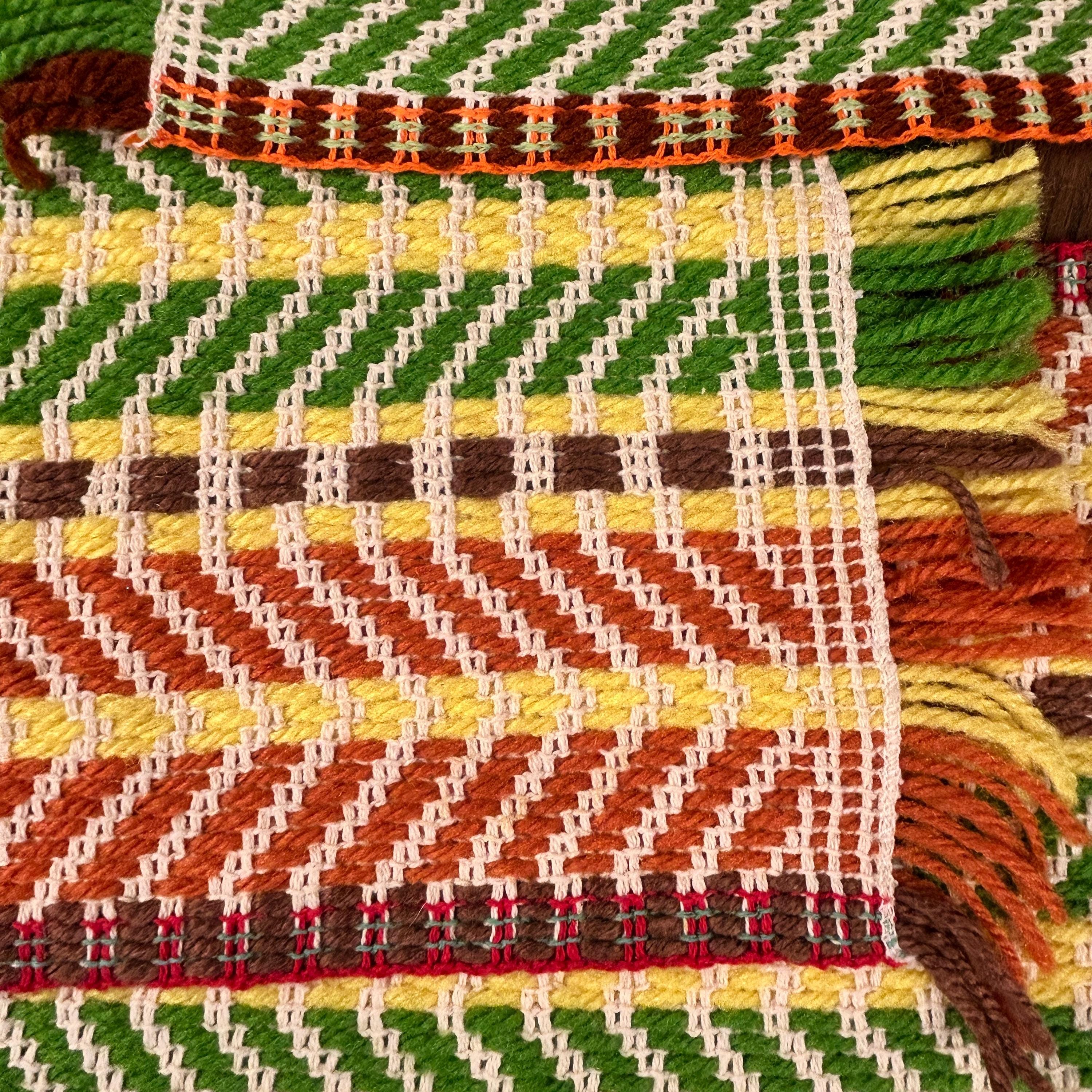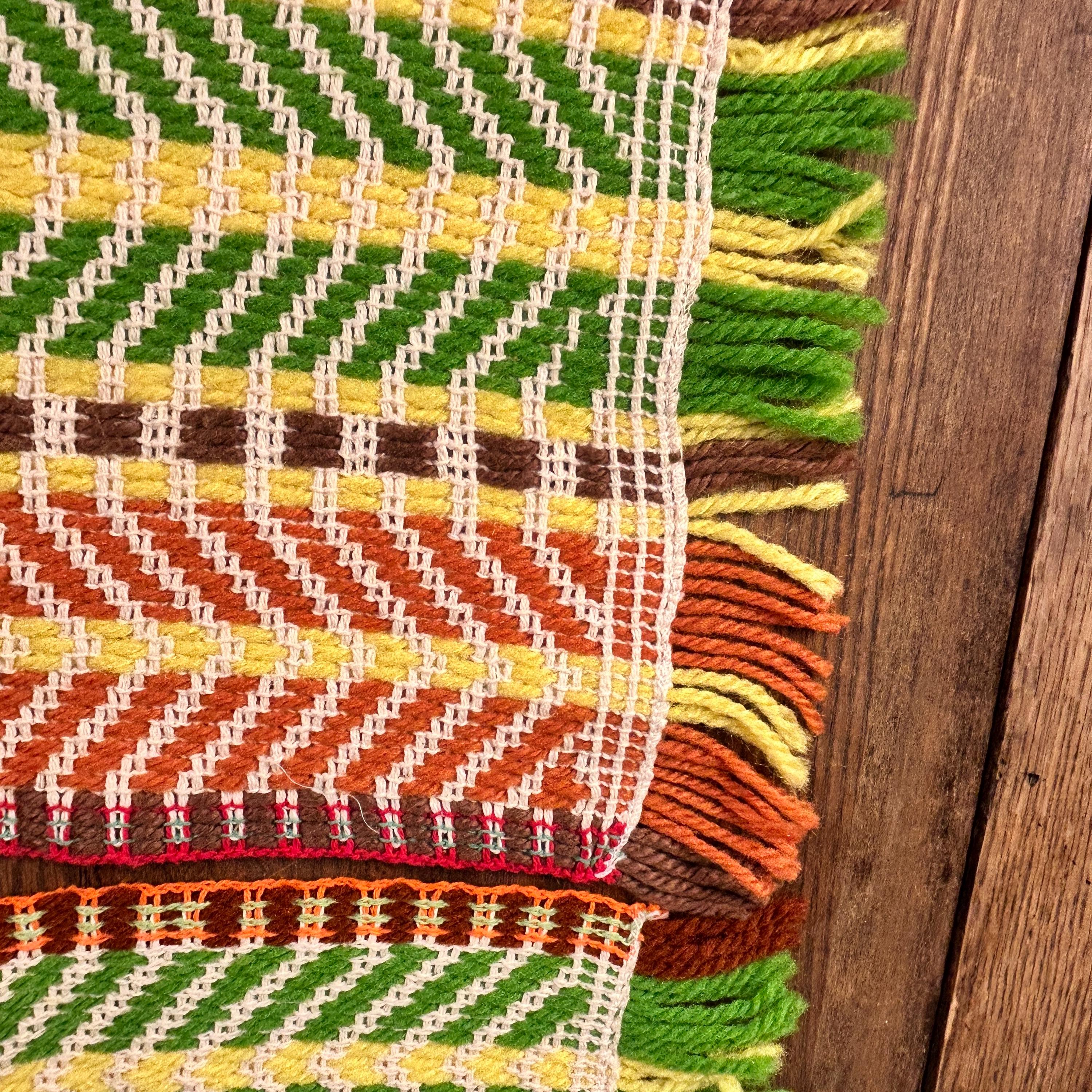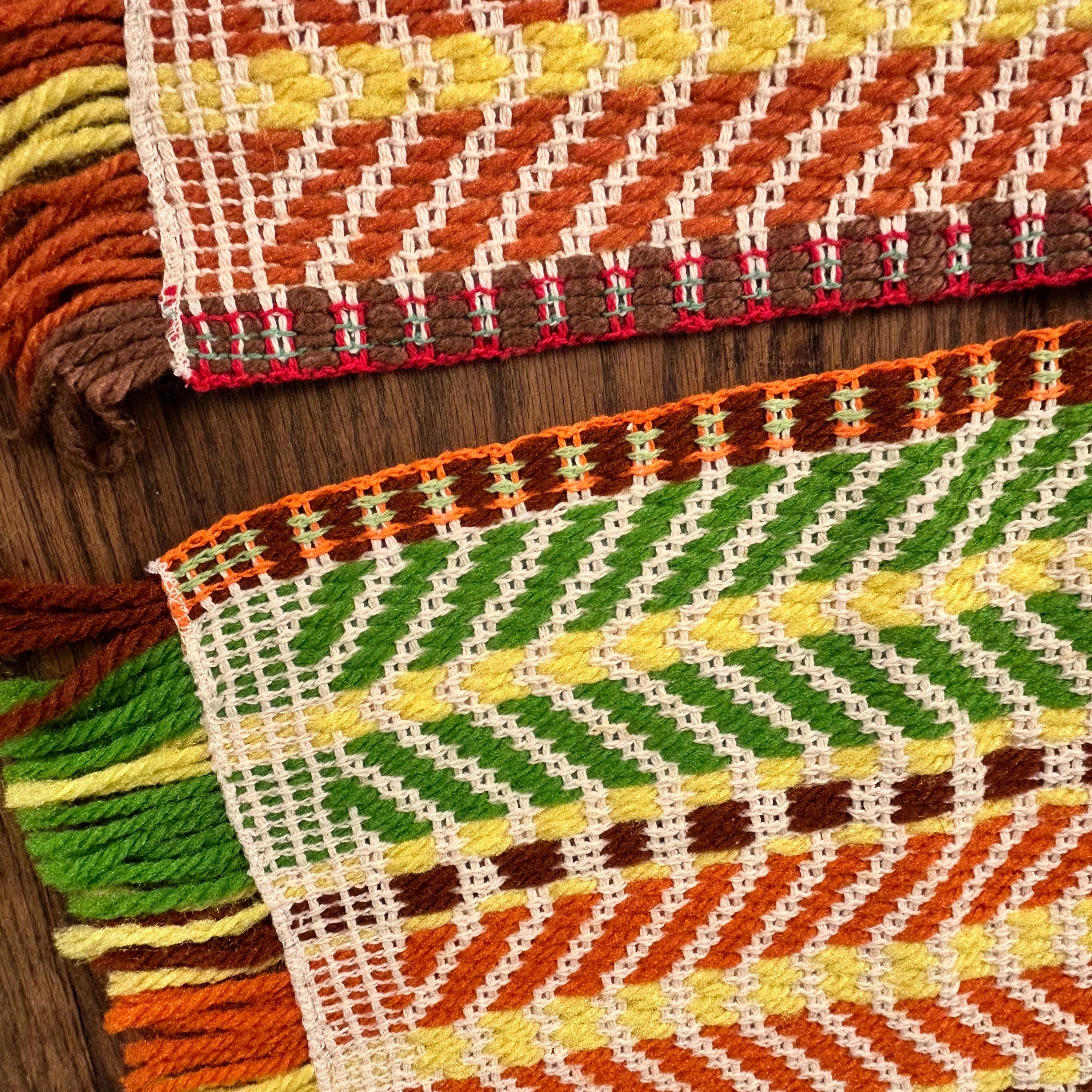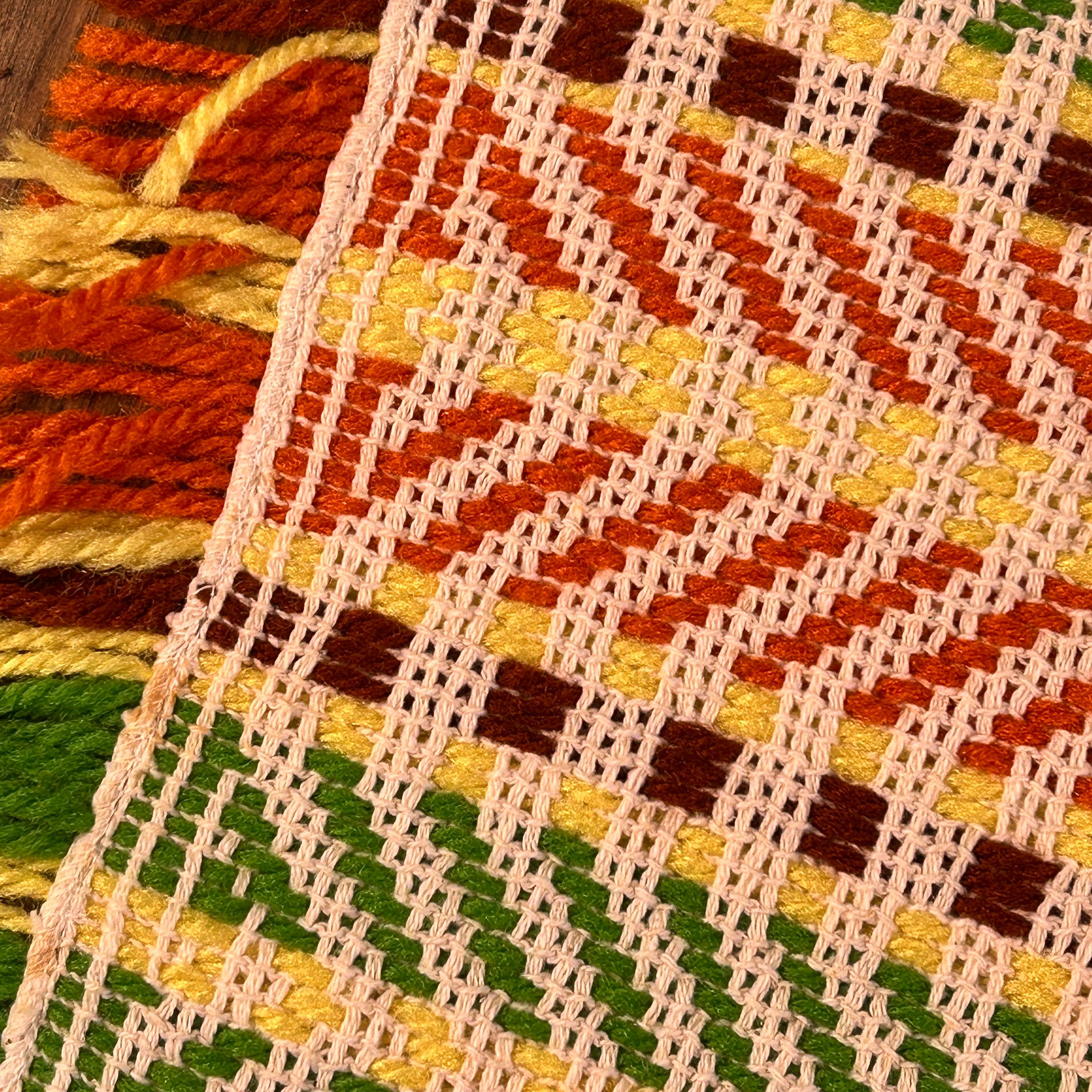 Either way you flip 'em, they're groovy as all get out. These placemats appear to have been handwoven. They are in the classic 70s color scheme - yellow, brown, orange, and green woven with beige yarn to highlight the woven design.