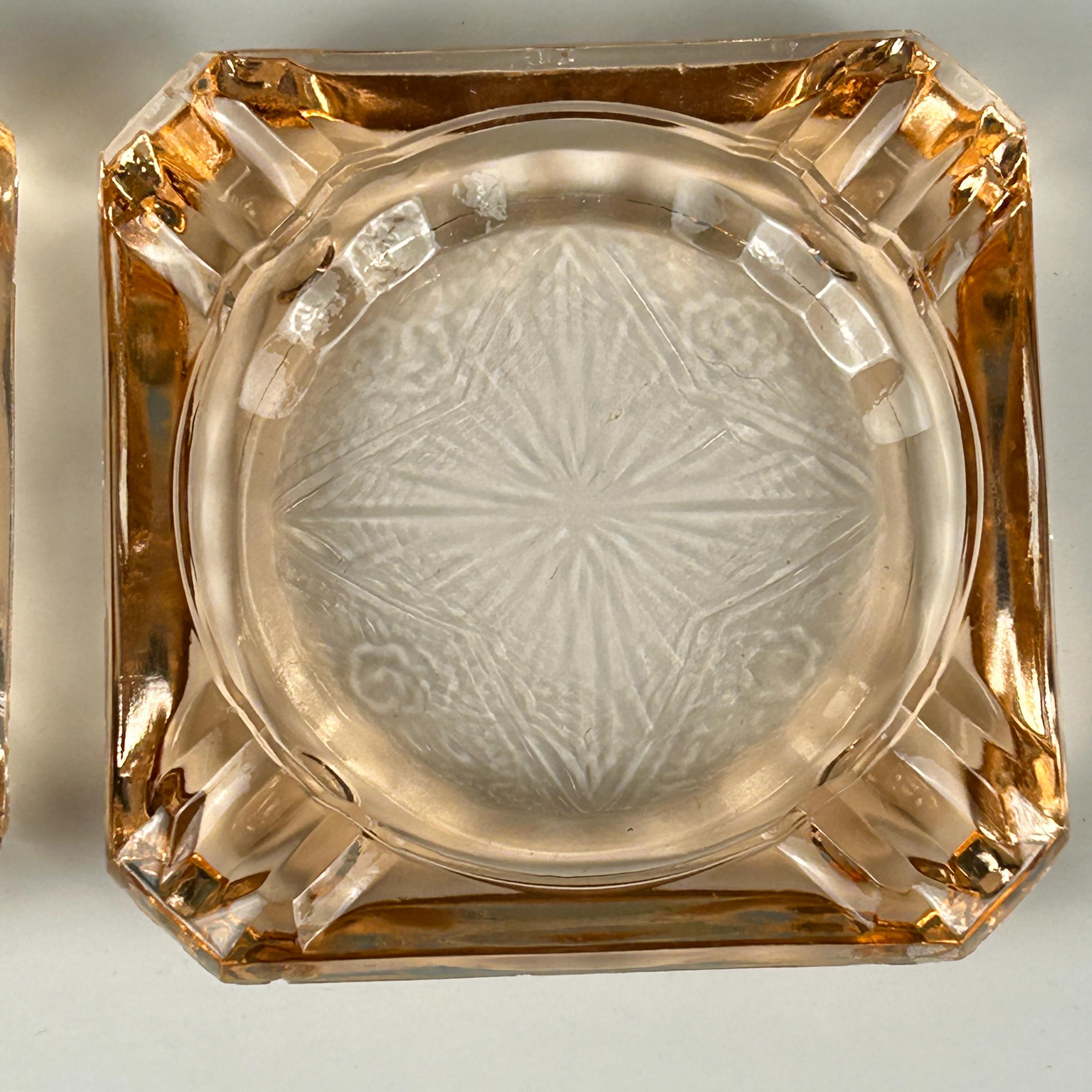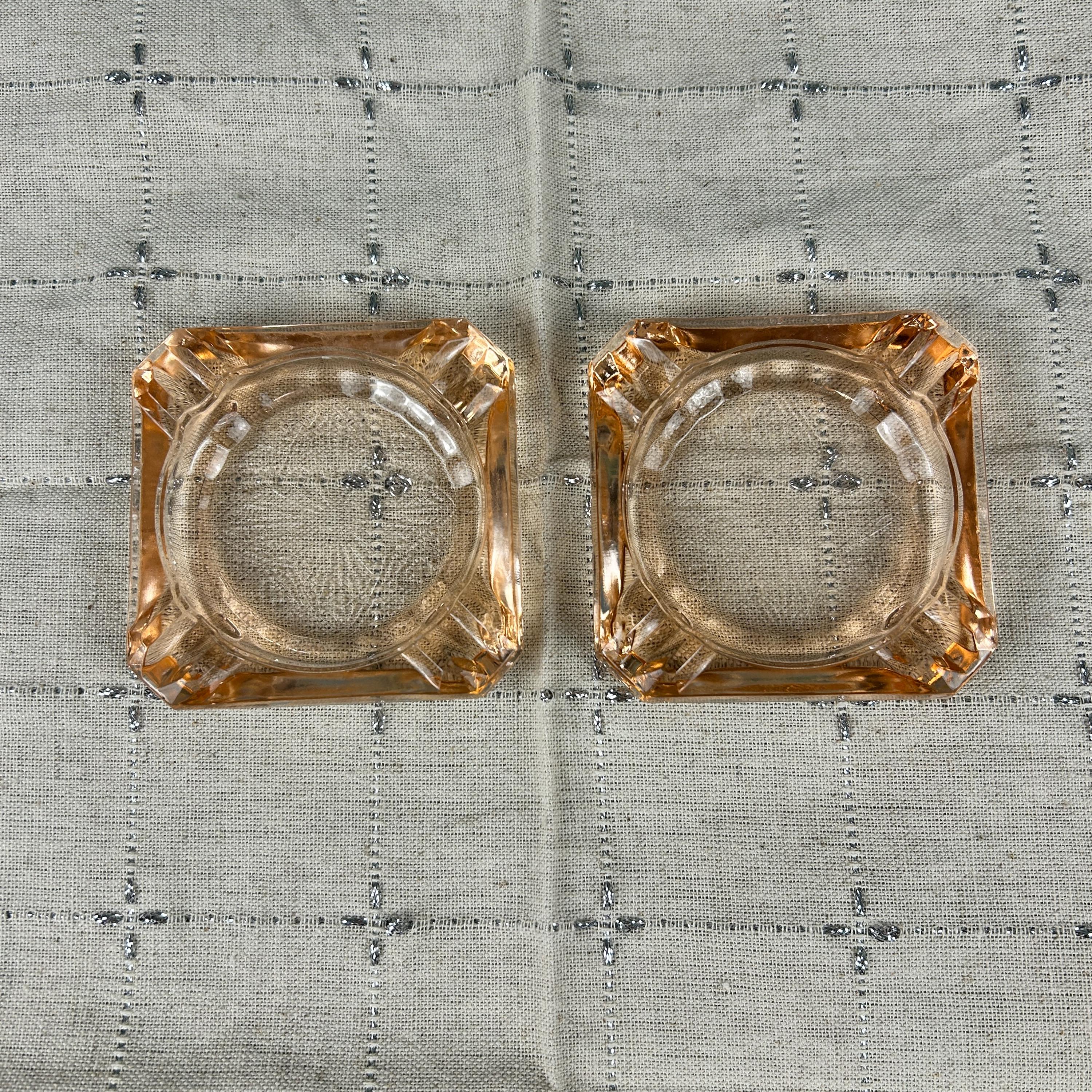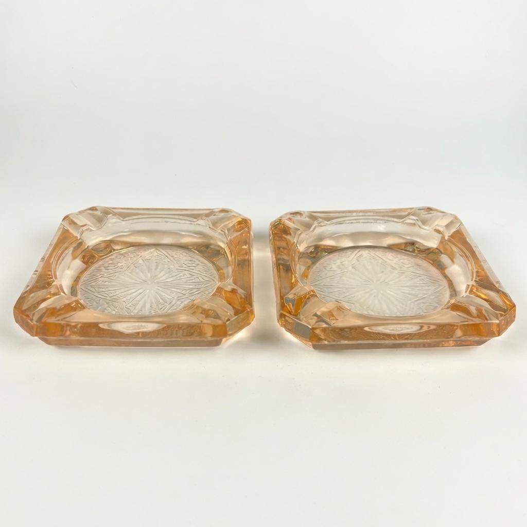 The ashtray edges are raised, thick pink glass with a cigarette rest indention in each corner. Each ashtray measures 3-1/4" square and is about 1/2" high measuring from the surface.