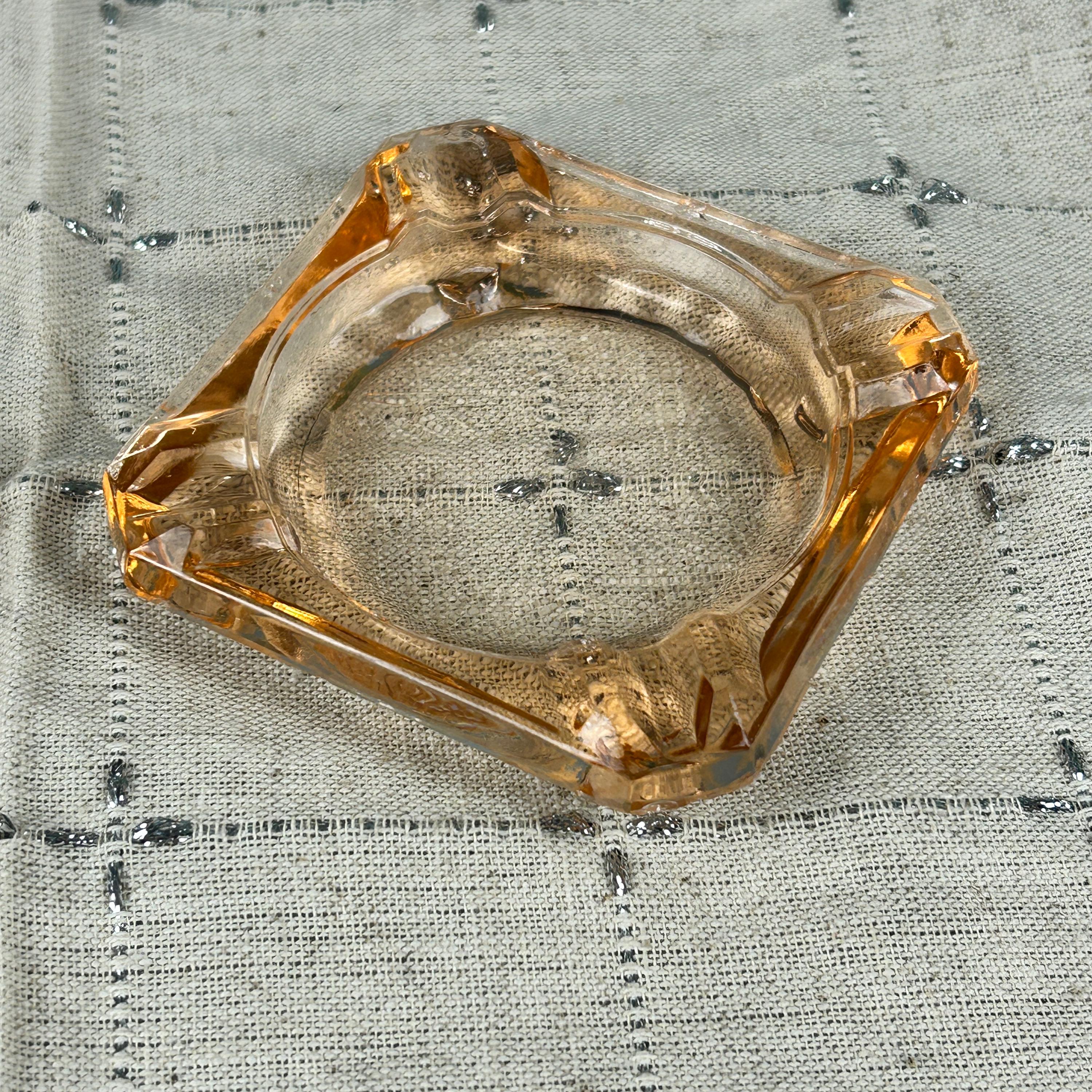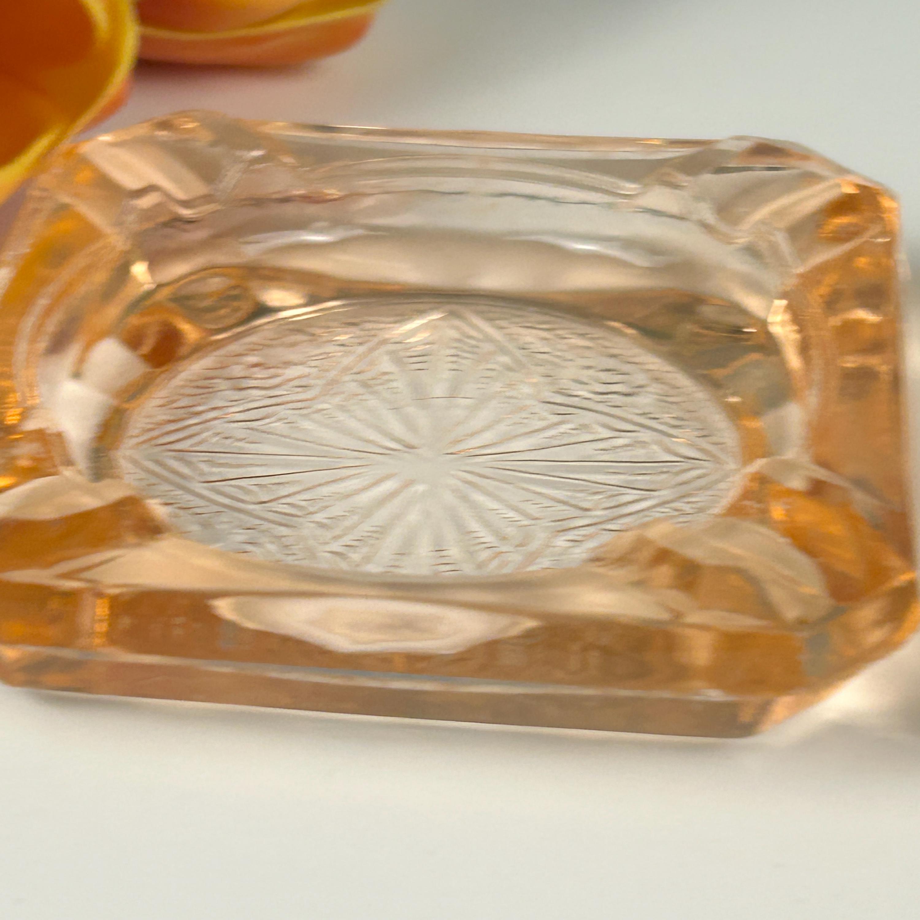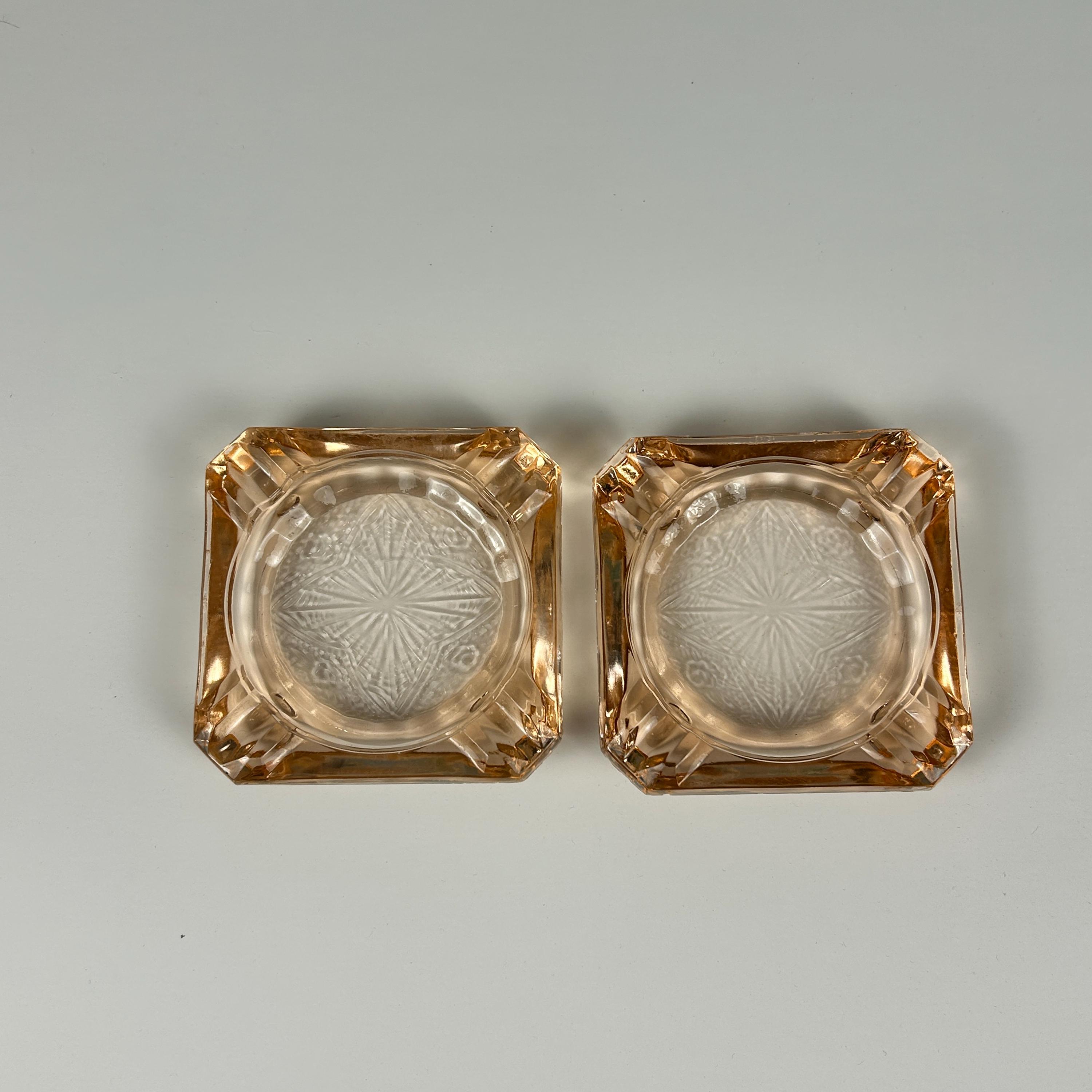 The ashtray edges are raised, thick pink glass with a cigarette rest indention in each corner. Each ashtray measures 3-1/4" square and is about 1/2" high measuring from the surface.