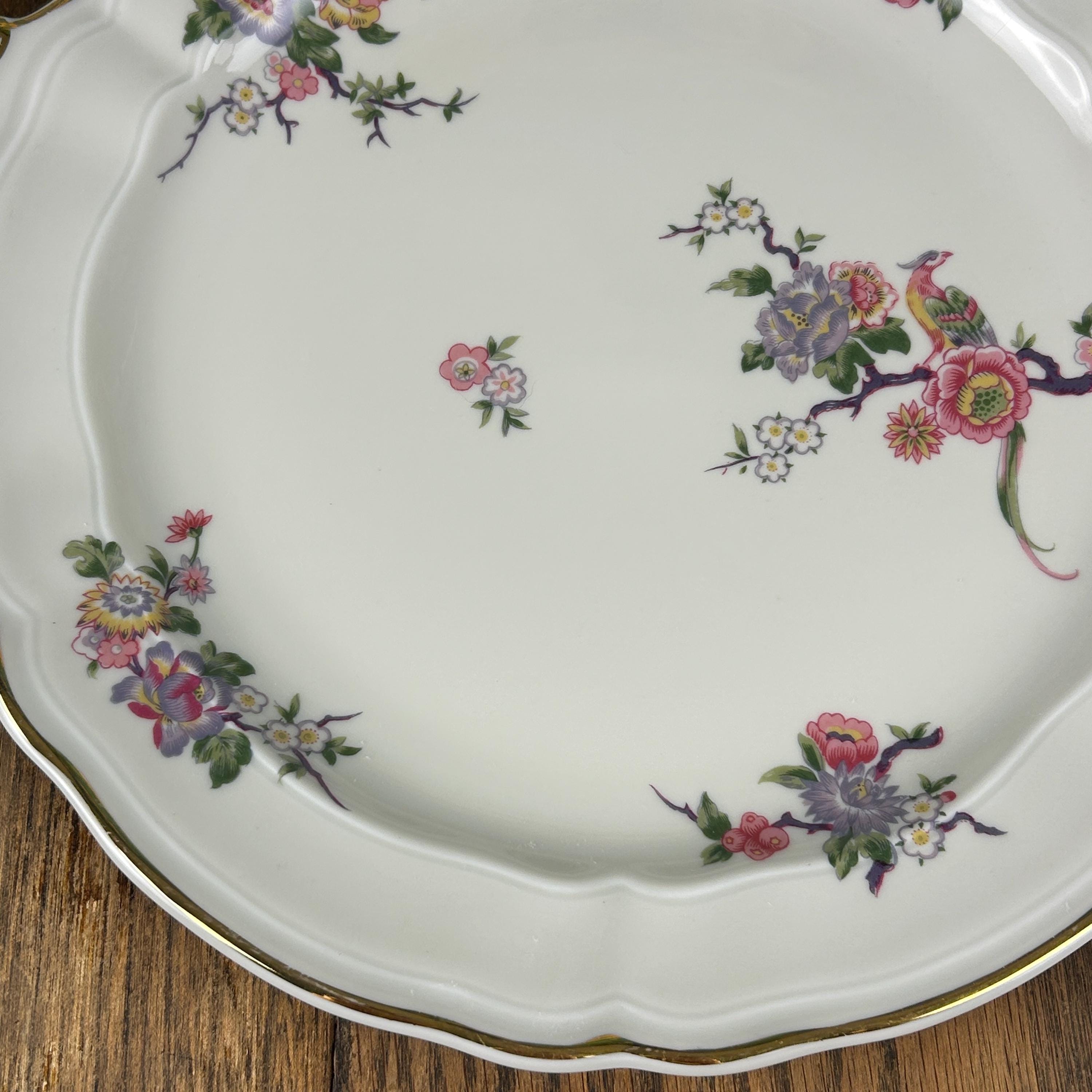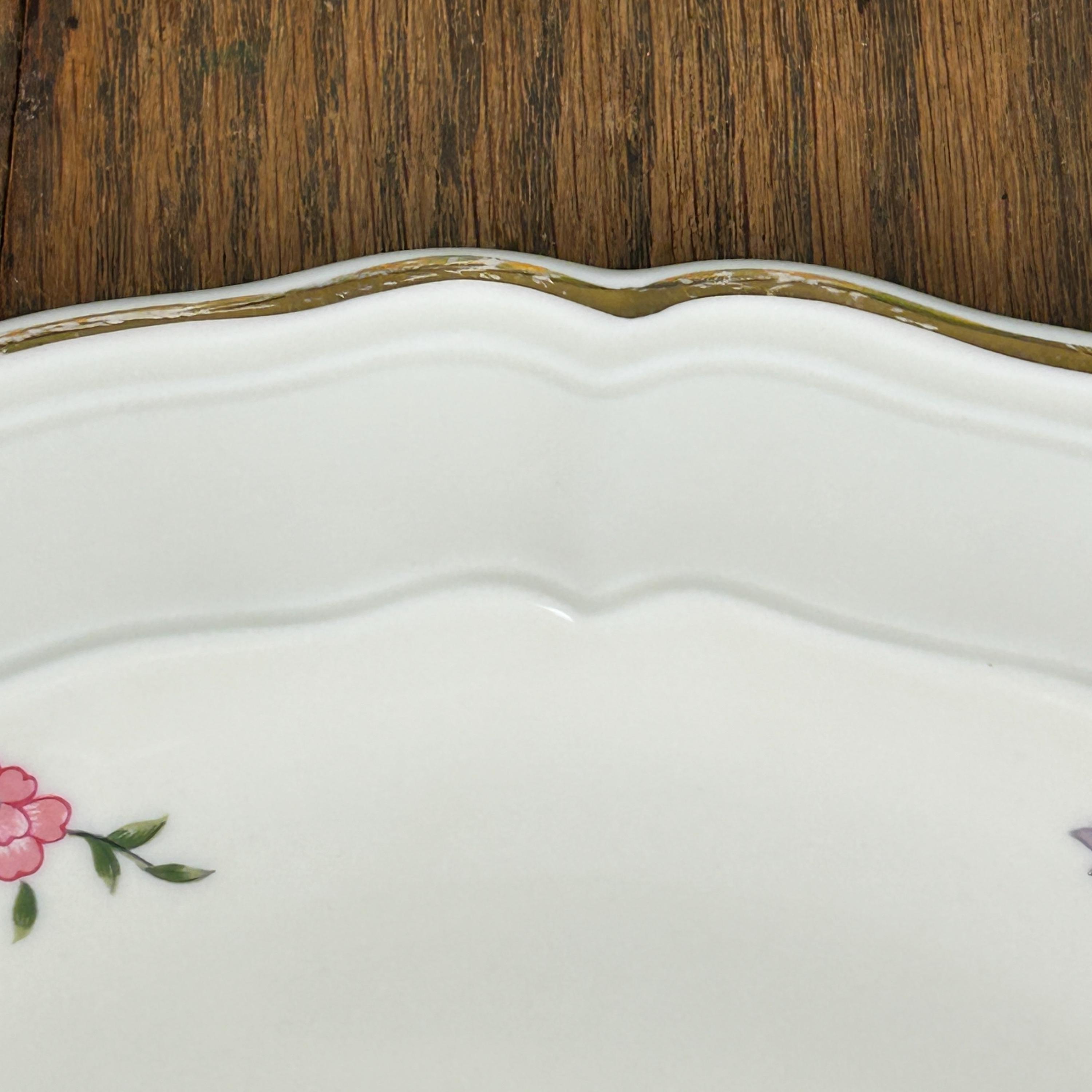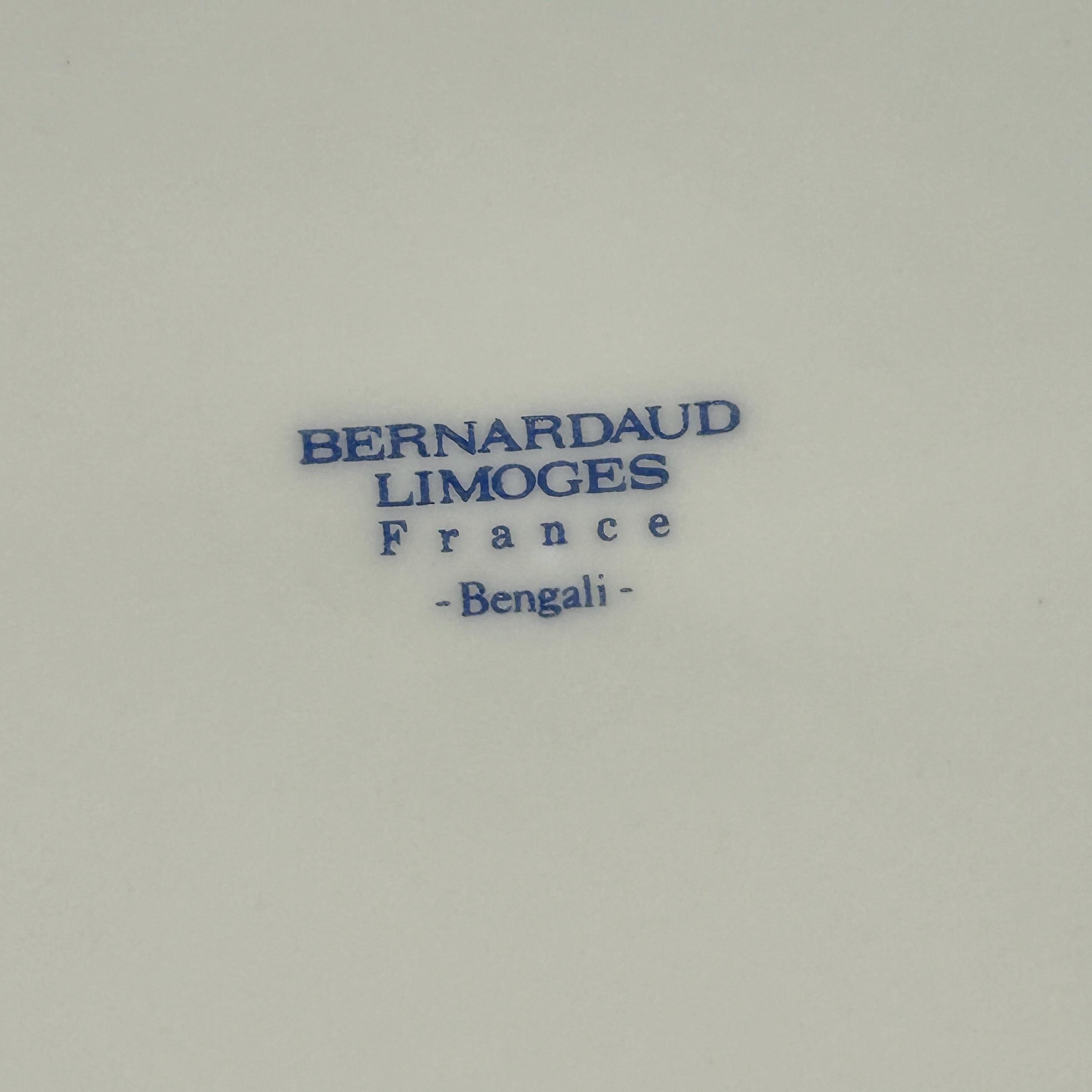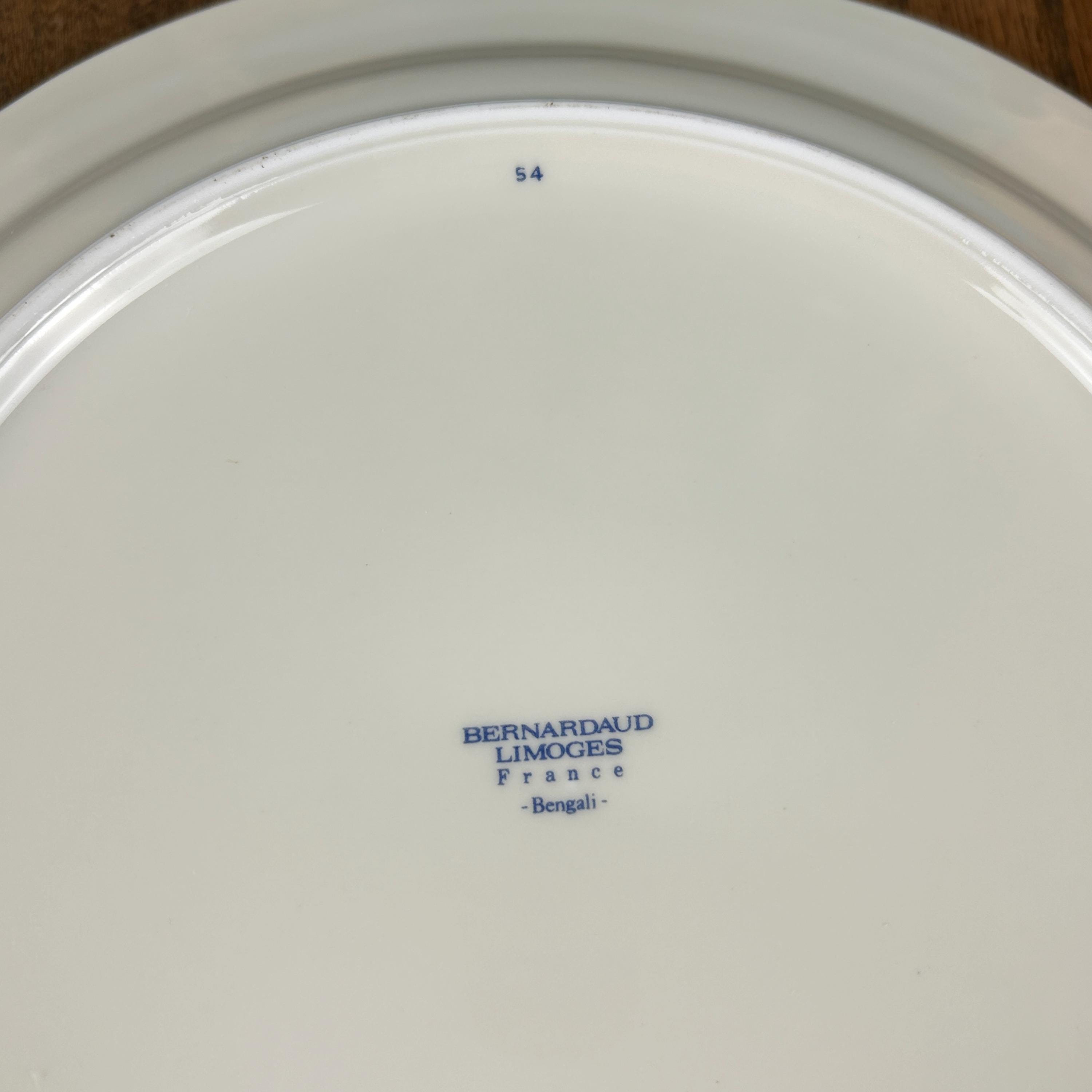 Decorated with tropical blooms and an ornately plumed bird perched on a branch. Gilded handles and edges. Marked in blue "Bernadaud Limoges France." Bengali. umber 54 at top of back of plate.