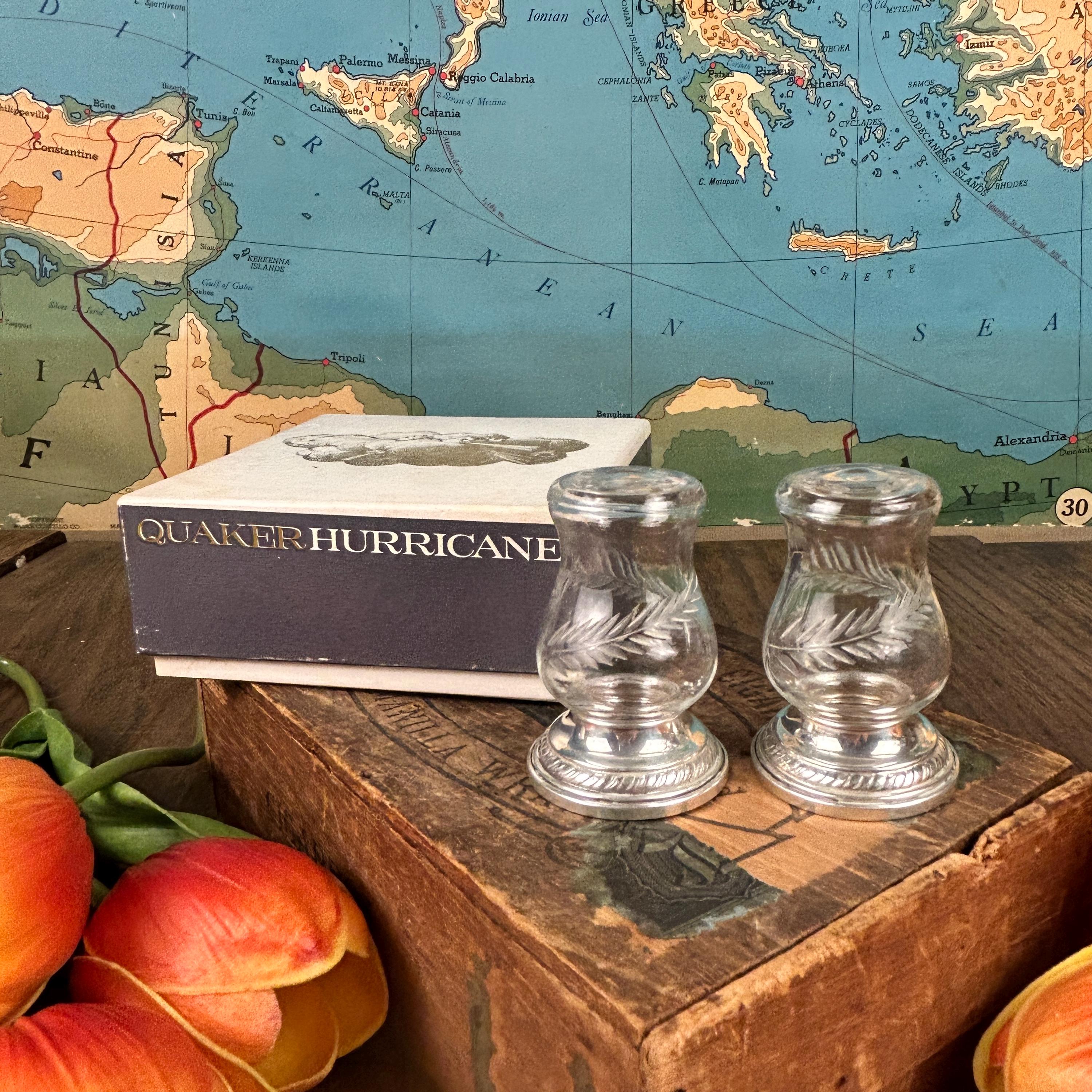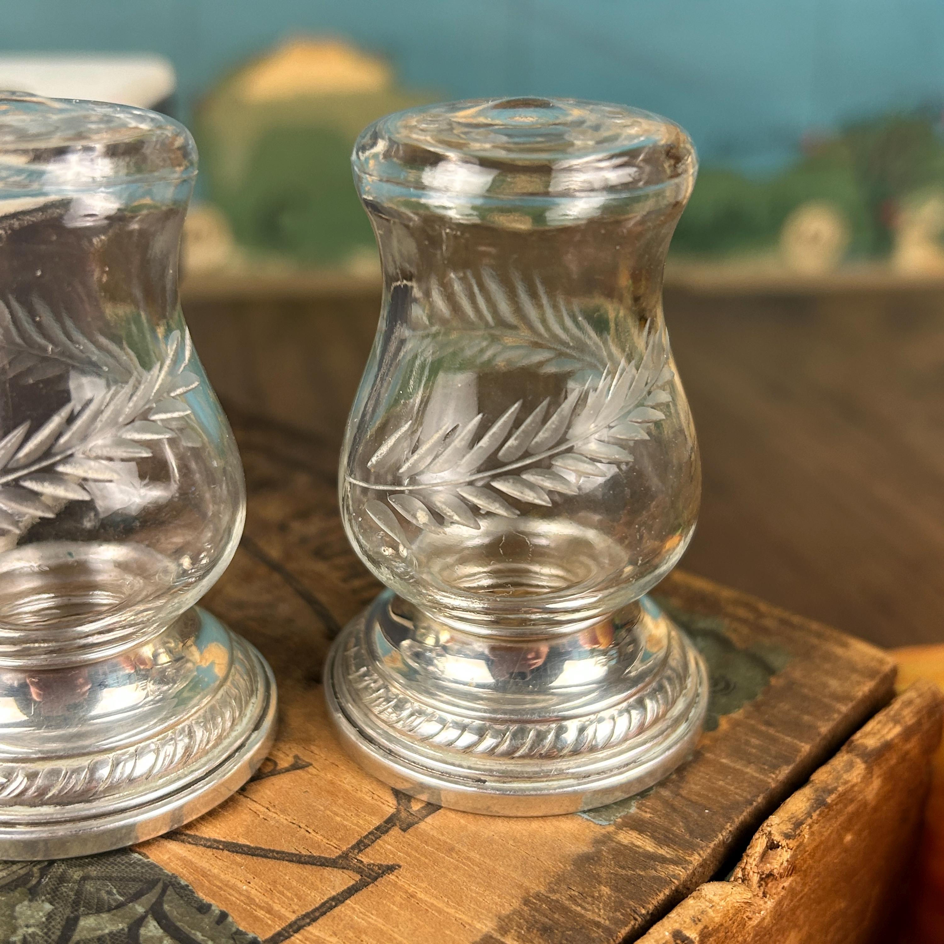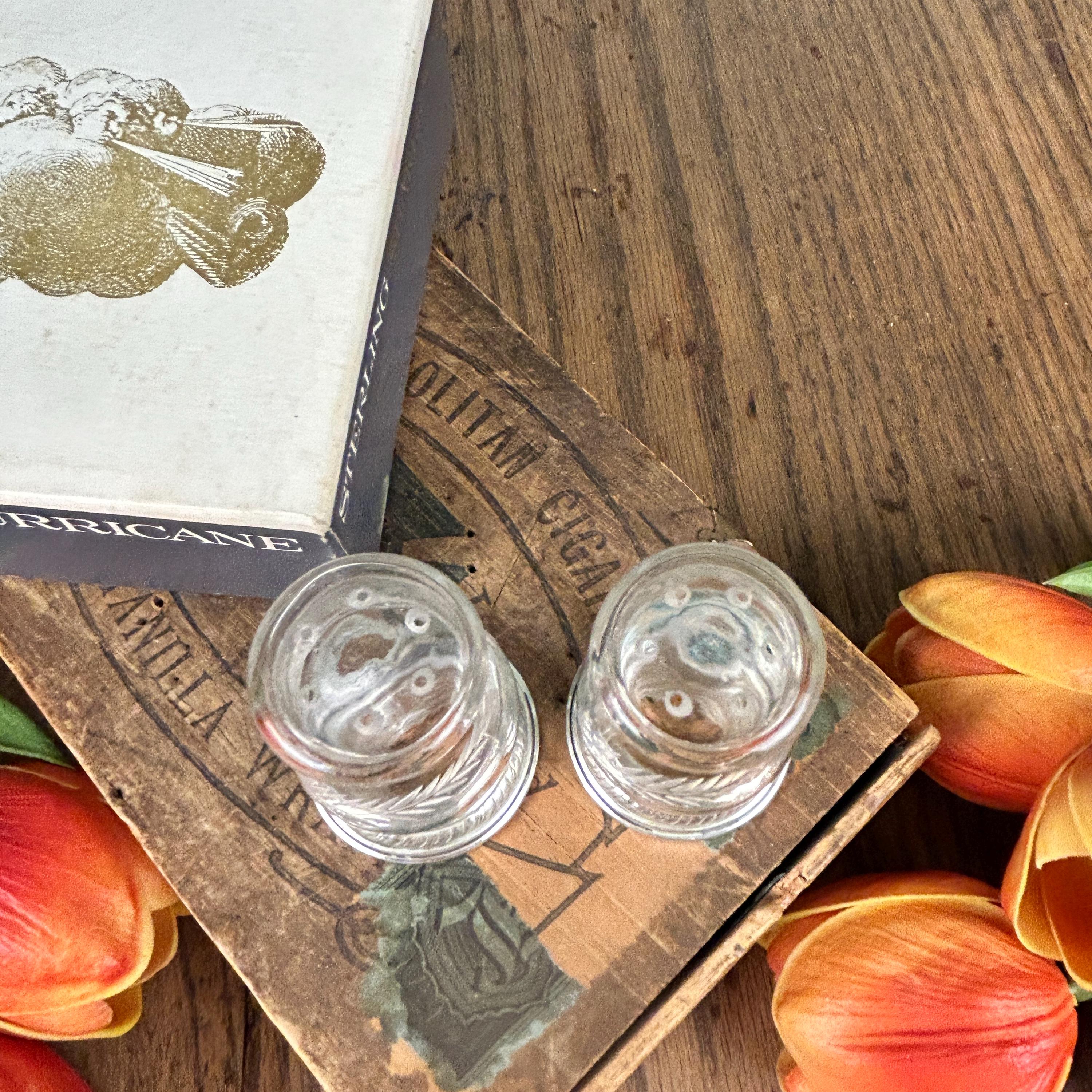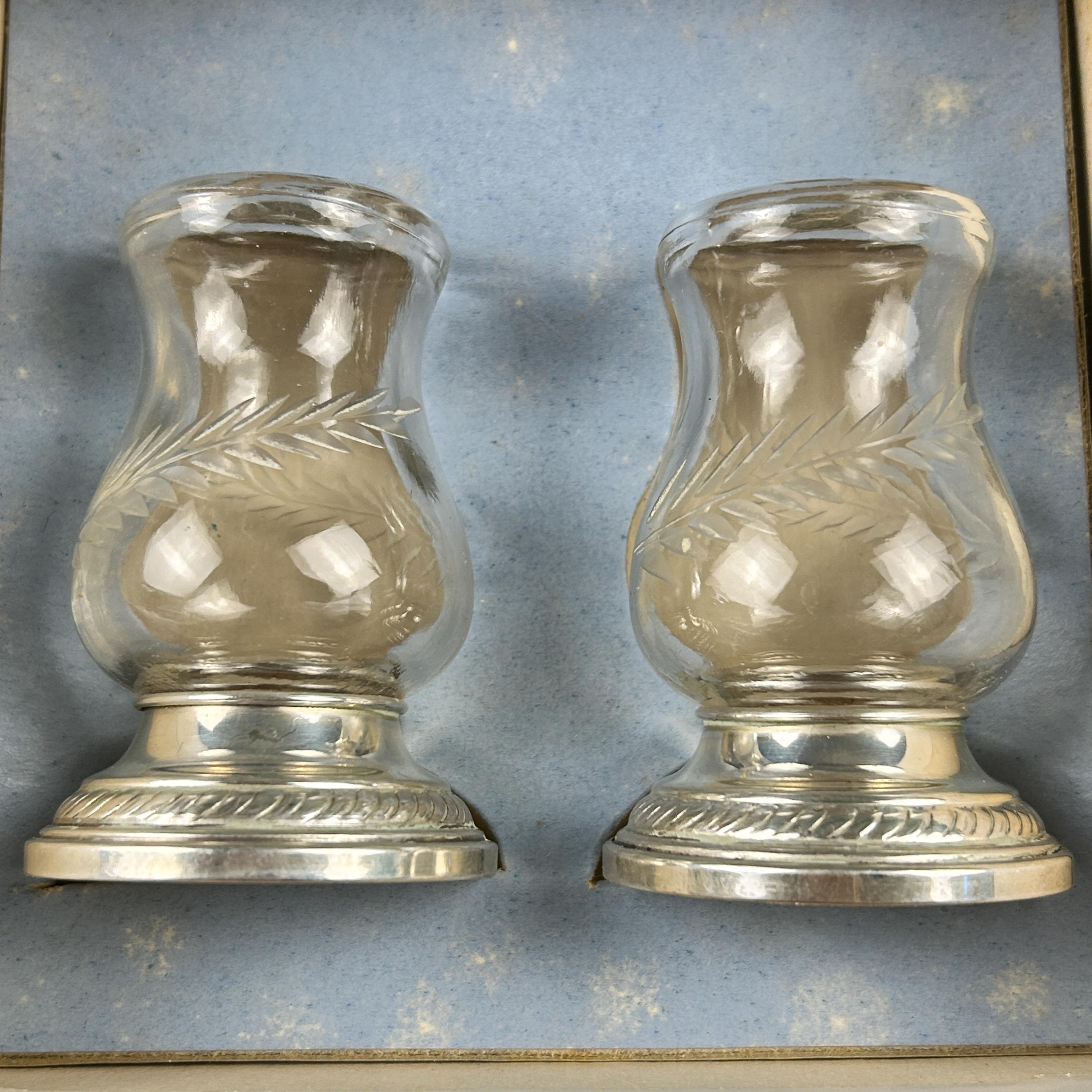 This Quaker Silver Company "Newport Sterling" Weighted Crystal Salt and Pepper Shaker Set was made between 1929 and 1959. The set is in the original box and does not appear to have ever been used. The shaker set is in excellent condition with no scratches, chips, or cracks and each shaker measures 2.75" tall with a 1.5" diameter weighted base. This attractive Quaker Silver Company "Newport Sterling" Weighted Crystal Salt and Pepper Shaker Set would make a gorgeous addition to any collection of unique depression period glass or function as a dining table shaker set!