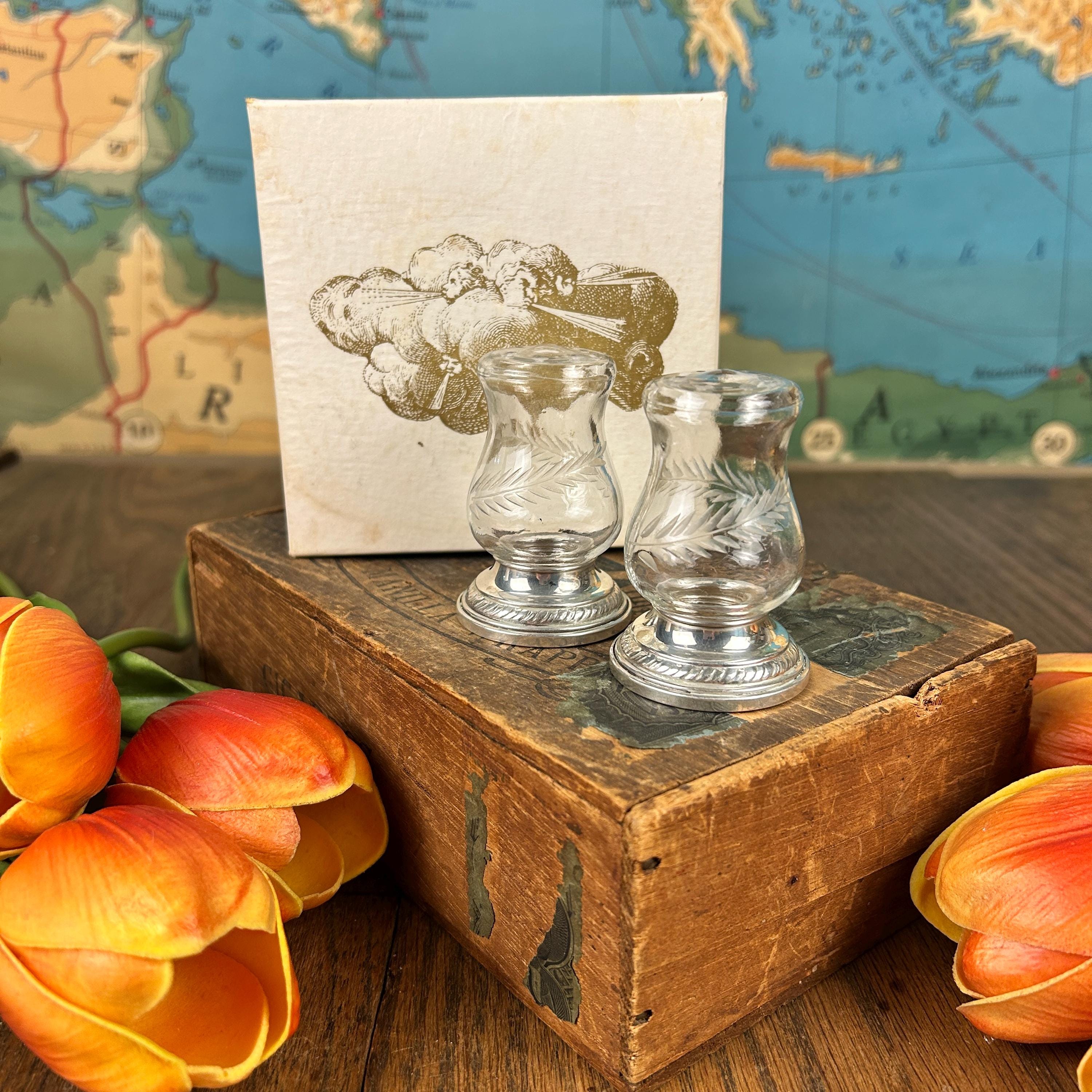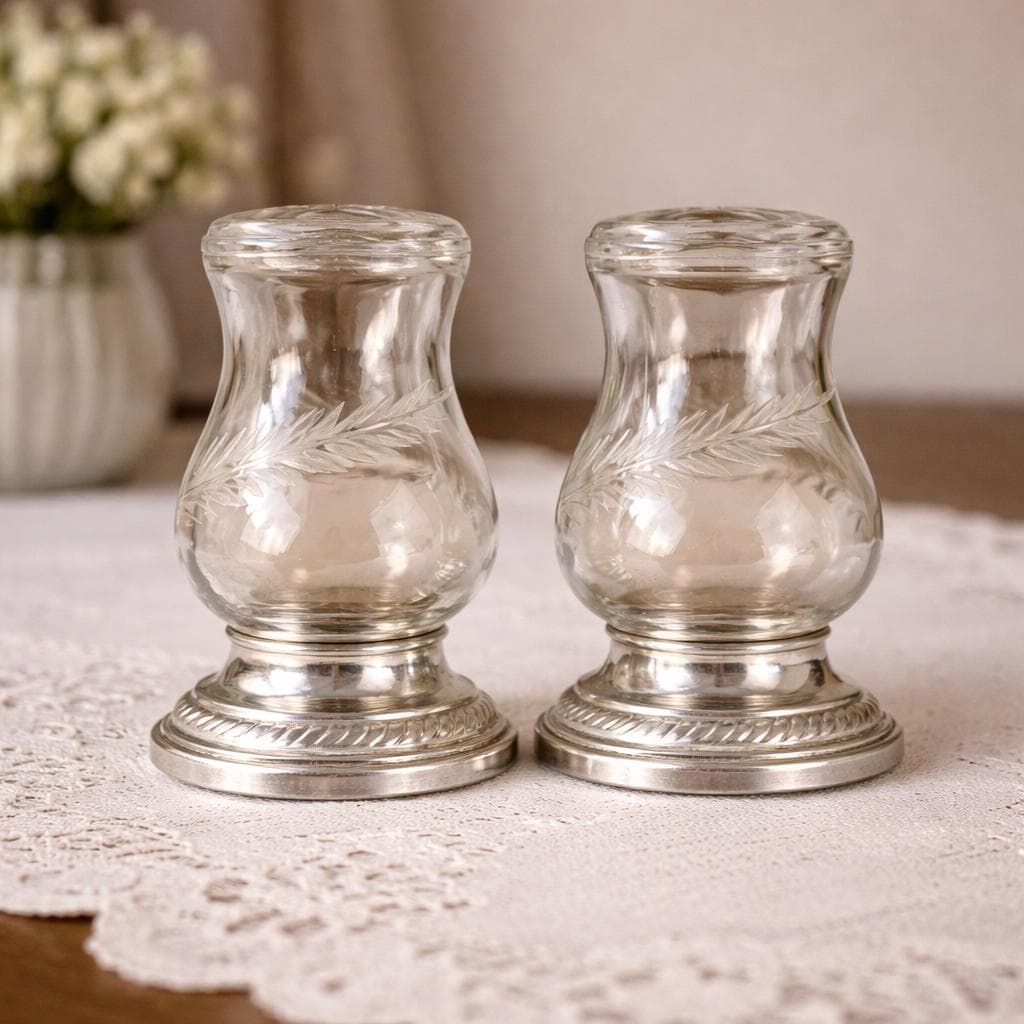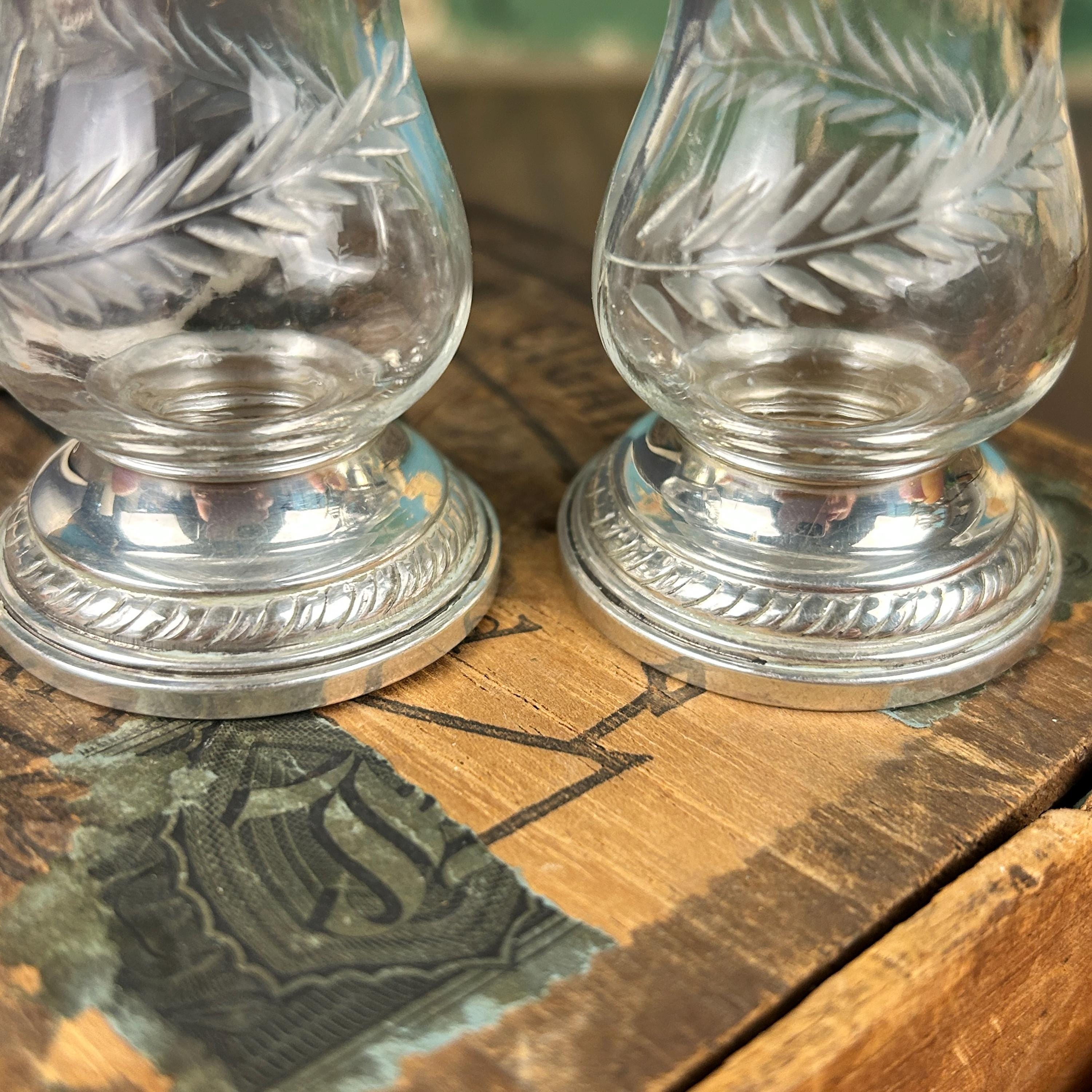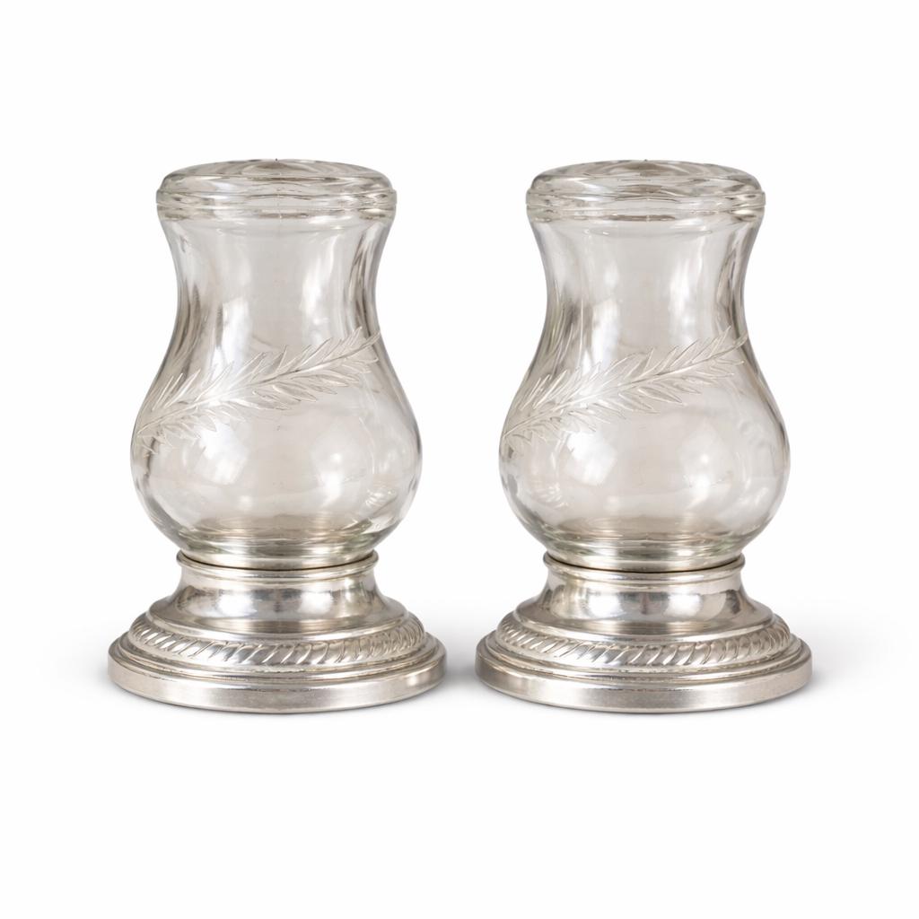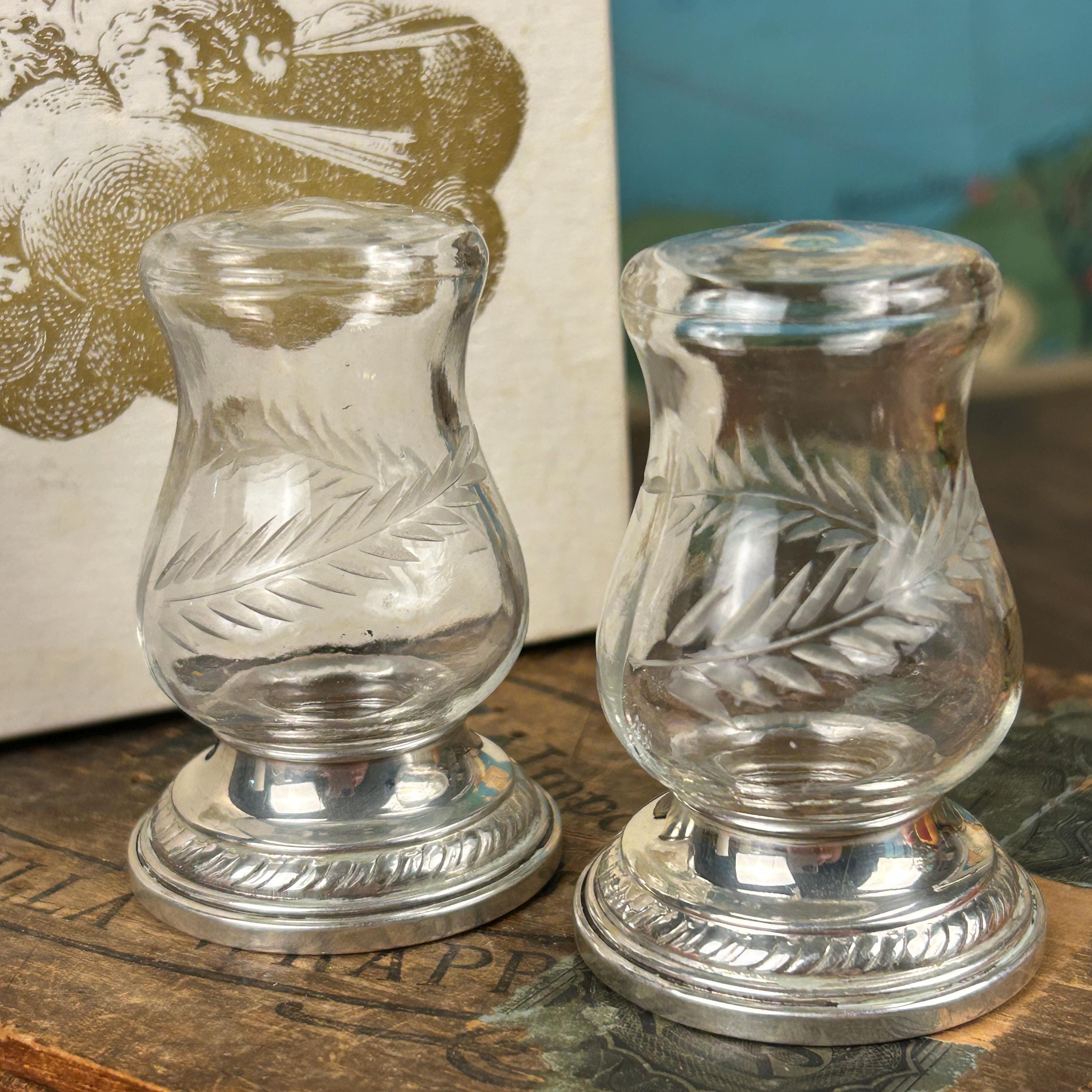 This Quaker Silver Company "Newport Sterling" Weighted Crystal Salt and Pepper Shaker Set was made between 1929 and 1959. The set is in the original box and does not appear to have ever been used. The shaker set is in excellent condition with no scratches, chips, or cracks and each shaker measures 2.75" tall with a 1.5" diameter weighted base. This attractive Quaker Silver Company "Newport Sterling" Weighted Crystal Salt and Pepper Shaker Set would make a gorgeous addition to any collection of unique depression period glass or function as a dining table shaker set!