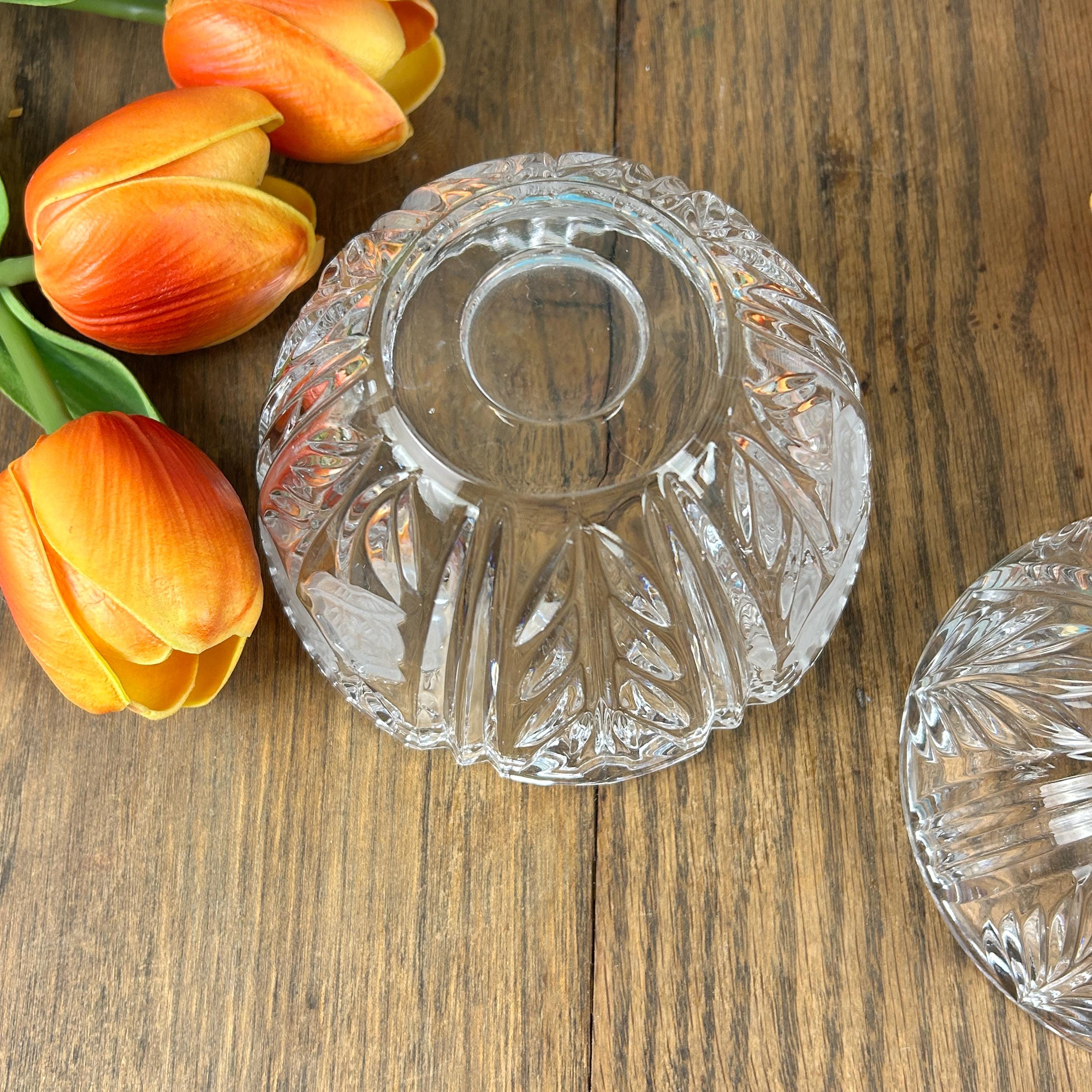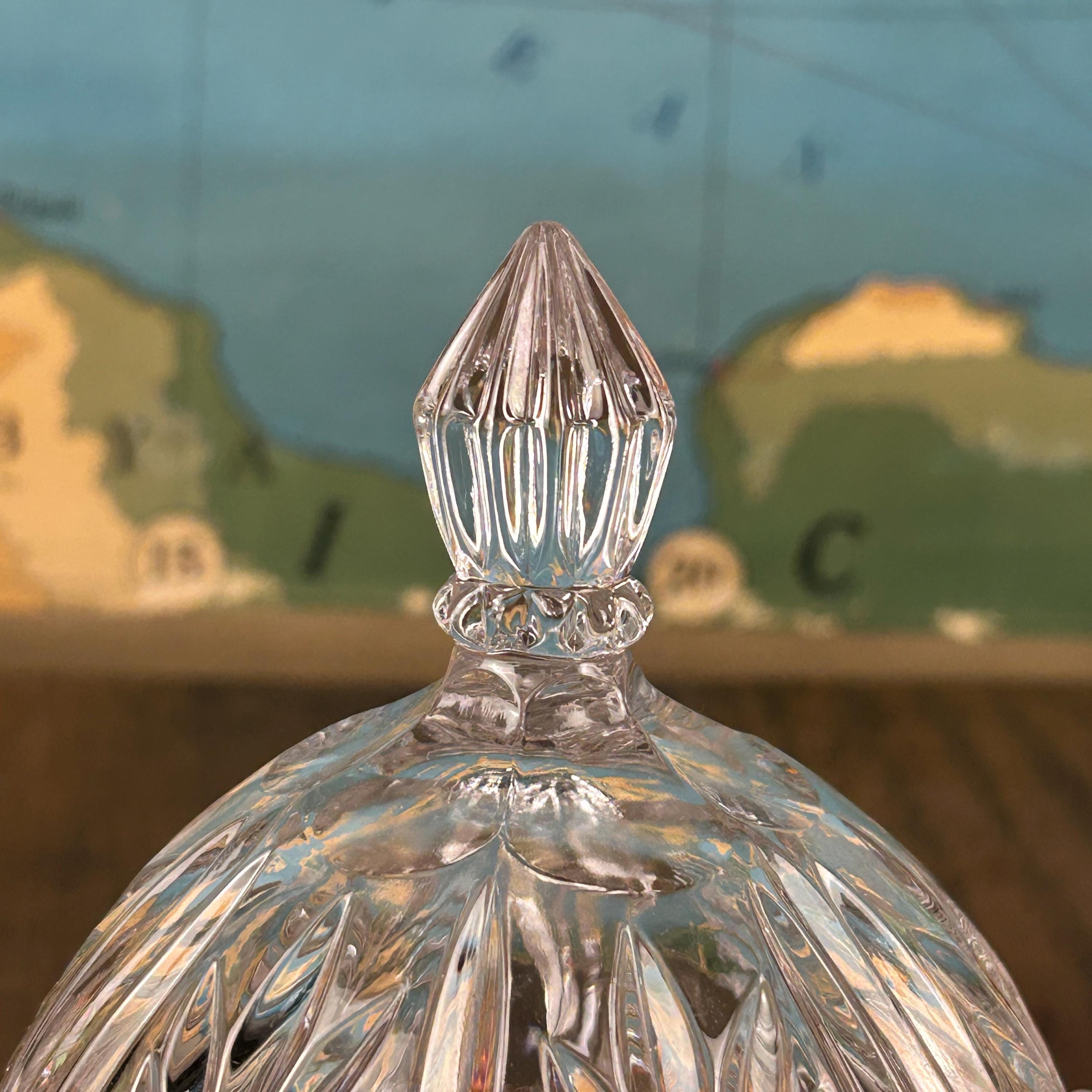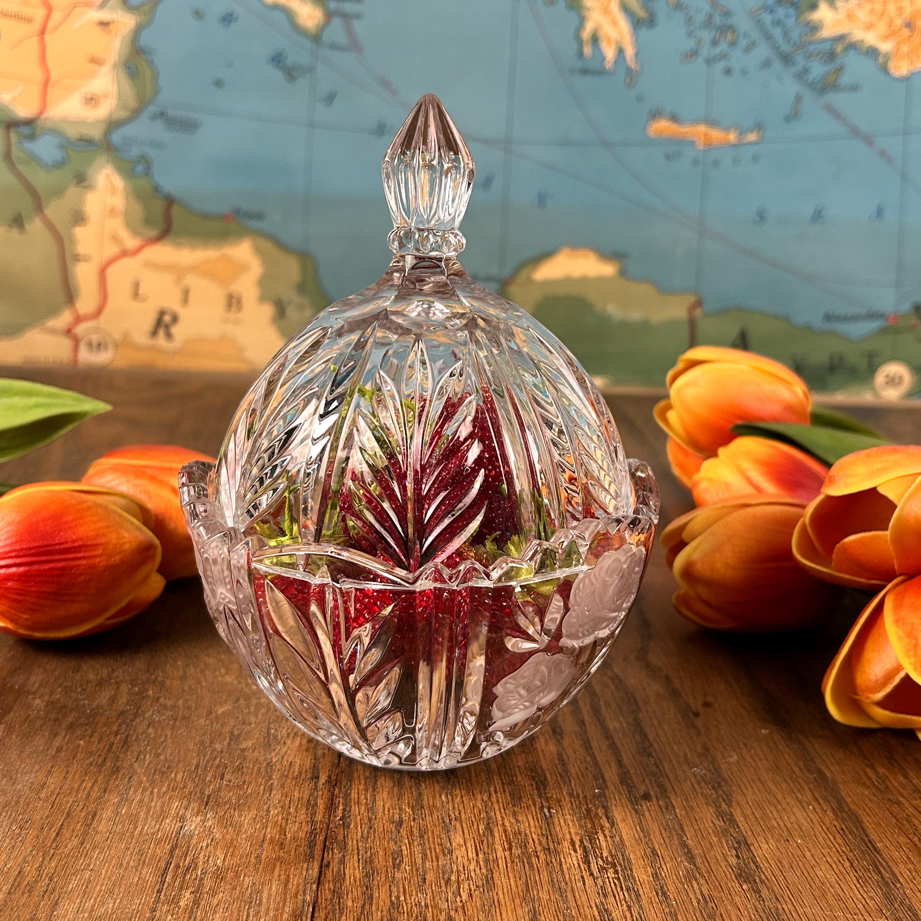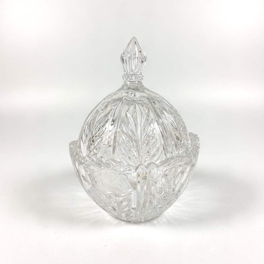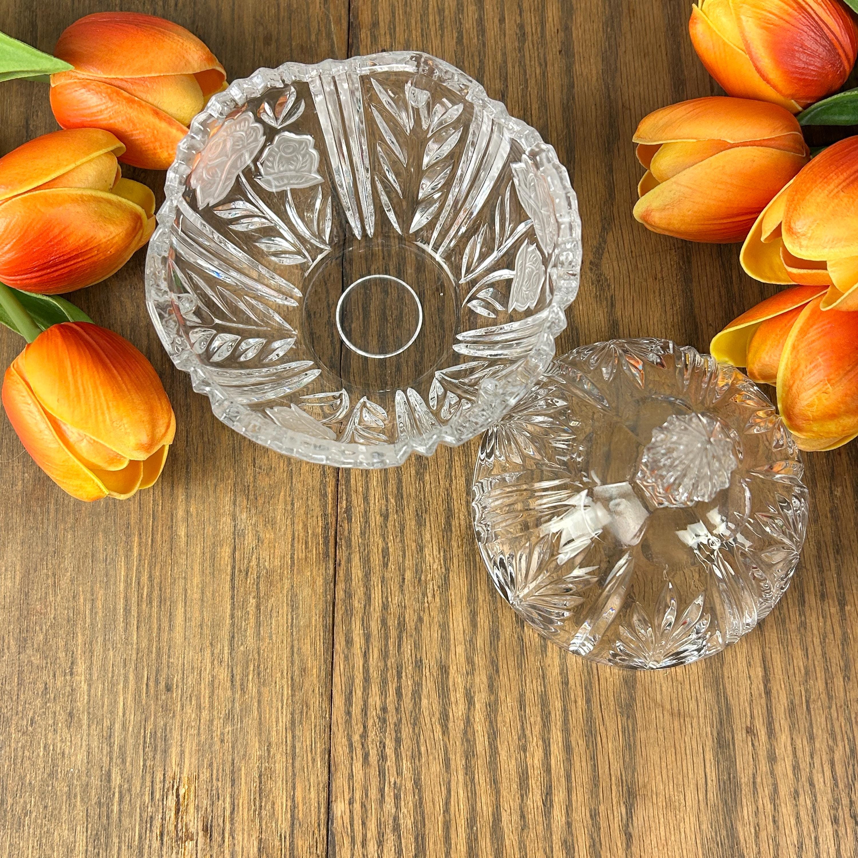 The Vintage Anna Hutte Bleikristall 24% Lead Crystal Candy Dish is a stunning piece of German craftsmanship, featuring an etched floral pattern on a round, glossy finish design. This elegant candy dish is made with high-quality lead crystal, showcasing a clear/gold color scheme that adds a touch of luxury to any home decor. With its Art Glass production style and vintage originality, this Candy Dish is a charming addition to any collection or a lovely gift for a discerning collector.