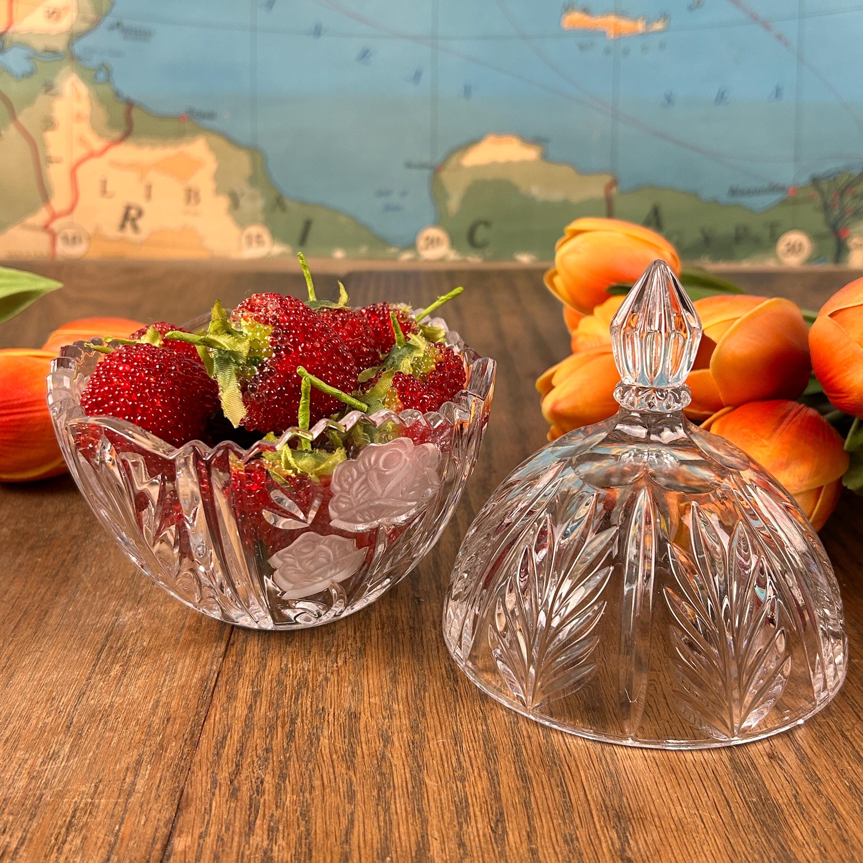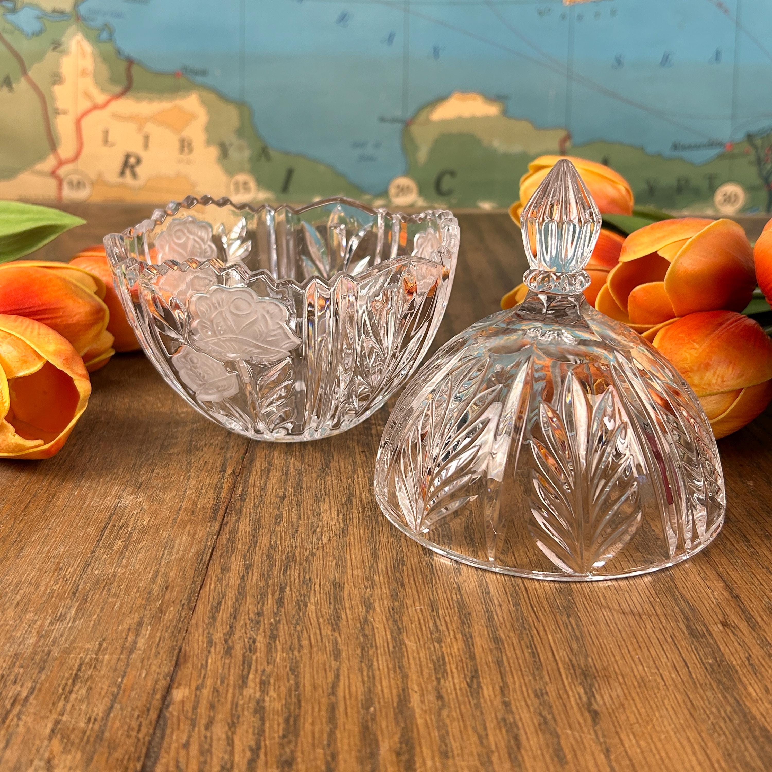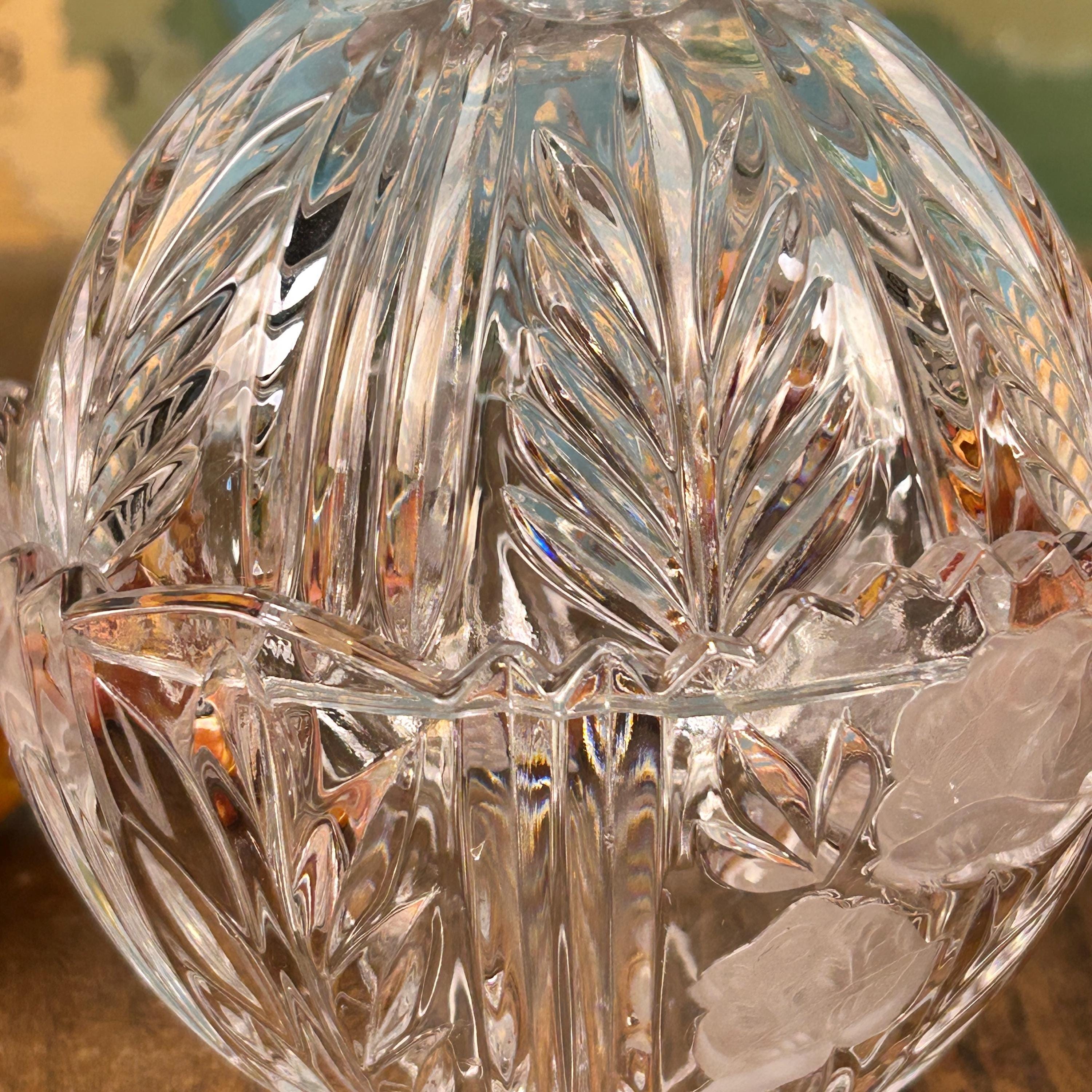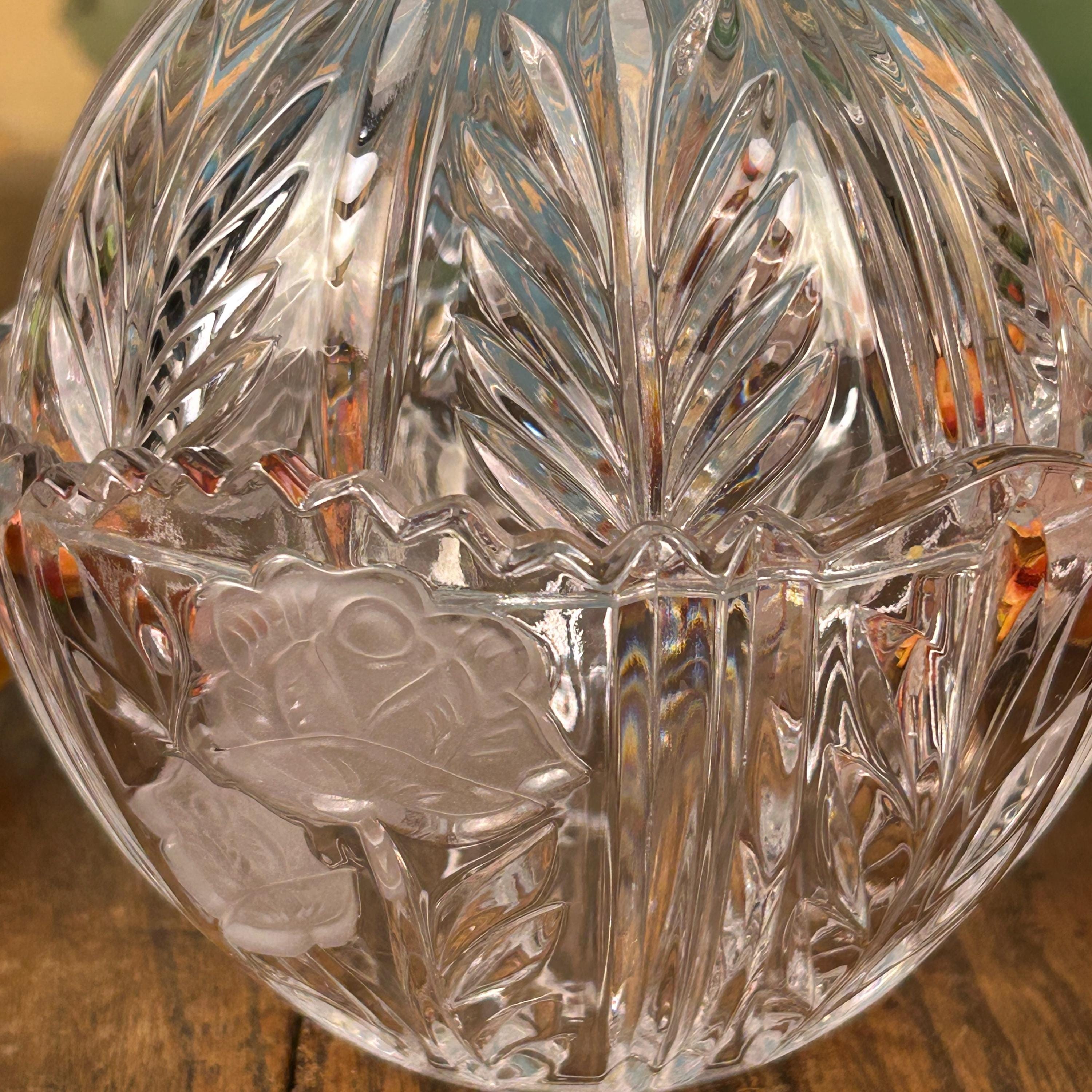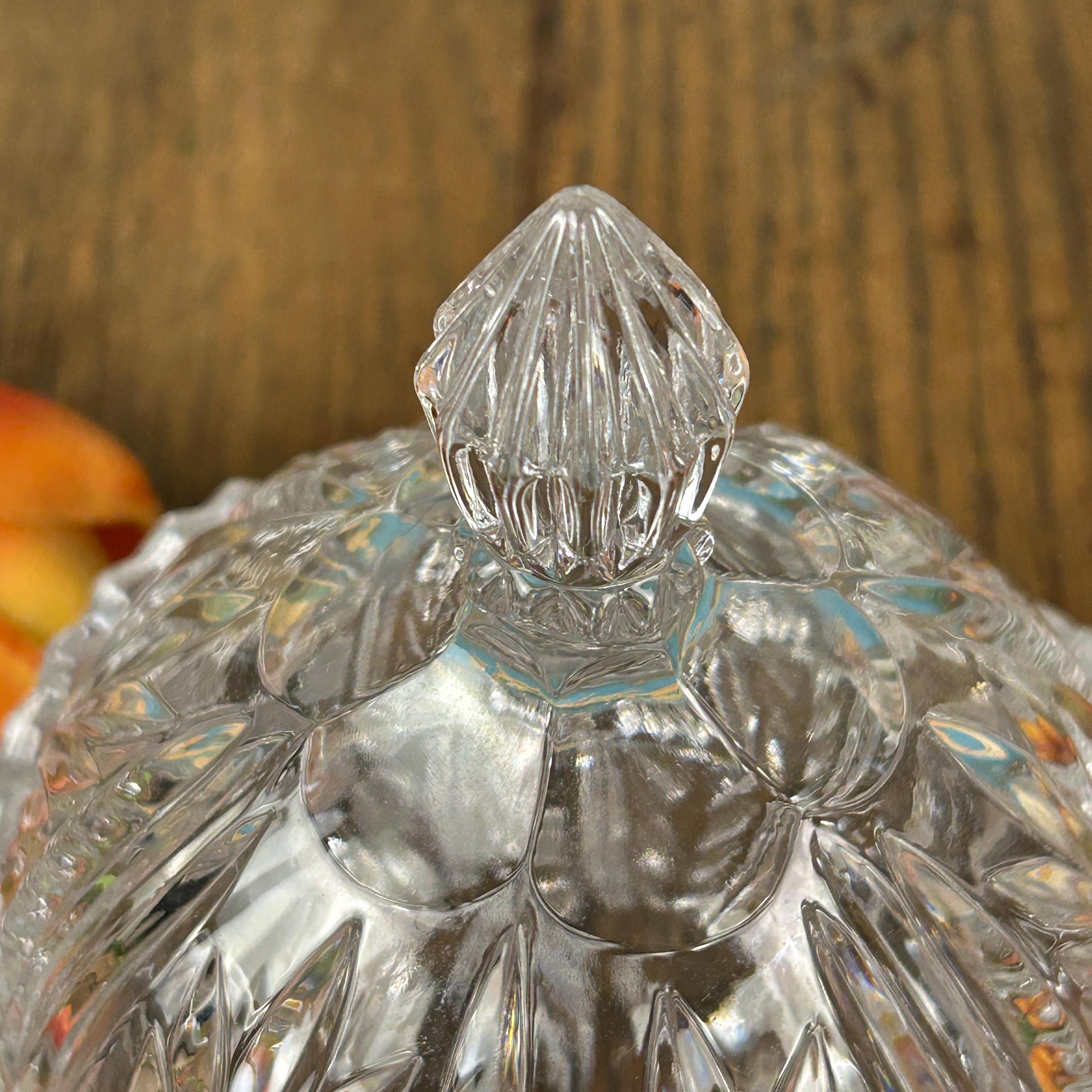 The Vintage Anna Hutte Bleikristall 24% Lead Crystal Candy Dish is a stunning piece of German craftsmanship, featuring an etched floral pattern on a round, glossy finish design. This elegant candy dish is made with high-quality lead crystal, showcasing a clear/gold color scheme that adds a touch of luxury to any home decor. With its Art Glass production style and vintage originality, this Candy Dish is a charming addition to any collection or a lovely gift for a discerning collector.