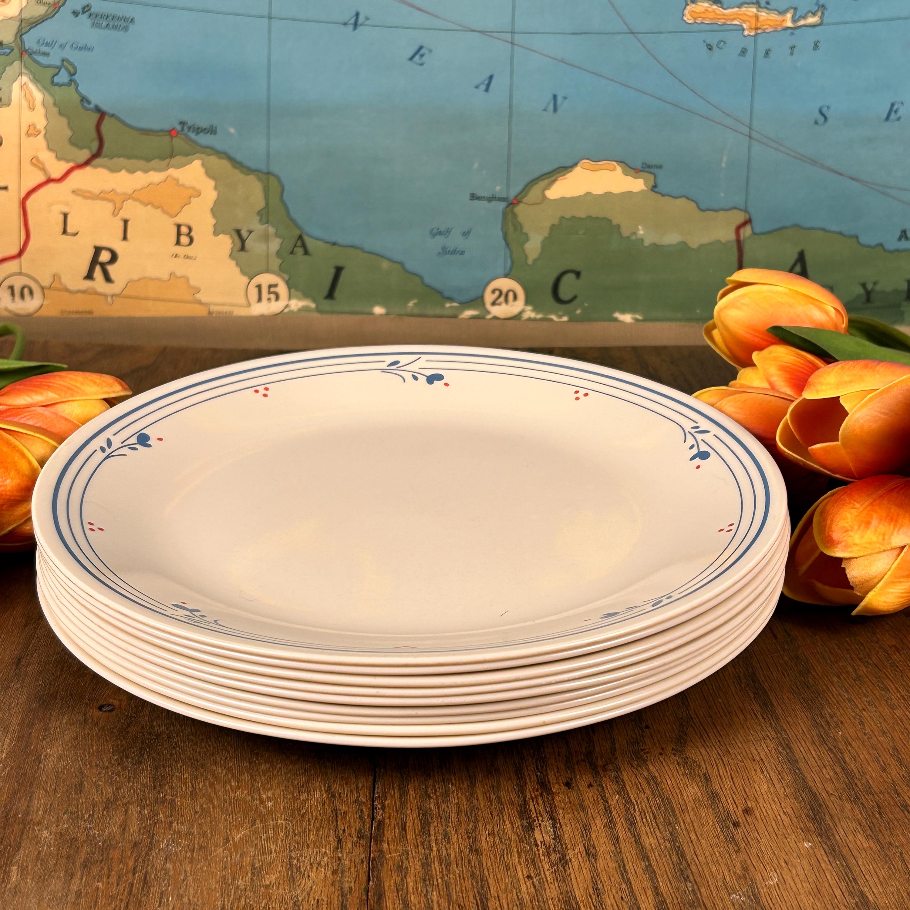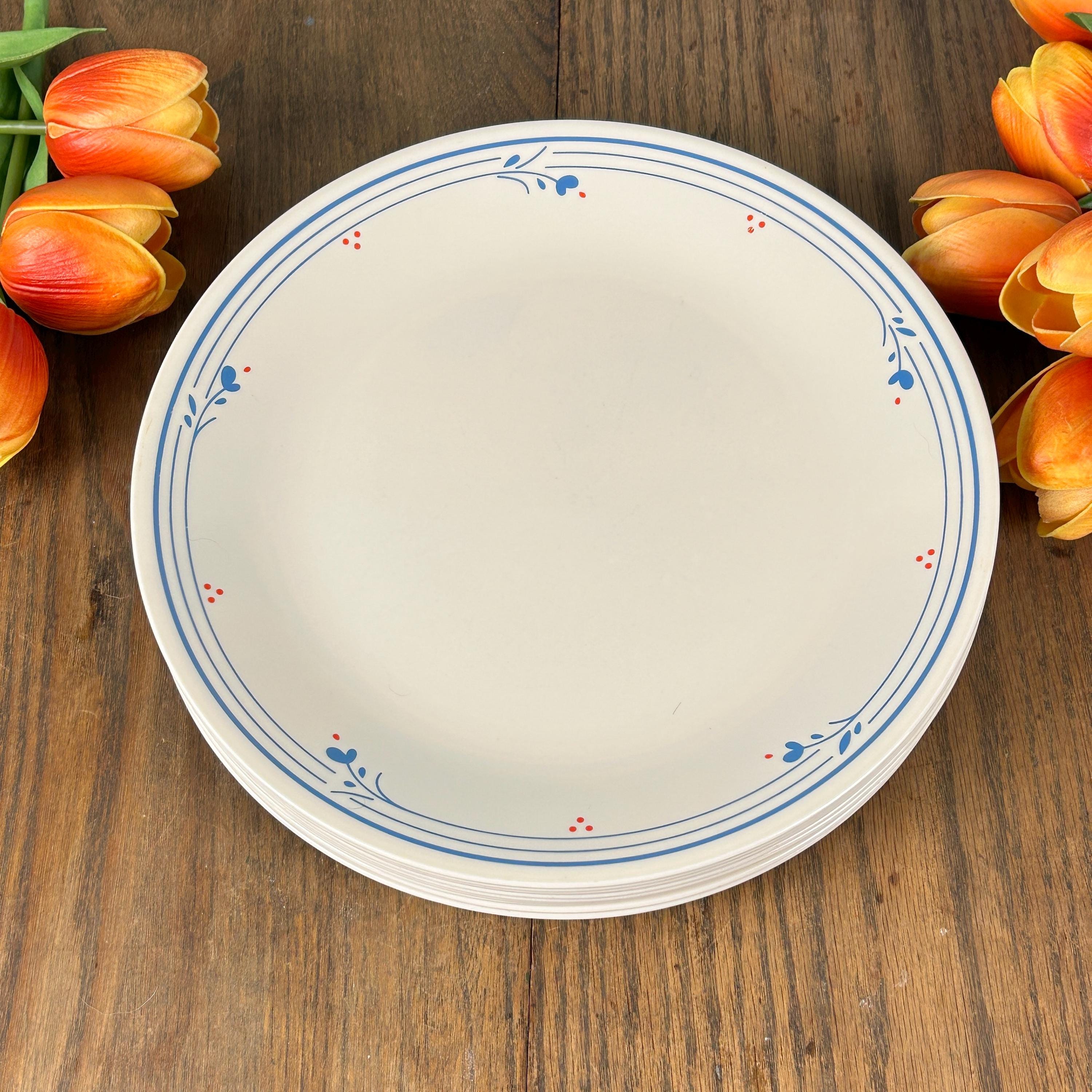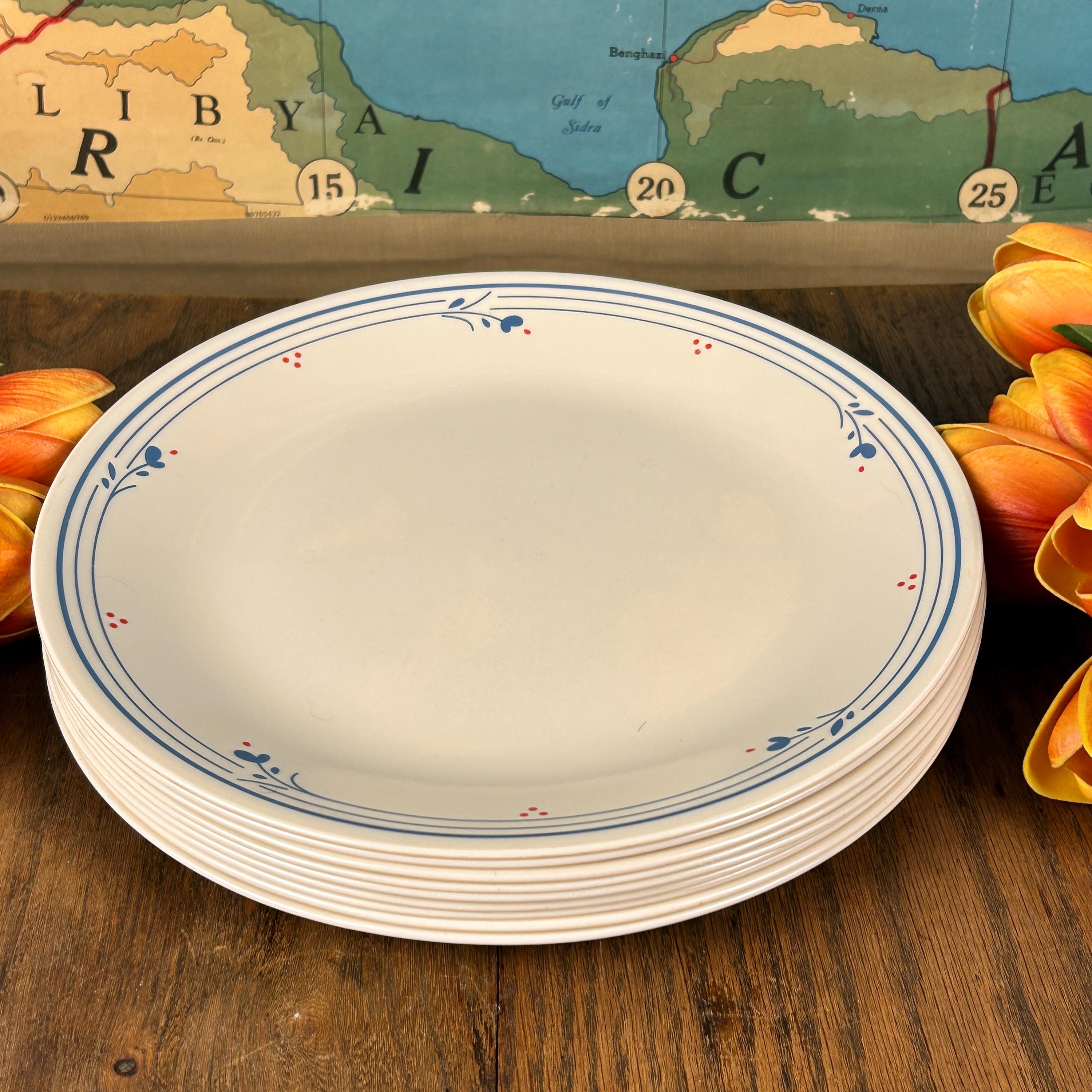 This is a pretty pattern of Corelle called Country Violets that would make perfect replacement pieces for every day use. This set will perfectly compliment your farmhouse kitchen or cottage core decor with its universal pattern. The color is a country blue hue accented by red dots on a beige base. These plates measure approximately 10 1/4" in diameter. They are clean and scratch-free. No paint loss. No chips or cracks can be seen. Please see all photos as they are part of the description.