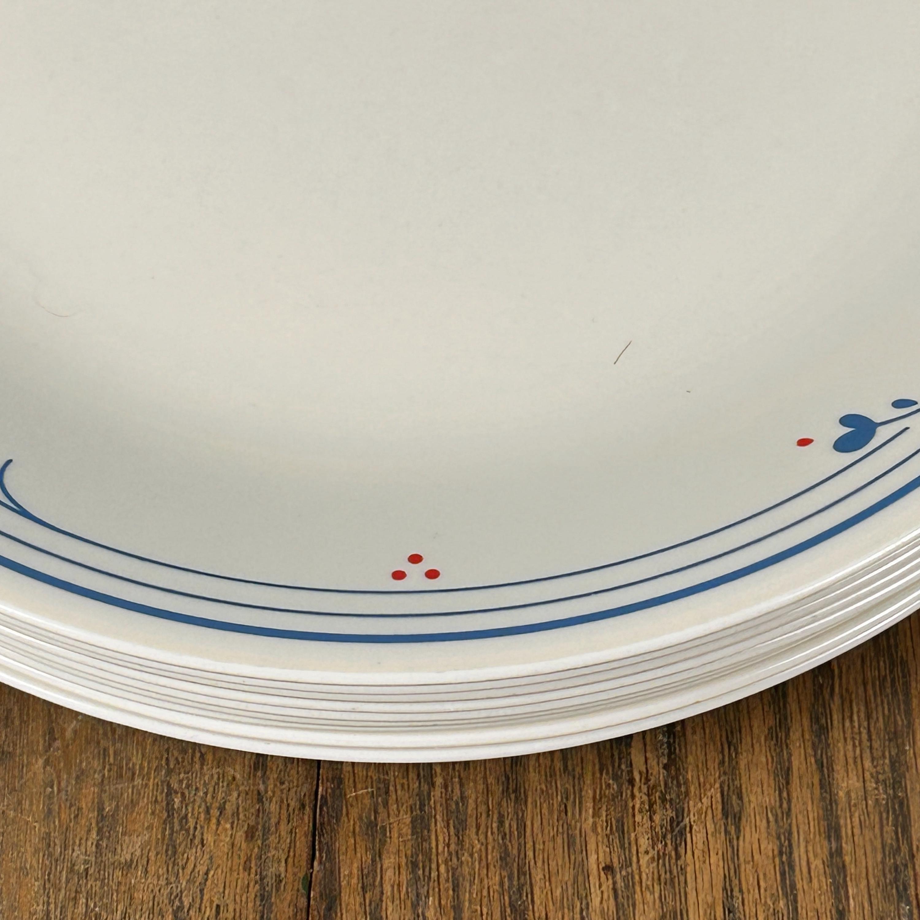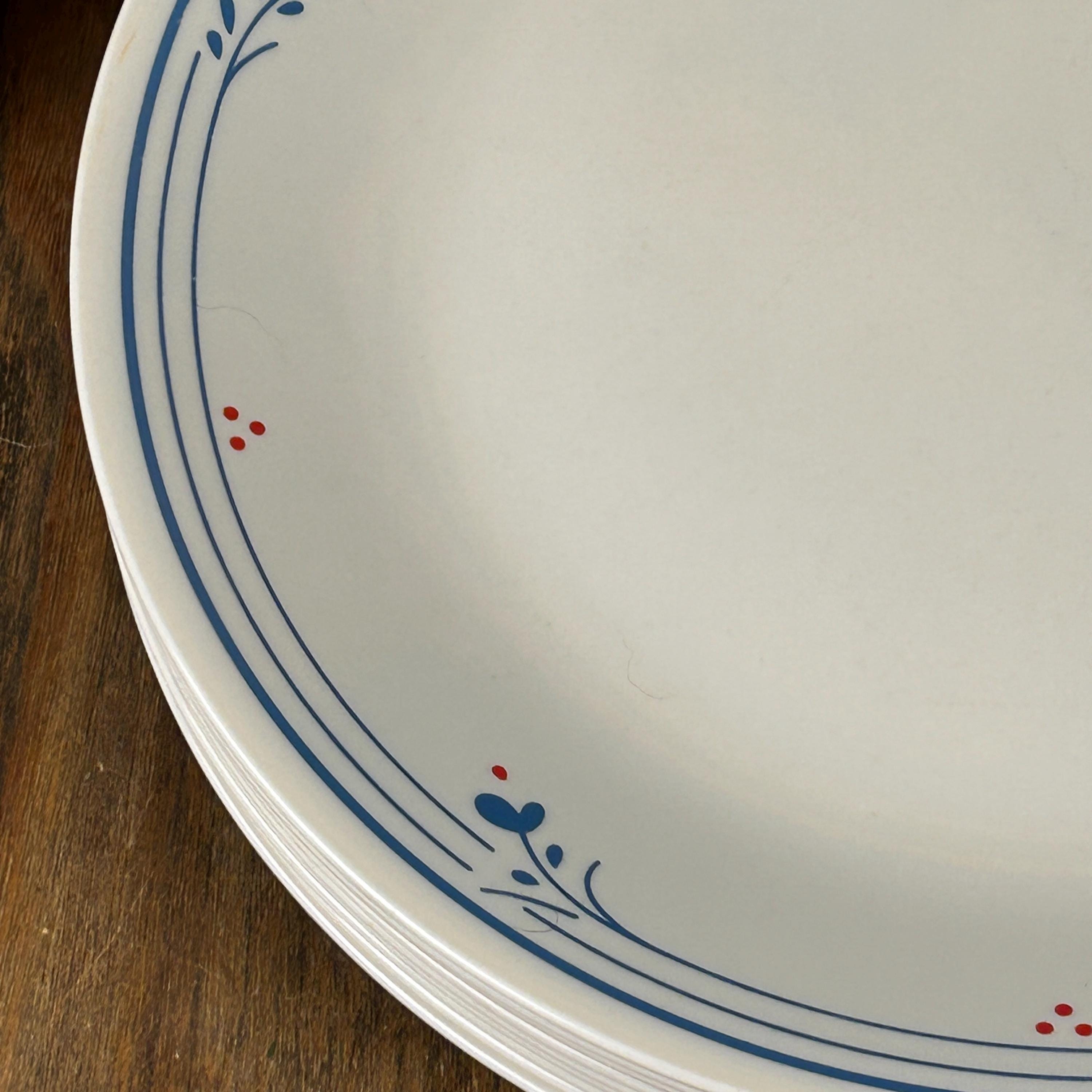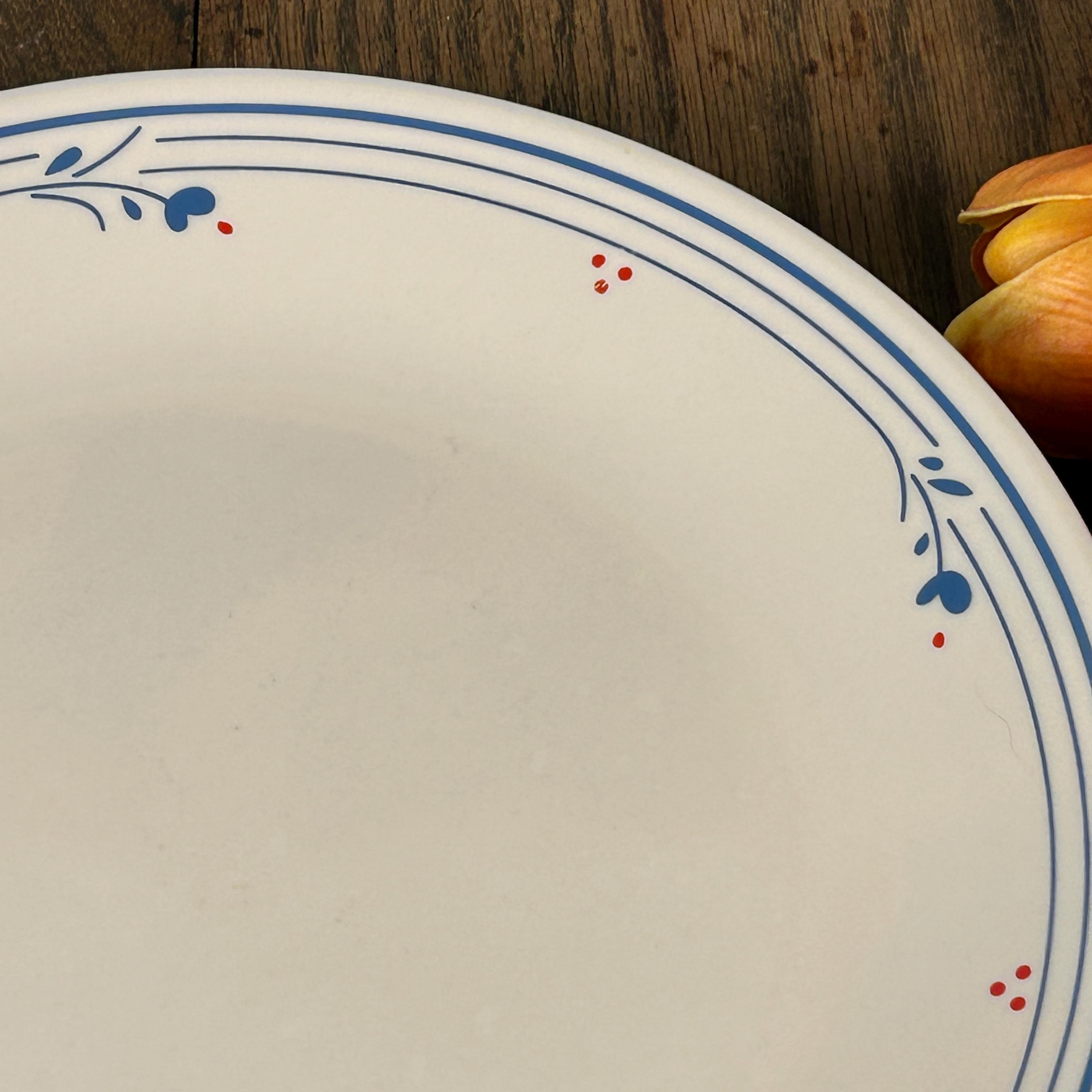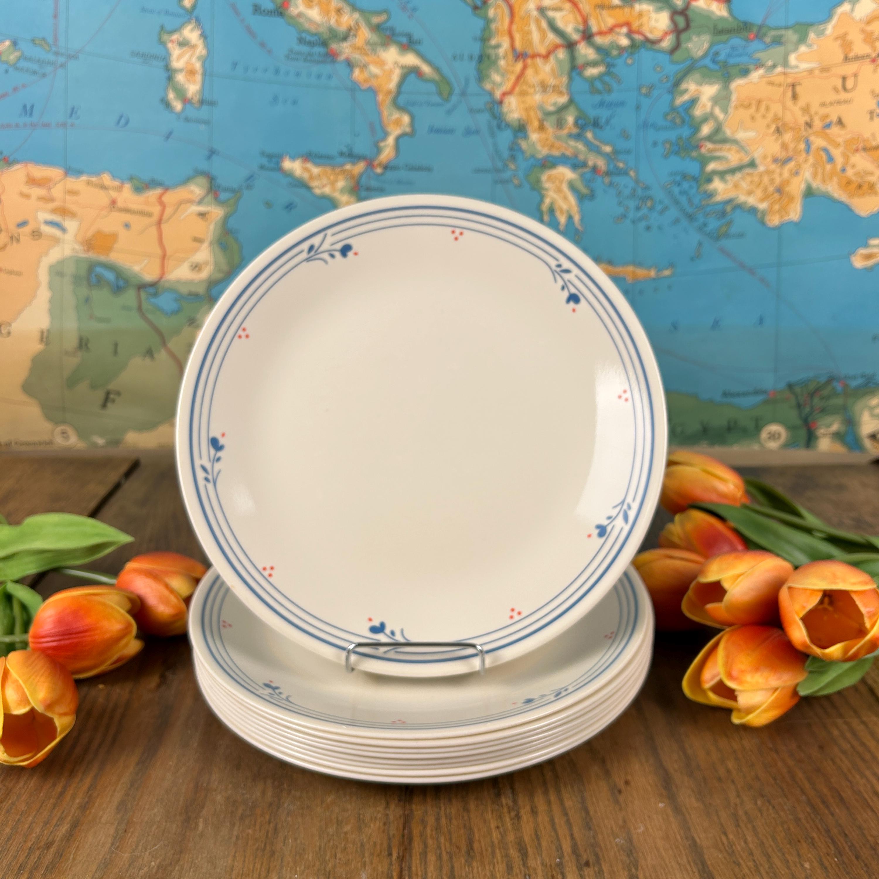 This is a pretty pattern of Corelle called Country Violets that would make perfect replacement pieces for every day use. This set will perfectly compliment your farmhouse kitchen or cottage core decor with its universal pattern. The color is a country blue hue accented by red dots on a beige base. These plates measure approximately 10 1/4" in diameter. They are clean and scratch-free. No paint loss. No chips or cracks can be seen. Please see all photos as they are part of the description.