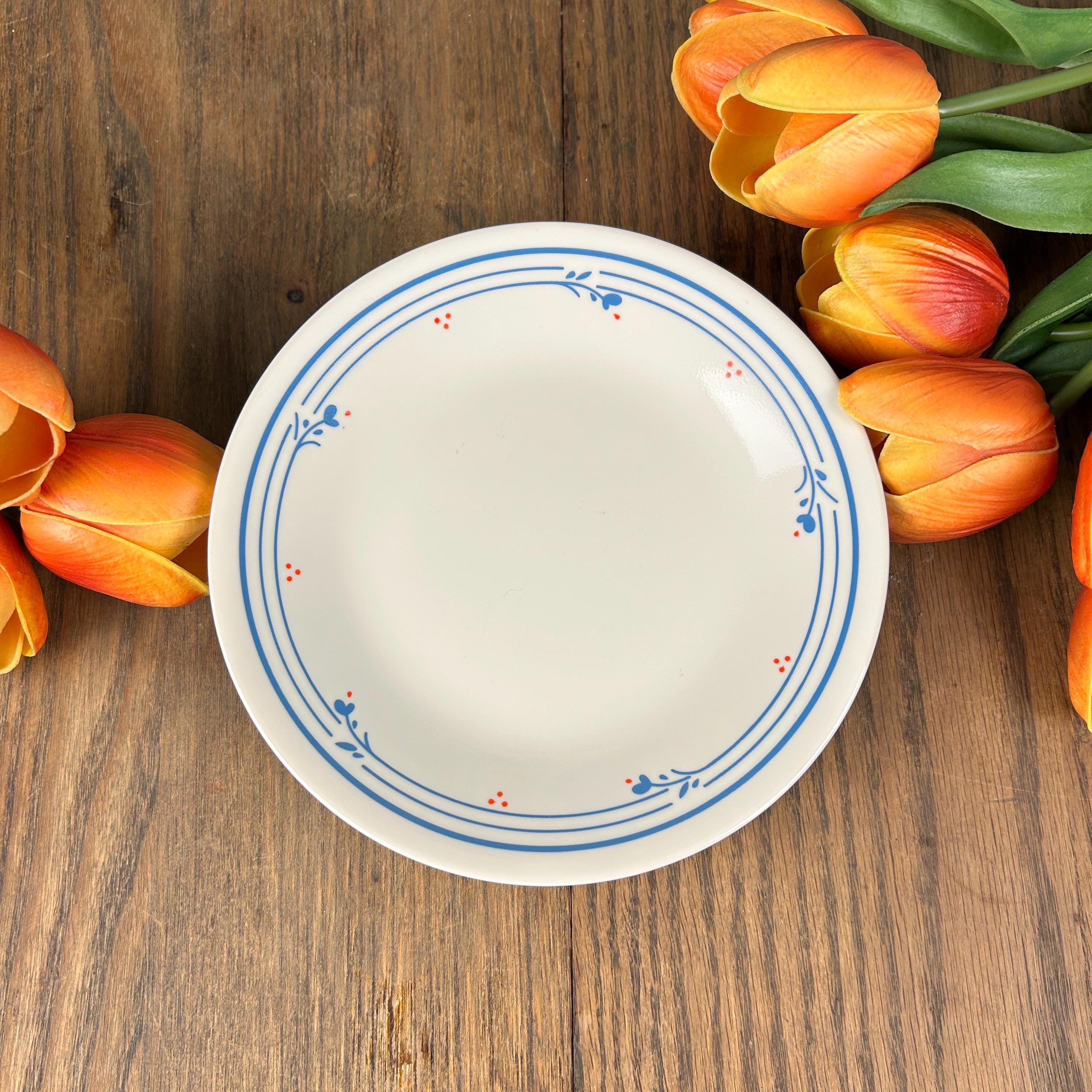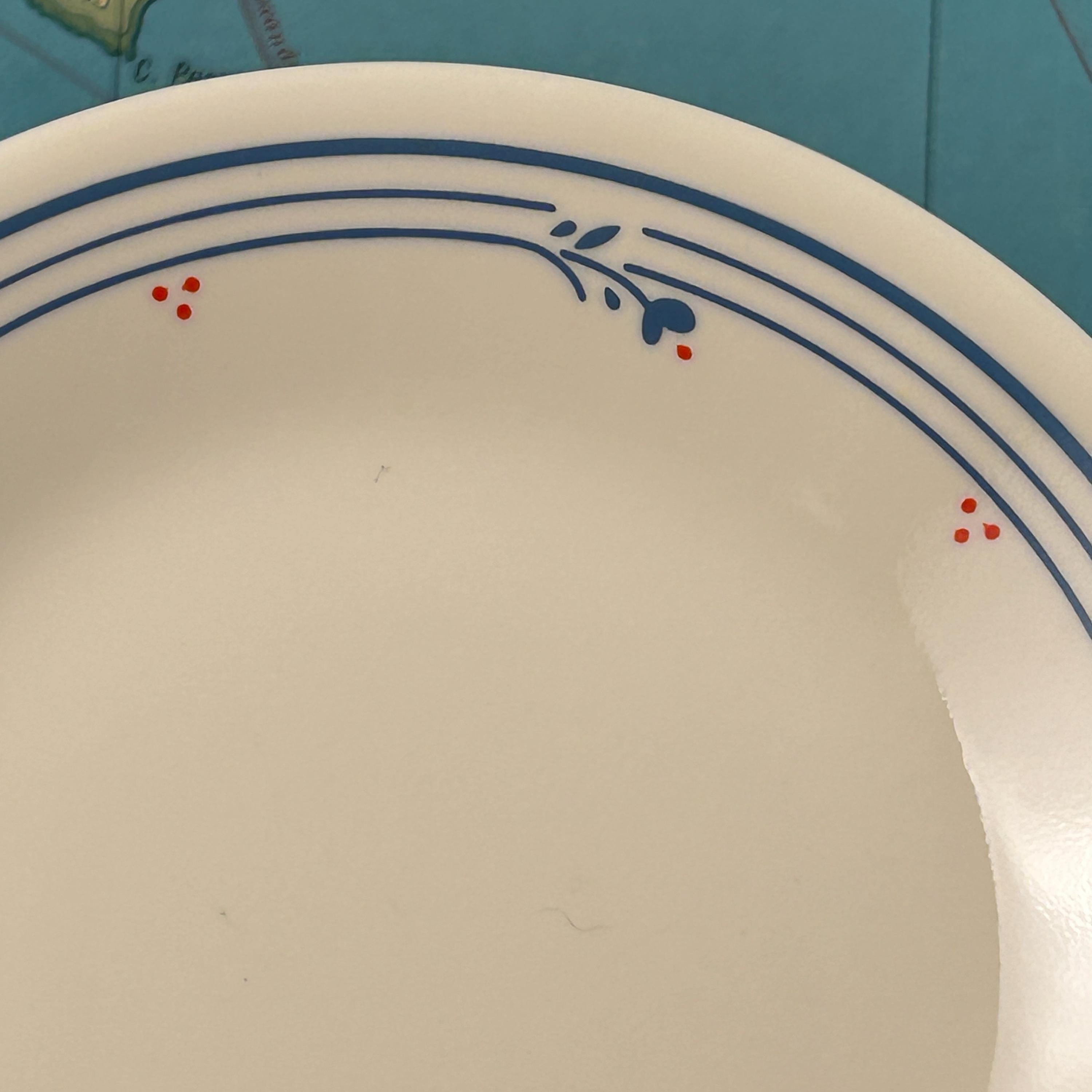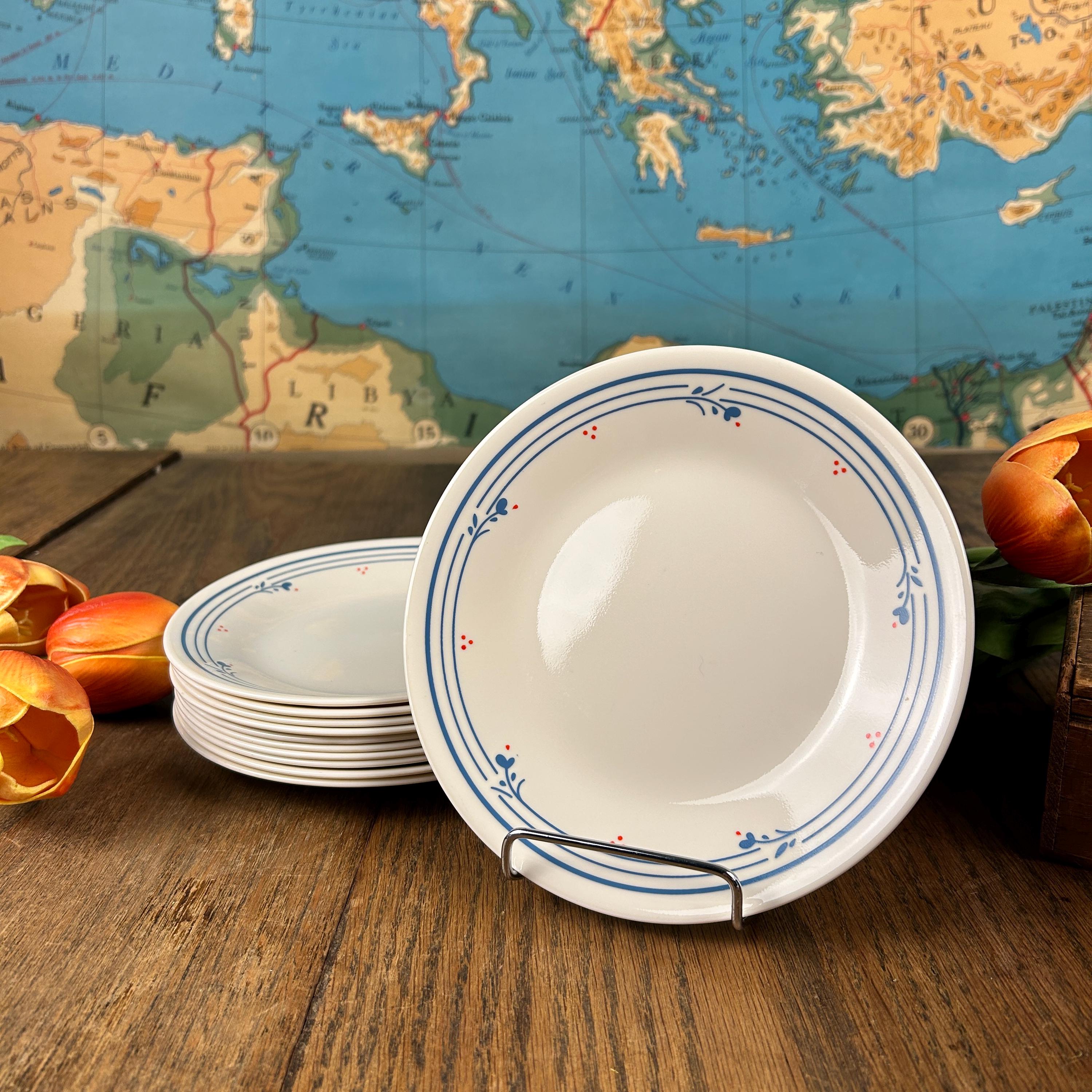 This is a pretty pattern of Corelle called Country Violets that would make perfect replacement pieces for every day use. This set will perfectly compliment your farmhouse kitchen or cottage core decor with its universal pattern. The color is a country blue hue accented by red dots on a beige base. These plates measure approximately 6.5" in diameter. They are clean and scratch-free. No paint loss. No chips or cracks can be seen. Please see all photos as they are part of the description.