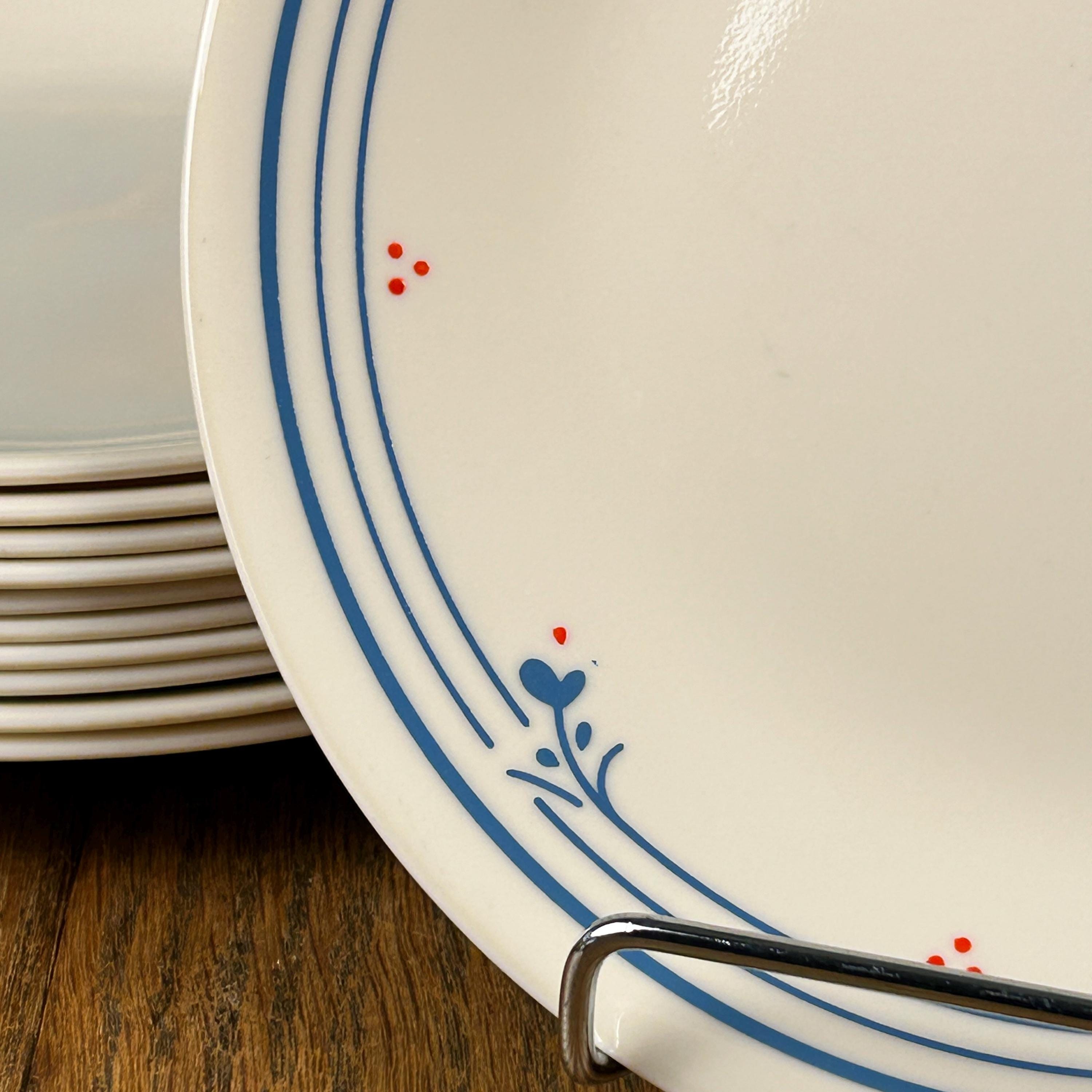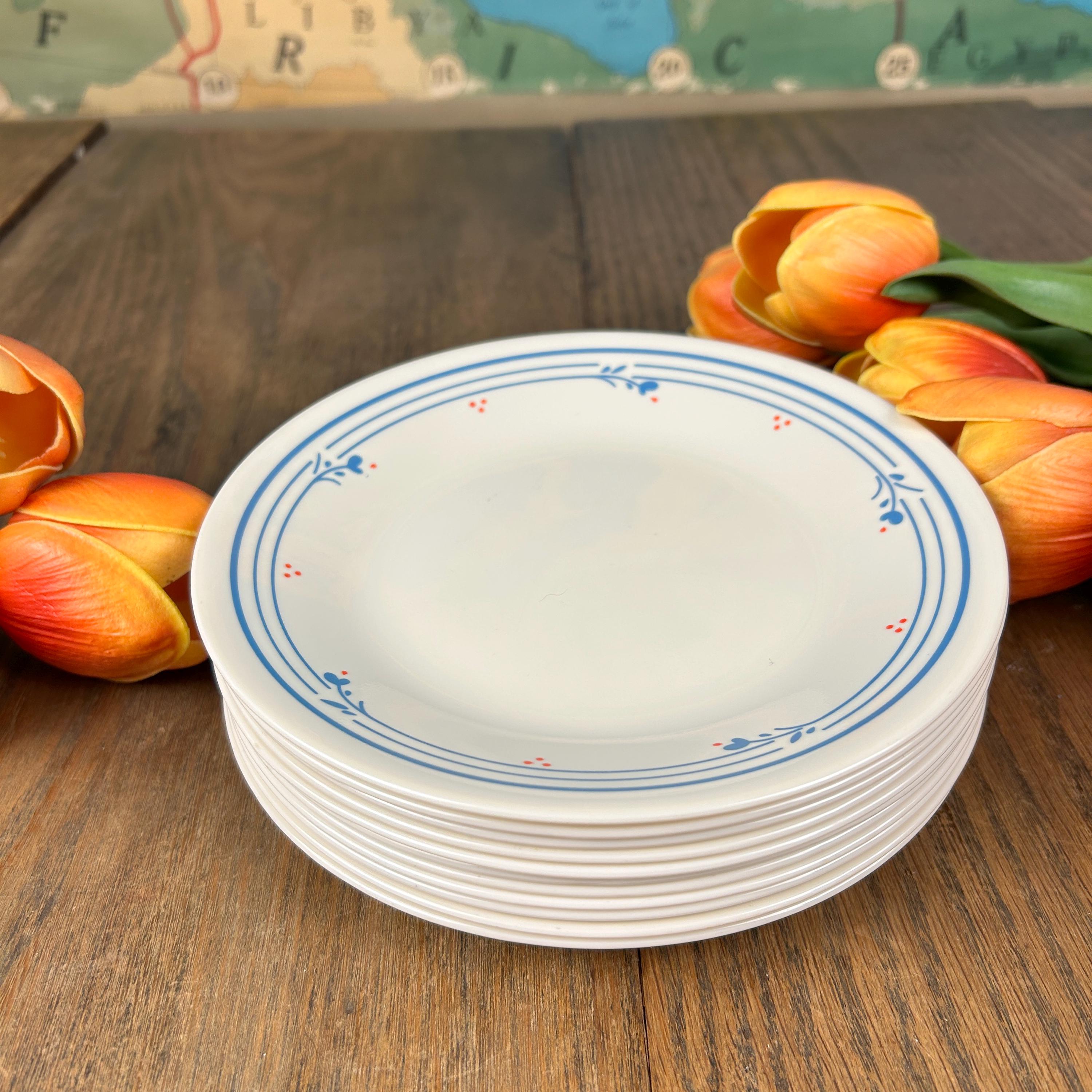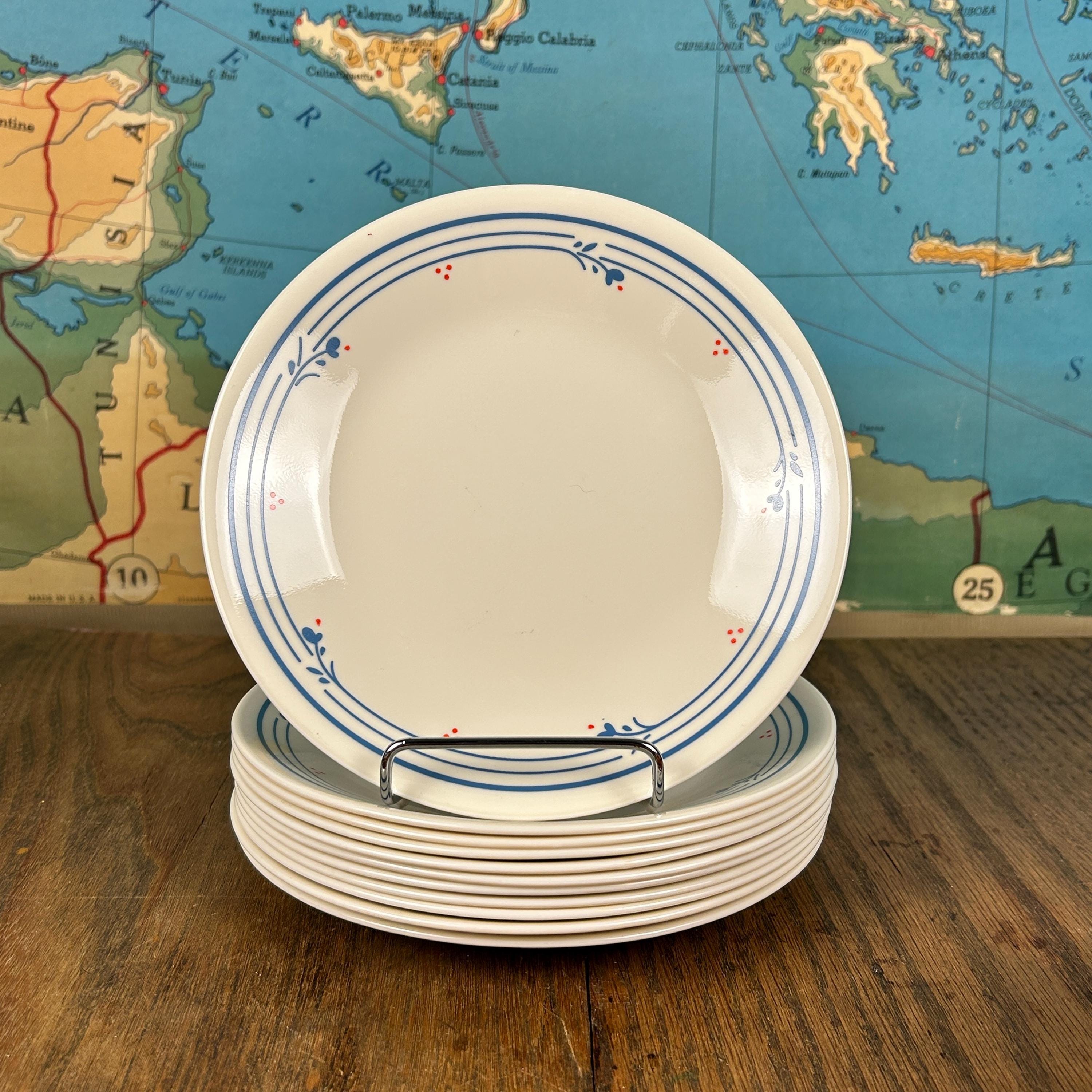 This is a pretty pattern of Corelle called Country Violets that would make perfect replacement pieces for every day use. This set will perfectly compliment your farmhouse kitchen or cottage core decor with its universal pattern. The color is a country blue hue accented by red dots on a beige base. These plates measure approximately 6.5" in diameter. They are clean and scratch-free. No paint loss. No chips or cracks can be seen. Please see all photos as they are part of the description.