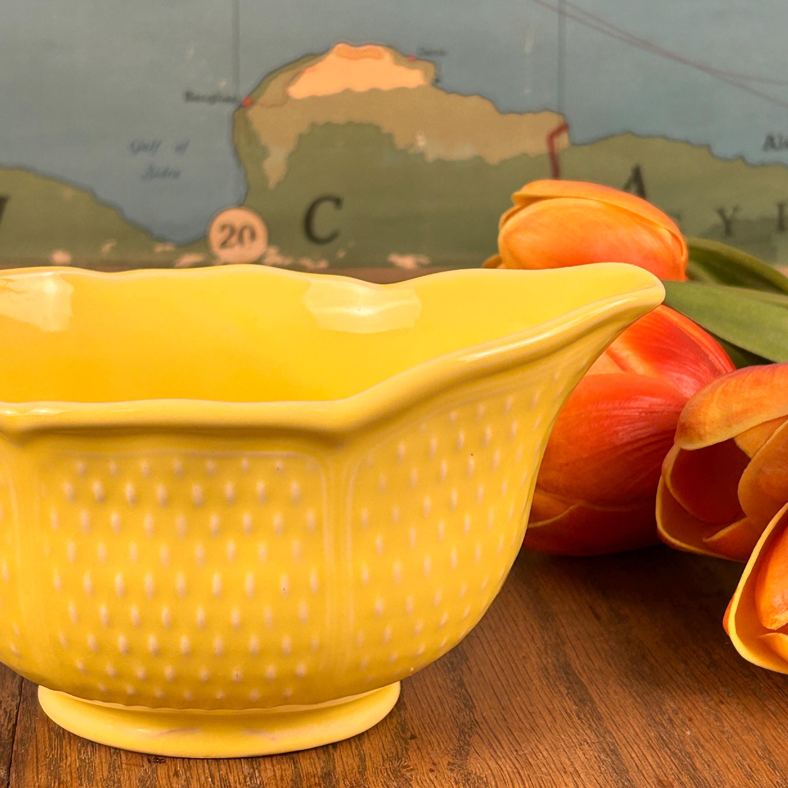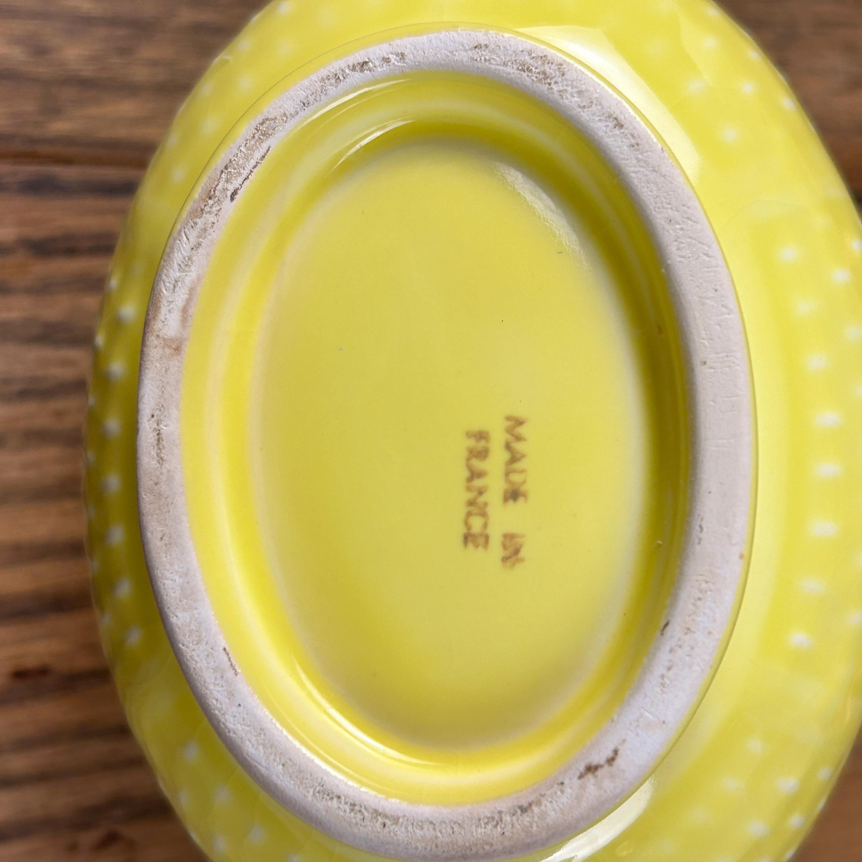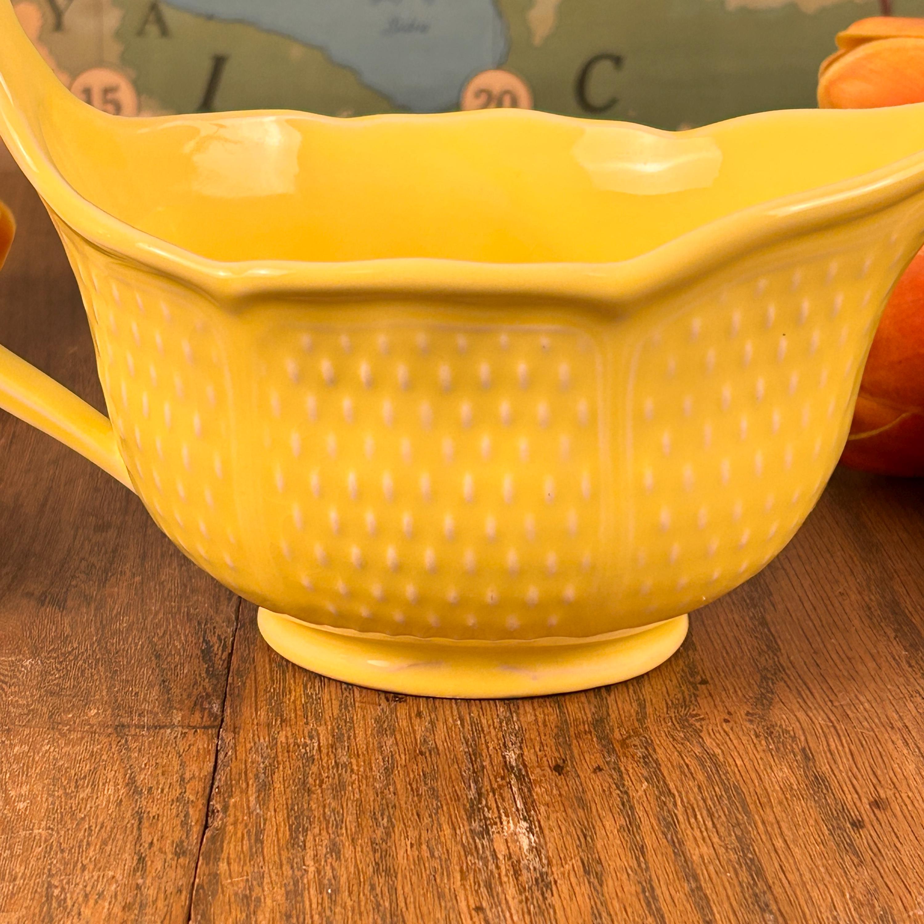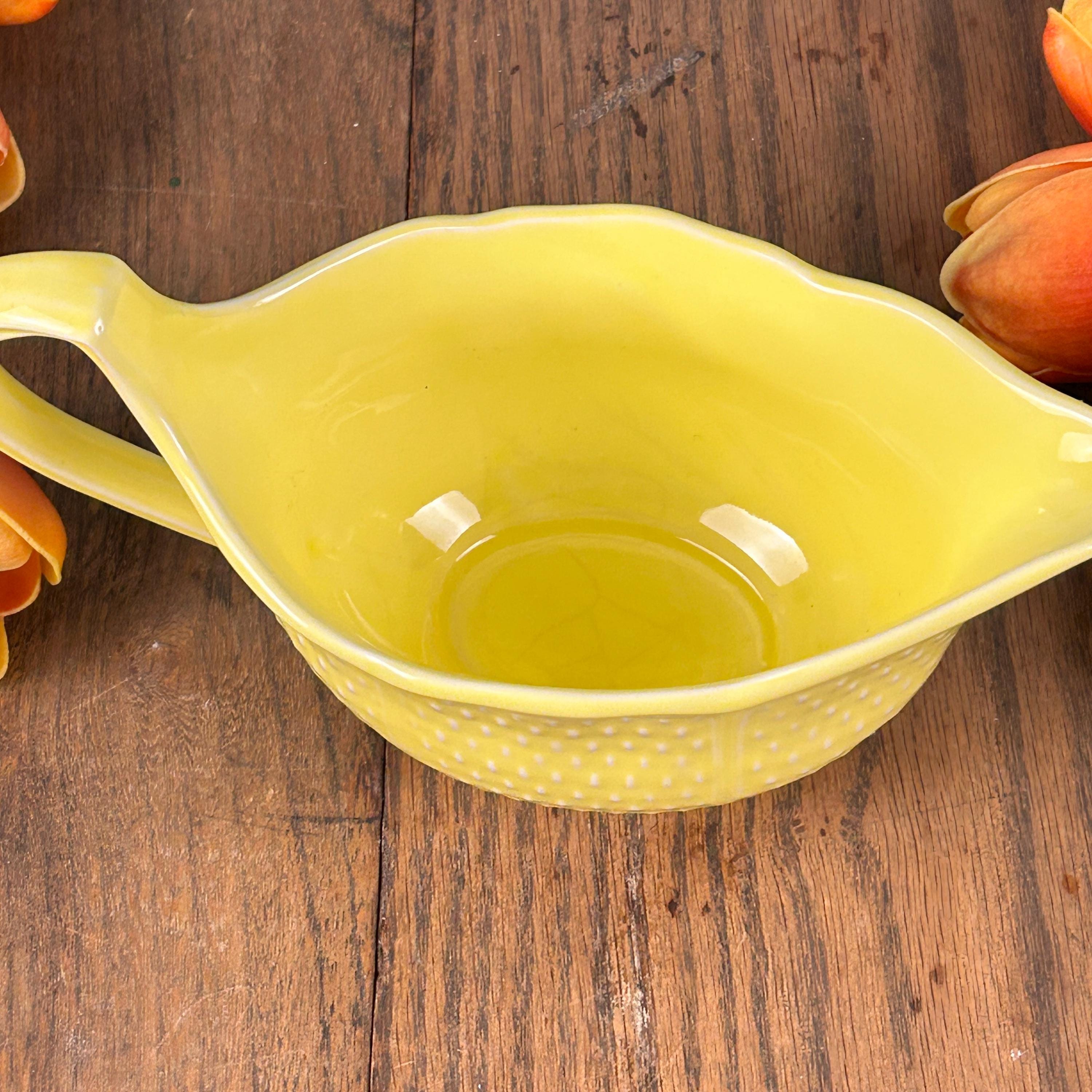 This is a beautiful 8 1/2" x 4" gravy boat made in France by Bon Vivant. Scarce on the internet, but notably attractive, this piece is a bright, nearly Fiesta-style sunny yellow, with raised accents. On the outside, there are panels of textured dashes. On the underside, Made in France. It is charming, sure to bring a bit of sunshine to your day whenever you use it.