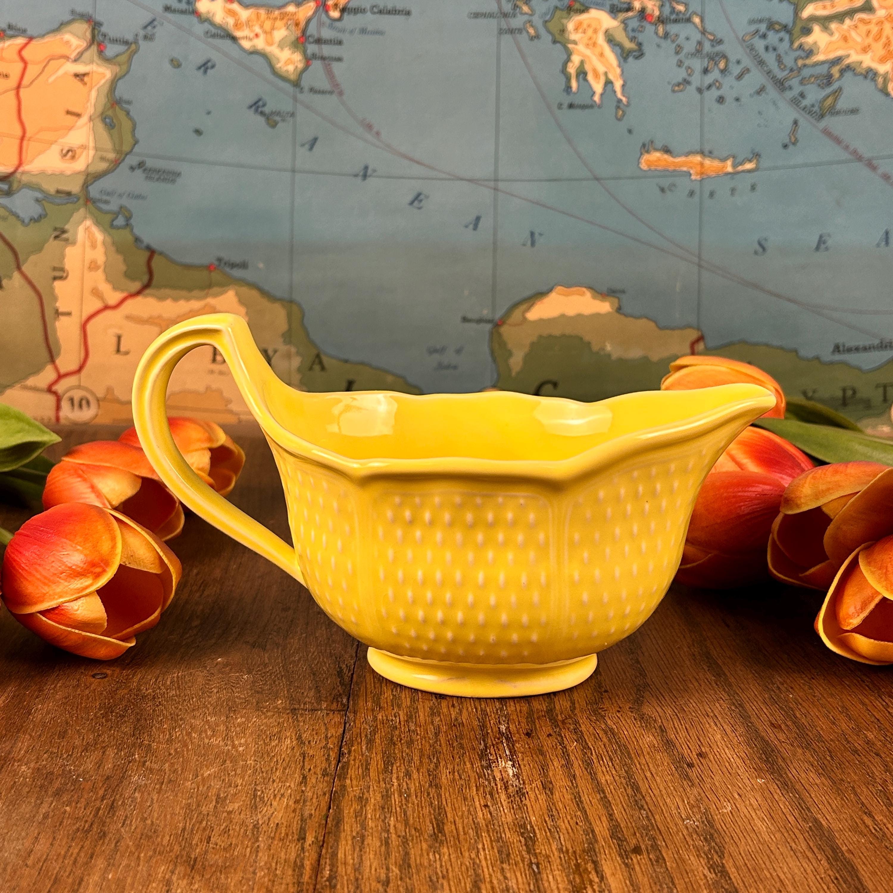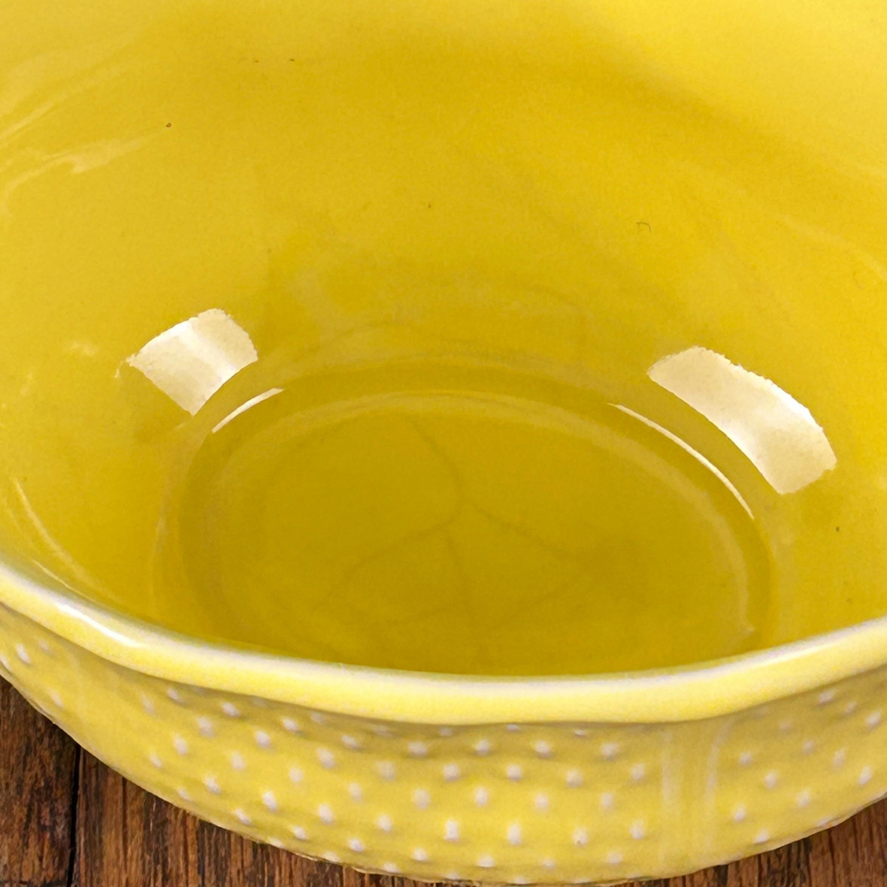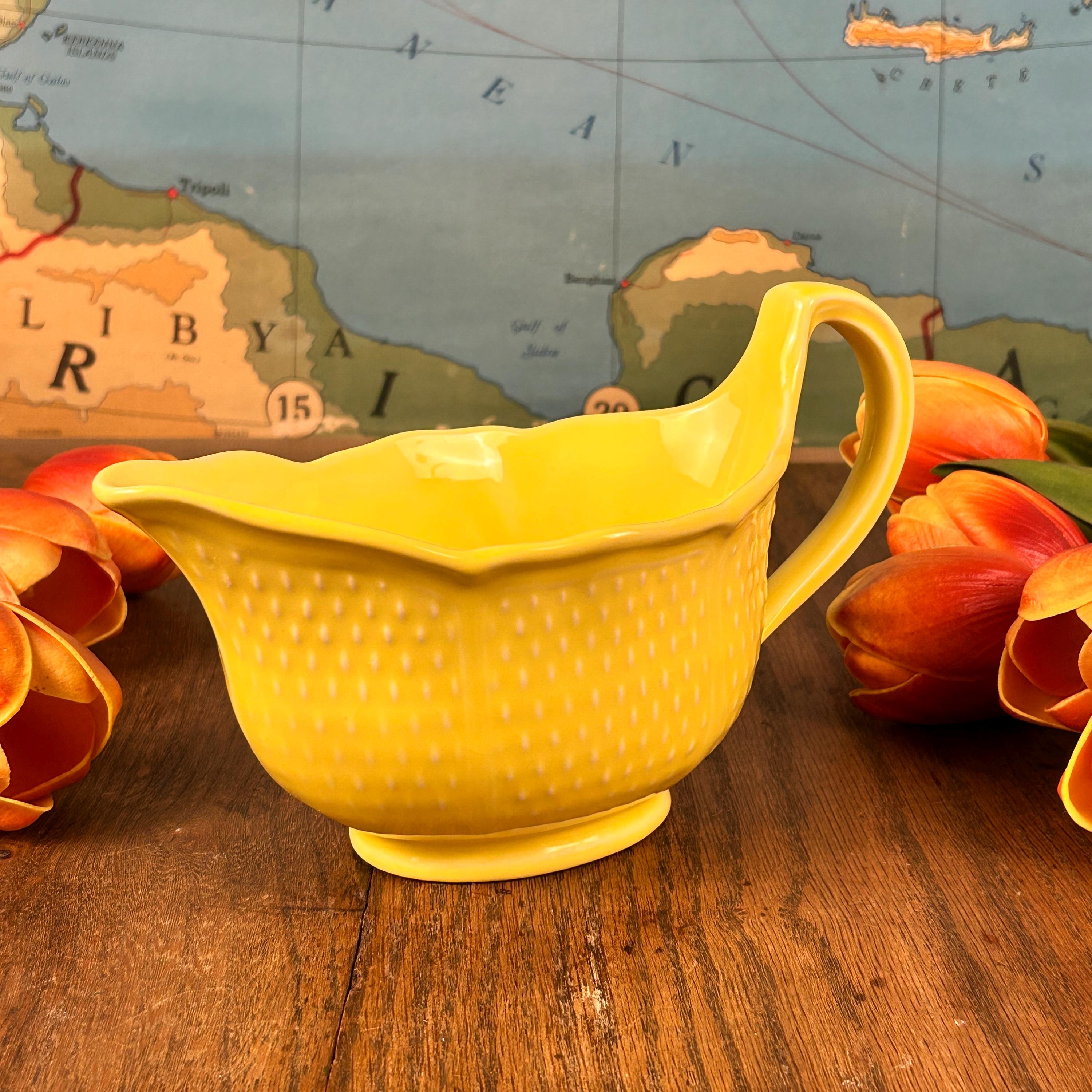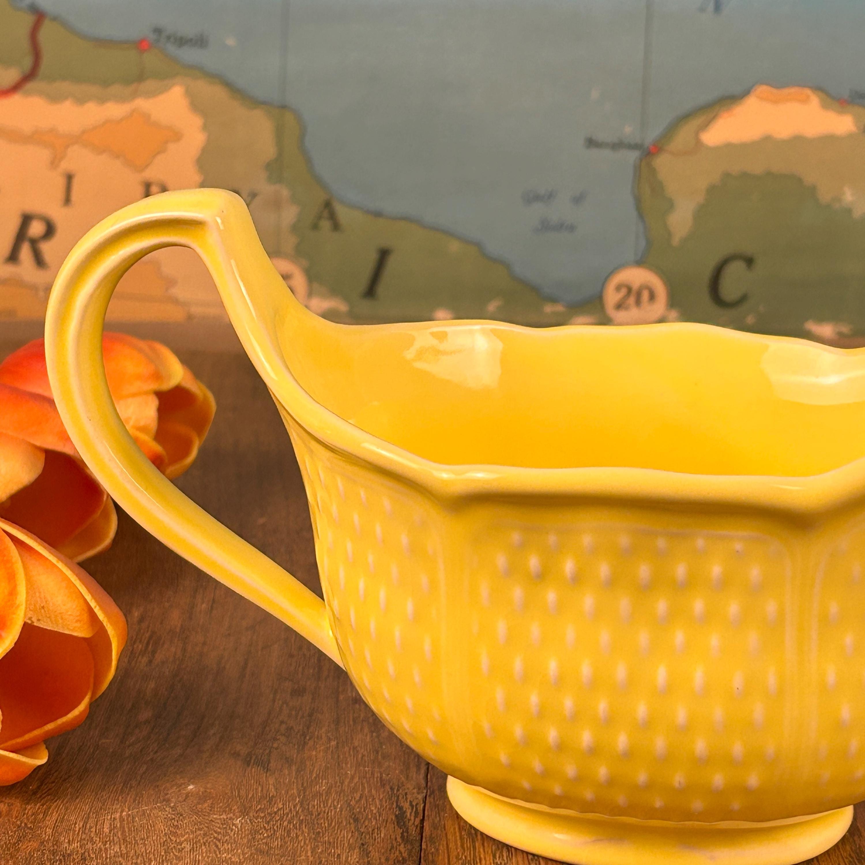 This is a beautiful 8 1/2" x 4" gravy boat made in France by Bon Vivant. Scarce on the internet, but notably attractive, this piece is a bright, nearly Fiesta-style sunny yellow, with raised accents. On the outside, there are panels of textured dashes. On the underside, Made in France. It is charming, sure to bring a bit of sunshine to your day whenever you use it.