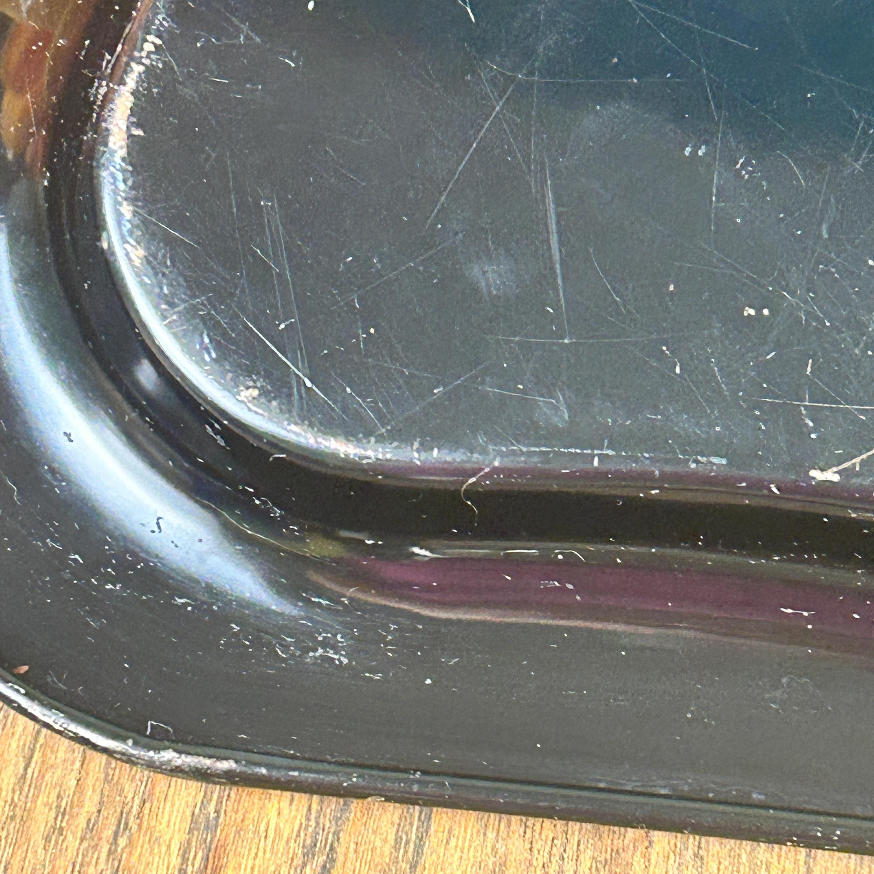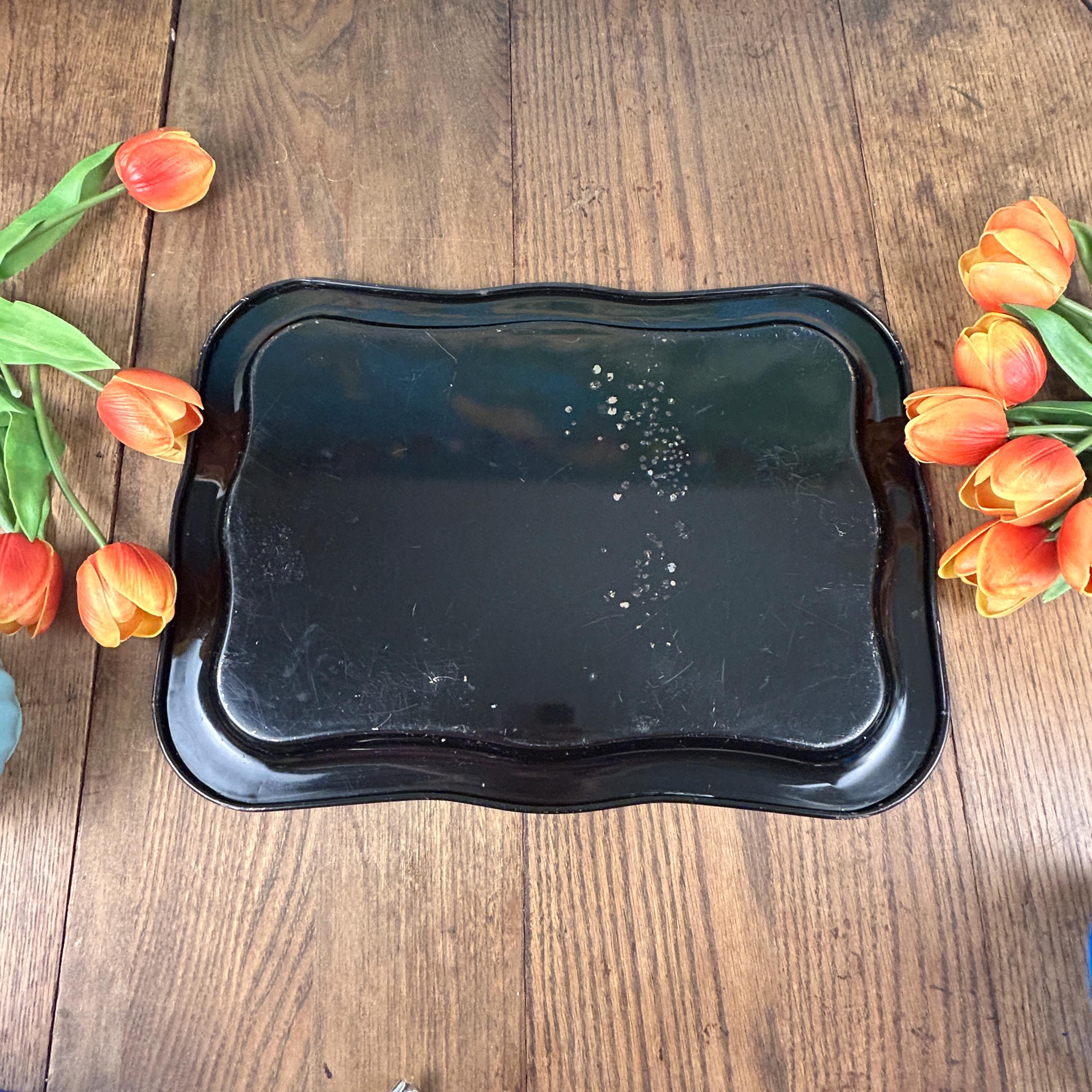 The tray measures a little over 18" x 13" and has a raised edge at about 1/2". In wonderful vintage condition with very little wear. Some paint loss on the back, but not noticeable when in use. Please see all photos as they are part of the description.