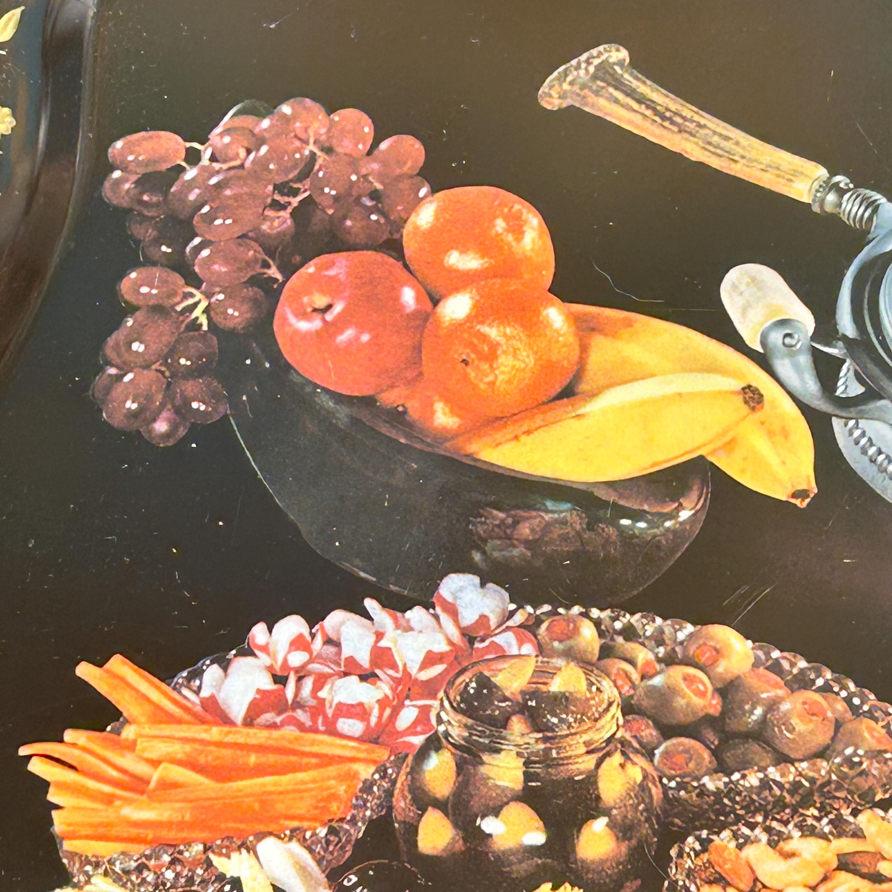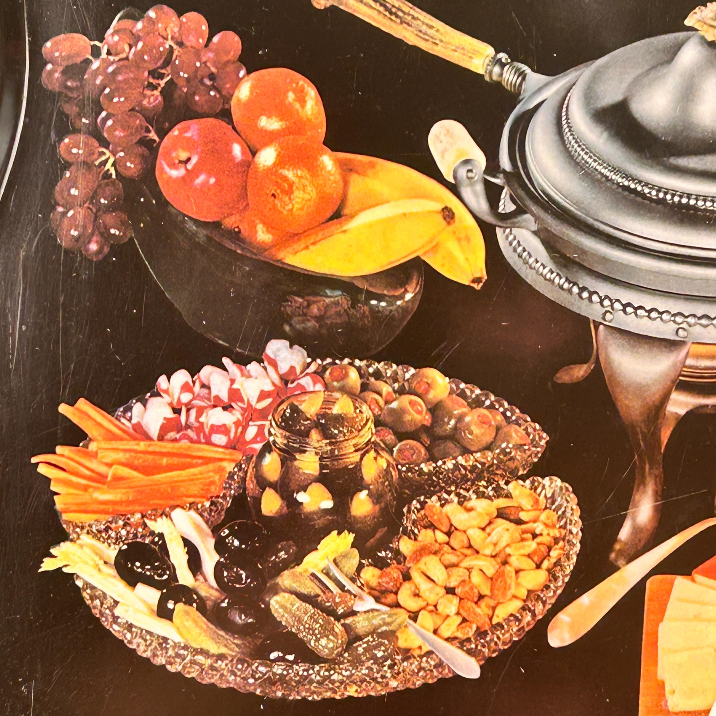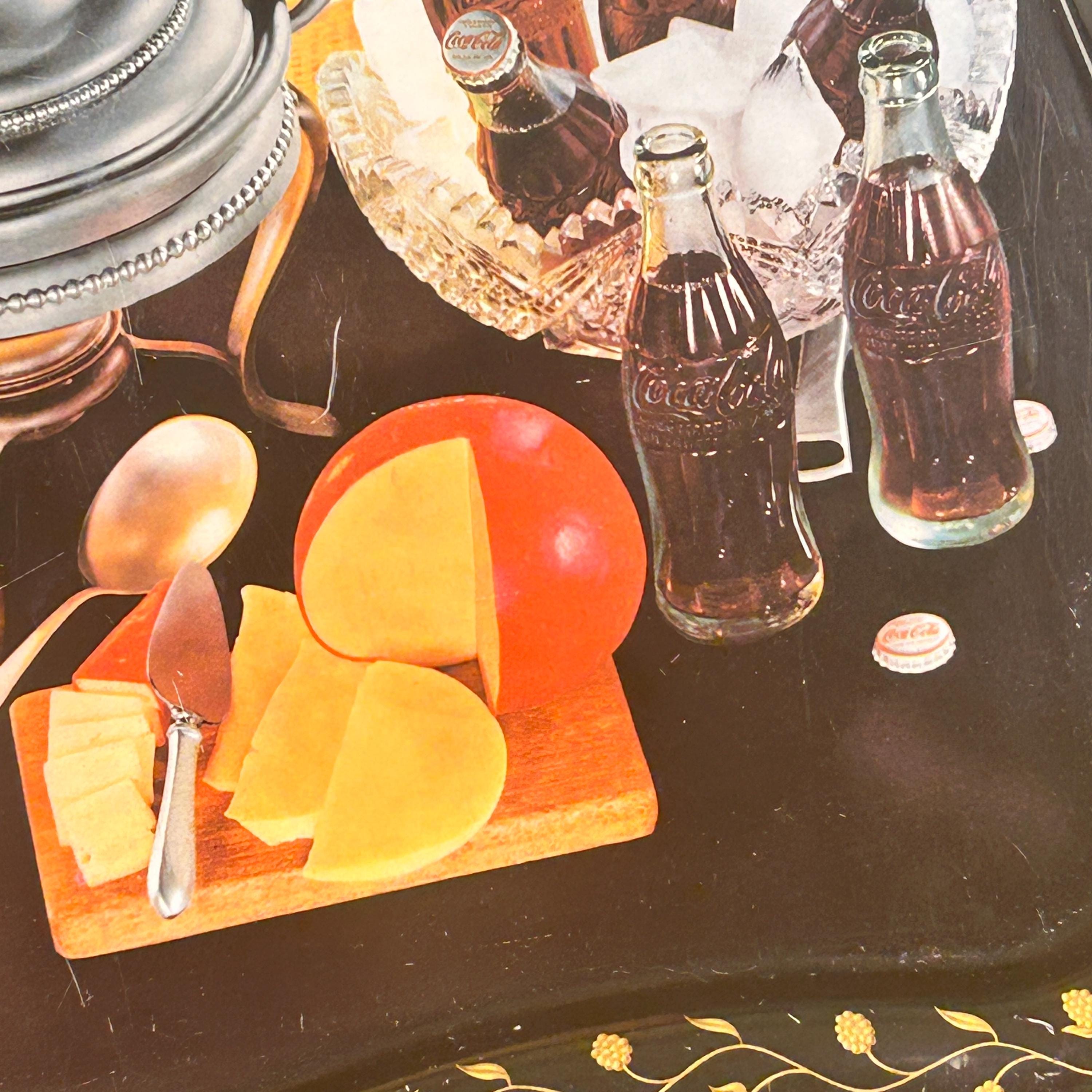 A great piece of Coca-Cola advertising! This large black metal tray features a fondue server with various meats, fruits, and cheeses along with refreshing bottles of Coca-Cola. Surrounded by a floral and leaf design that encircles the outer edges of the tray. Shiny and clear, the colors are vibrant and the images are clear.