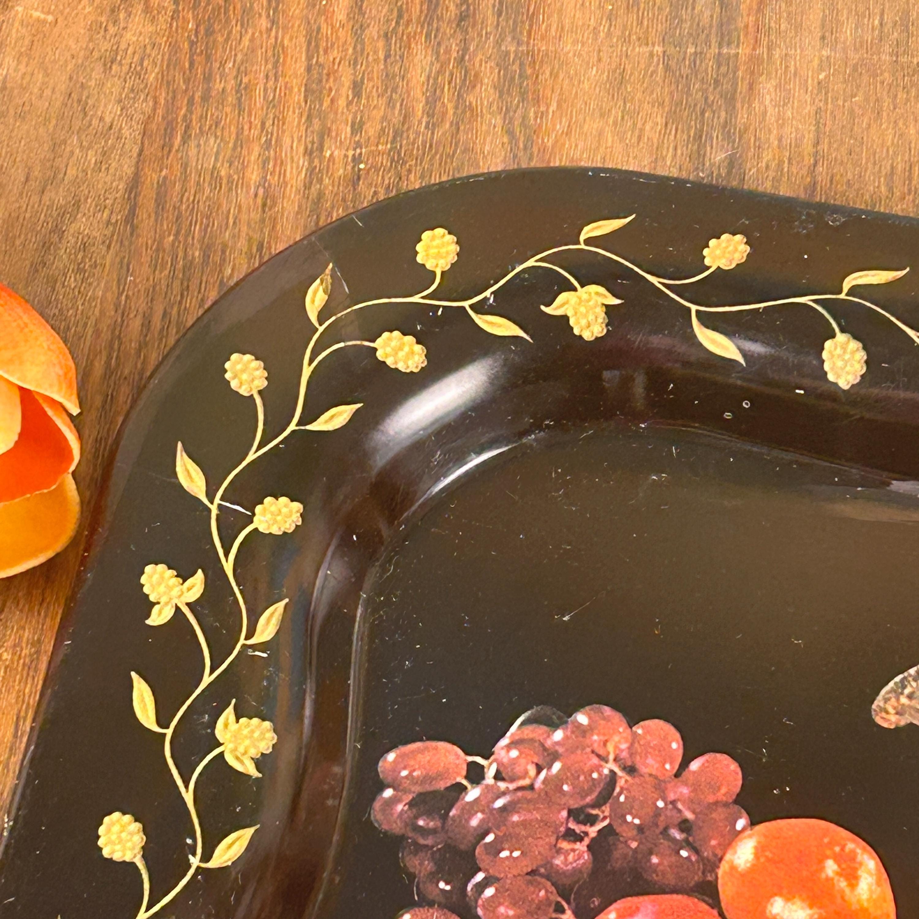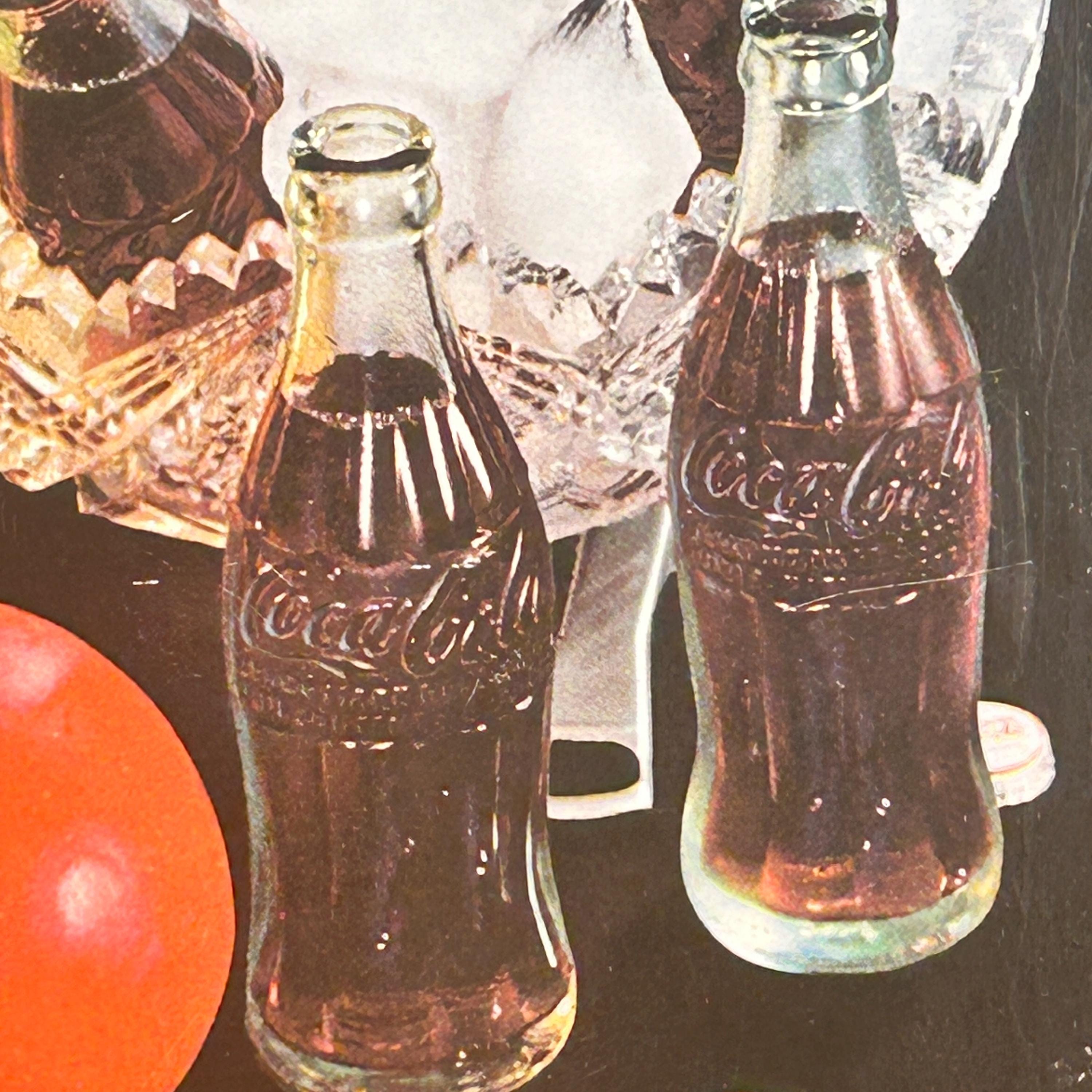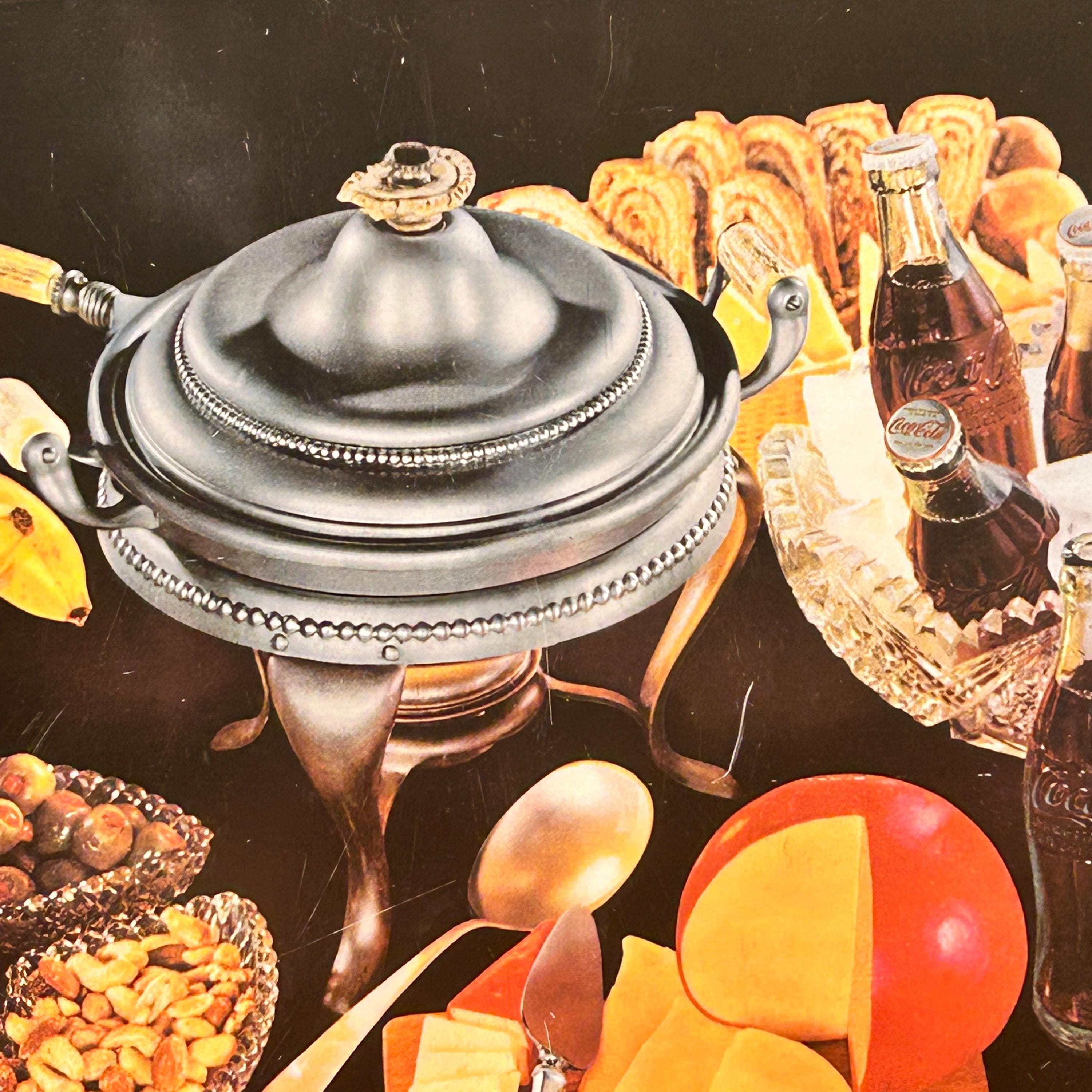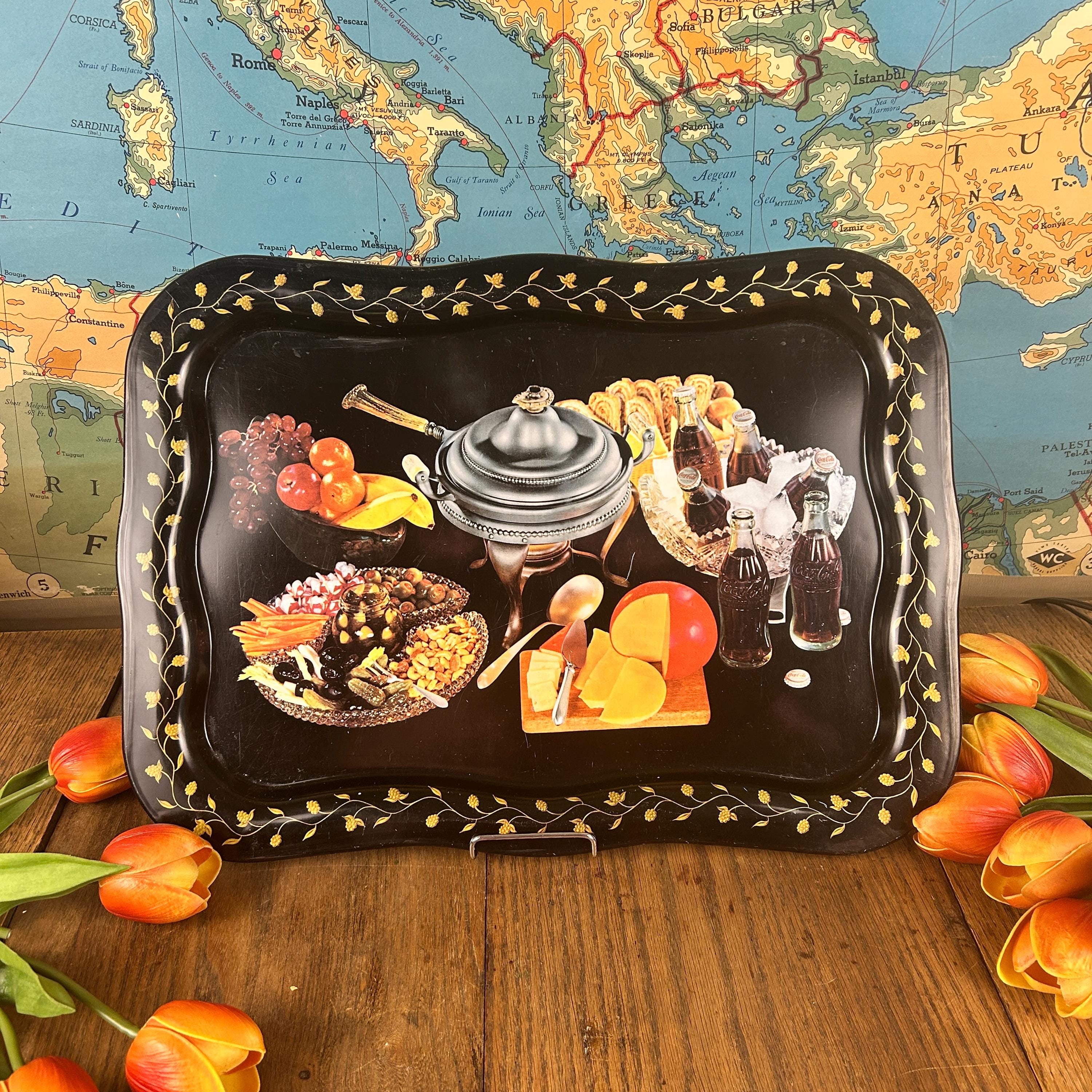A great piece of Coca-Cola advertising! This large black metal tray features a fondue server with various meats, fruits, and cheeses along with refreshing bottles of Coca-Cola. Surrounded by a floral and leaf design that encircles the outer edges of the tray. Shiny and clear, the colors are vibrant and the images are clear.