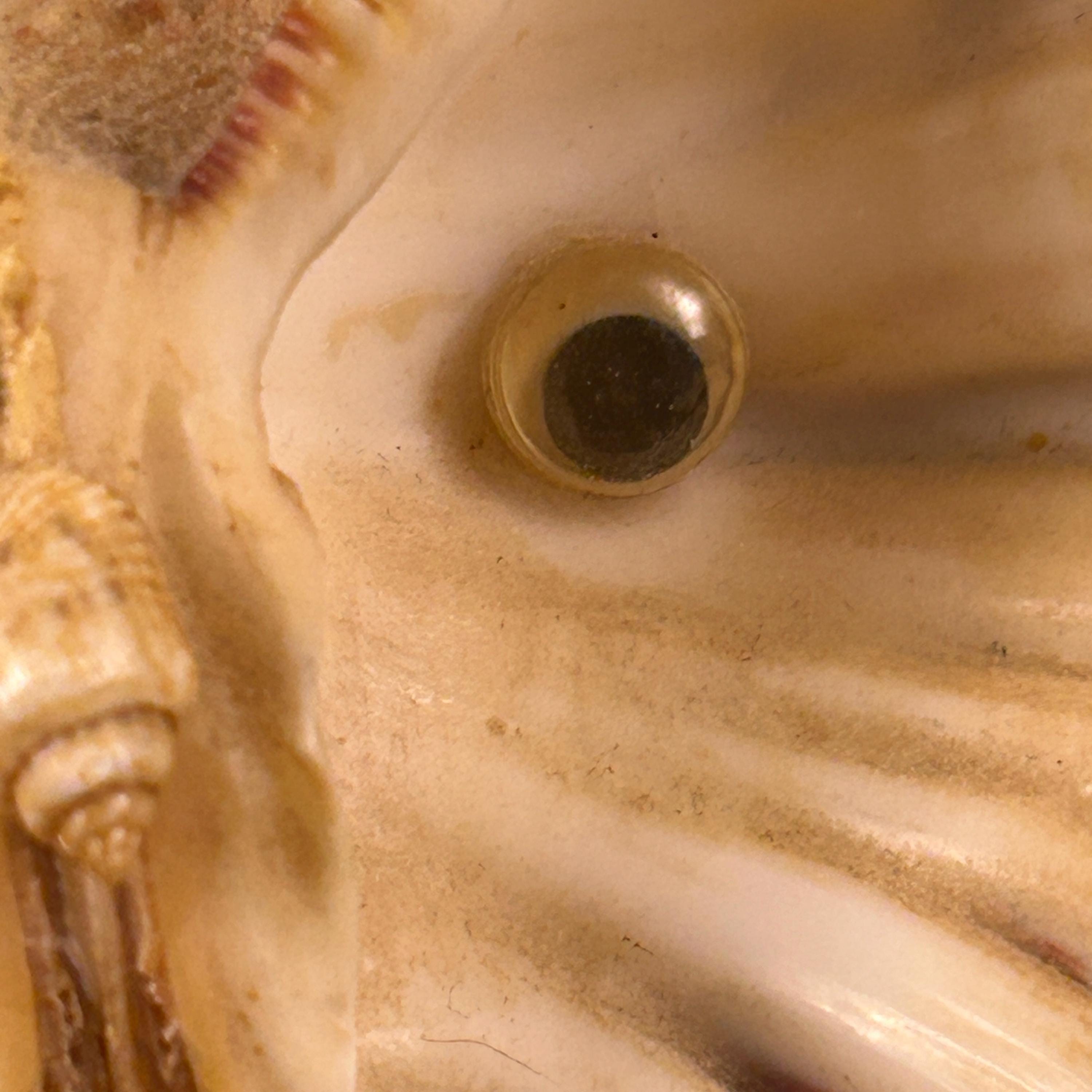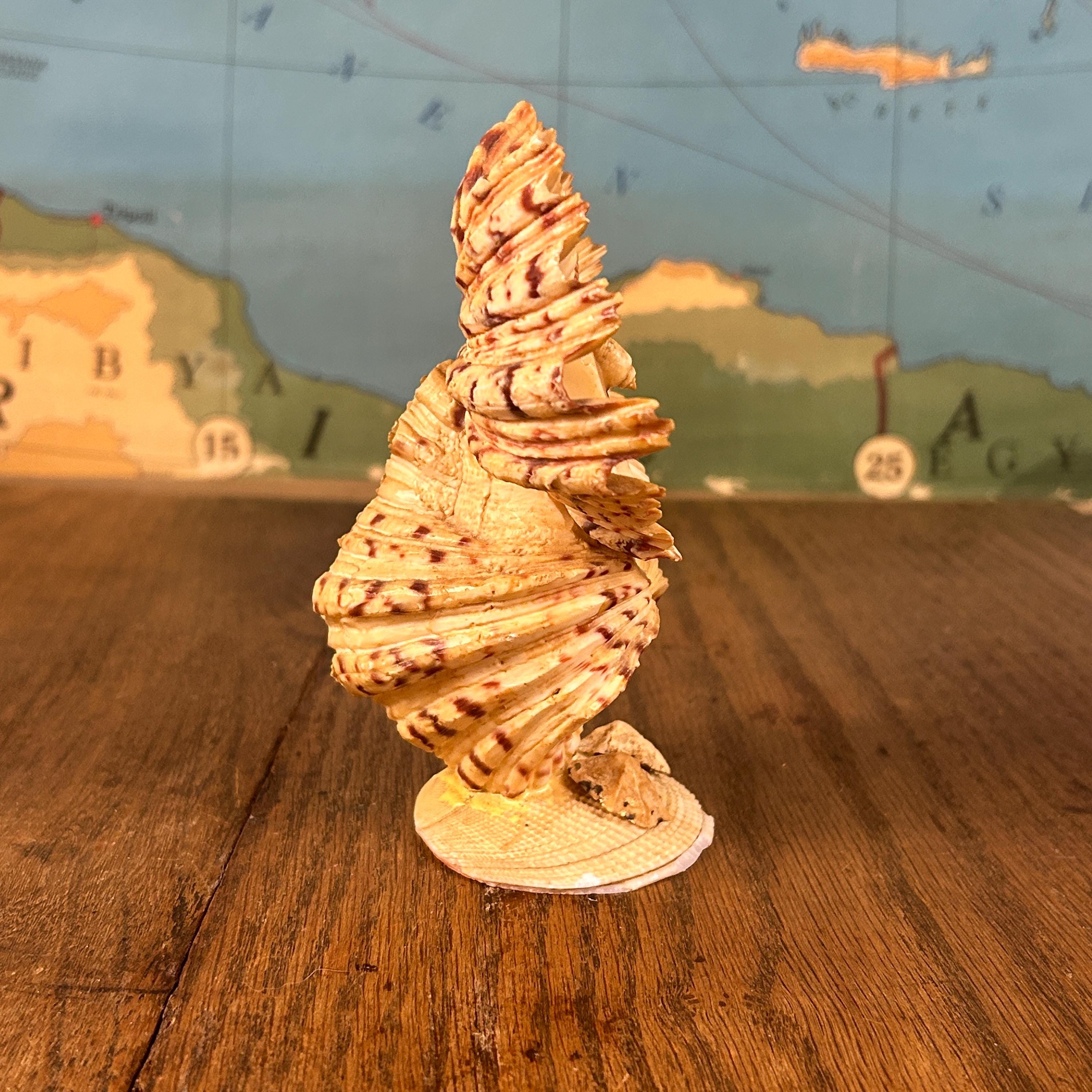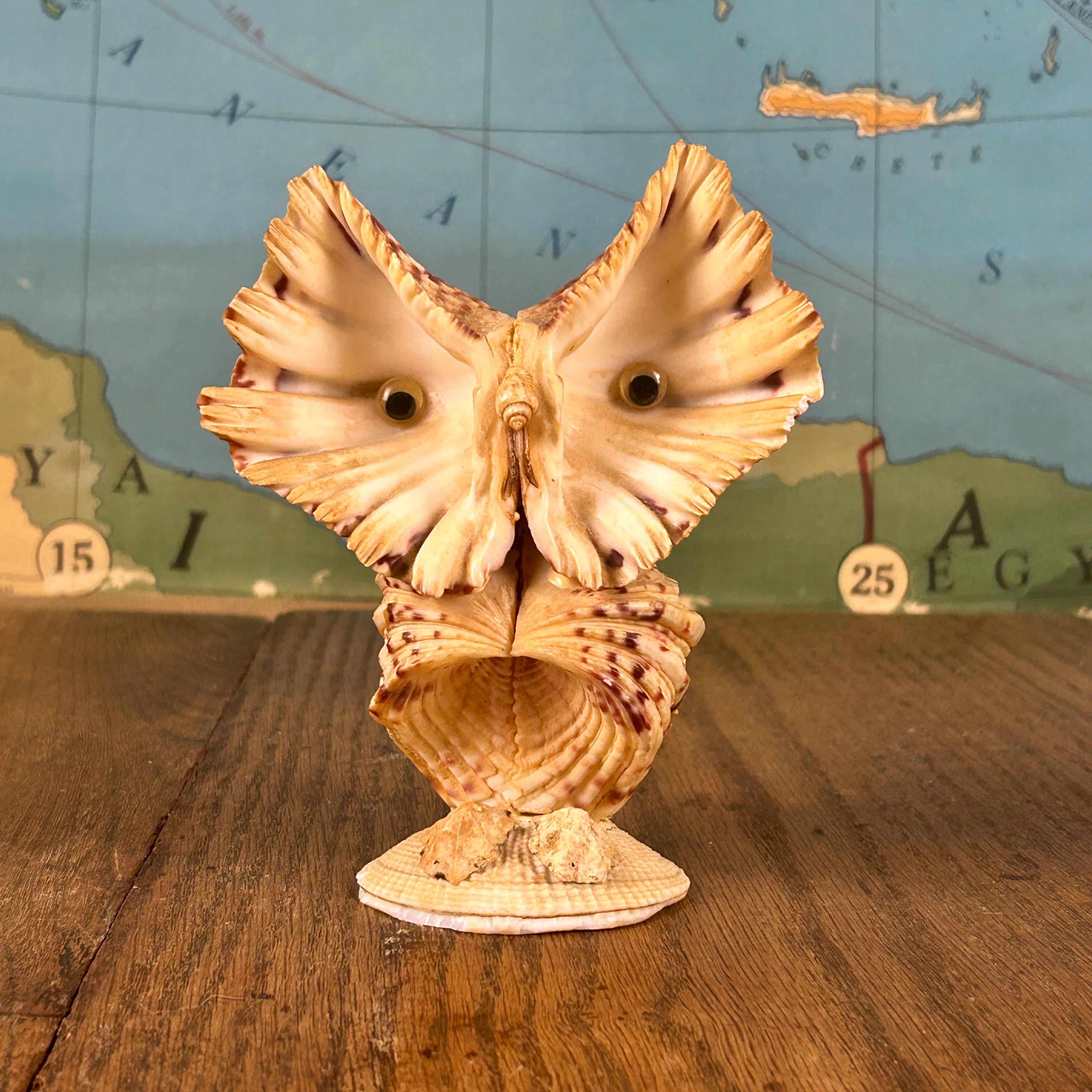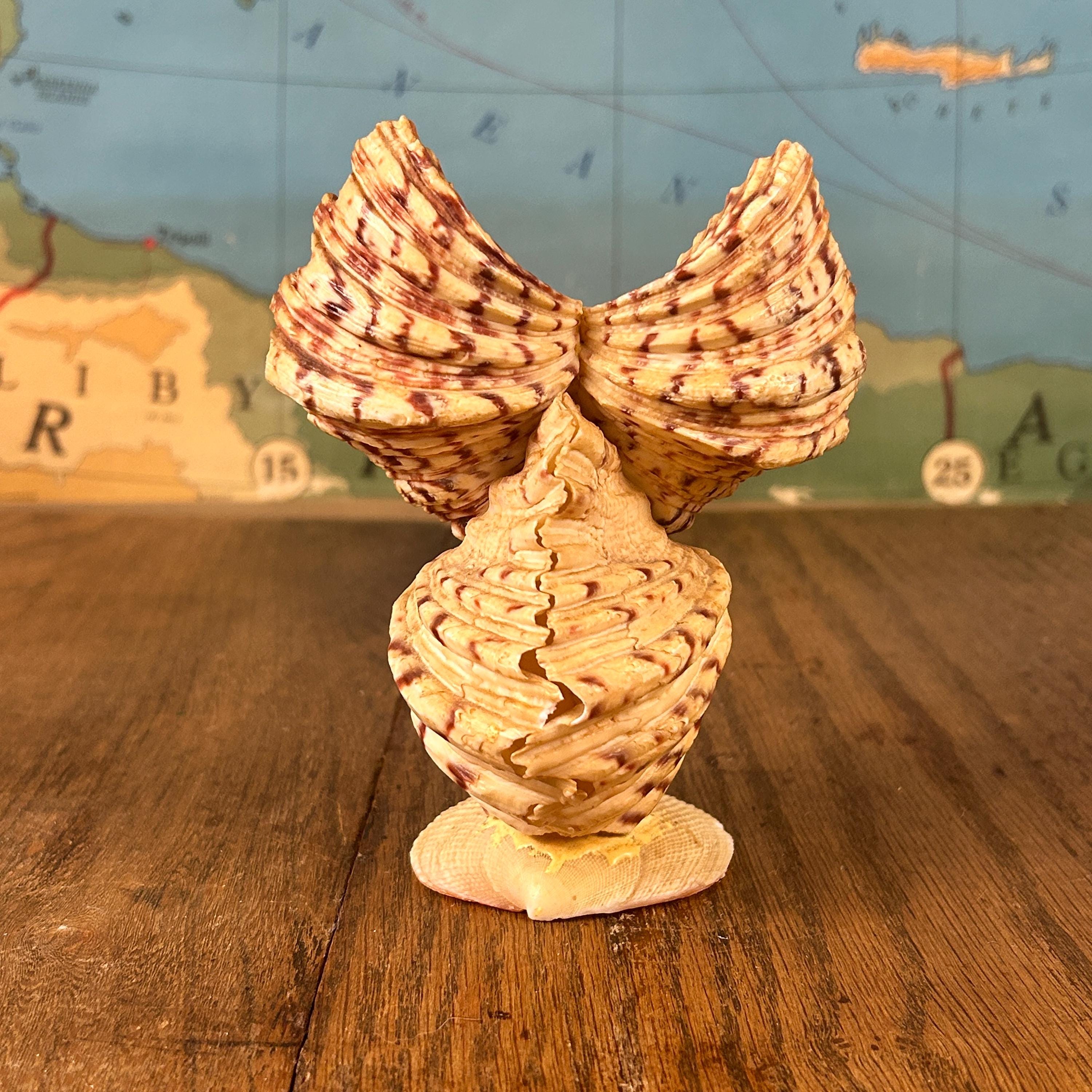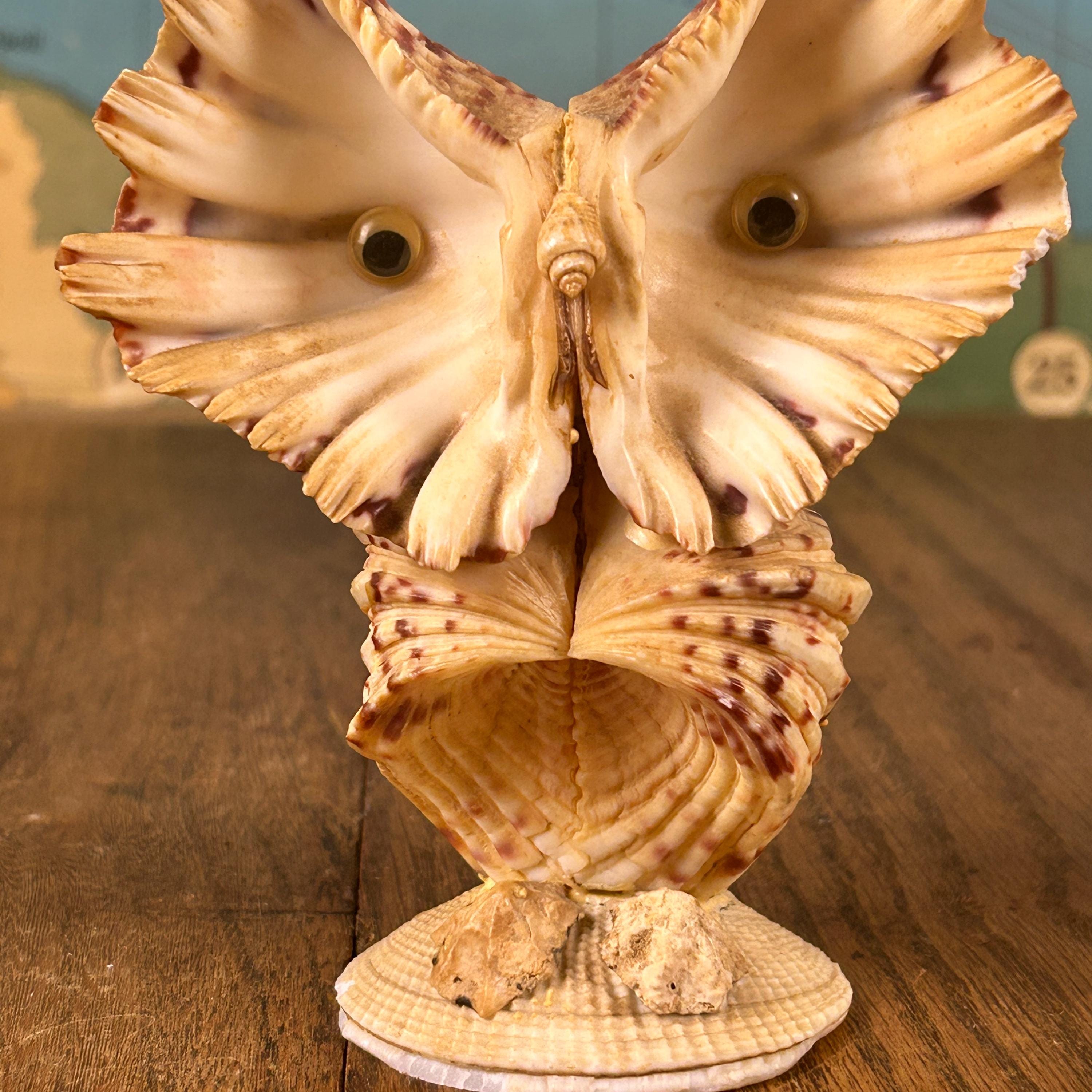The vintage seashell owl figurine is crafted from a variety of natural seashells, including larger shells for the body and wings, smaller shells for detailing, and a distinct shell for the beak.