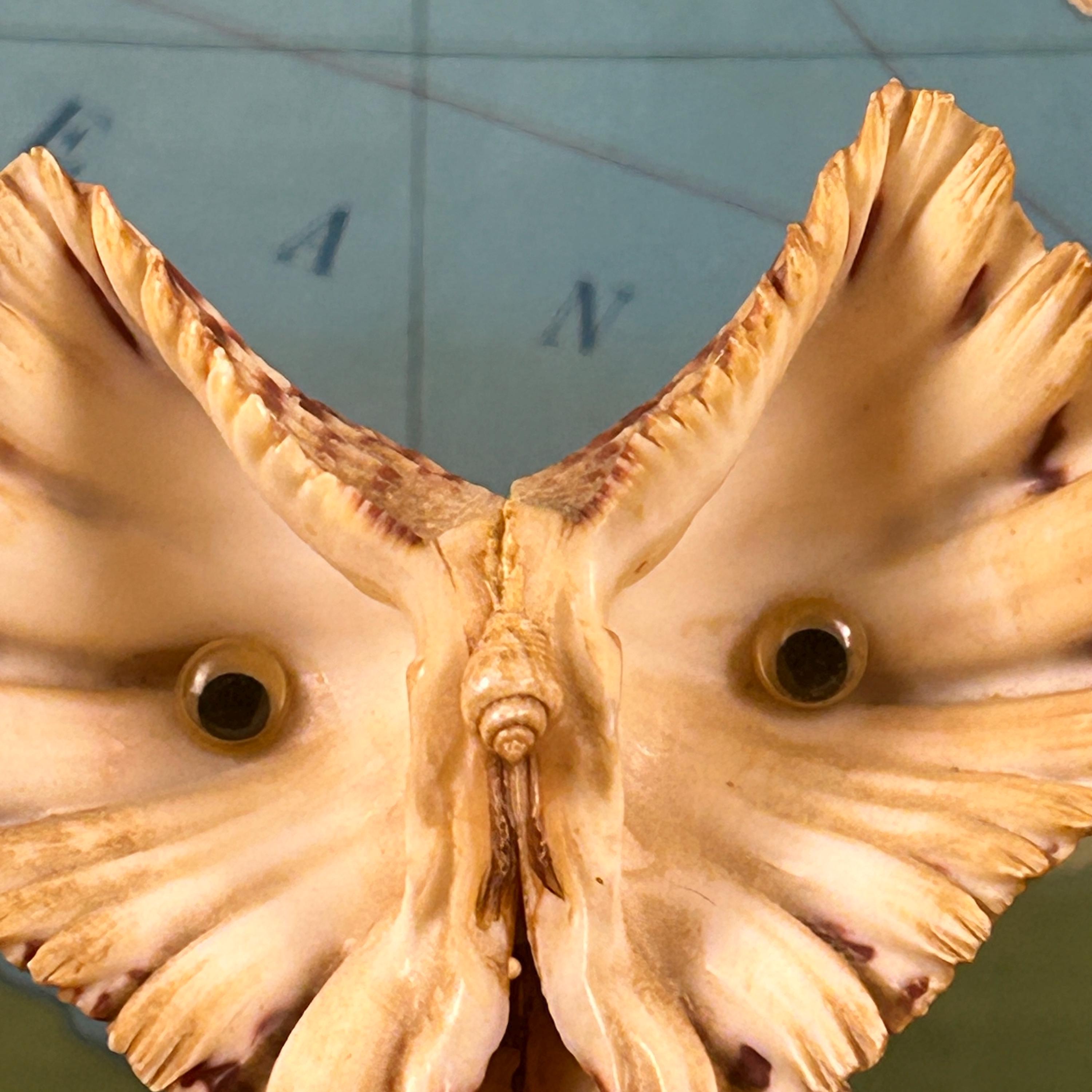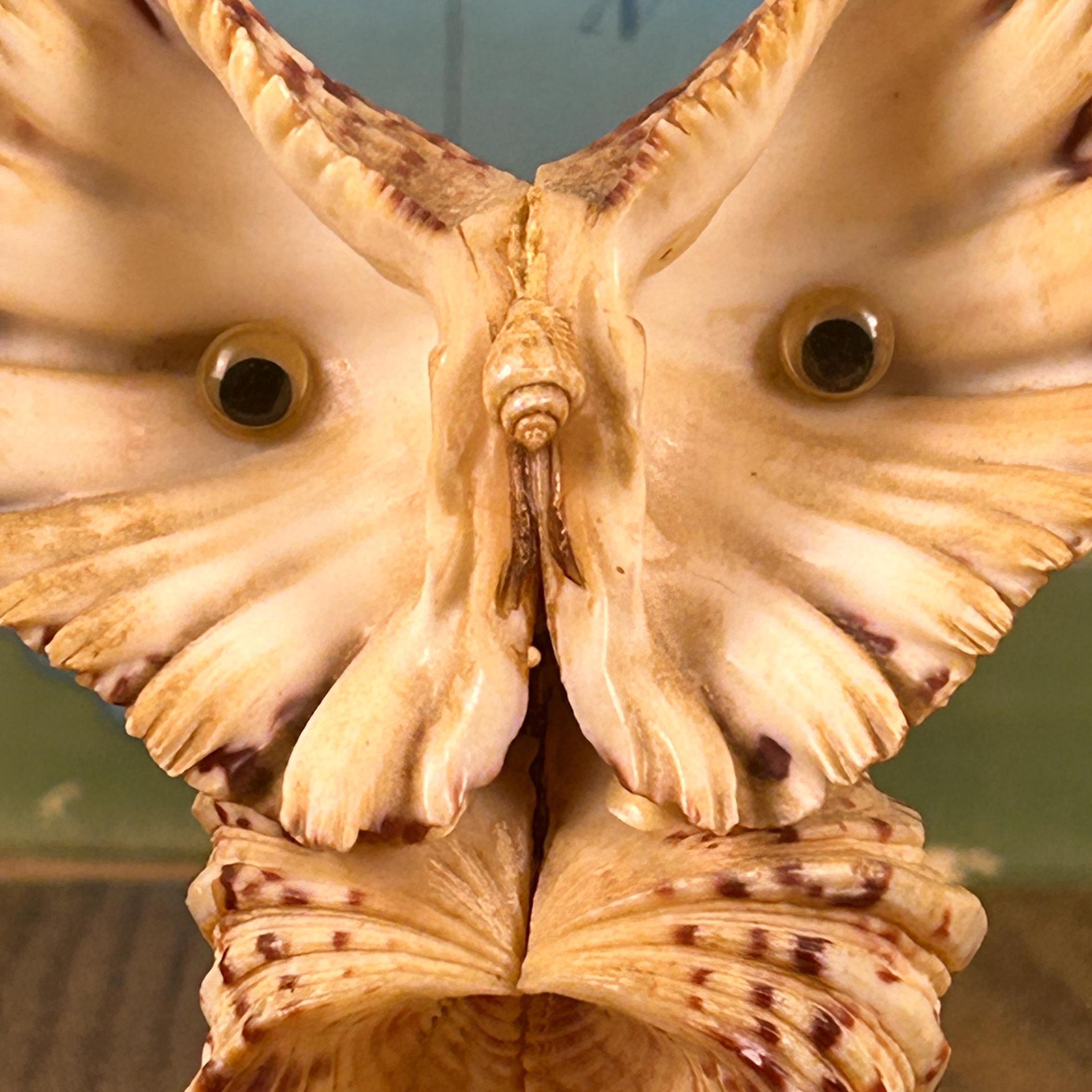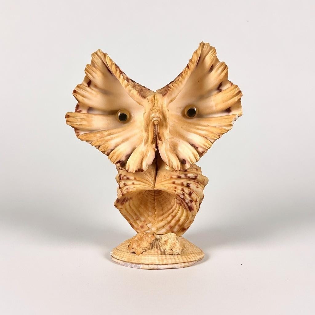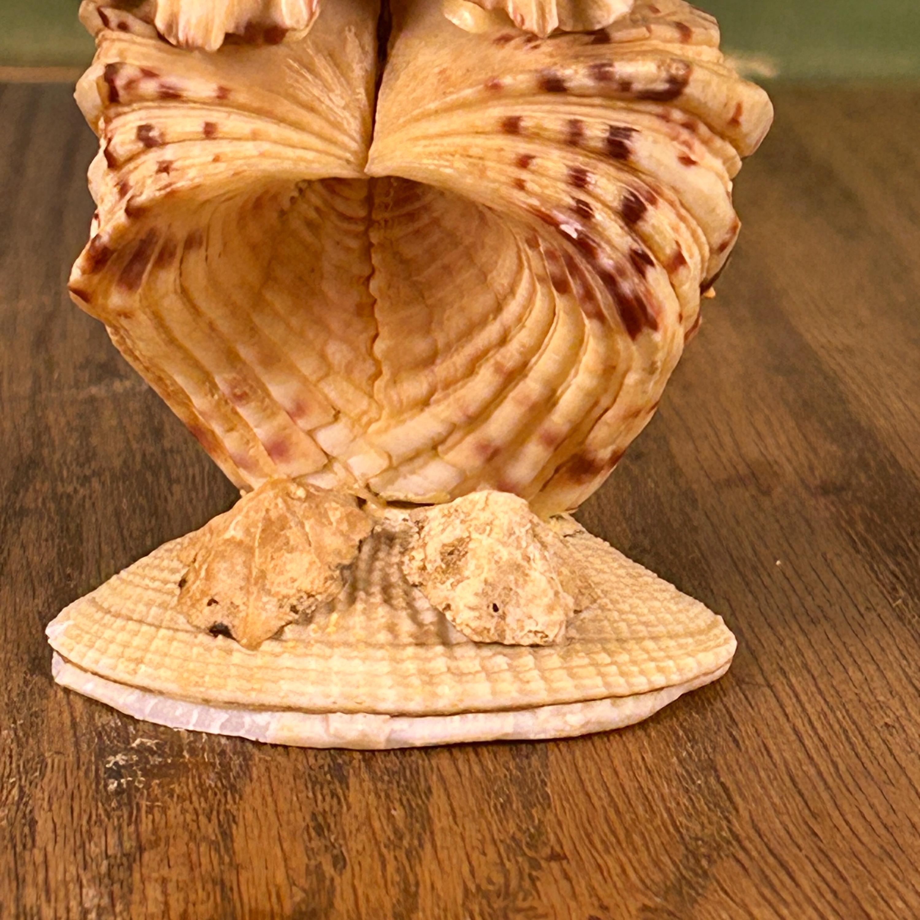 The primary structure of the owl, including its body and wings, appears to be made from larger, fan-shaped or bivalve shells, potentially with natural brown and white variations.