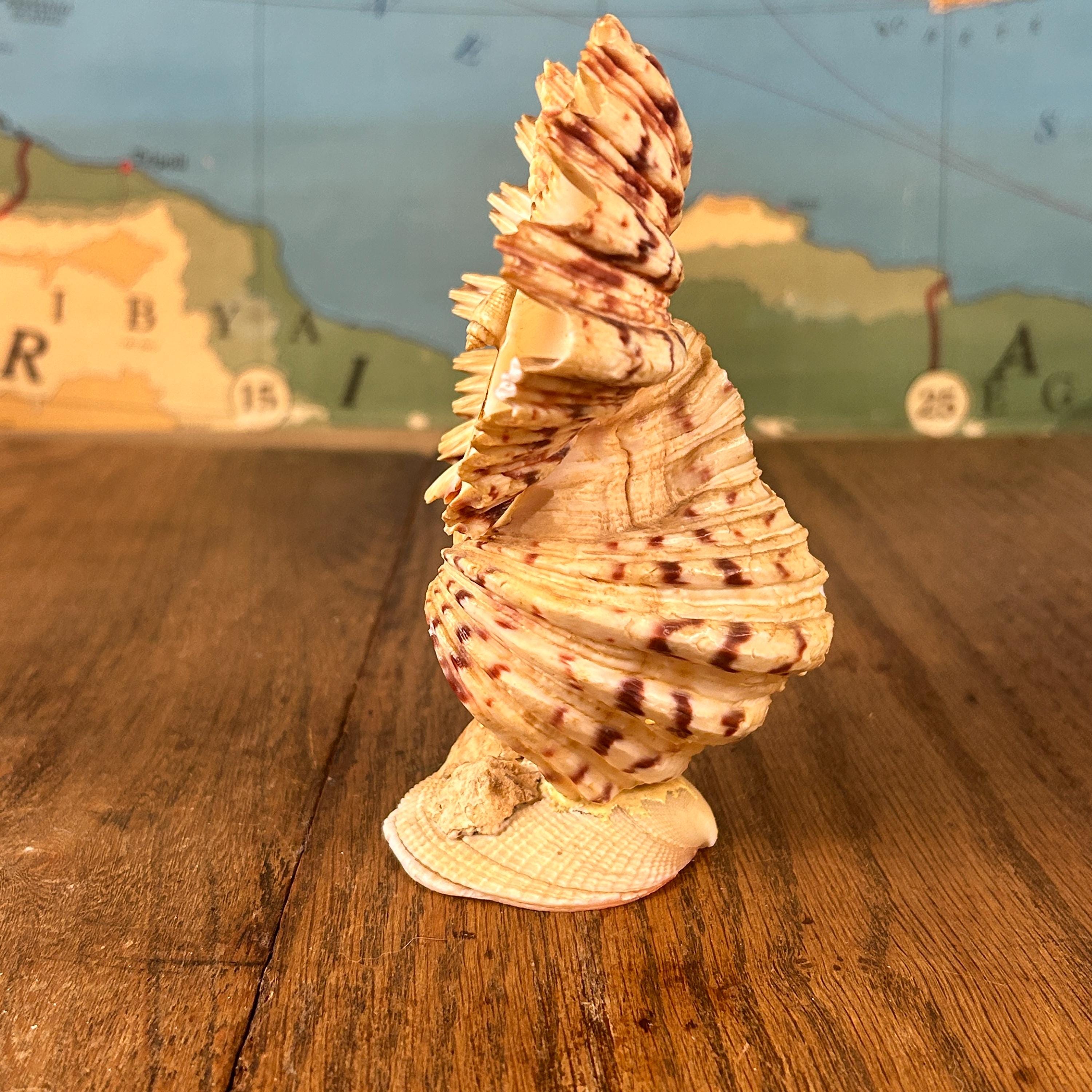 The owl is mounted on a base that may also incorporate shells or a heavy material like plaster covered with shells.