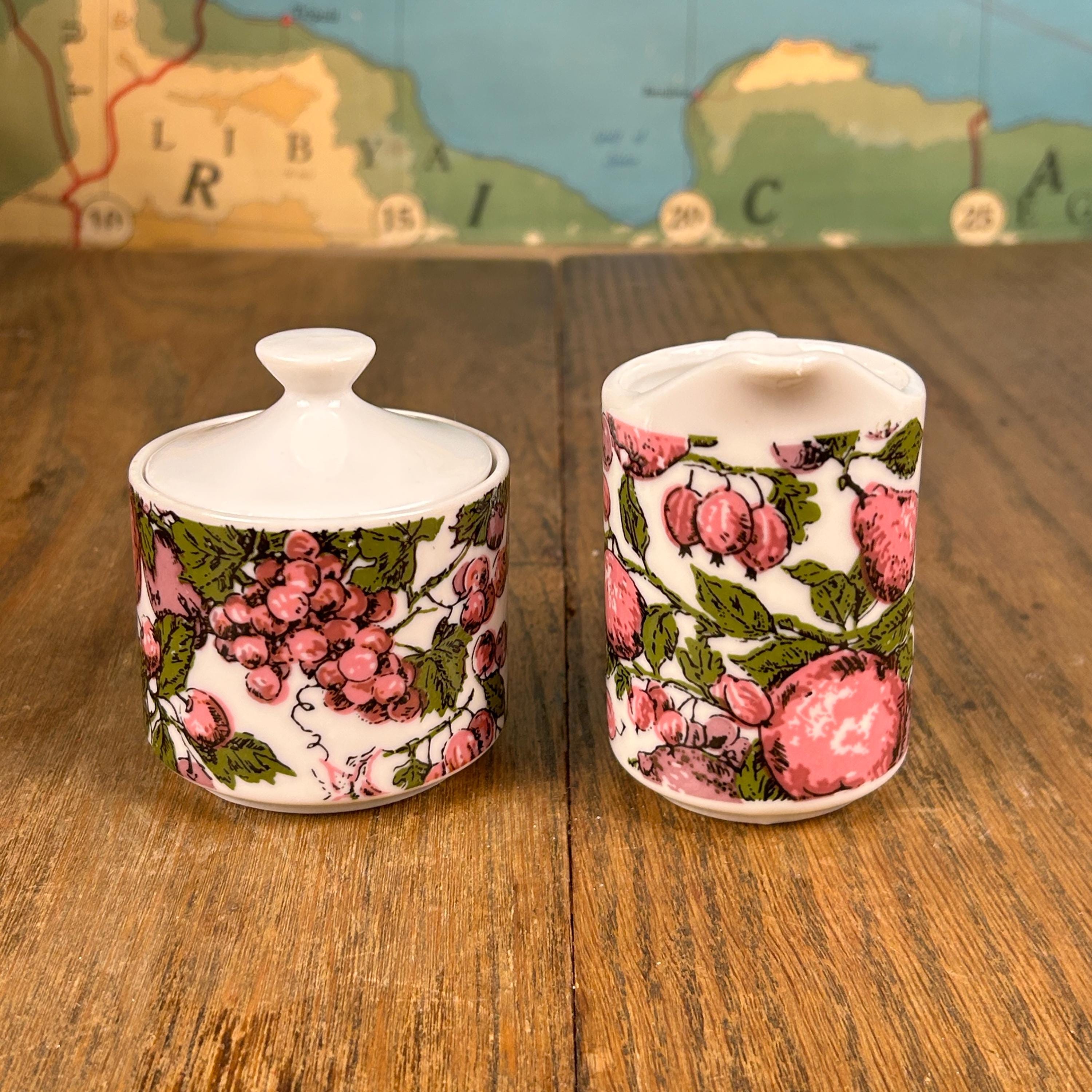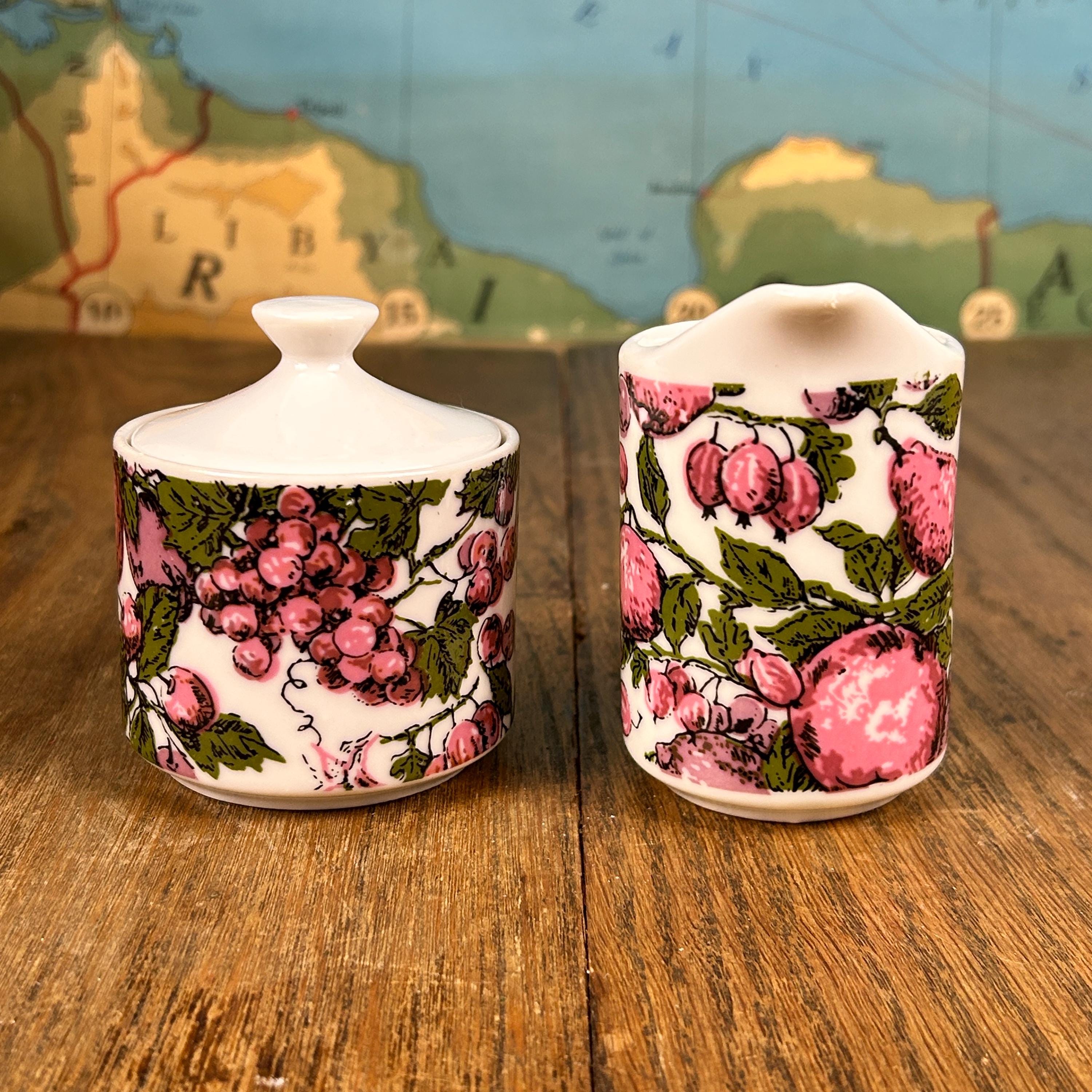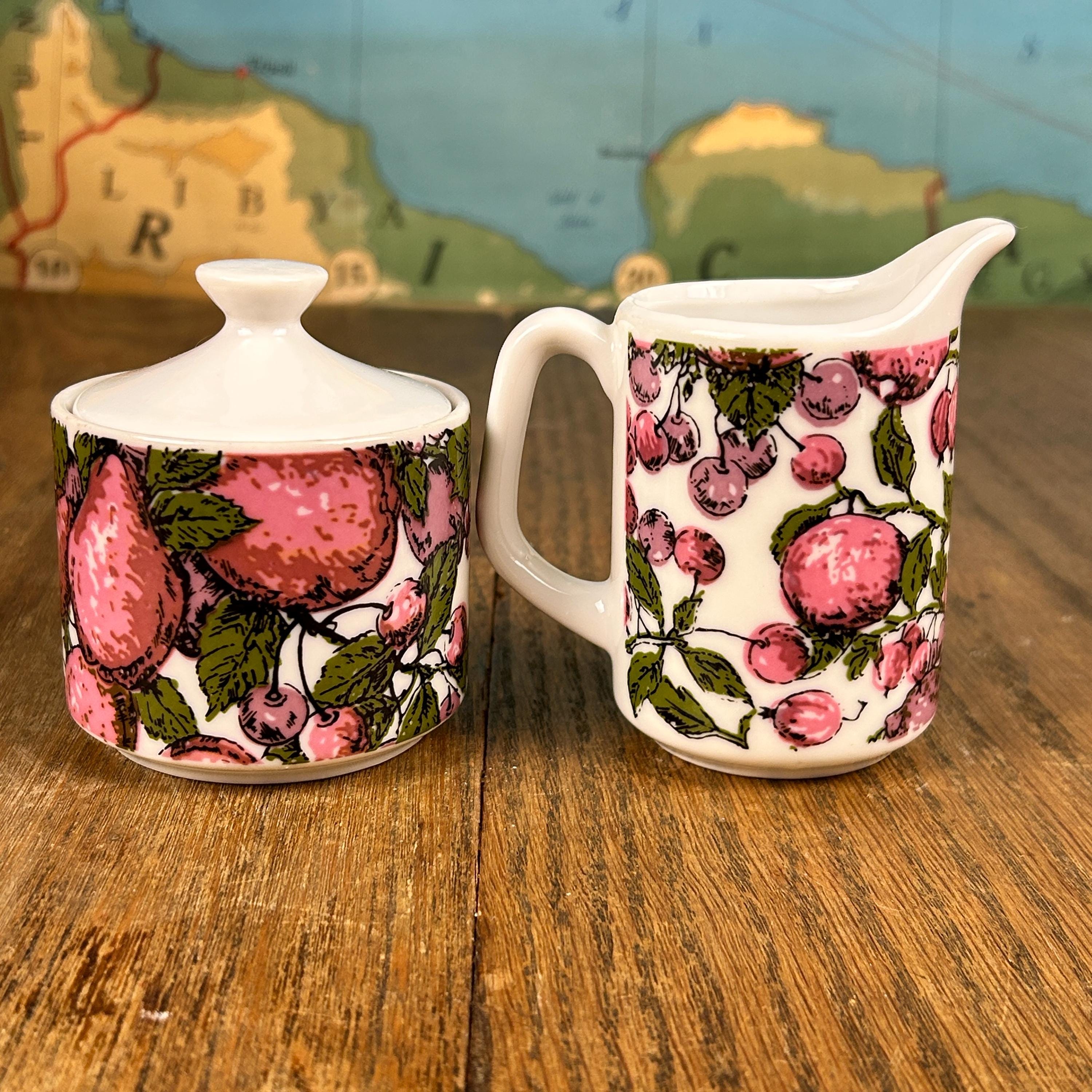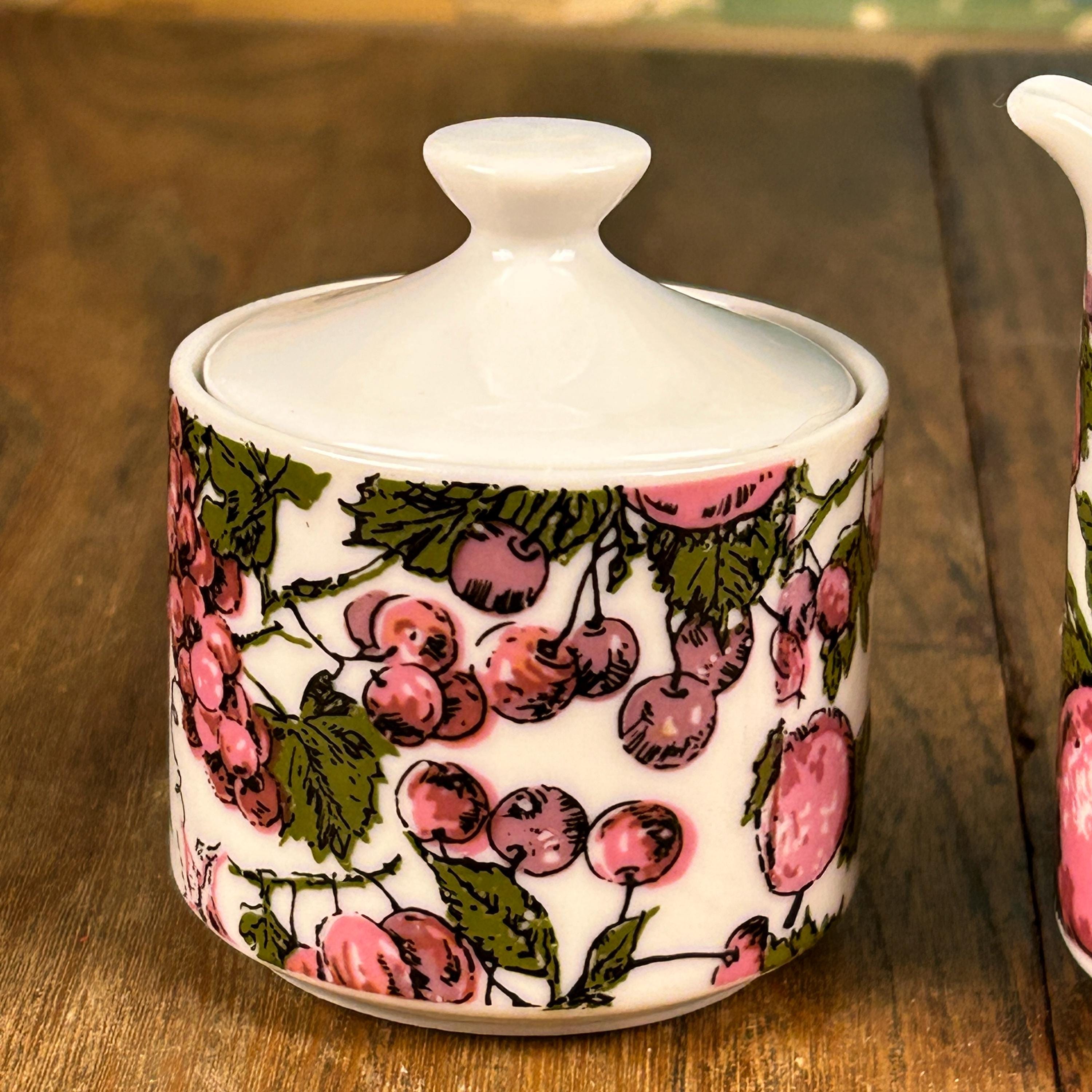 Super groovy vintage coffee or tea set by Enesco, Japan! The set includes a sugar bowl and a creamer with a purple and green design of purple pears and plums with green leaves. Excellent condition. No chips, cracks, stains, or scuffs! A perfect little set!