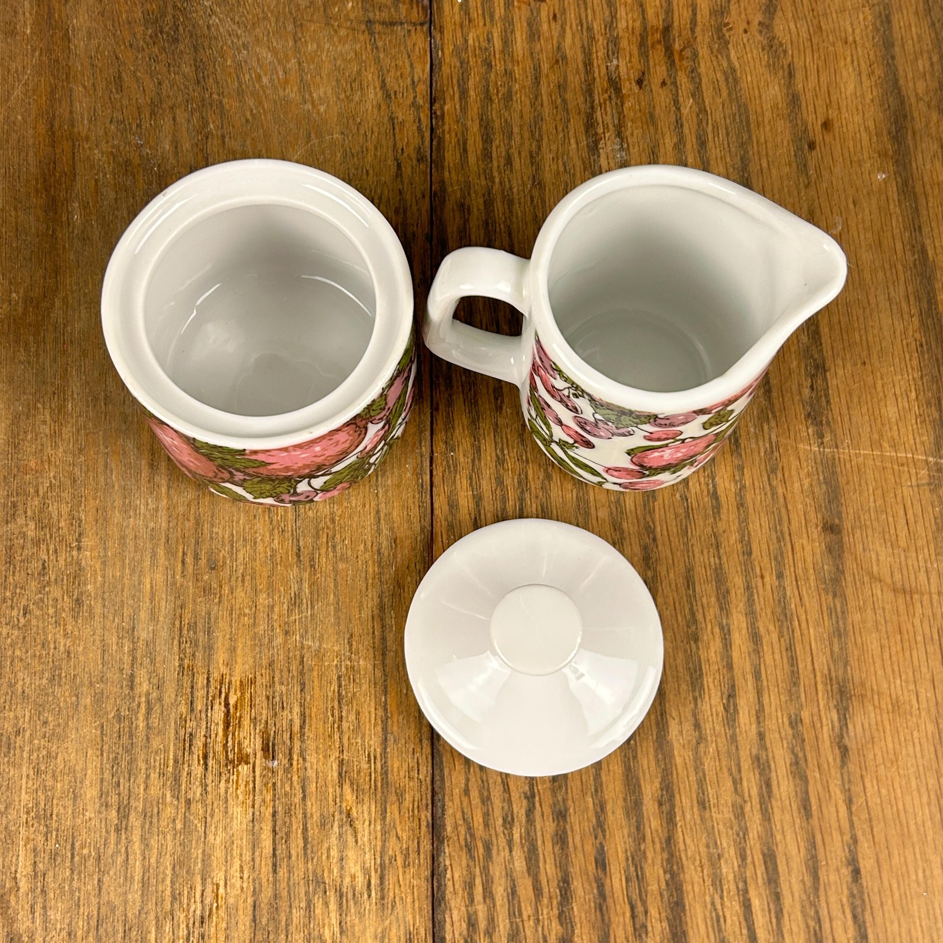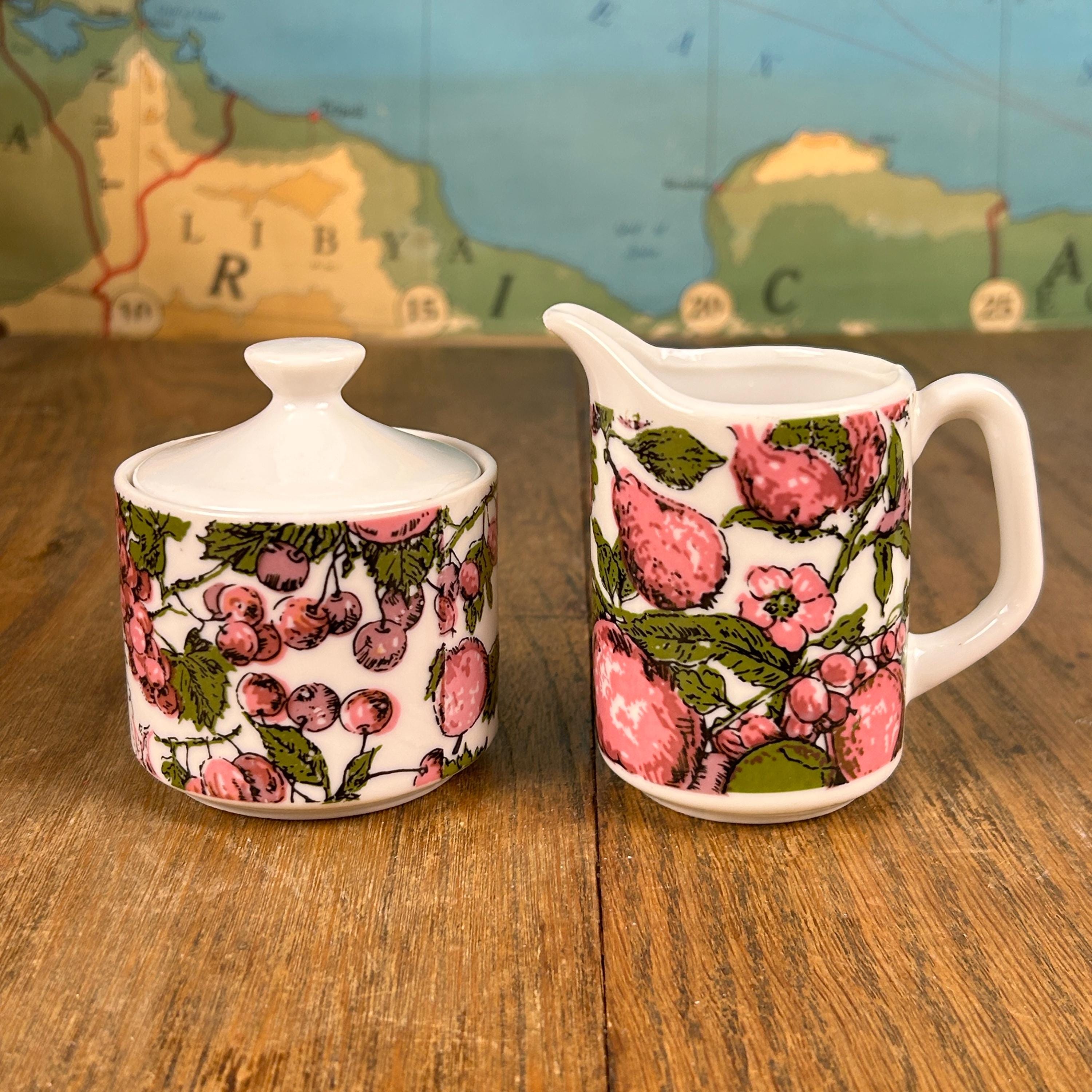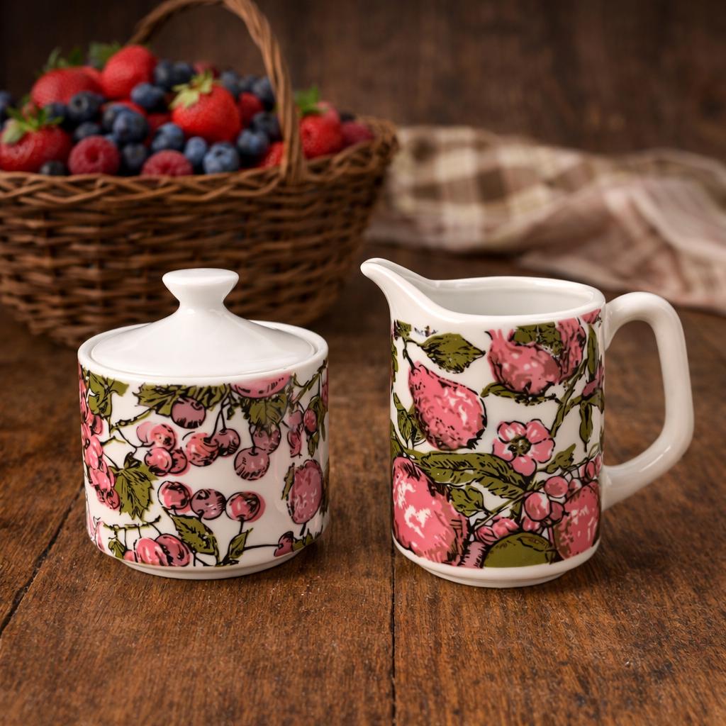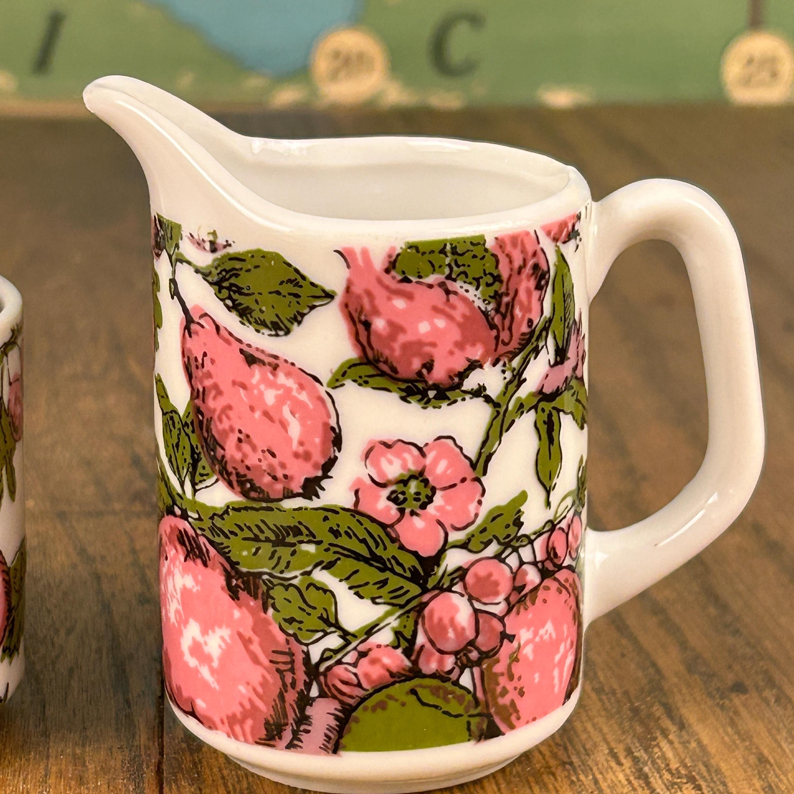 Super groovy vintage coffee or tea set by Enesco, Japan! The set includes a sugar bowl and a creamer with a purple and green design of purple pears and plums with green leaves. Excellent condition. No chips, cracks, stains, or scuffs! A perfect little set!