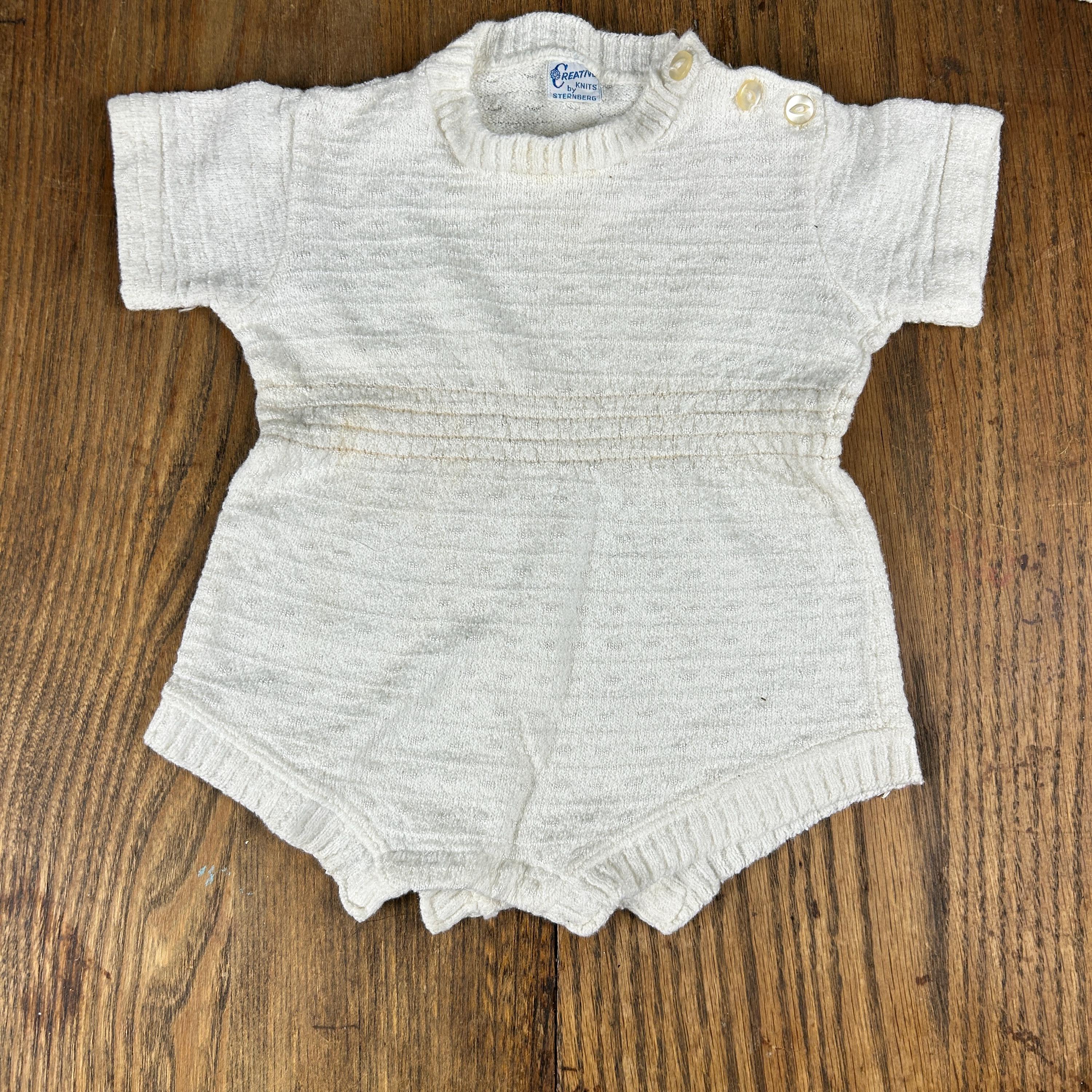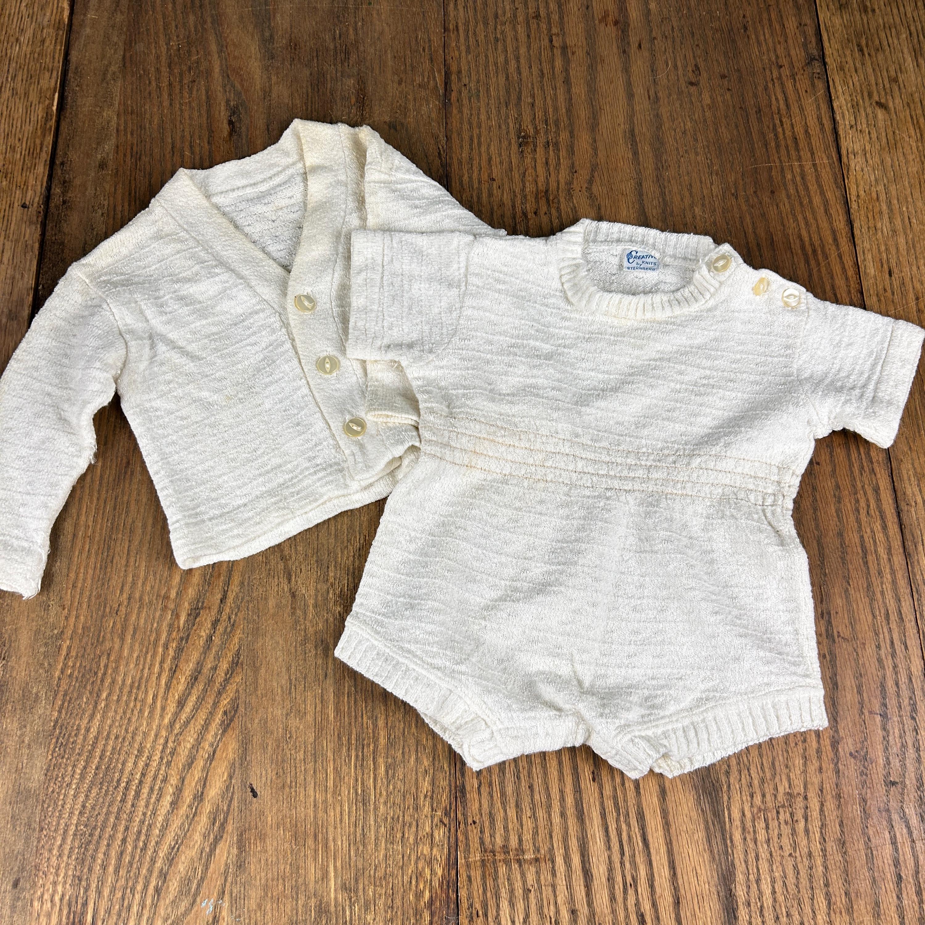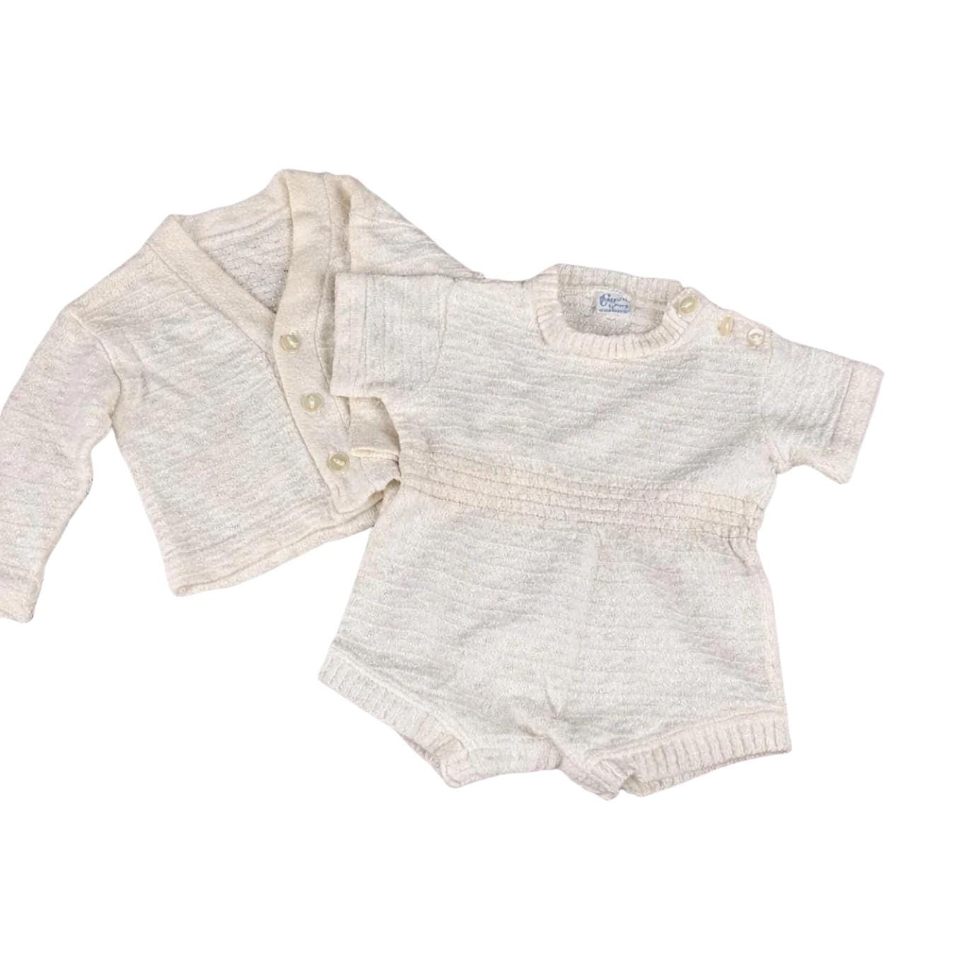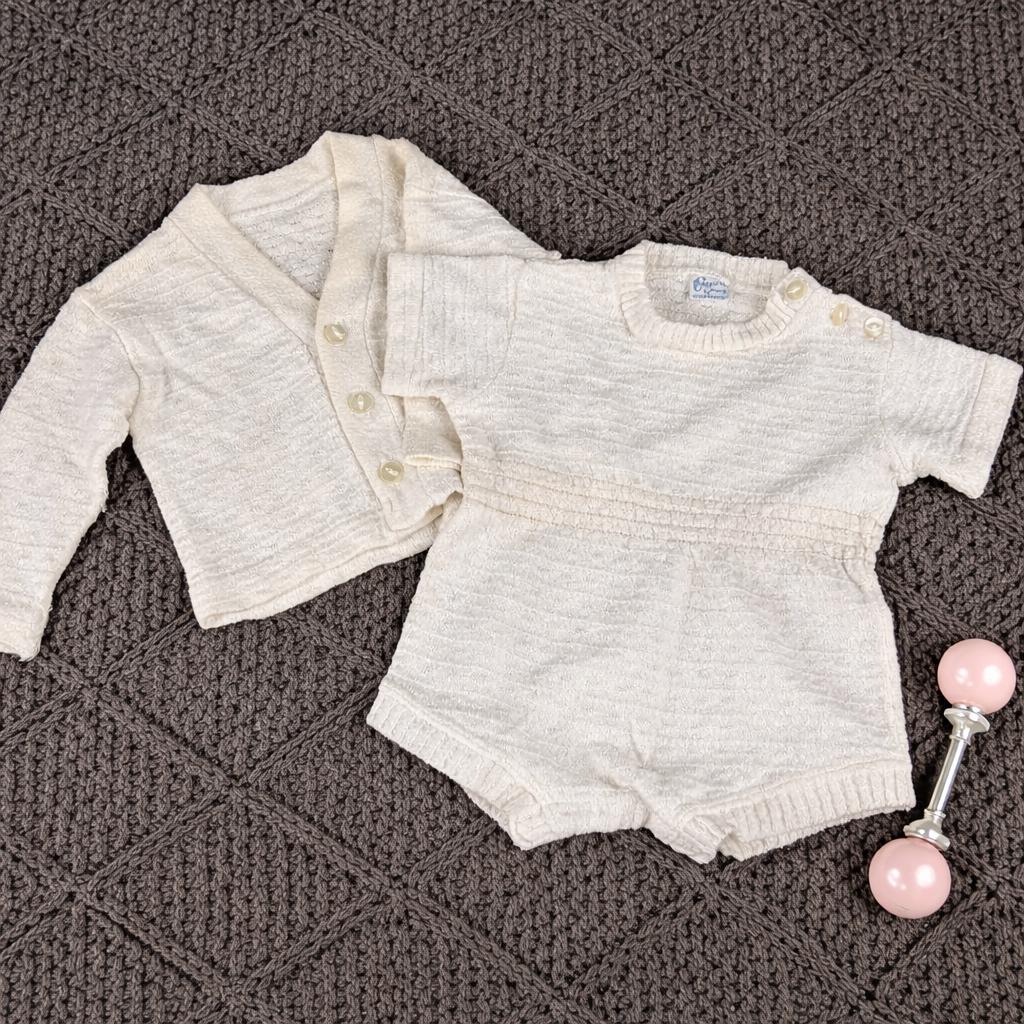 Vintage 1960s Kid'N Cotton by Sternberg 12 Months White Cotton Ribbed Baby Bodysuit With Snap Closure and Button Shoulder with matching 3-button V-Neck Cardigan