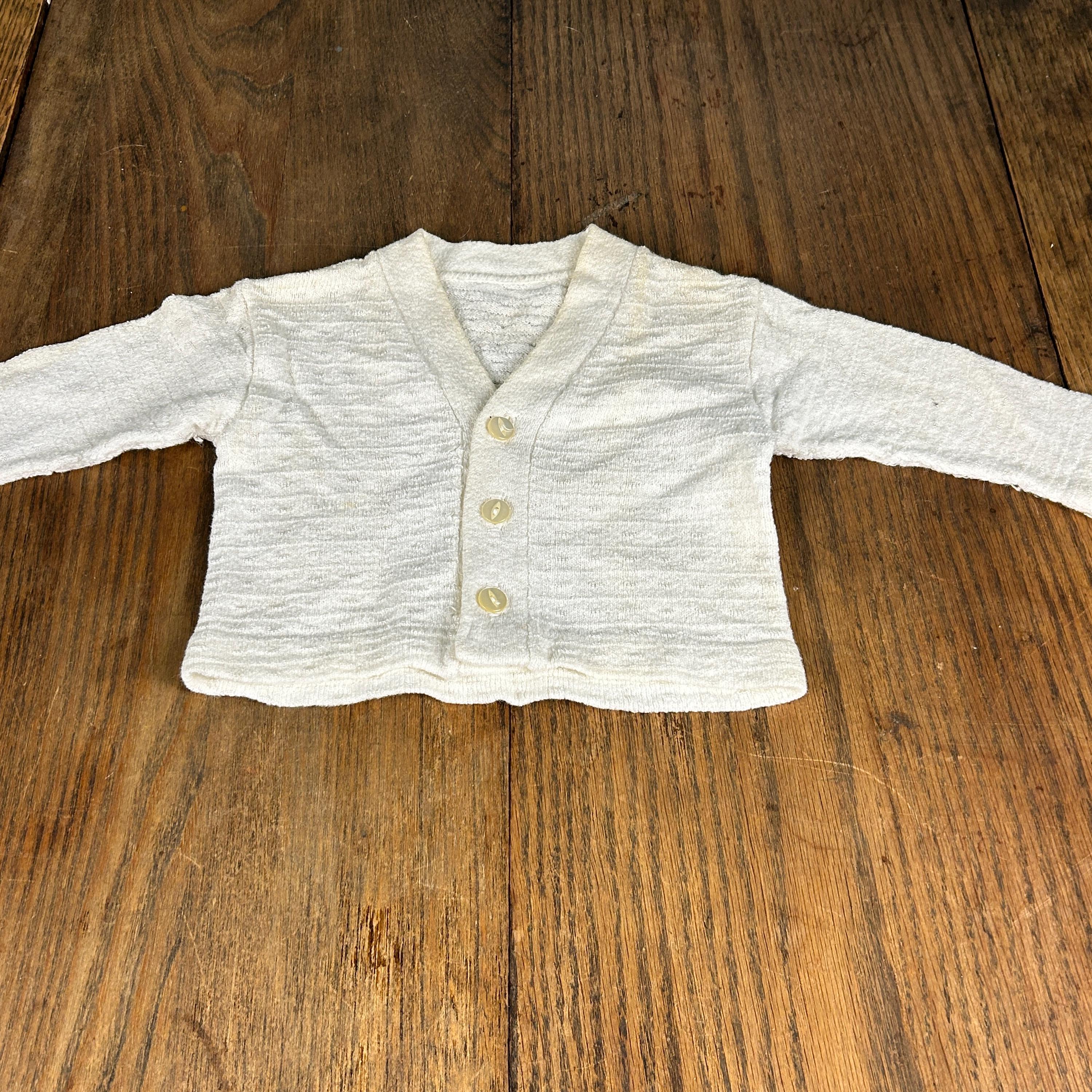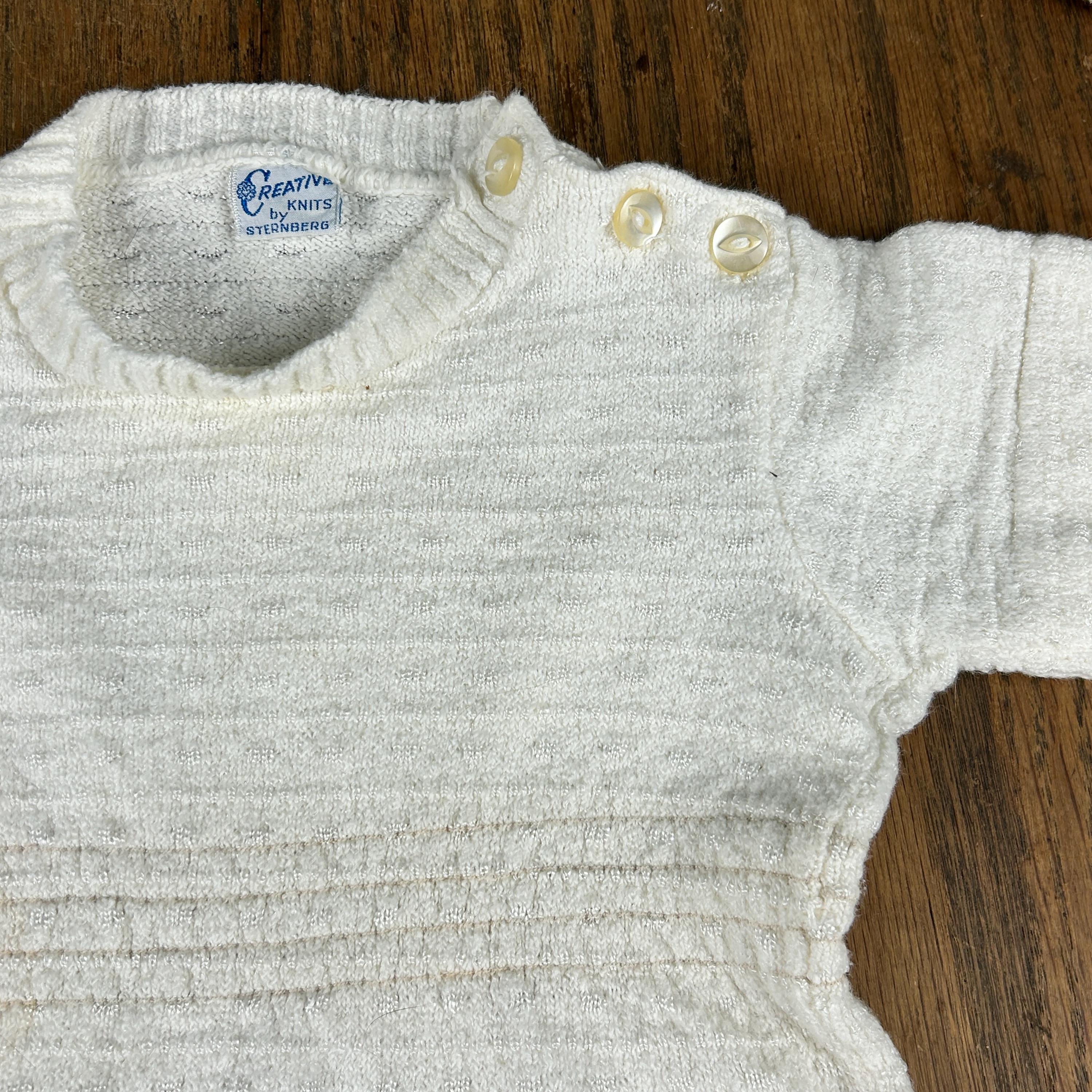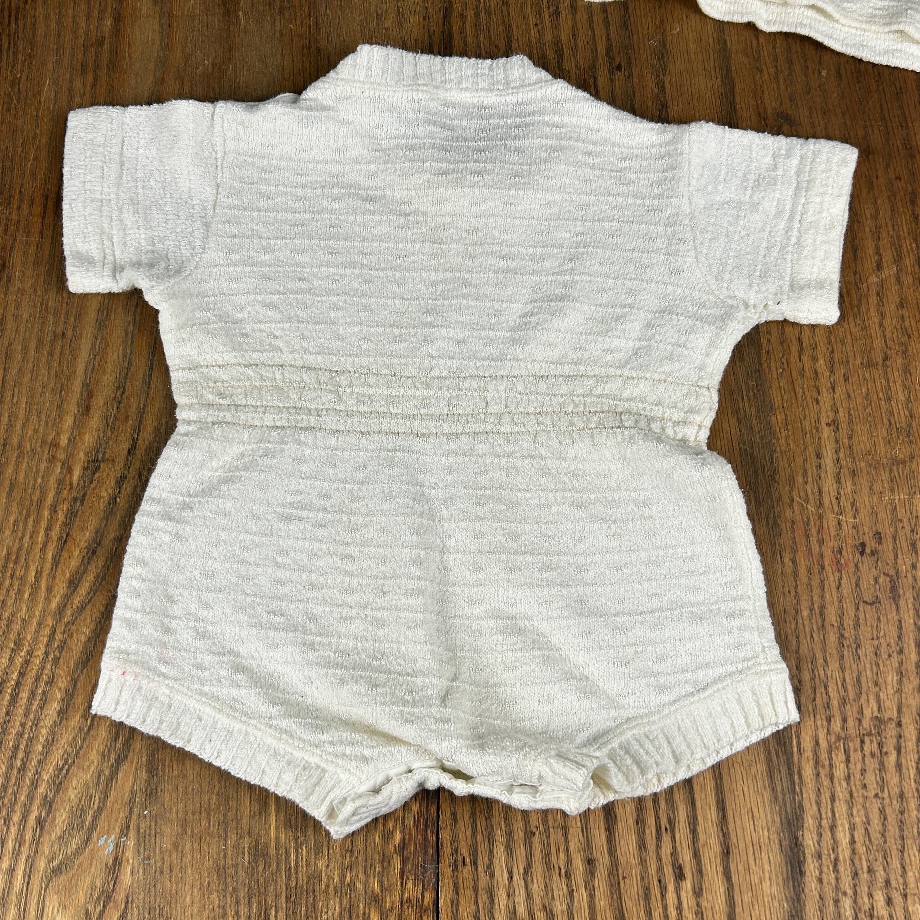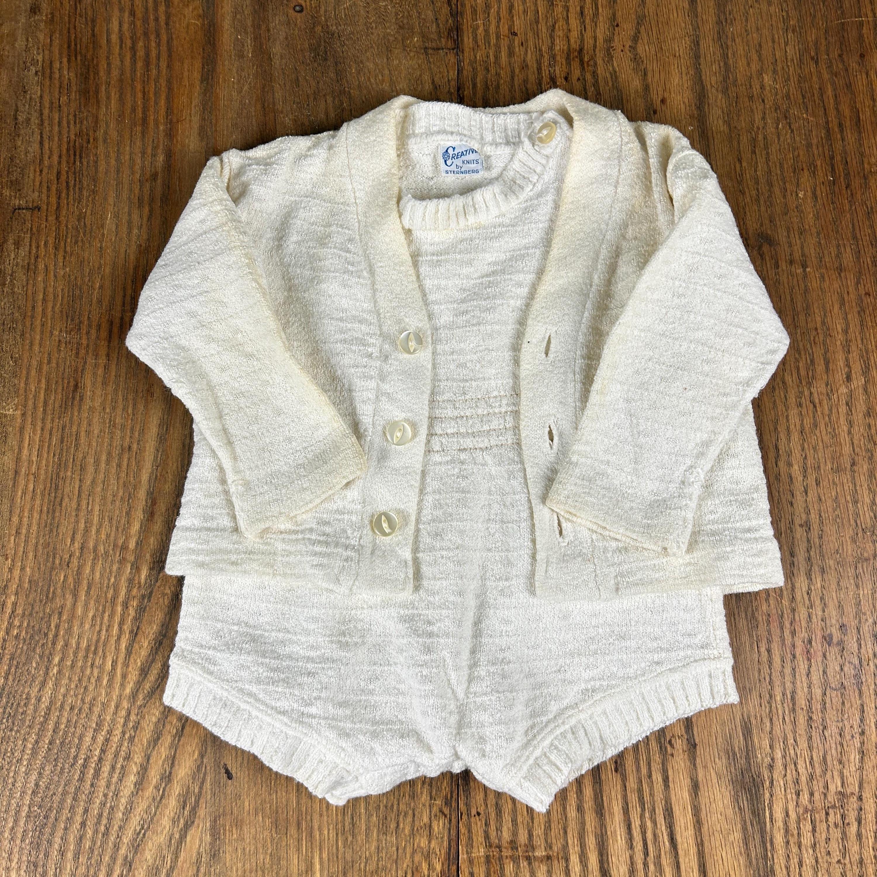 Vintage 1960s Kid'N Cotton by Sternberg 12 Months White Cotton Ribbed Baby Bodysuit With Snap Closure and Button Shoulder with matching 3-button V-Neck Cardigan