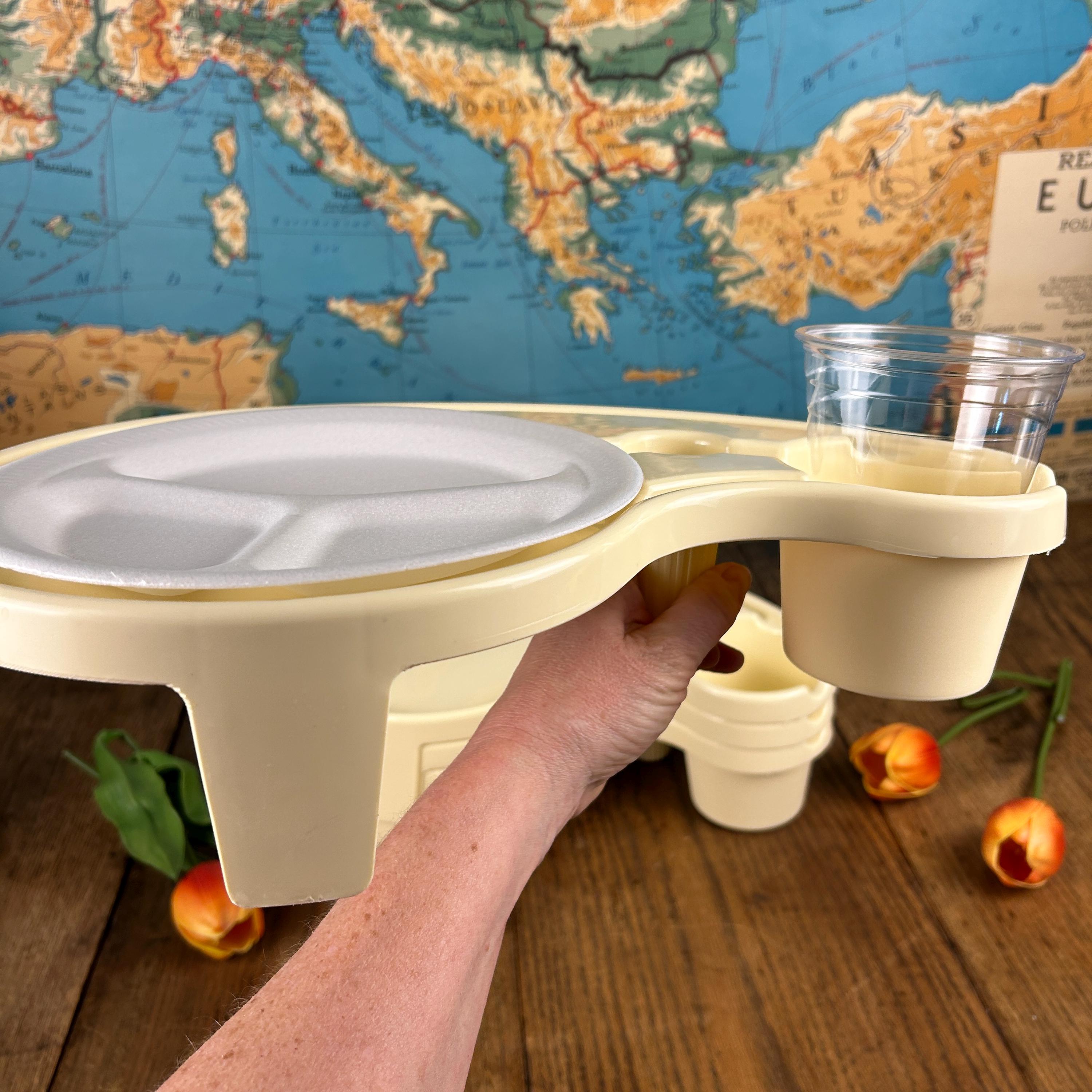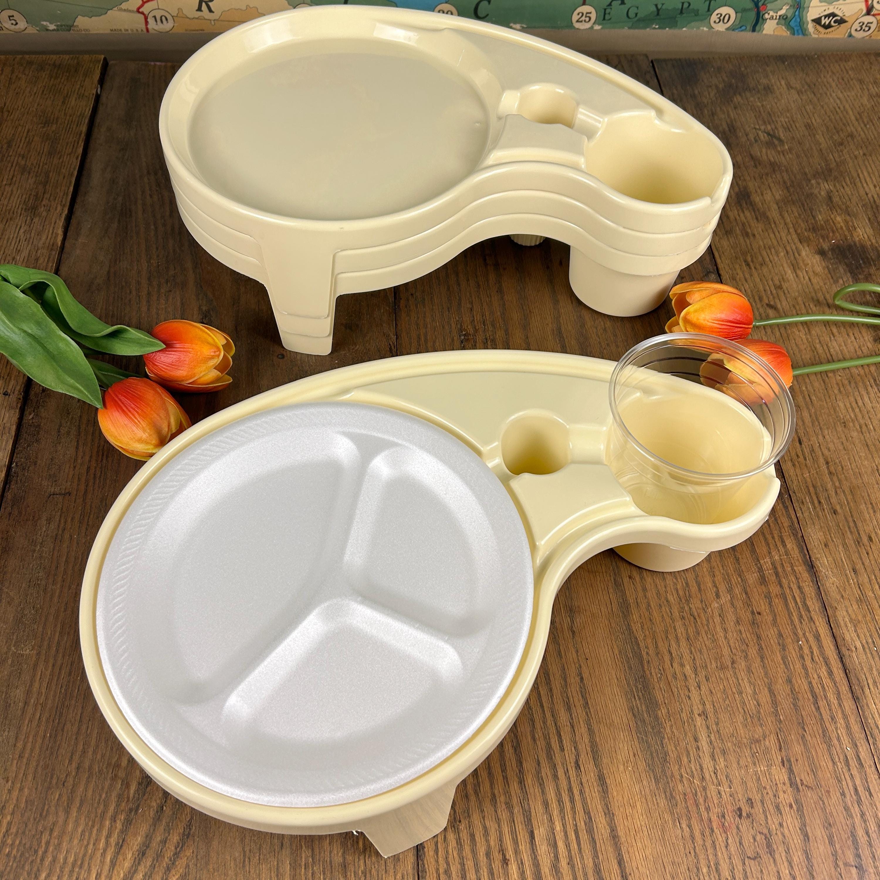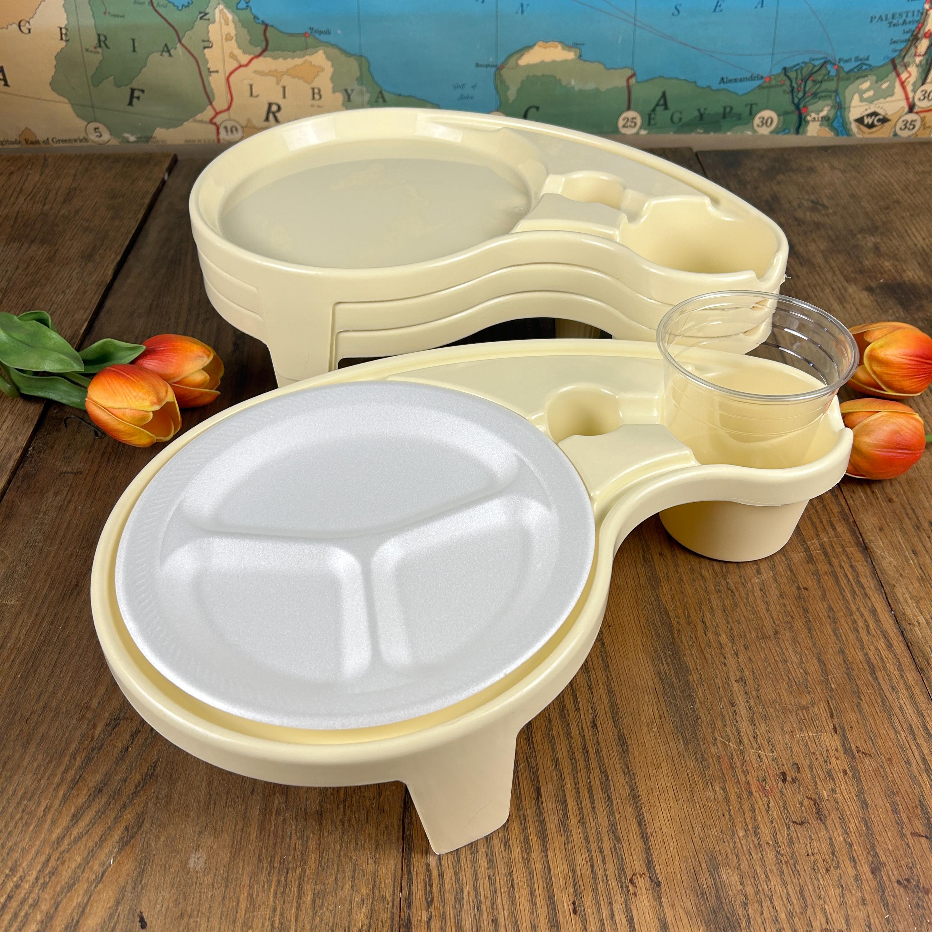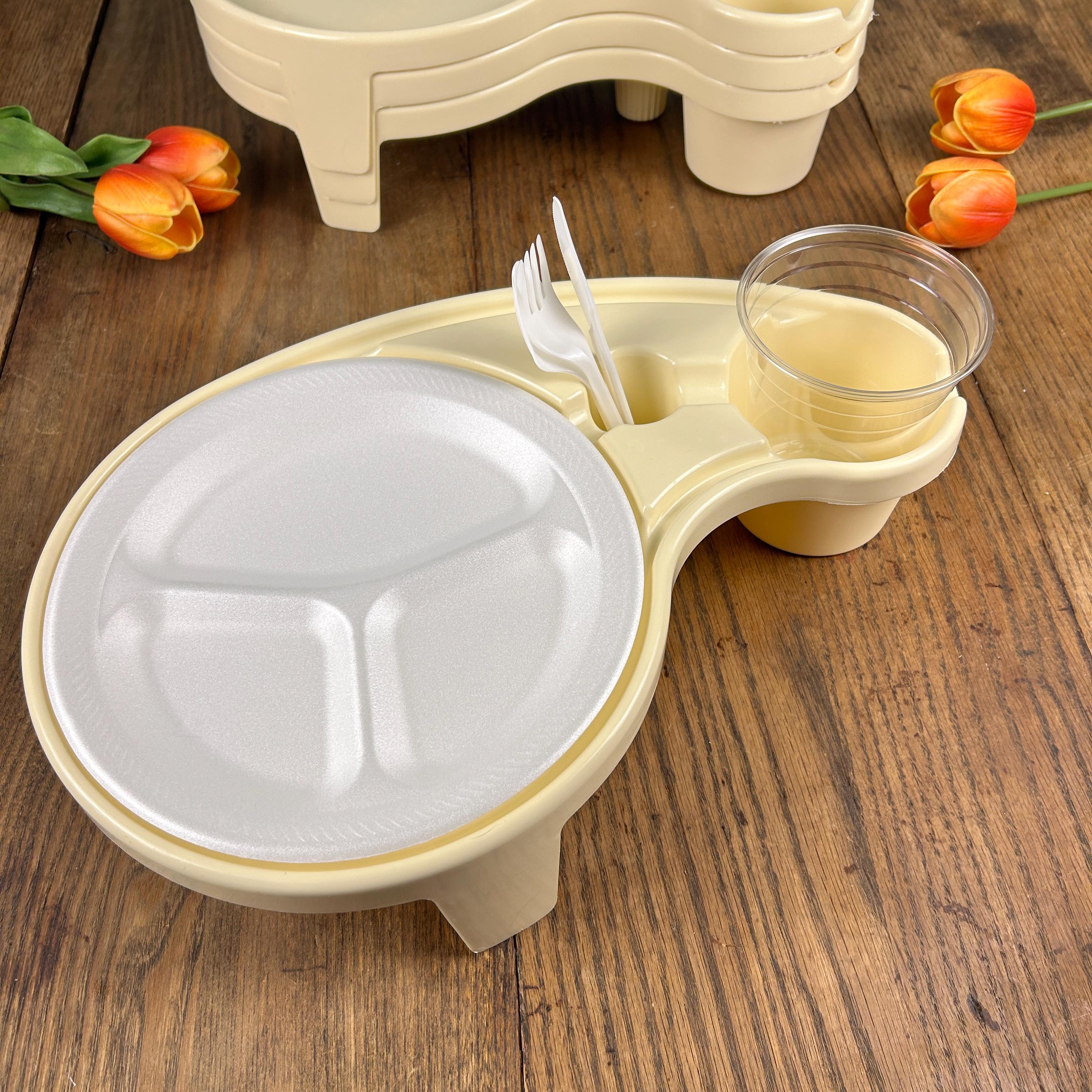 Debbie Meyer’s BUFFET GENIUS Picnic Camping Food Service- Set of (4). Measures 15-1/2” across x 3-1/4” high. Holds a standard paper or china plate and up to a 32 oz. glass, wine glass, can, bottle, or paper cup. Also has a compartment for utensils and a napkin.