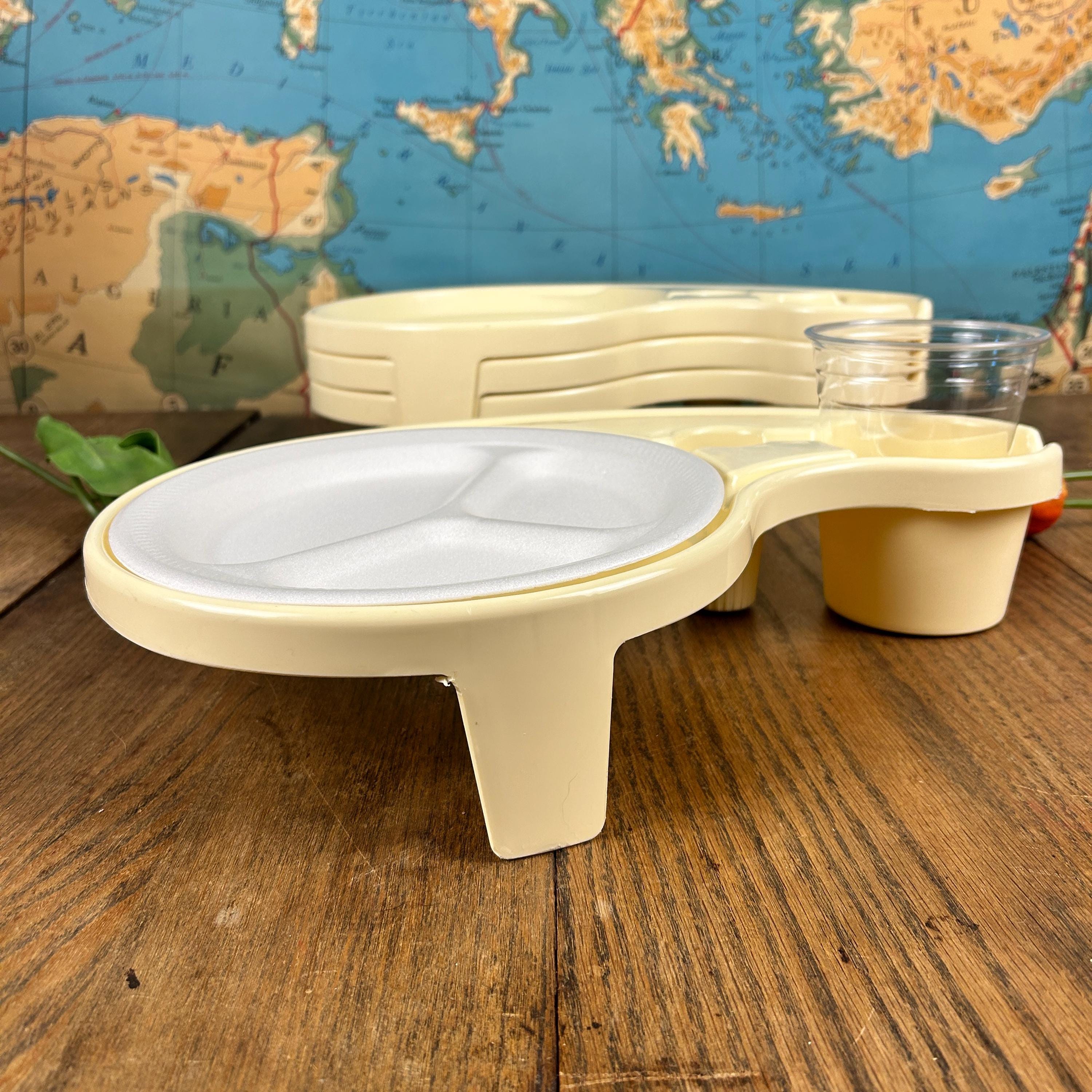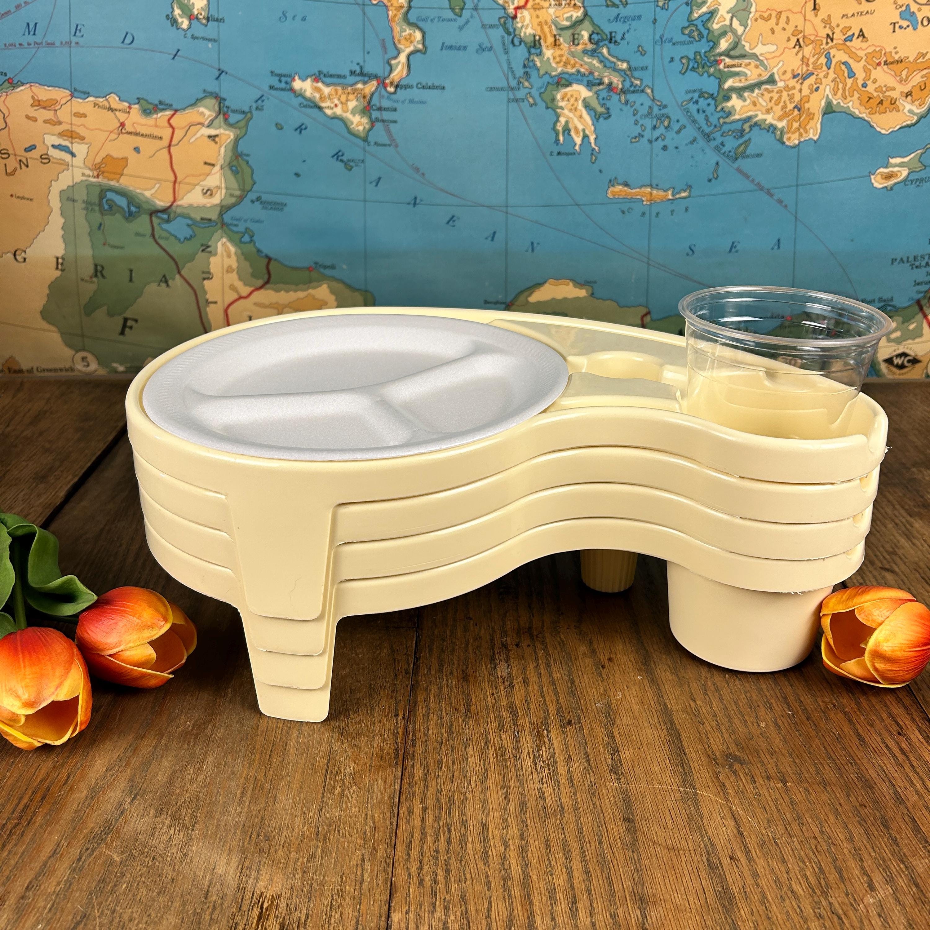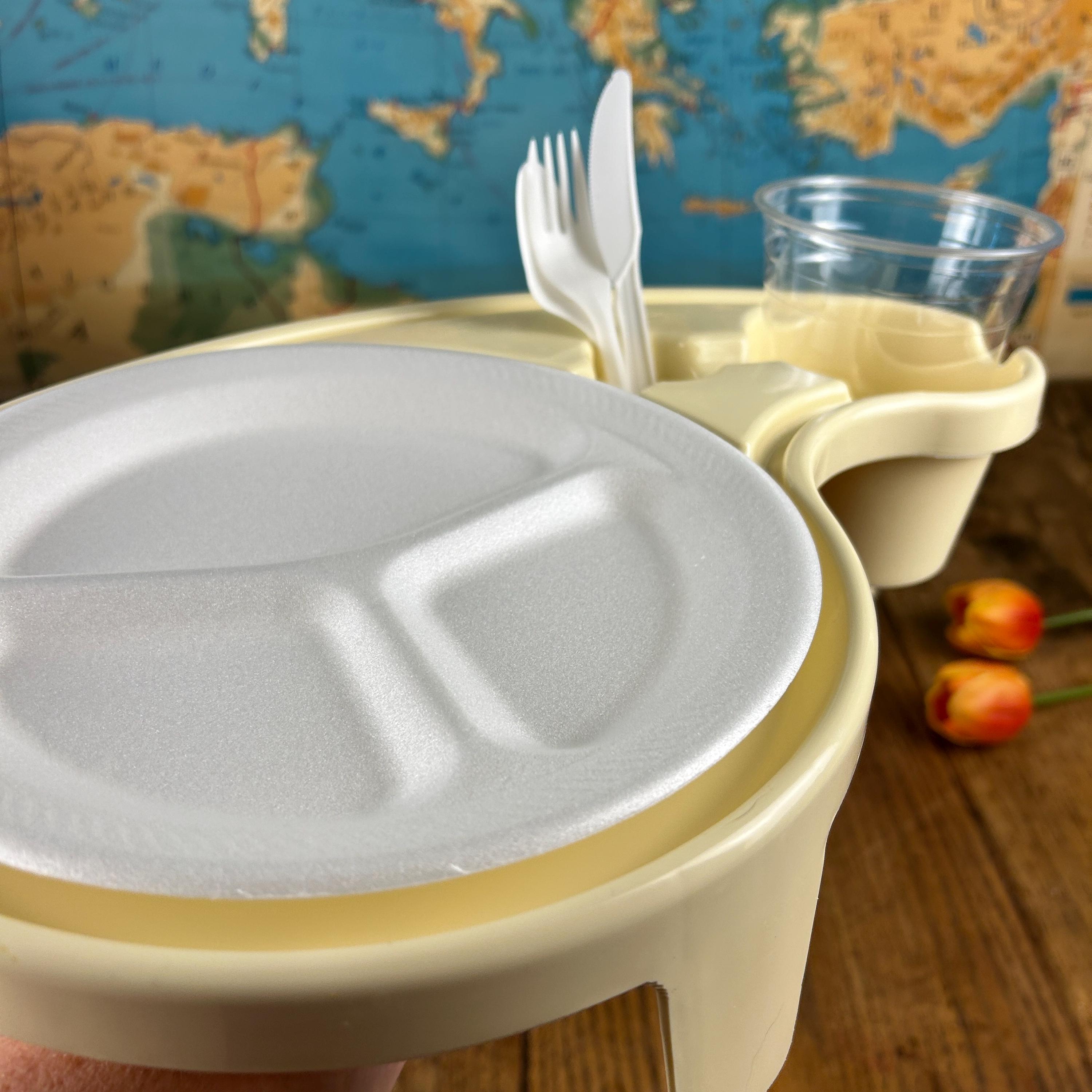 Debbie Meyer’s BUFFET GENIUS Picnic Camping Food Service- Set of (4). Measures 15-1/2” across x 3-1/4” high. Holds a standard paper or china plate and up to a 32 oz. glass, wine glass, can, bottle, or paper cup. Also has a compartment for utensils and a napkin.