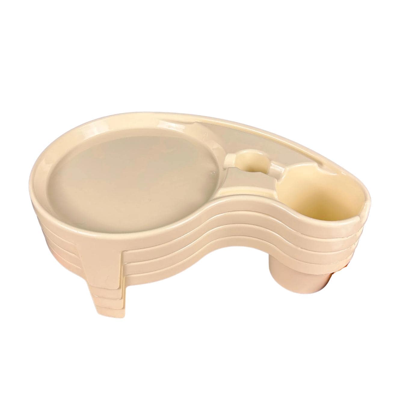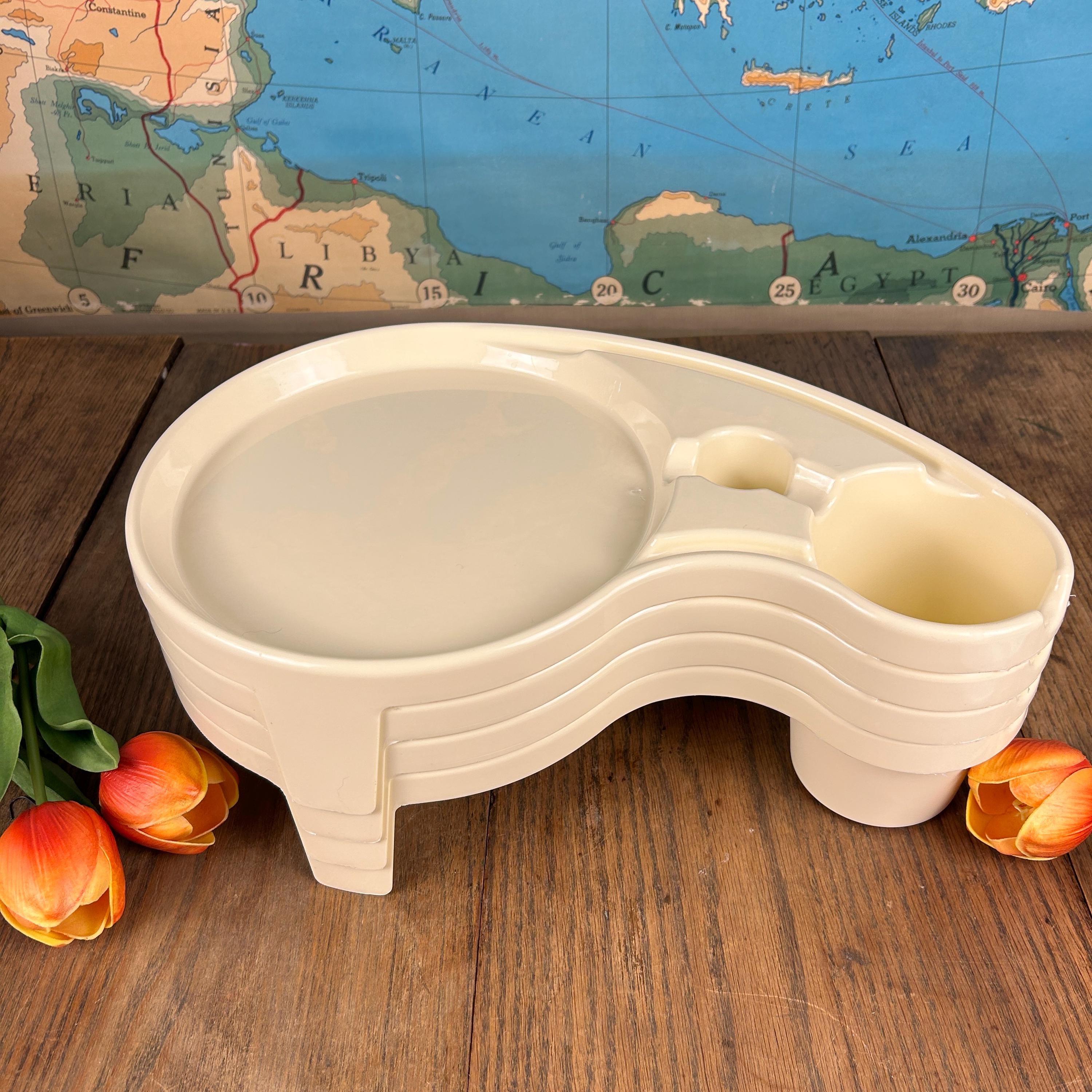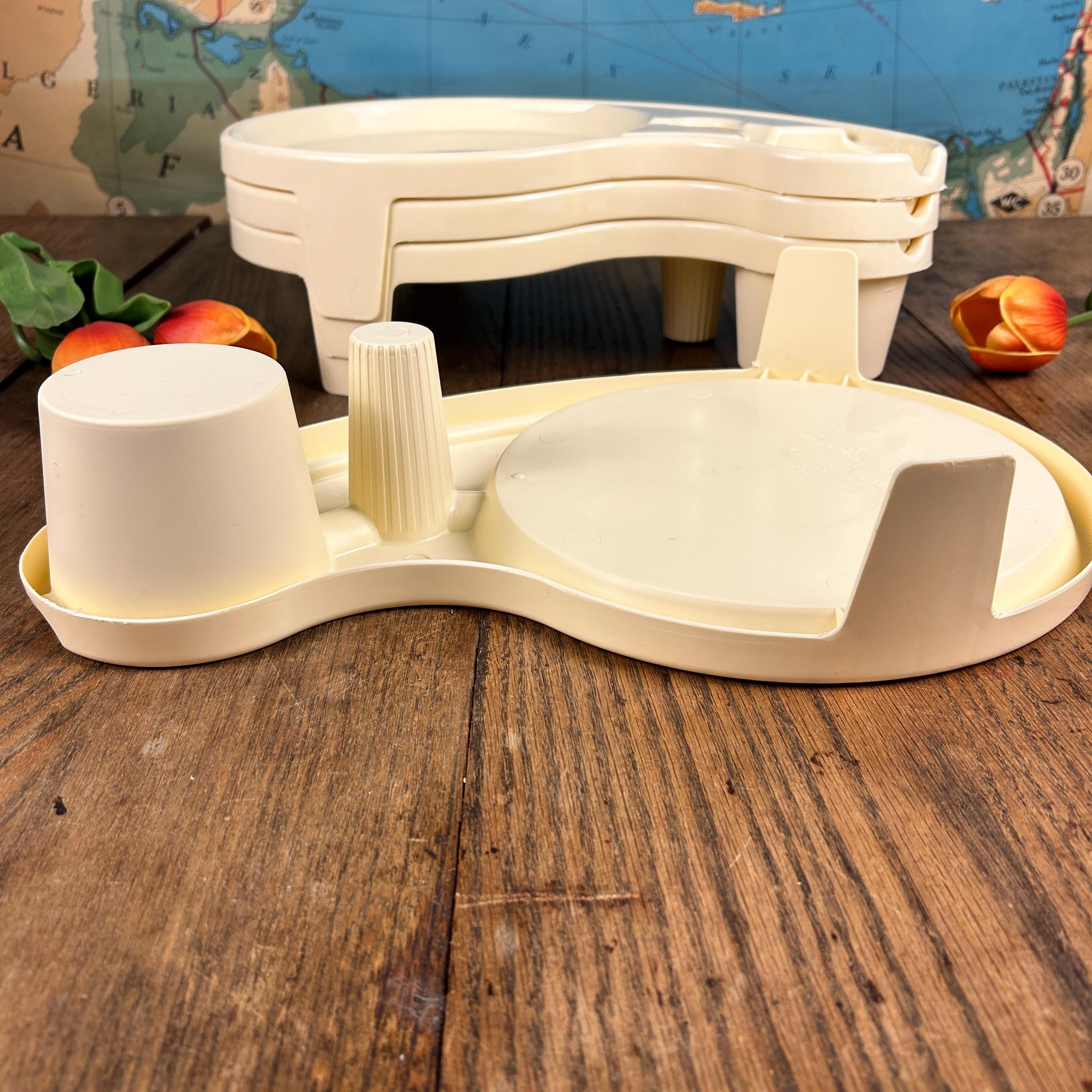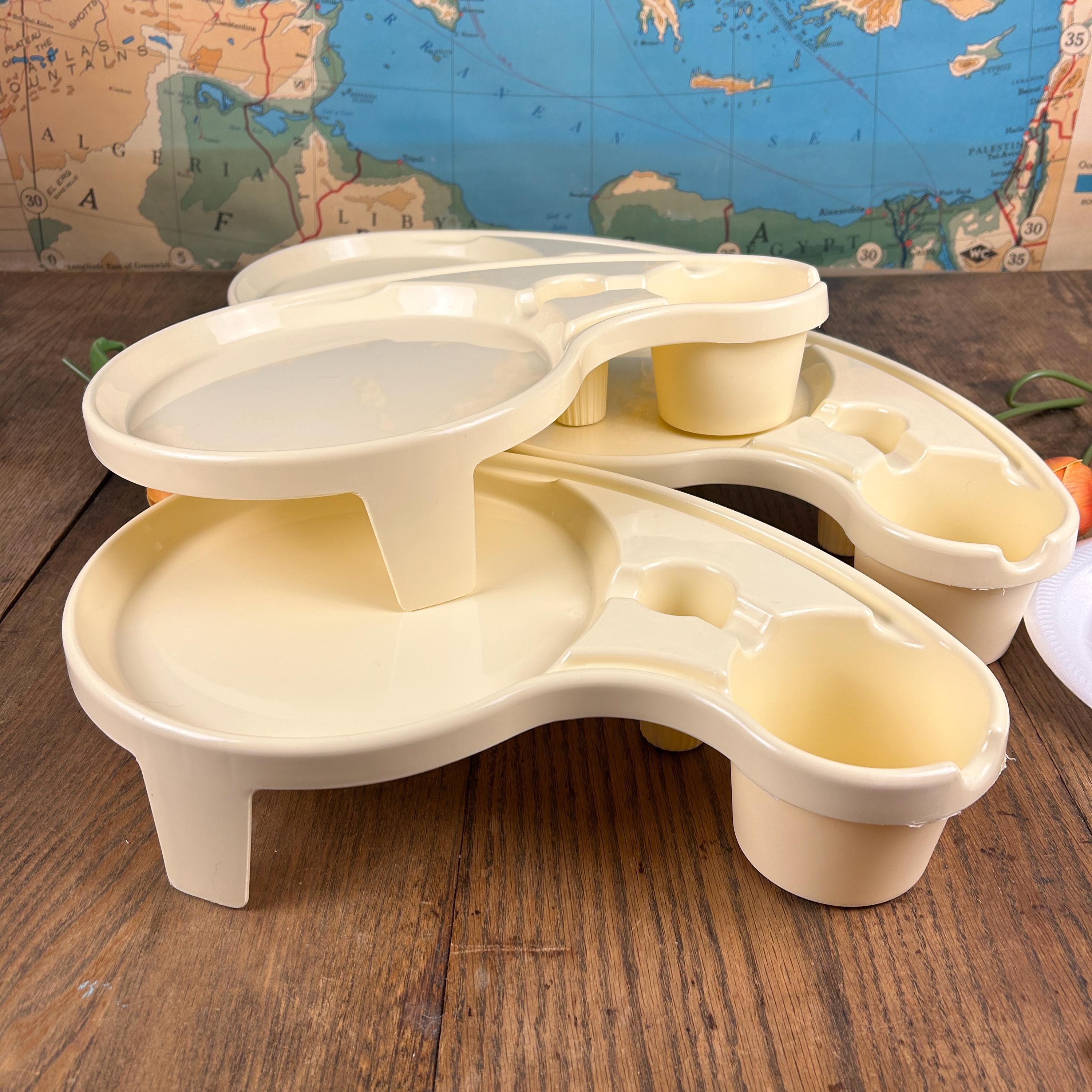 Debbie Meyer’s BUFFET GENIUS Picnic Camping Food Service- Set of (4). Measures 15-1/2” across x 3-1/4” high. Holds a standard paper or china plate and up to a 32 oz. glass, wine glass, can, bottle, or paper cup. Also has a compartment for utensils and a napkin.