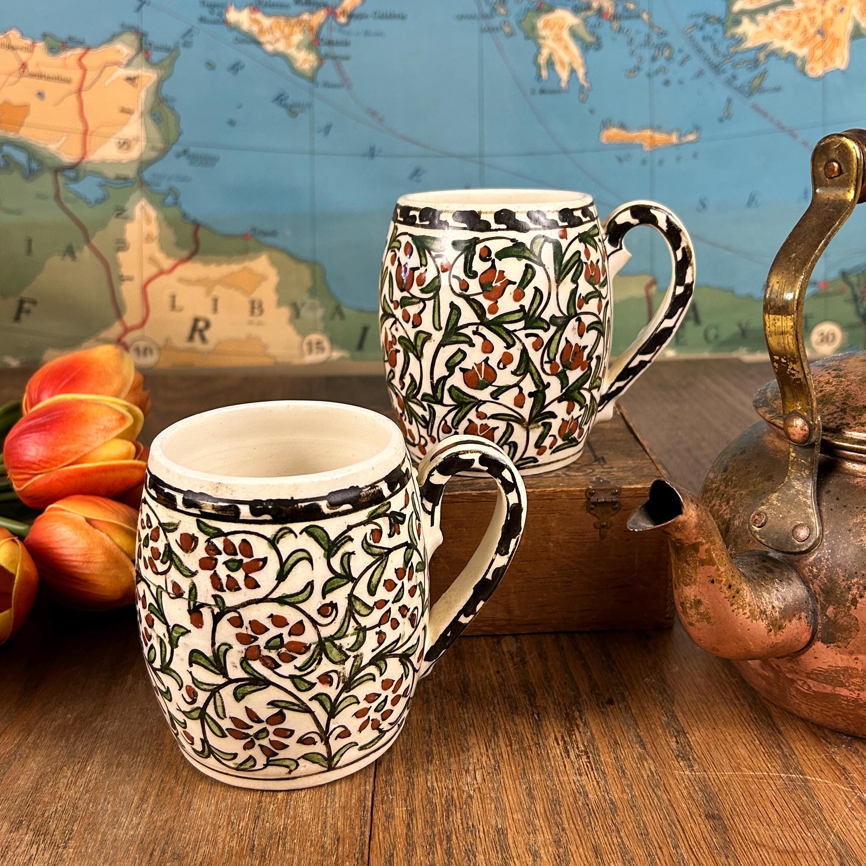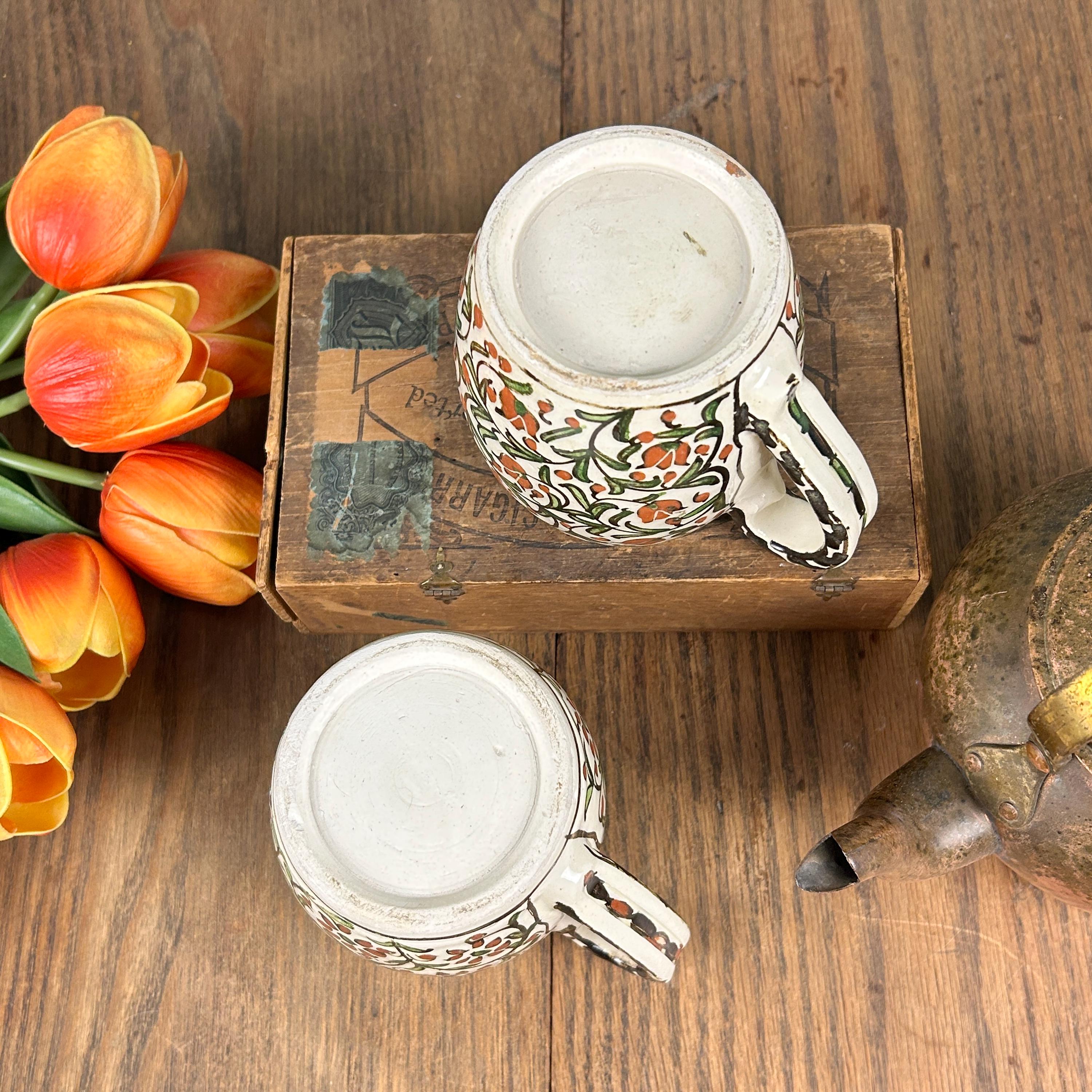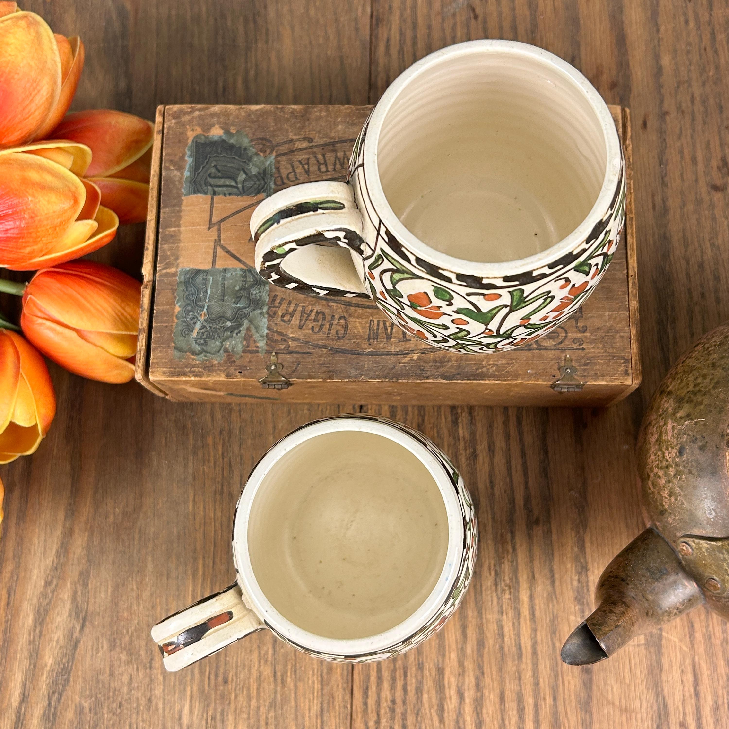 I am not sure of the age of these mugs. They are obviously very old. Vintage/Antique ceramic mugs, set of two large glazed ceramic mugs, hand painted. The mugs are handcrafted and the cups and handles have a floral decoration.