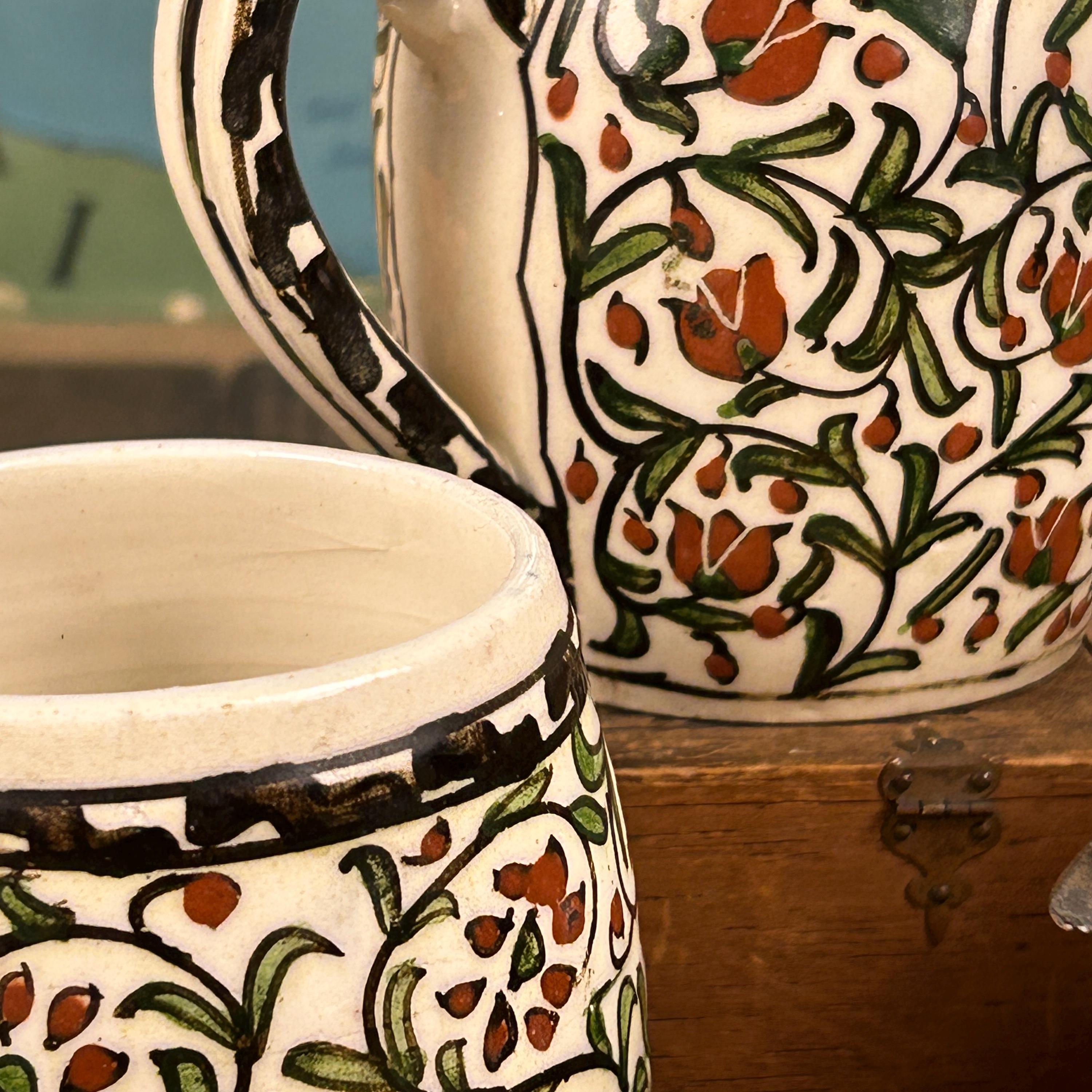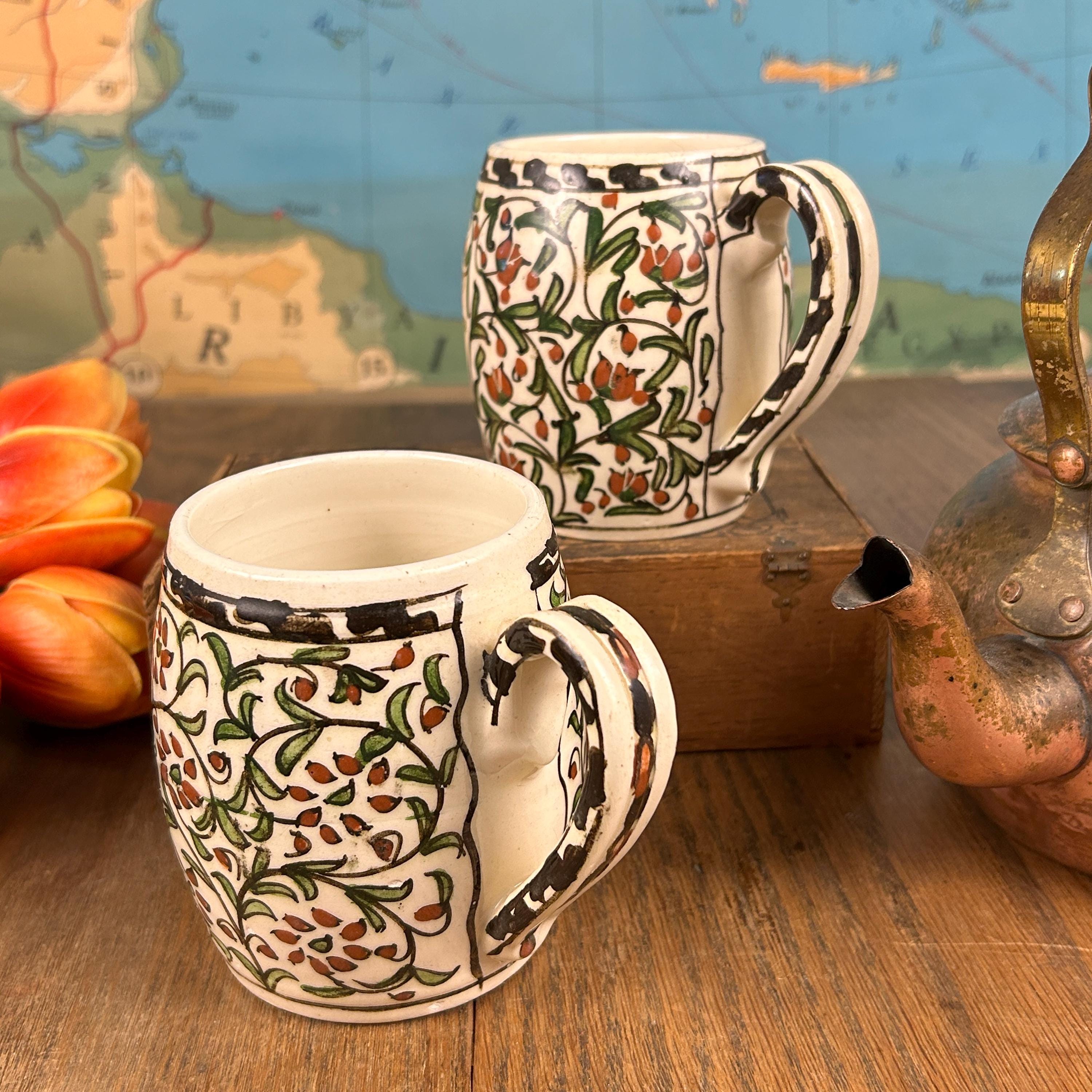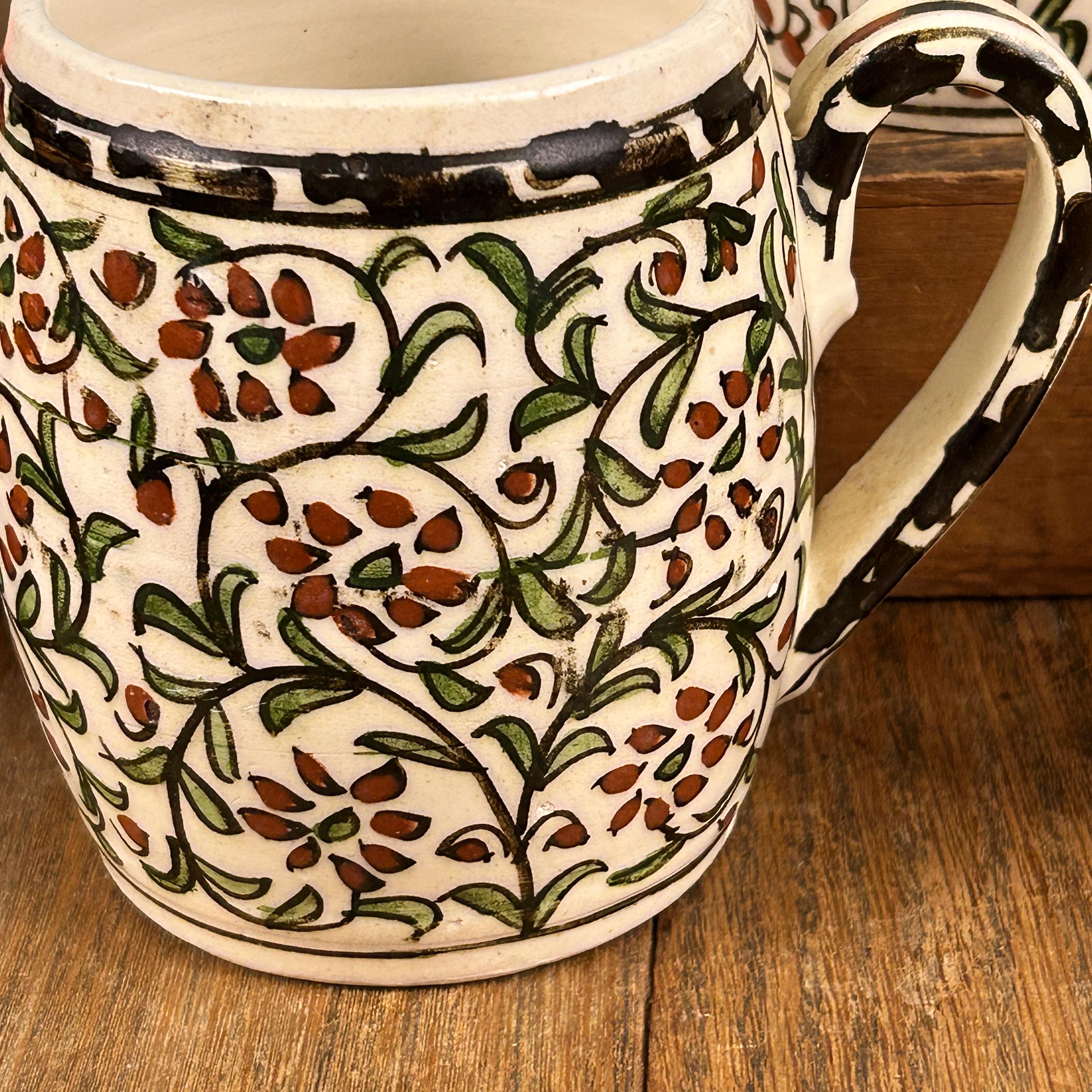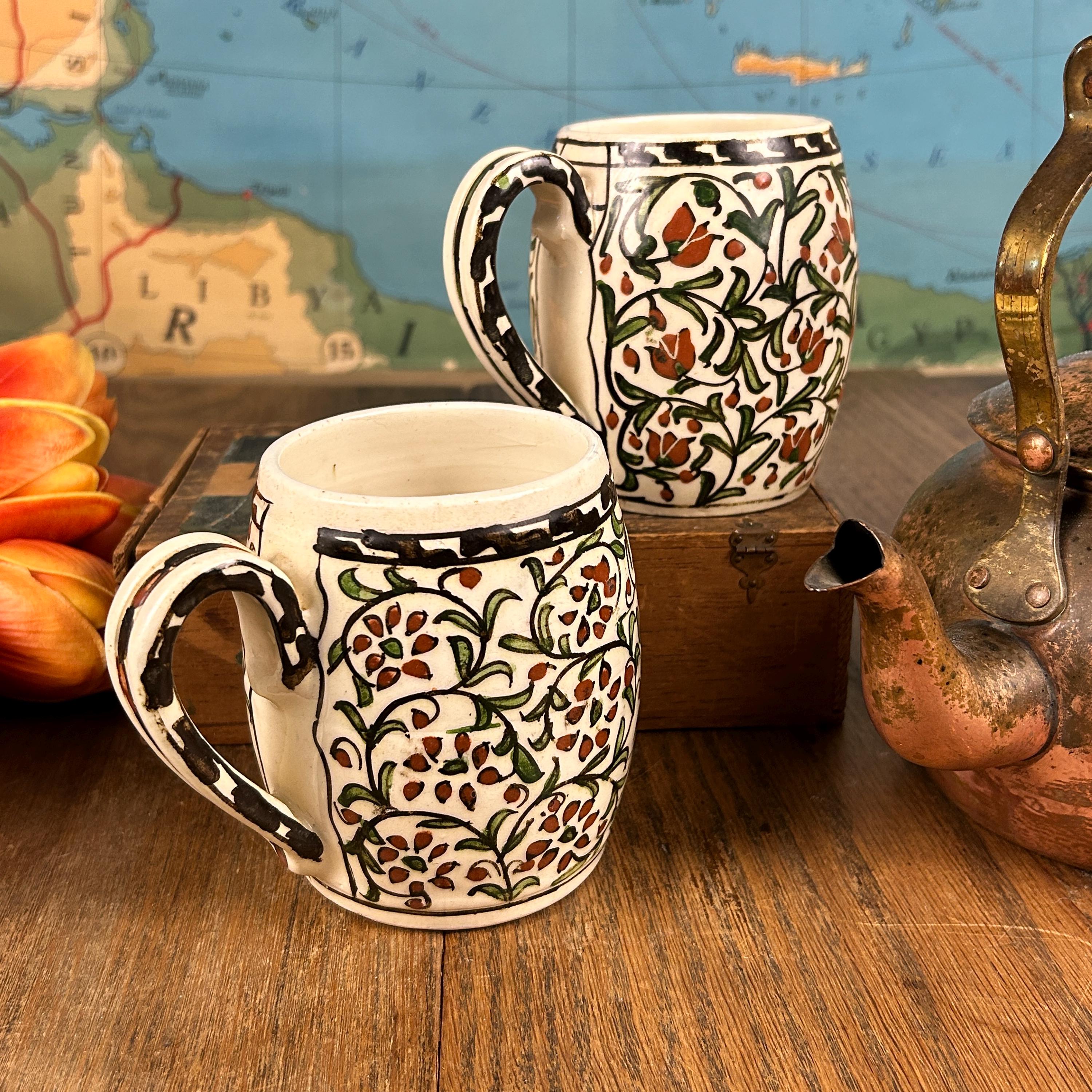 I am not sure of the age of these mugs. They are obviously very old. Vintage/Antique ceramic mugs, set of two large glazed ceramic mugs, hand painted. The mugs are handcrafted and the cups and handles have a floral decoration.