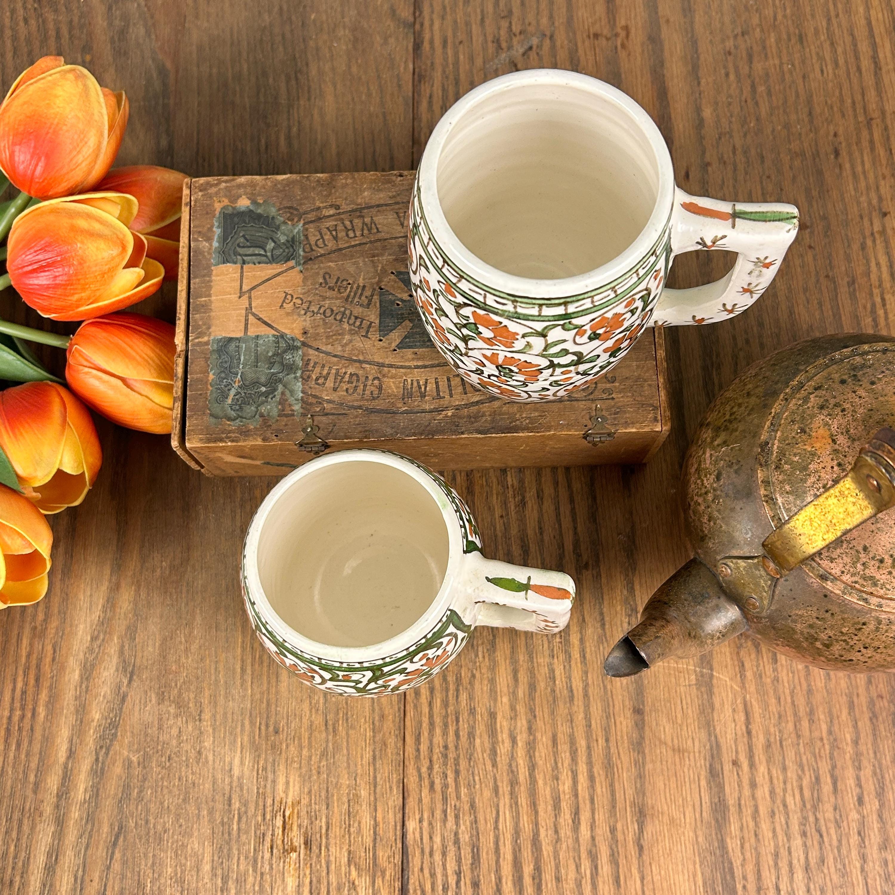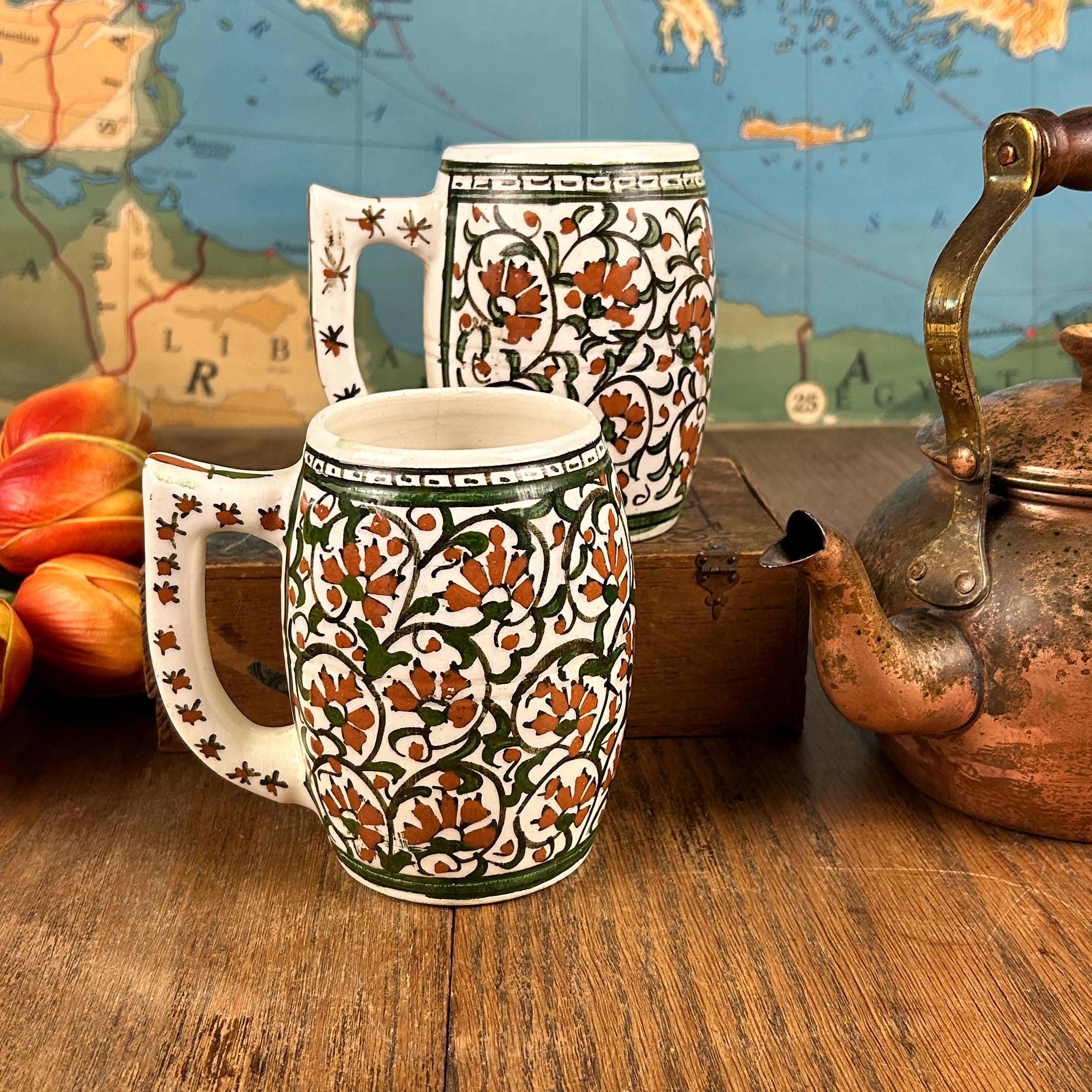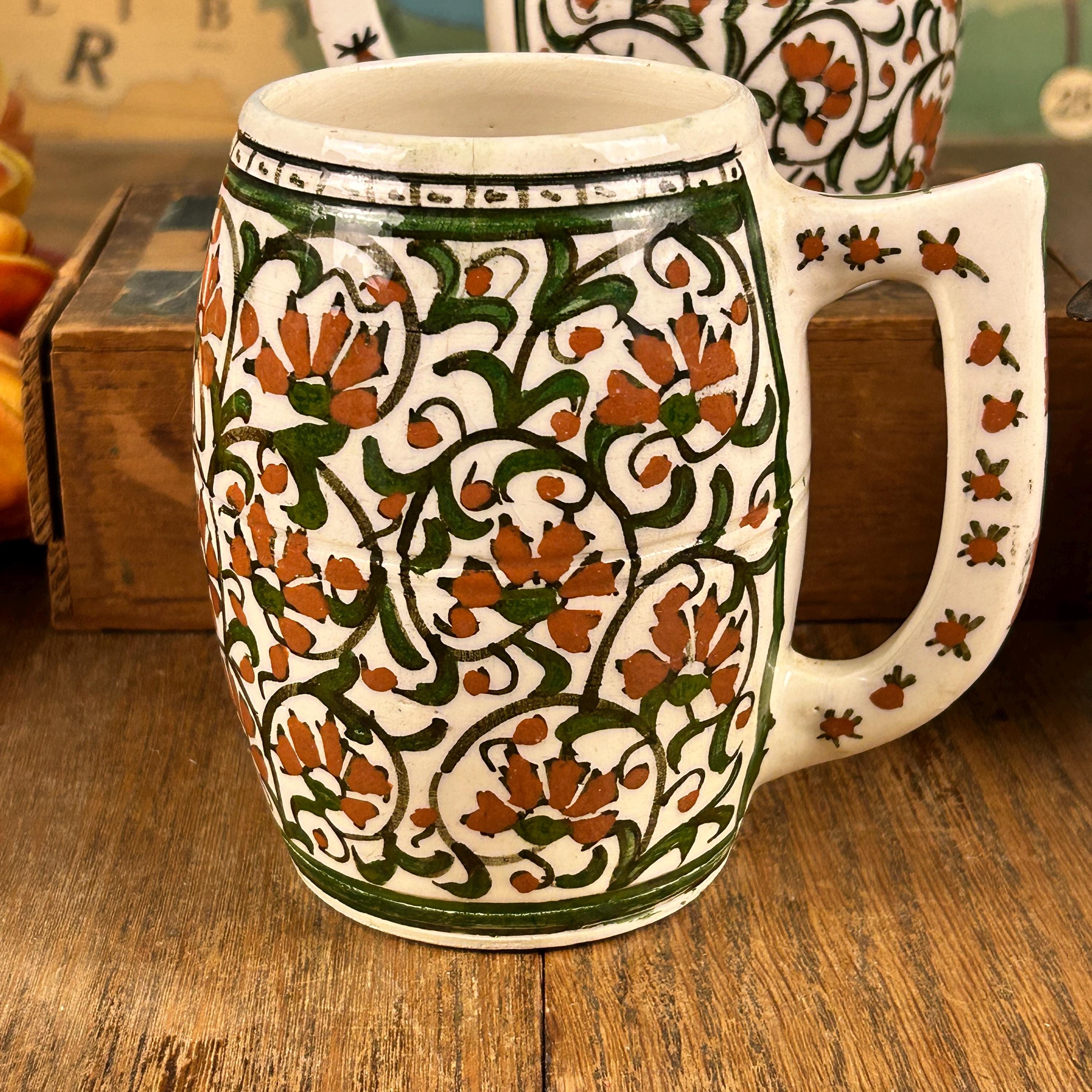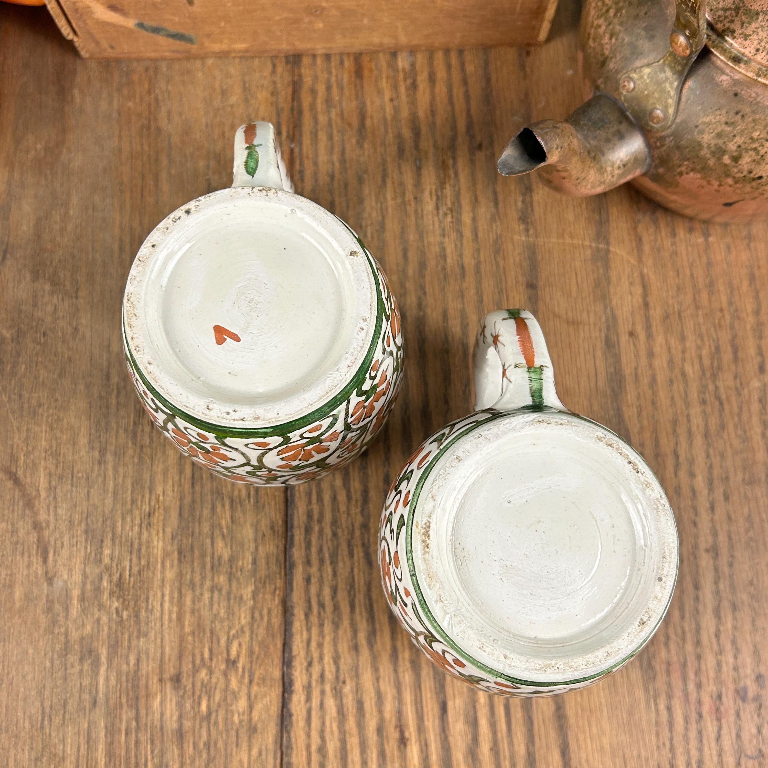 I am not sure of the age of these mugs. They are obviously very old. Vintage/Antique ceramic mugs, set of two large glazed ceramic mugs, hand painted. The mugs are handcrafted and the cups and handles have a floral decoration.