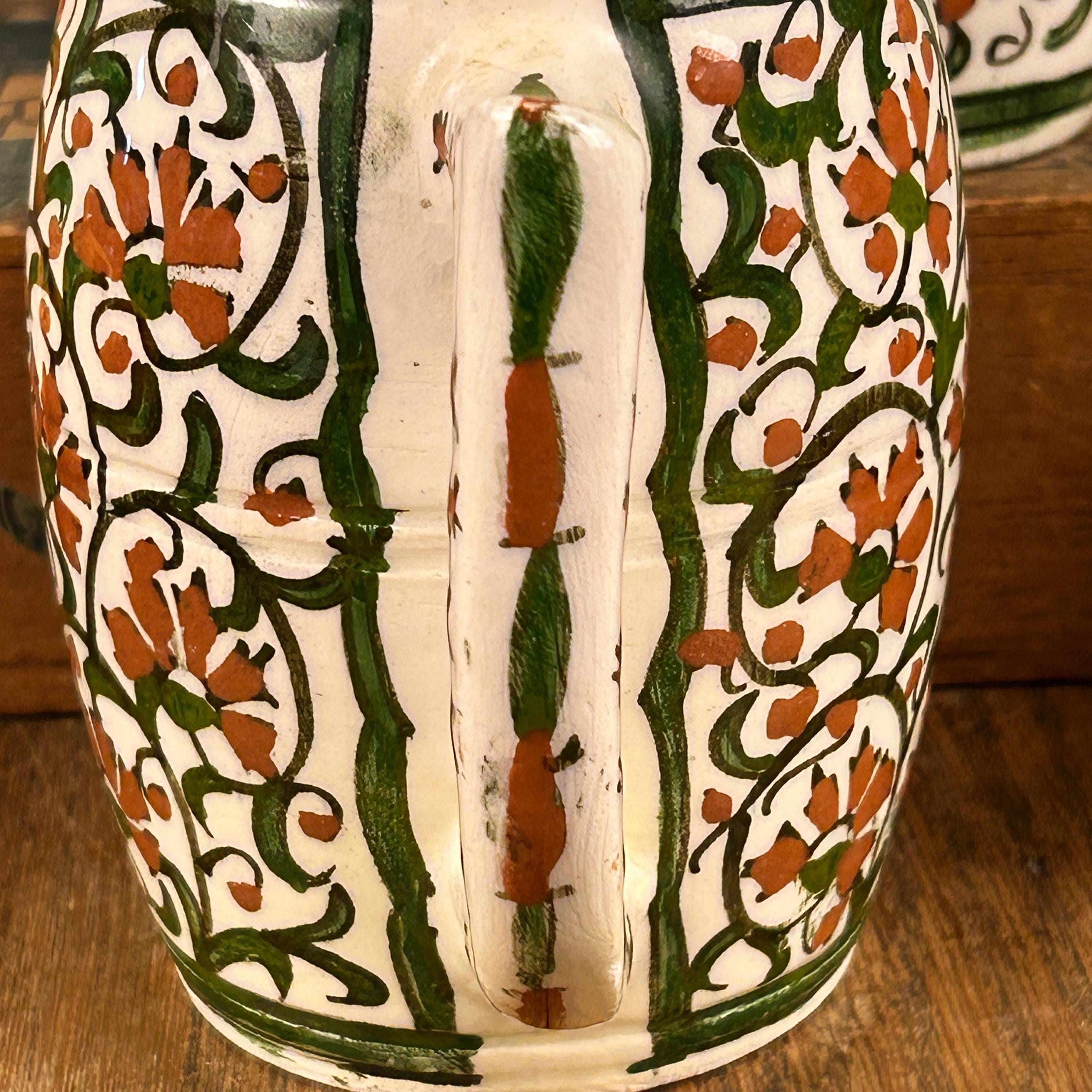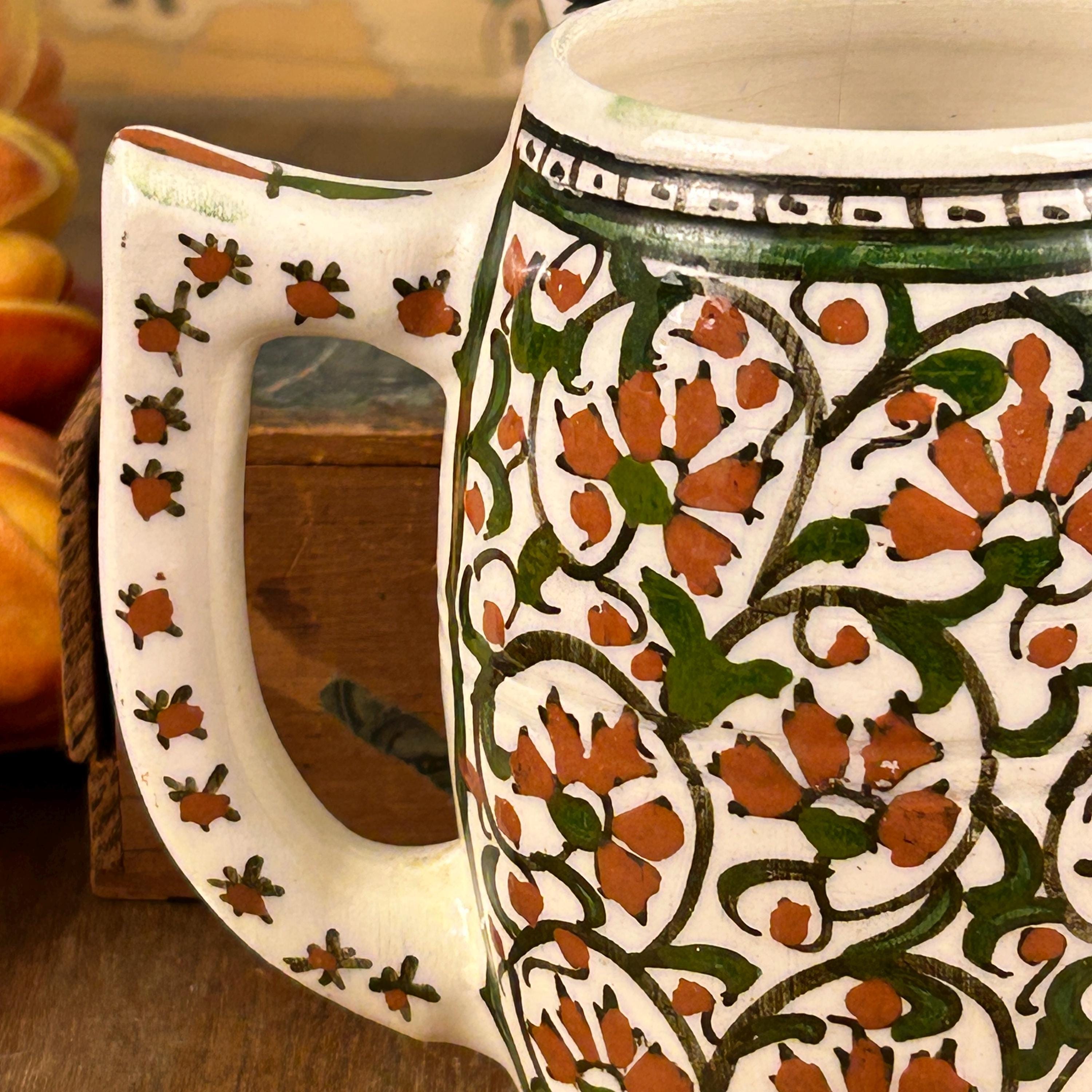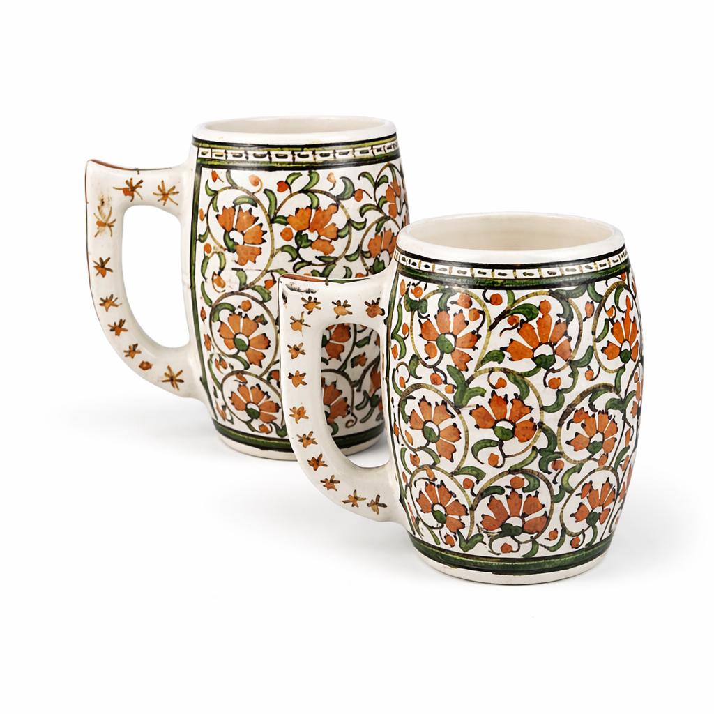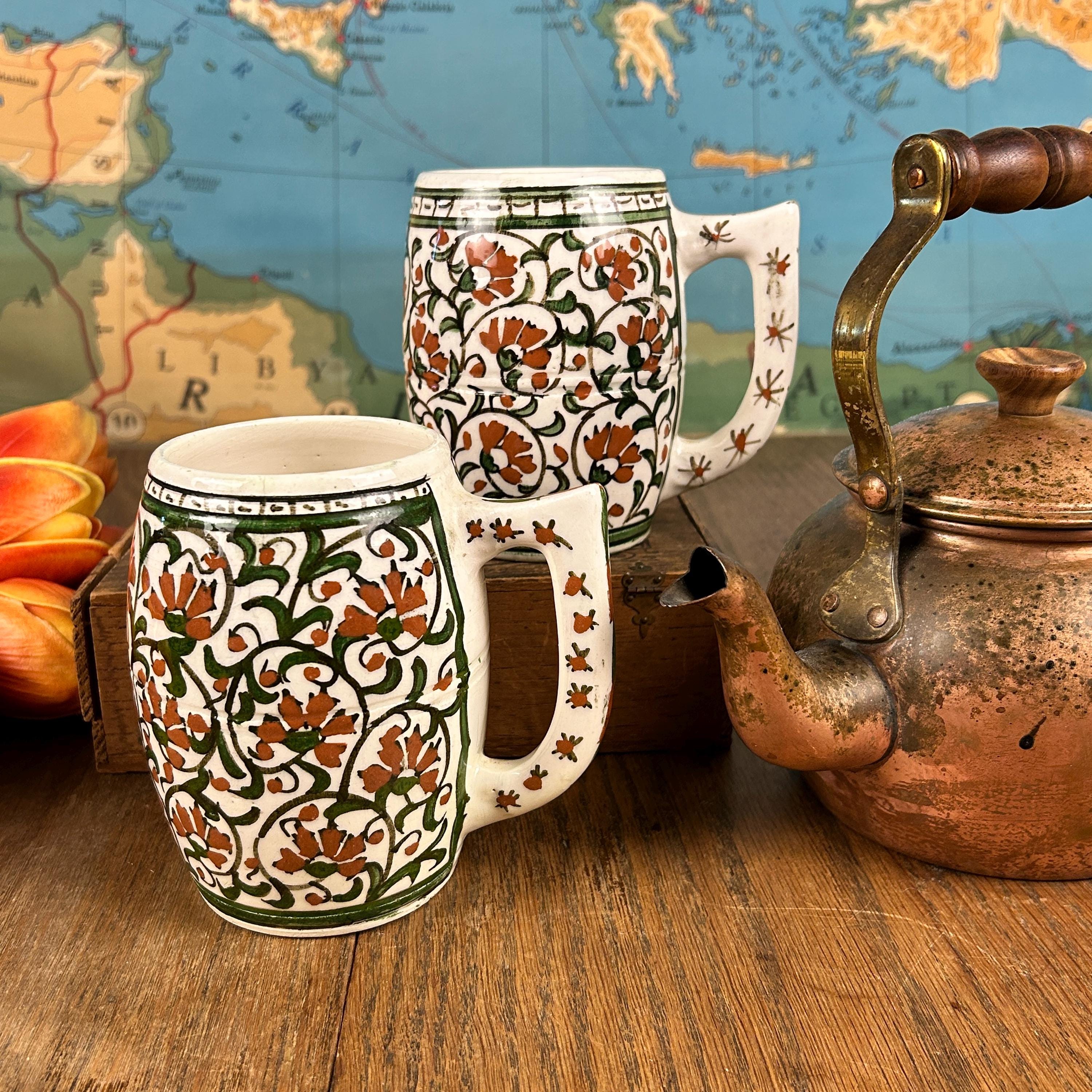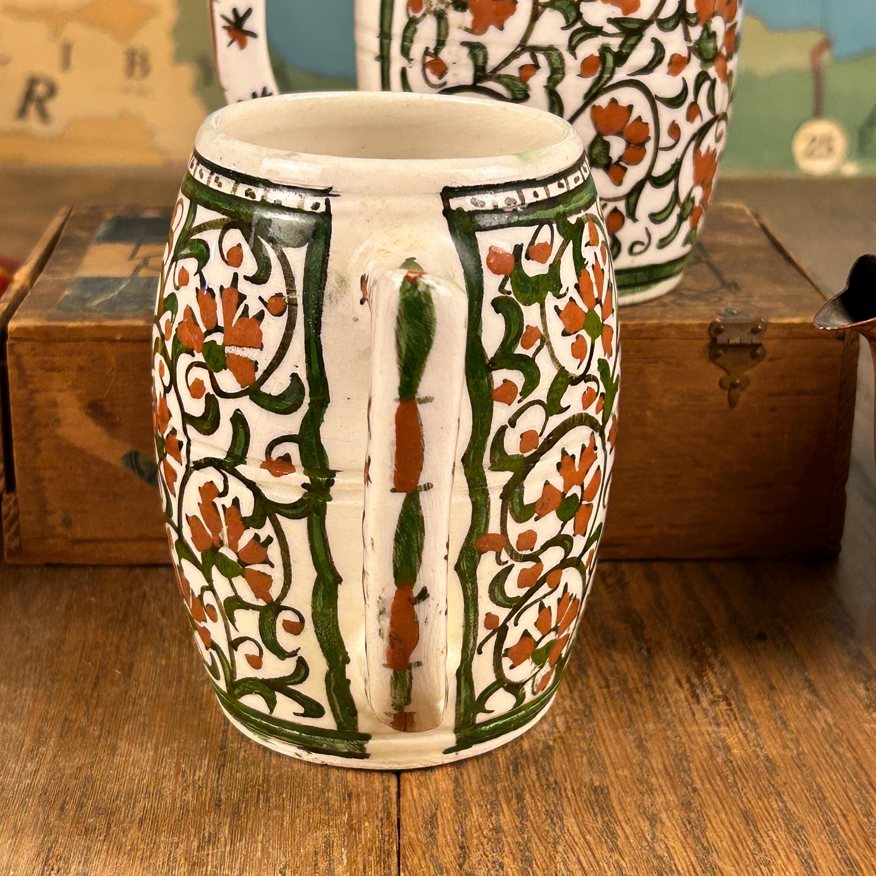 I am not sure of the age of these mugs. They are obviously very old. Vintage/Antique ceramic mugs, set of two large glazed ceramic mugs, hand painted. The mugs are handcrafted and the cups and handles have a floral decoration.