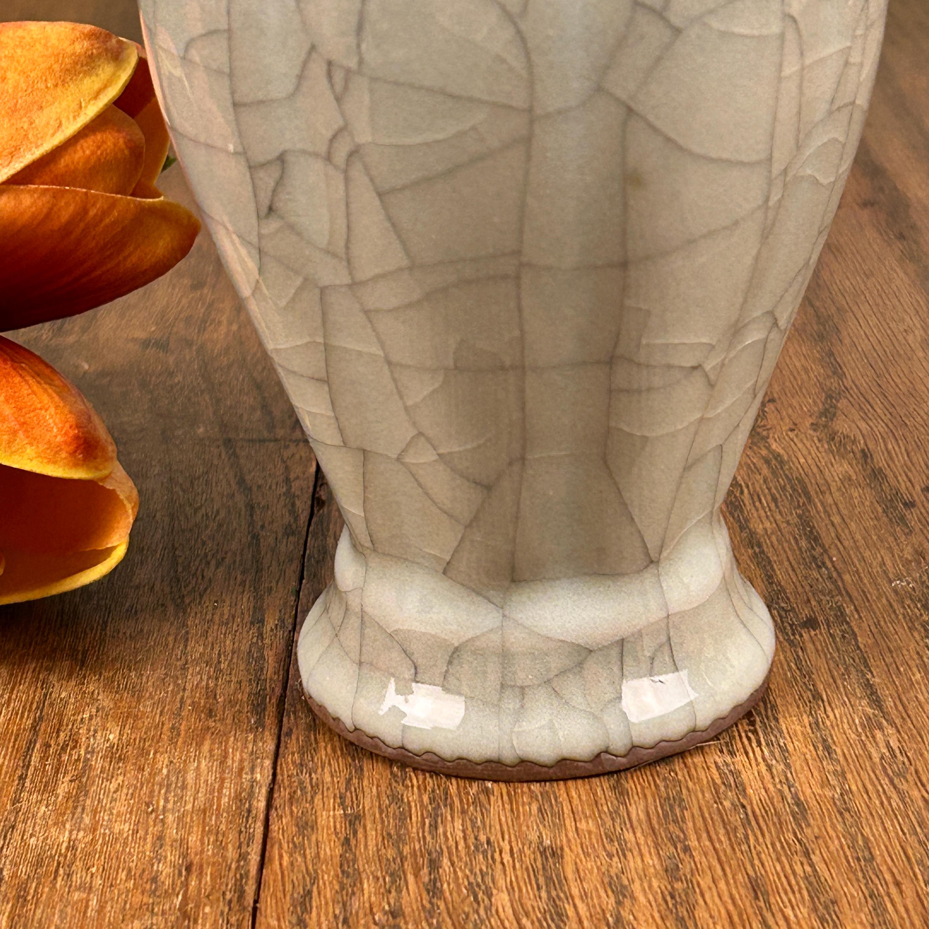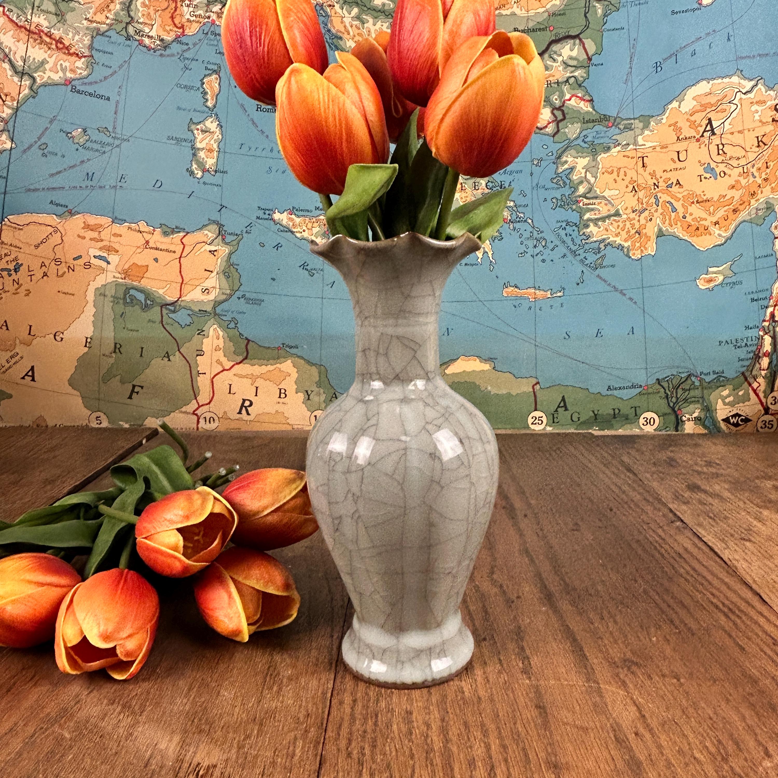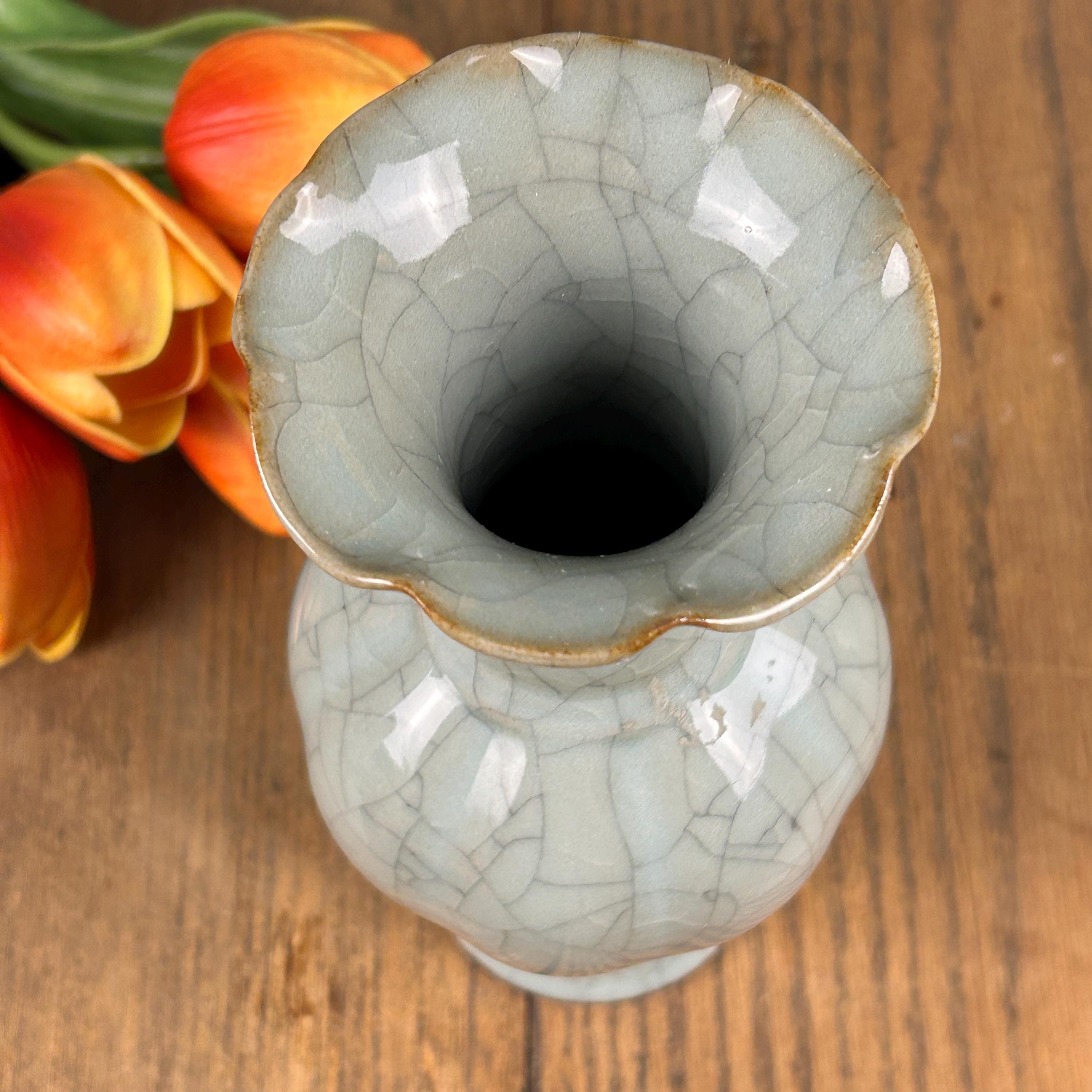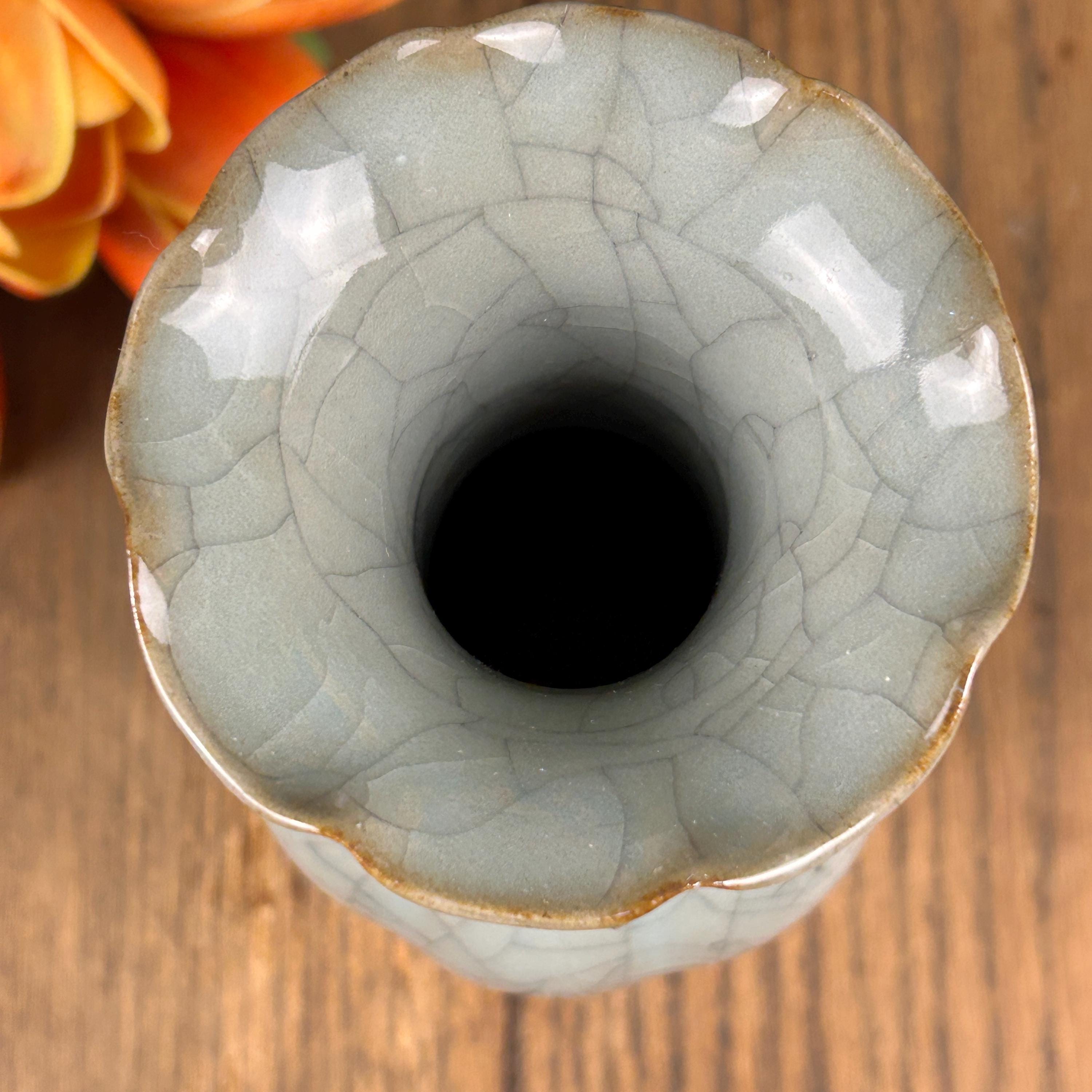 This beautiful grayish-blueish-greenish cracked glaze porcelain vase is stunning. A ruffled opening at the top with a hint of brown on the lip of the vase. Measures 9" high and the widest part is 4" in diameter. Base is 2 1/2" in diameter.