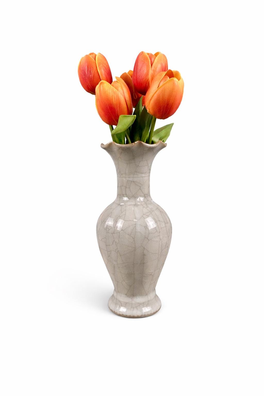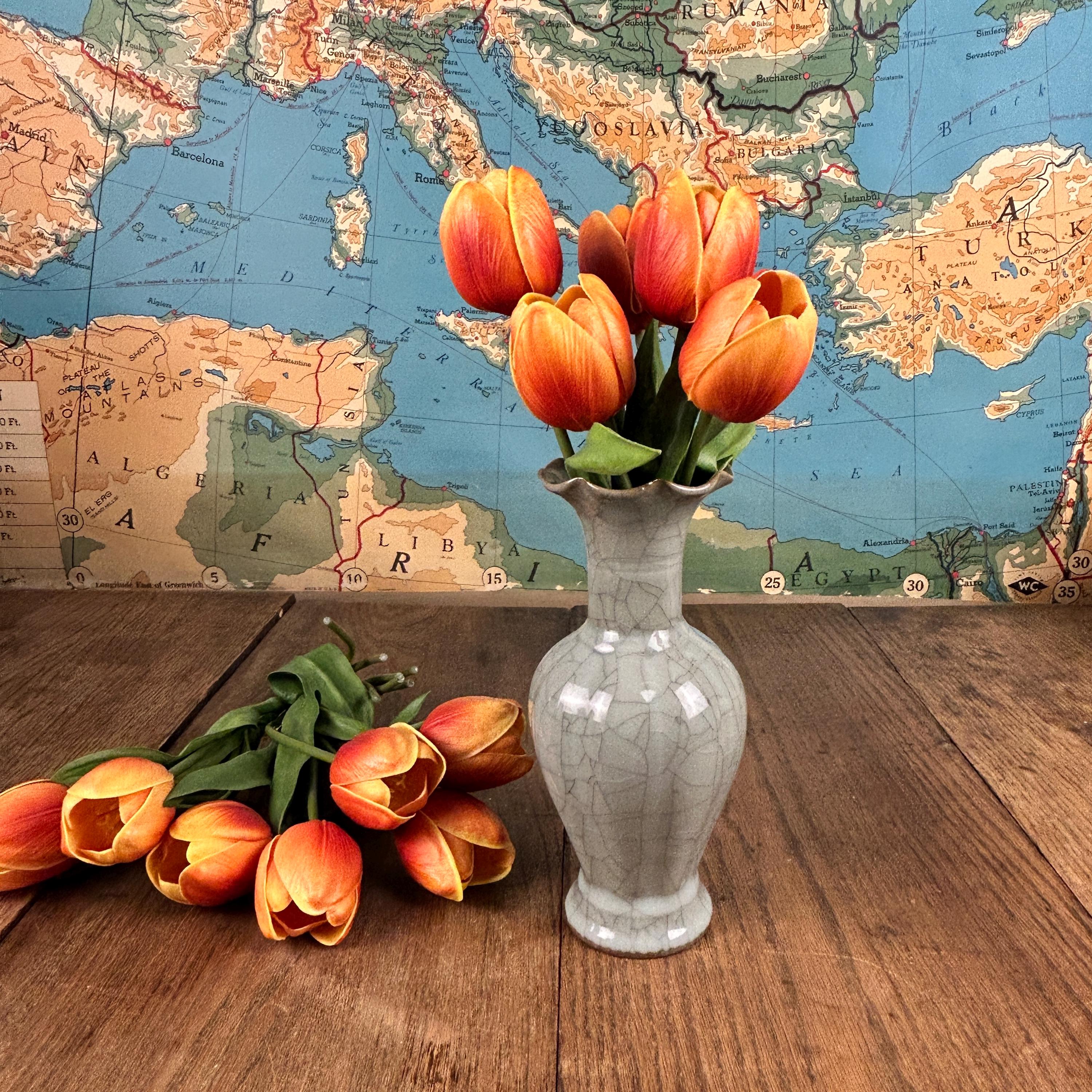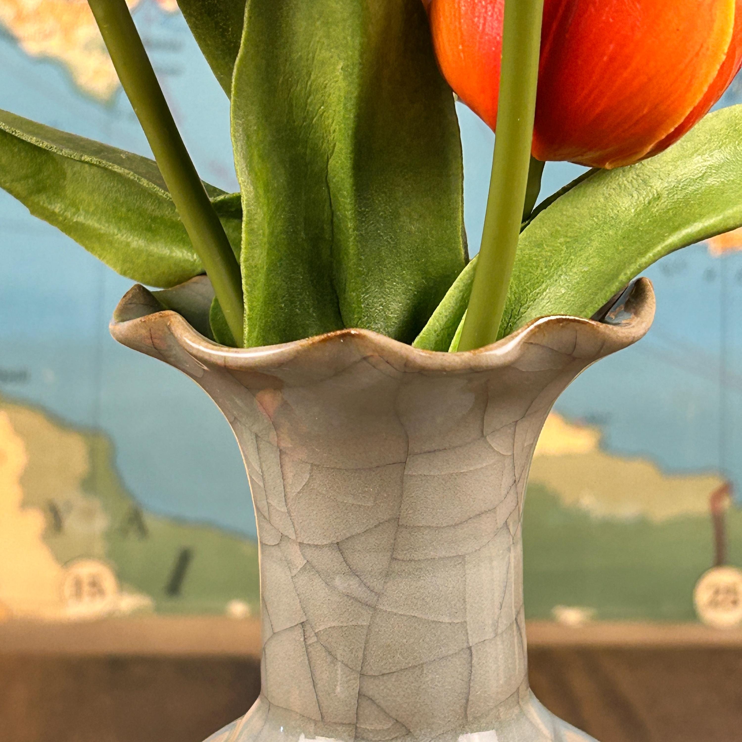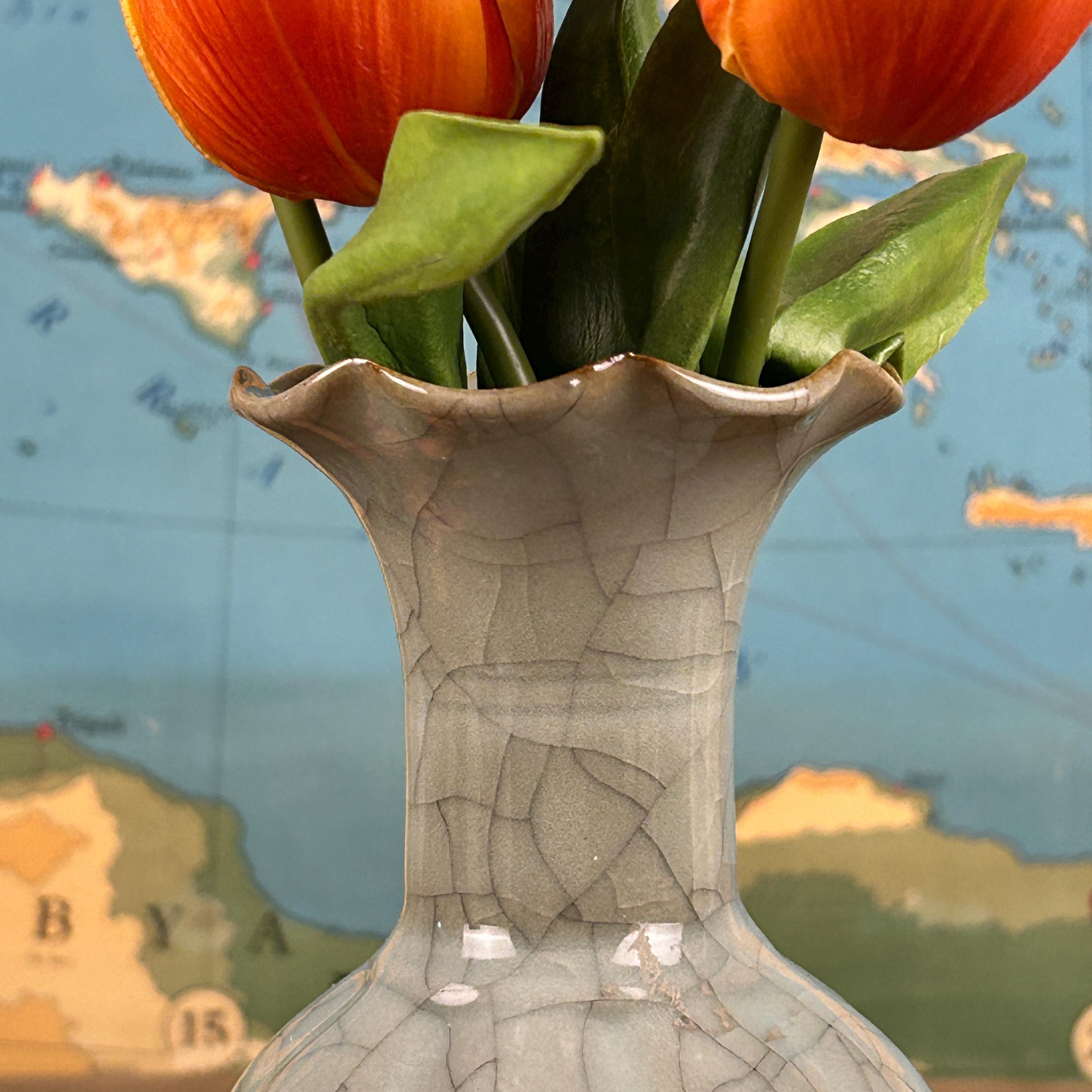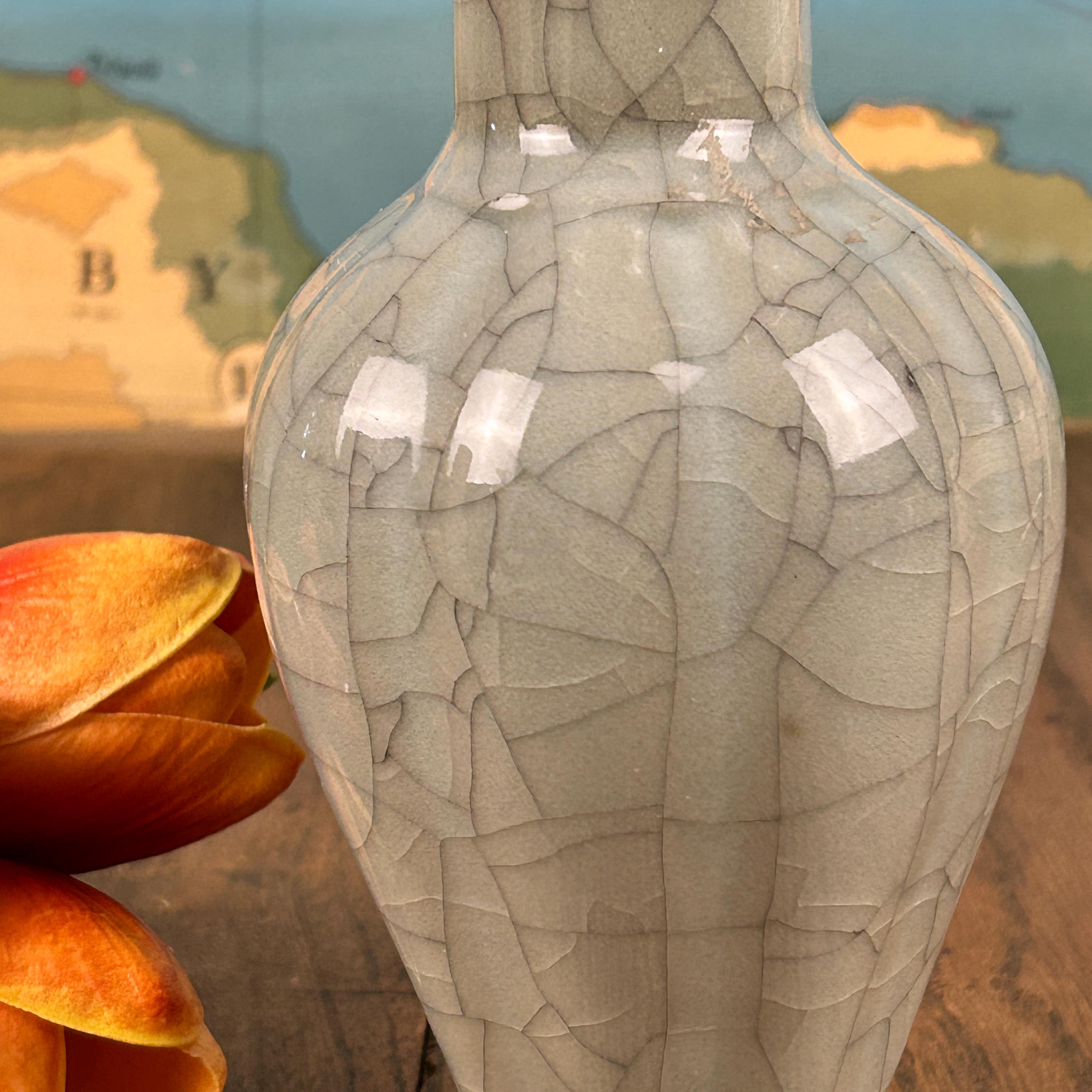 This beautiful grayish-blueish-greenish cracked glaze porcelain vase is stunning. A ruffled opening at the top with a hint of brown on the lip of the vase. Measures 9" high and the widest part is 4" in diameter. Base is 2 1/2" in diameter.