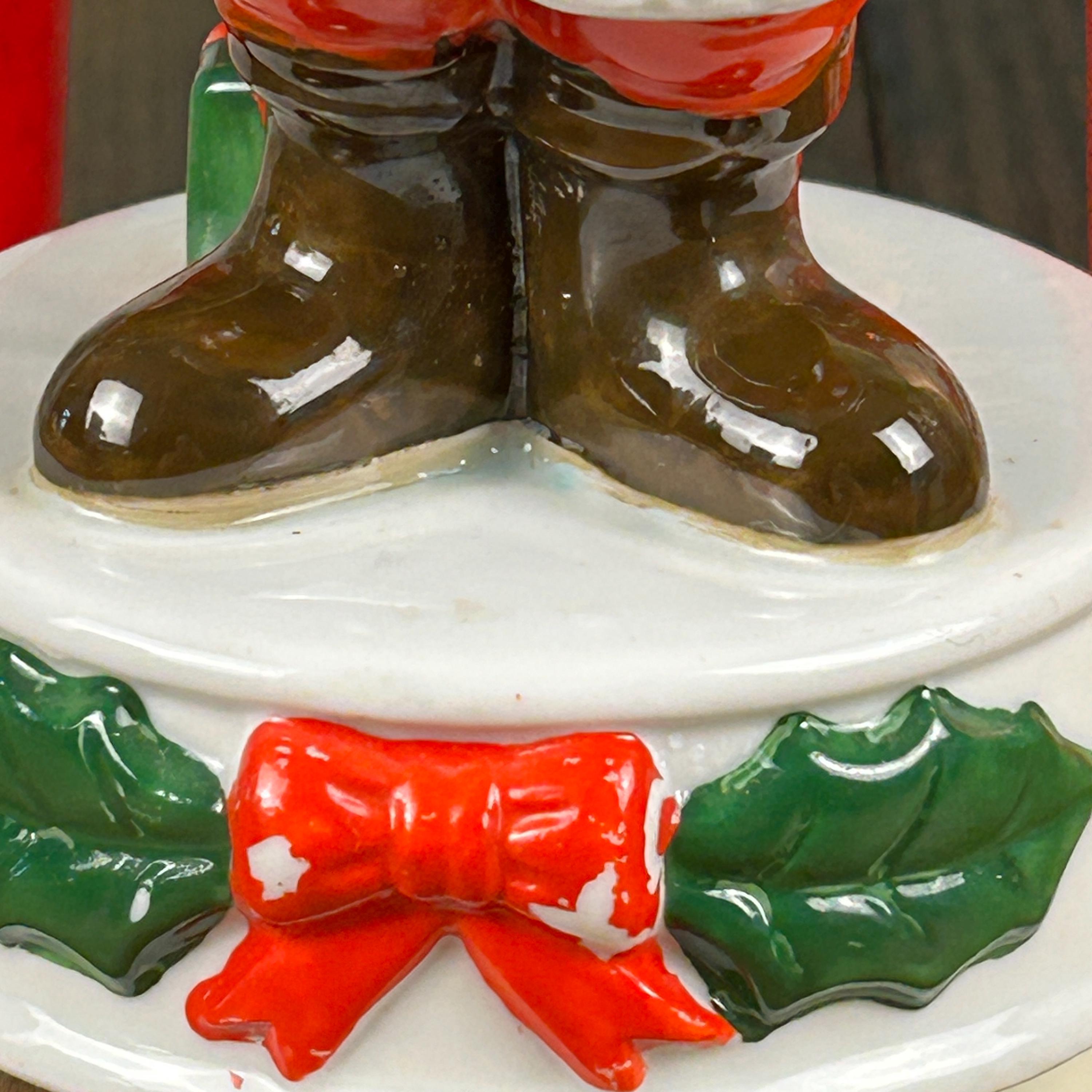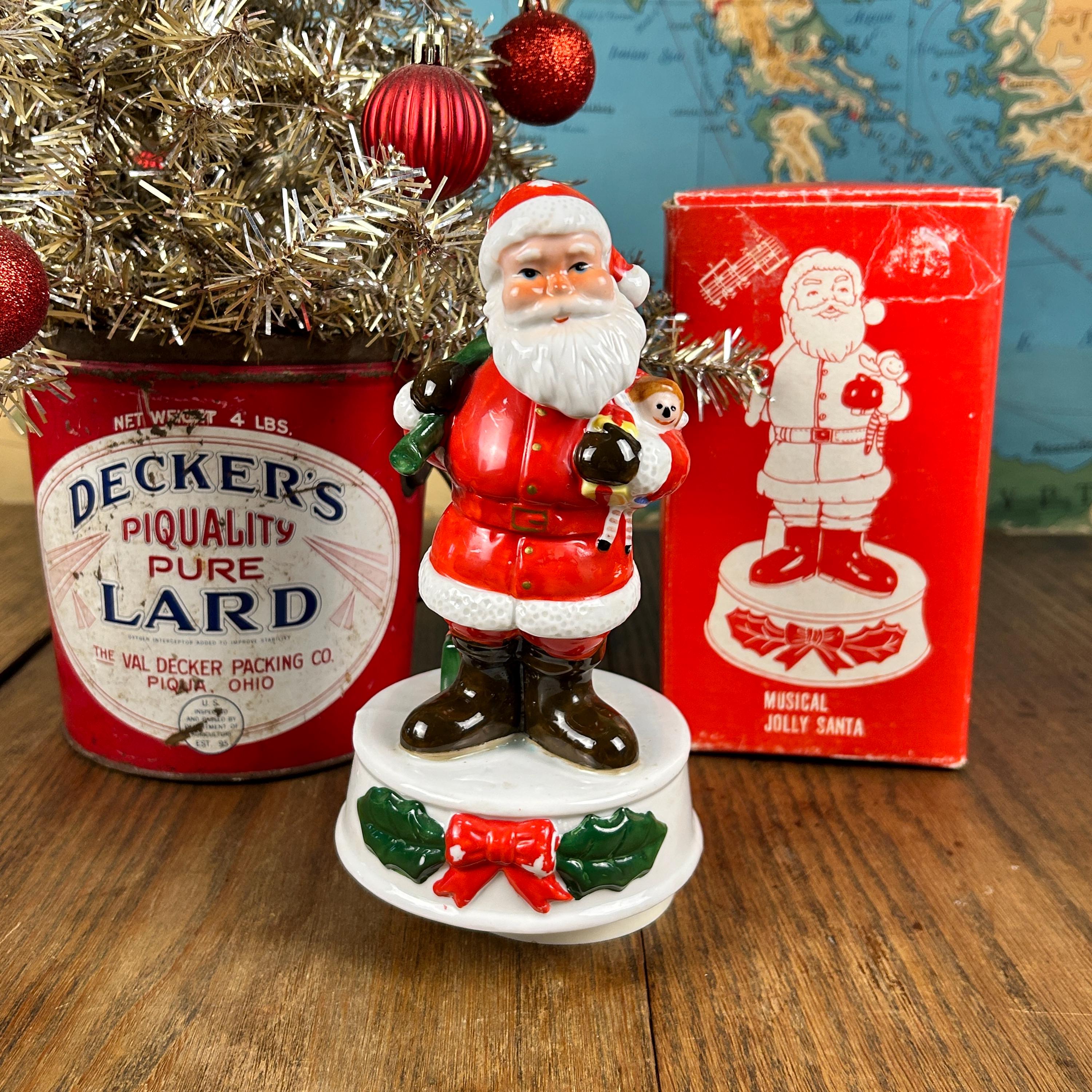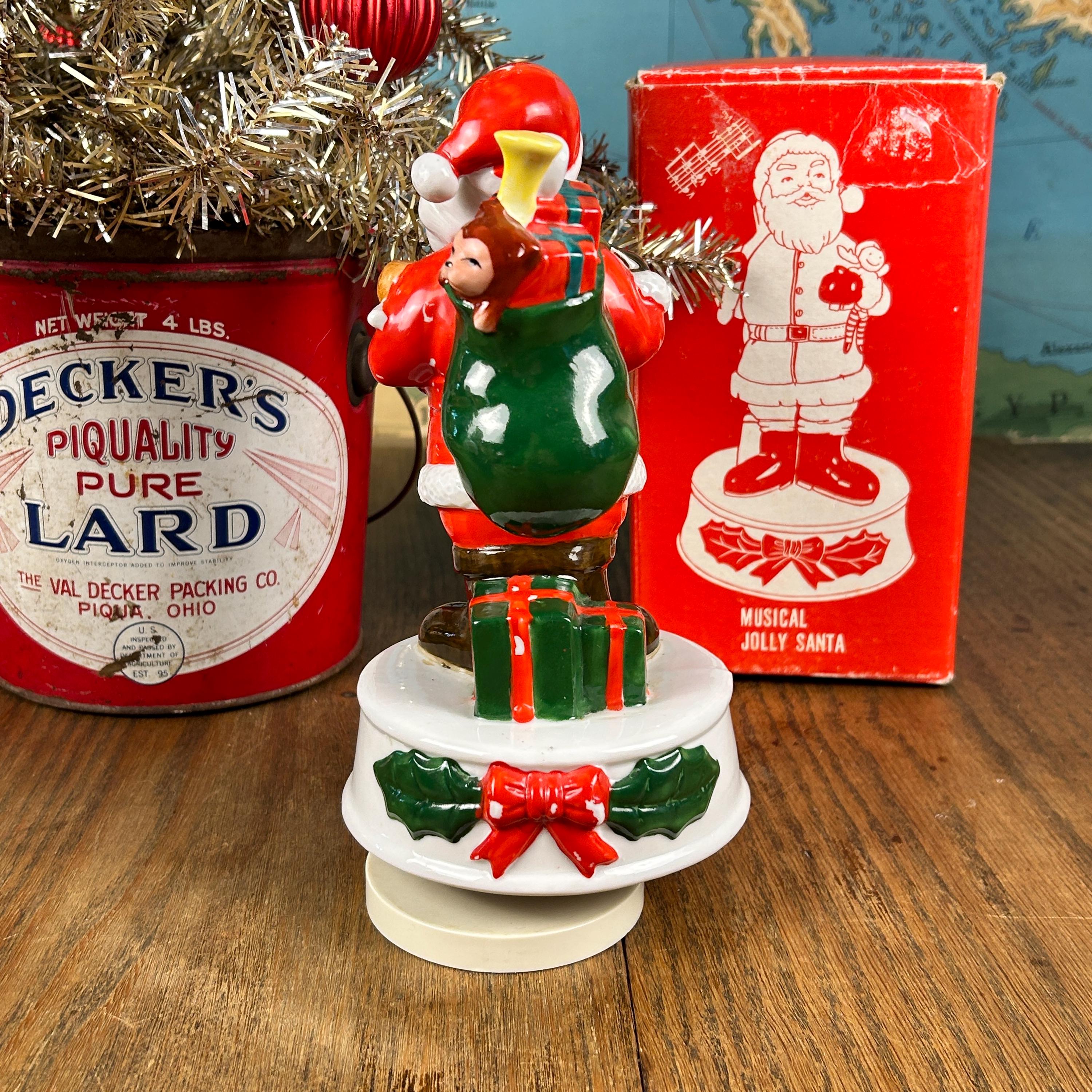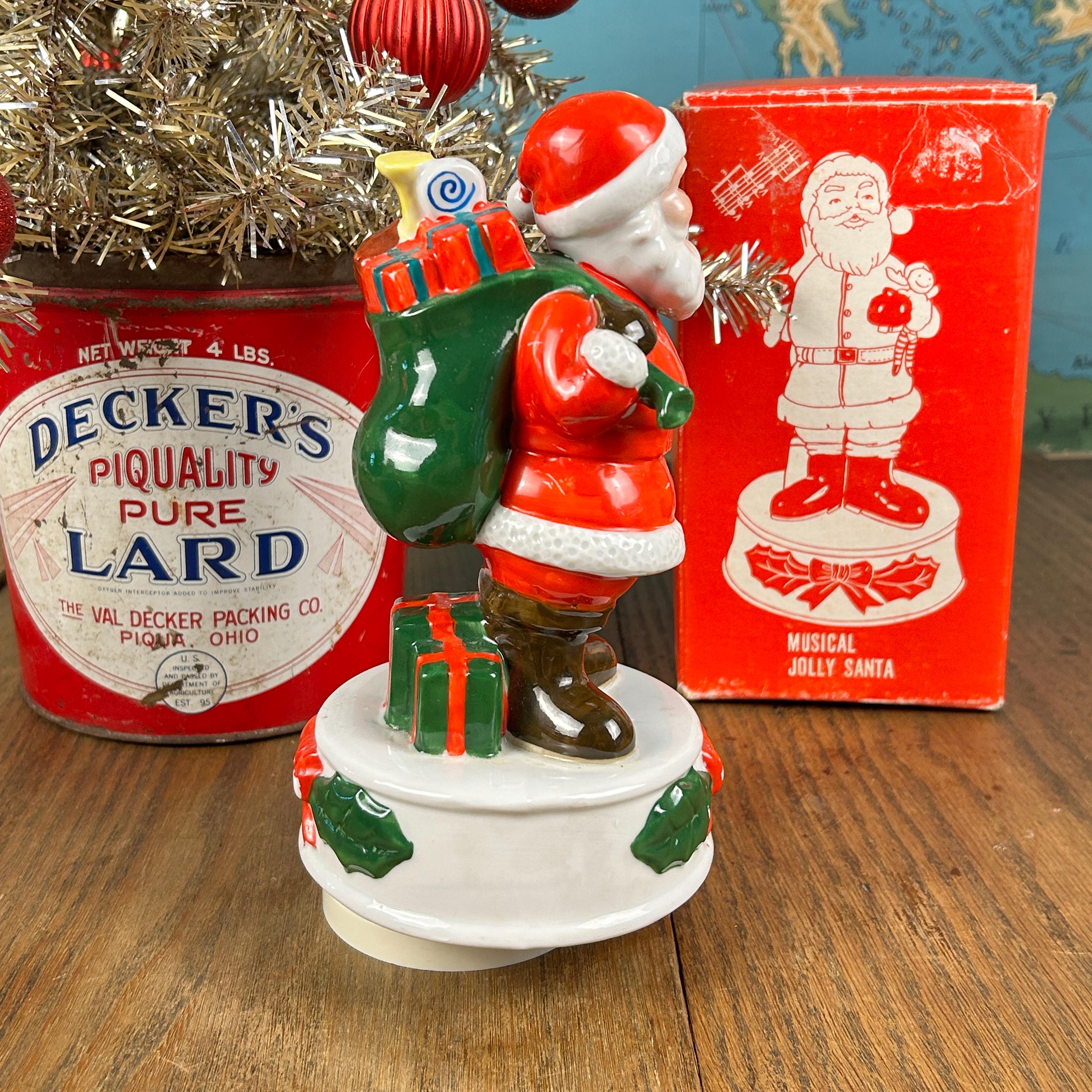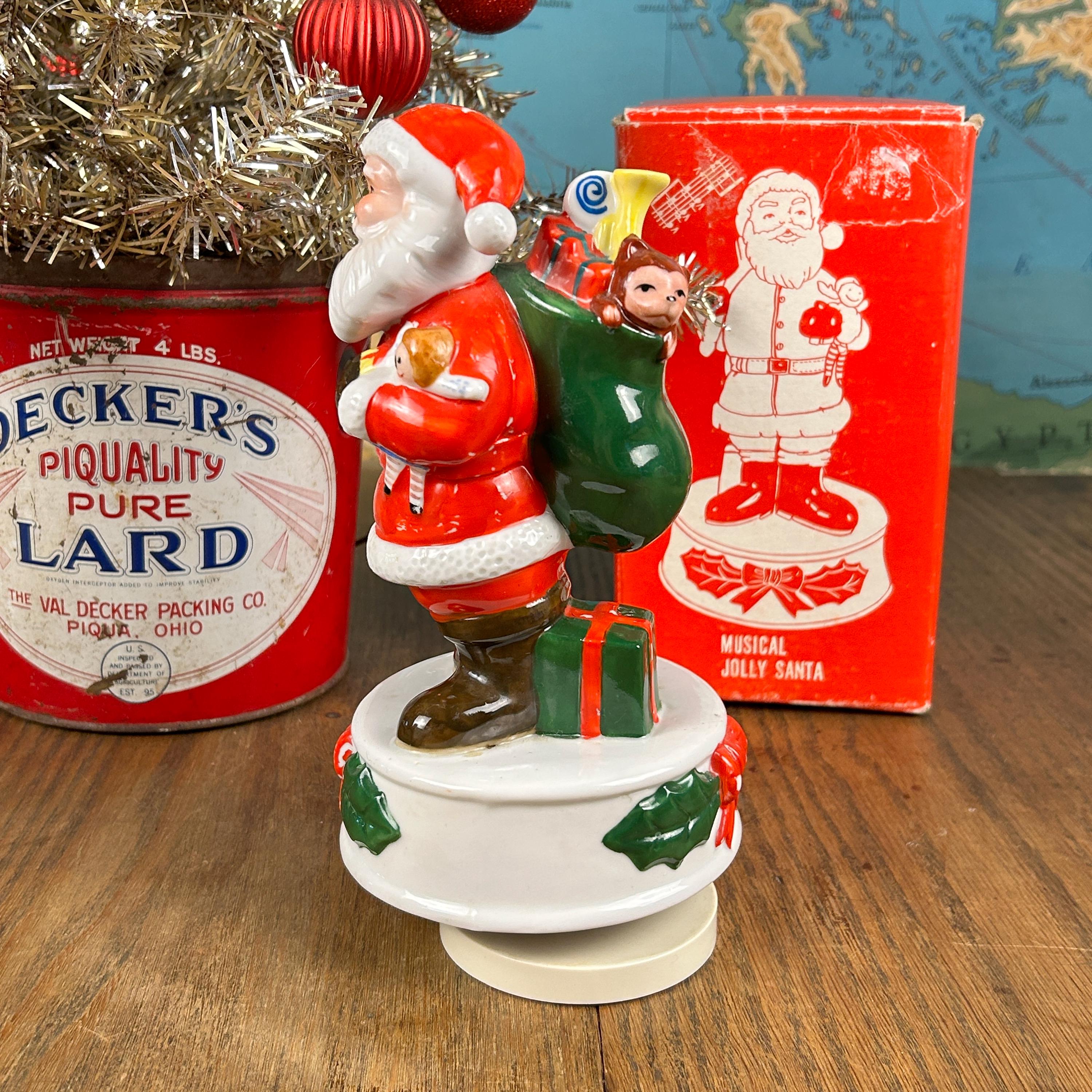 This adoral Musical Jolly Santa was made in Korea in the 1970s. When wound up, he plays "Santa Claus is Coming to Town". He's got the right amount of wear with some small patches of paint missing, adding to his vintage charm. He plays the song a bit slower than normal, but it still plays through all the way. (Please see video above). If preferred, you could unscrew the music dial and use him as holiday decor without the music. He comes with the original box!