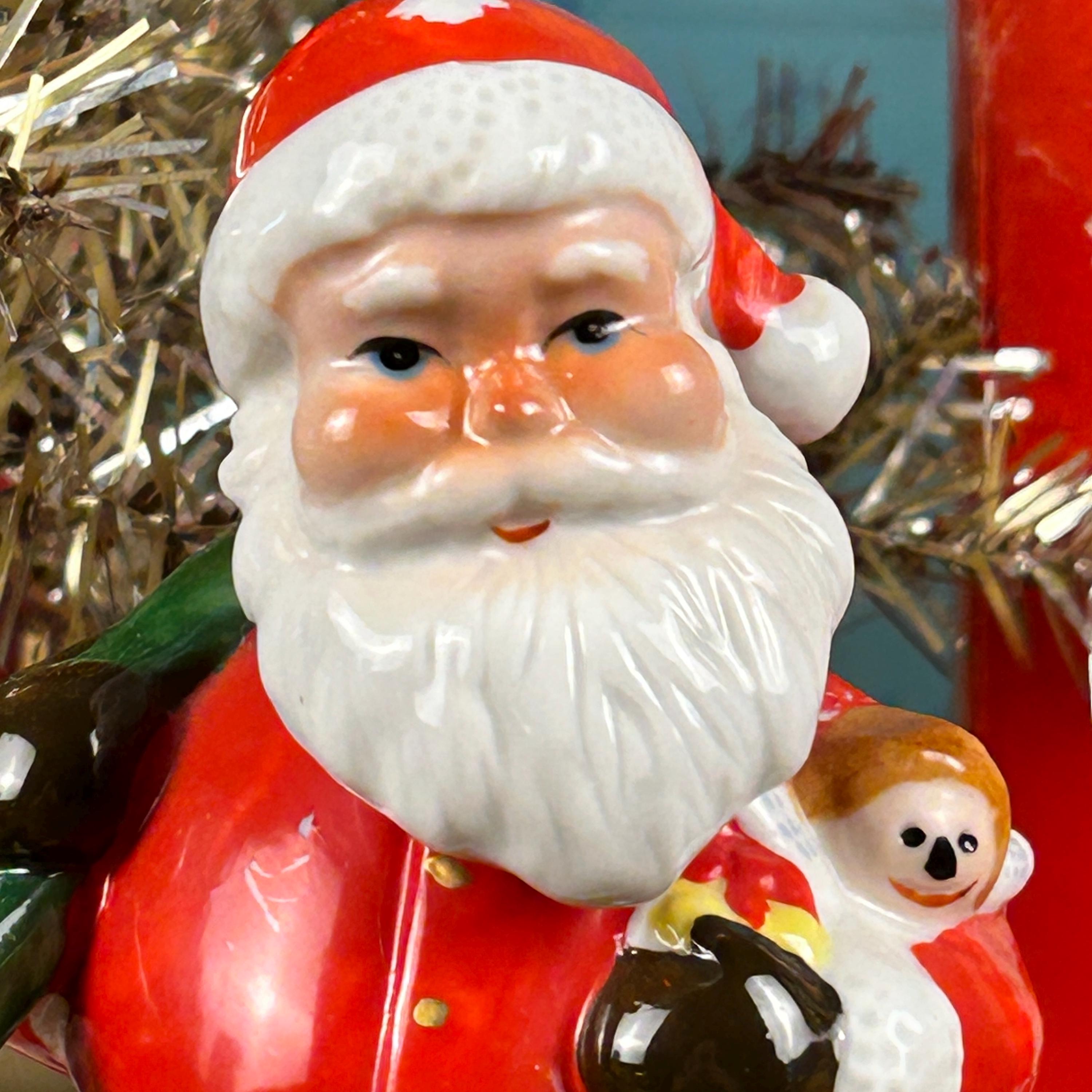 He carries a doll and a bag of toys on his back with presents at his feet. Standing ona. base with holly leaves and red ribbons, he is a Christmas delight!