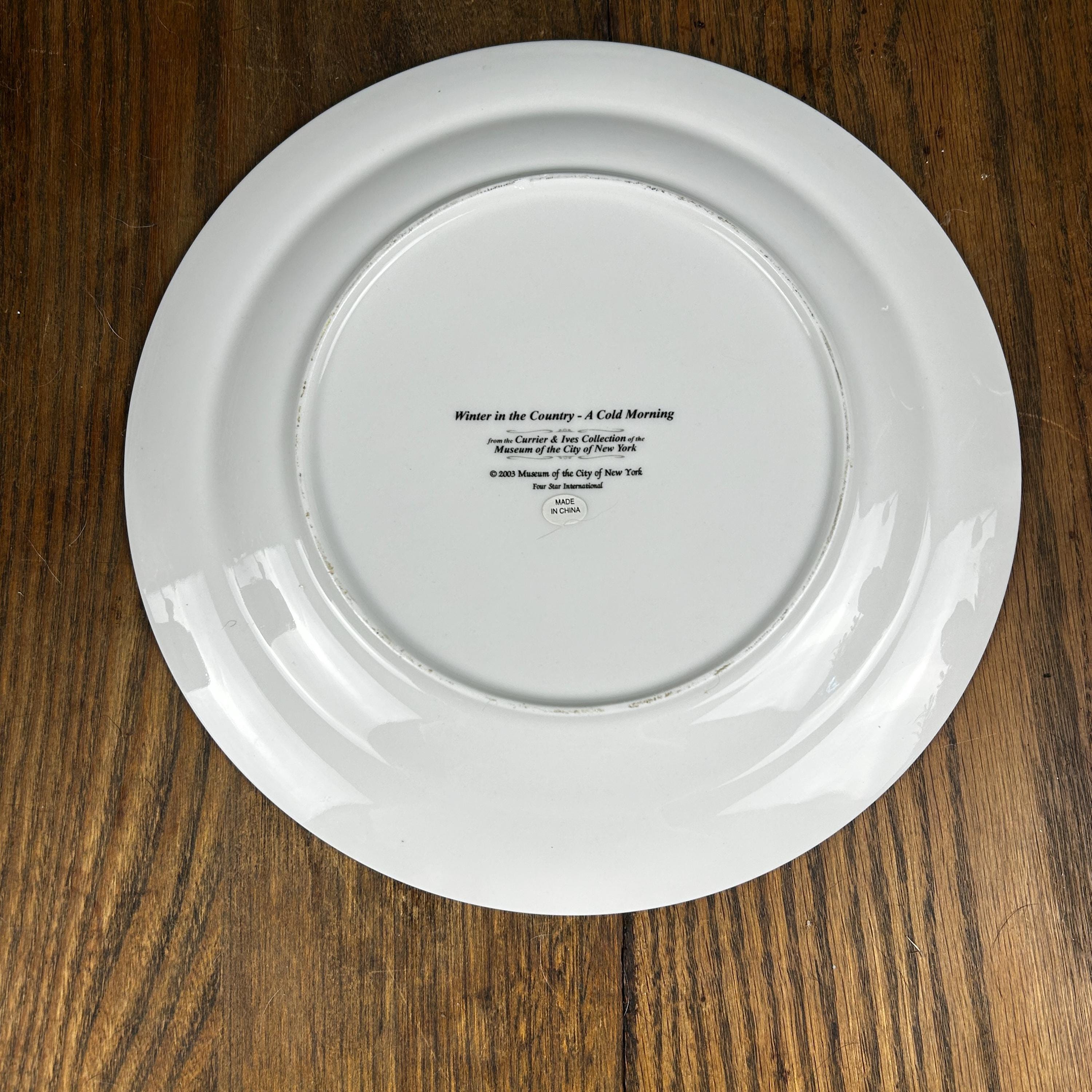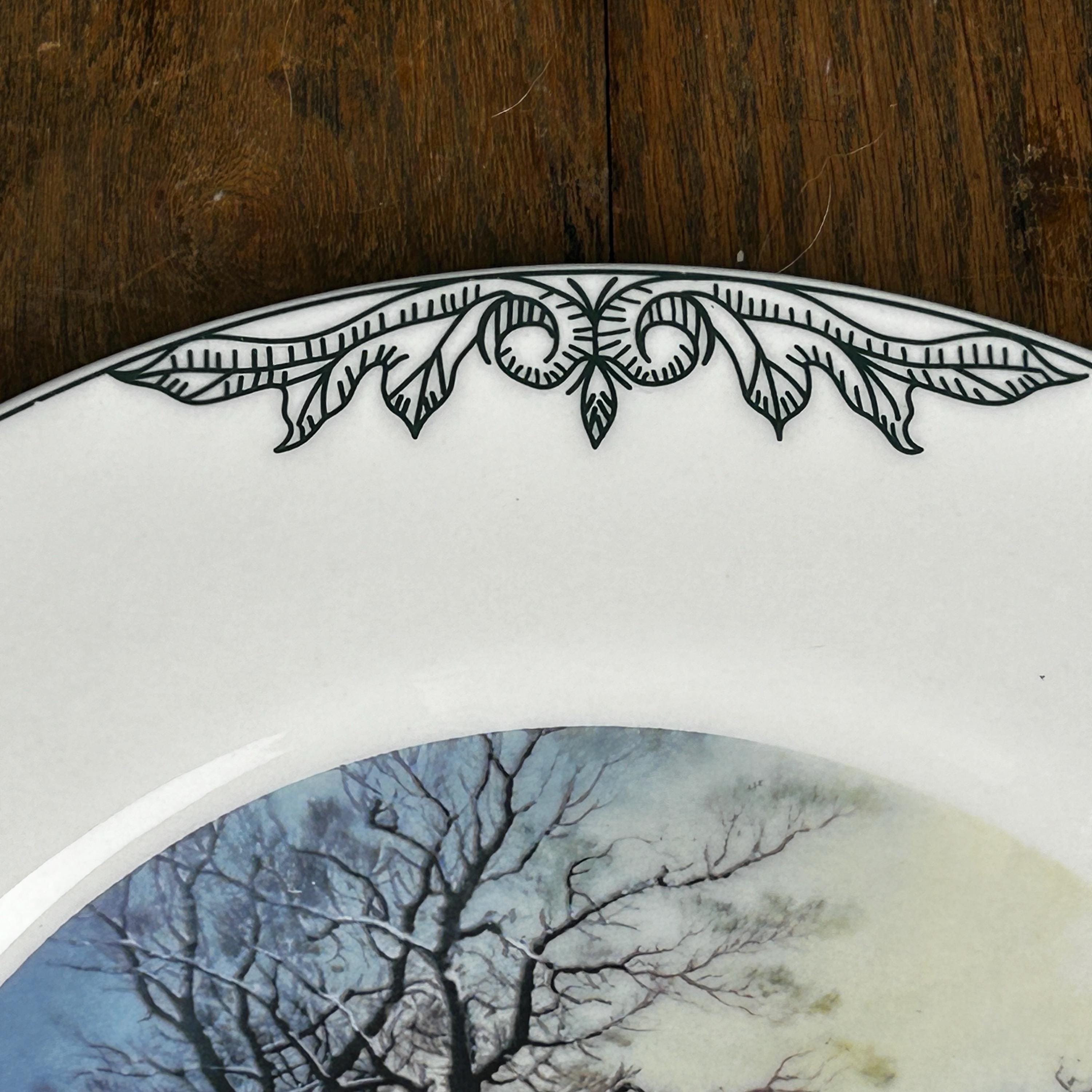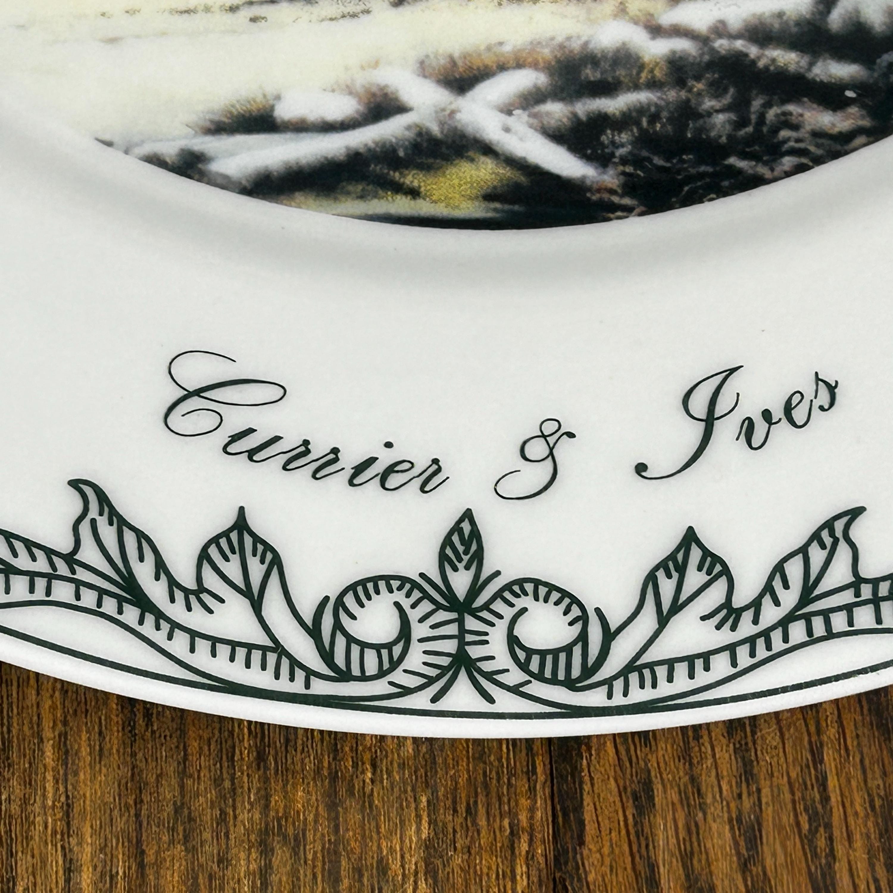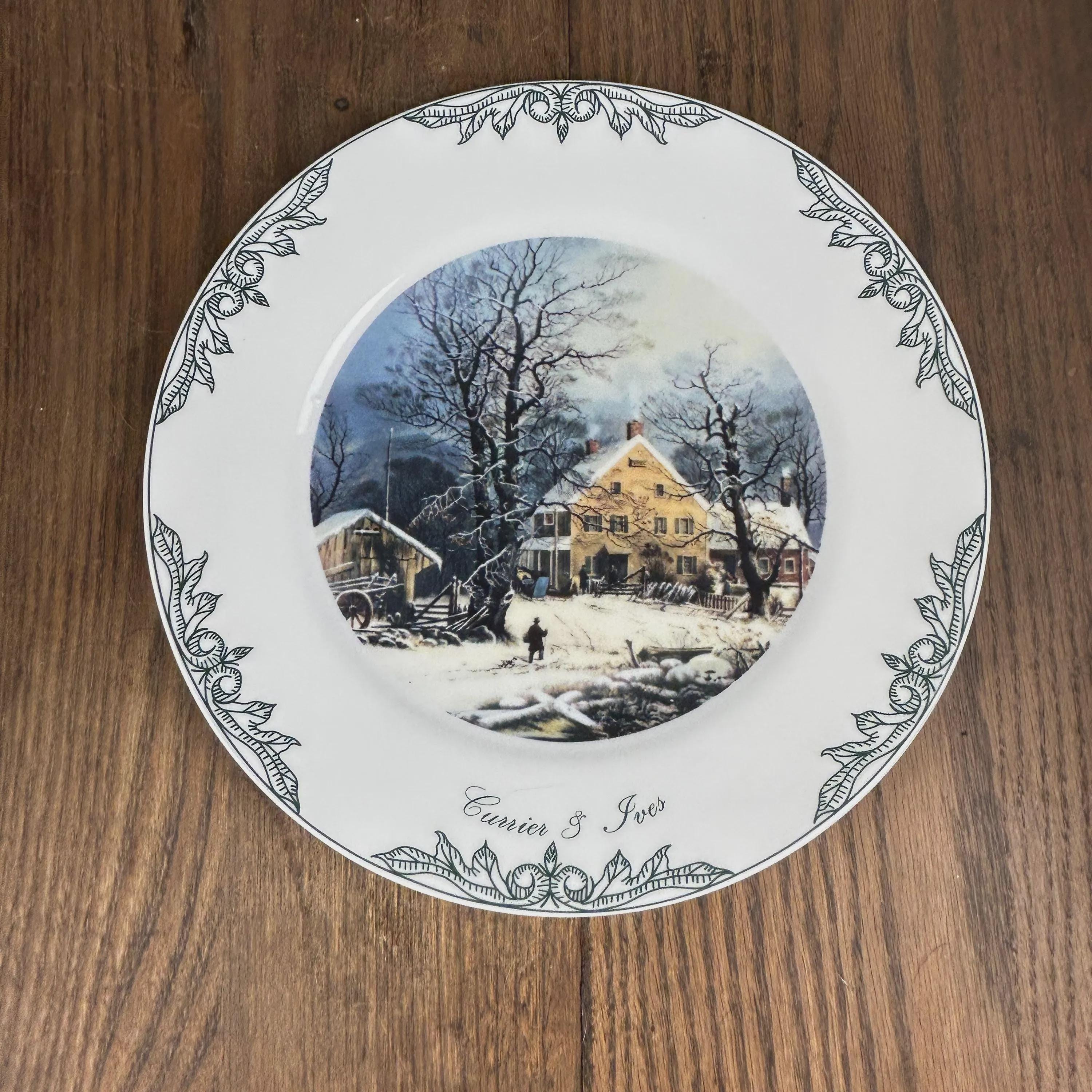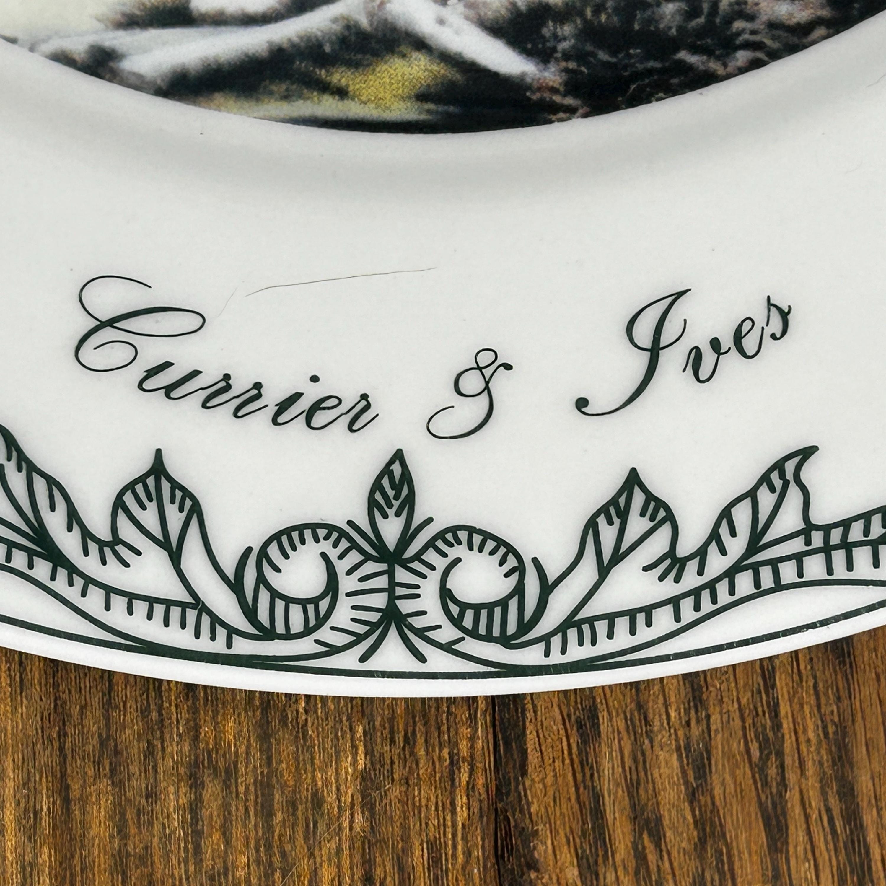 The scene is in the center of the plate with a wide white boarder. The border is then trimmed in 6 places with a green scroll design along with Currier and Ives name at the bottom.
