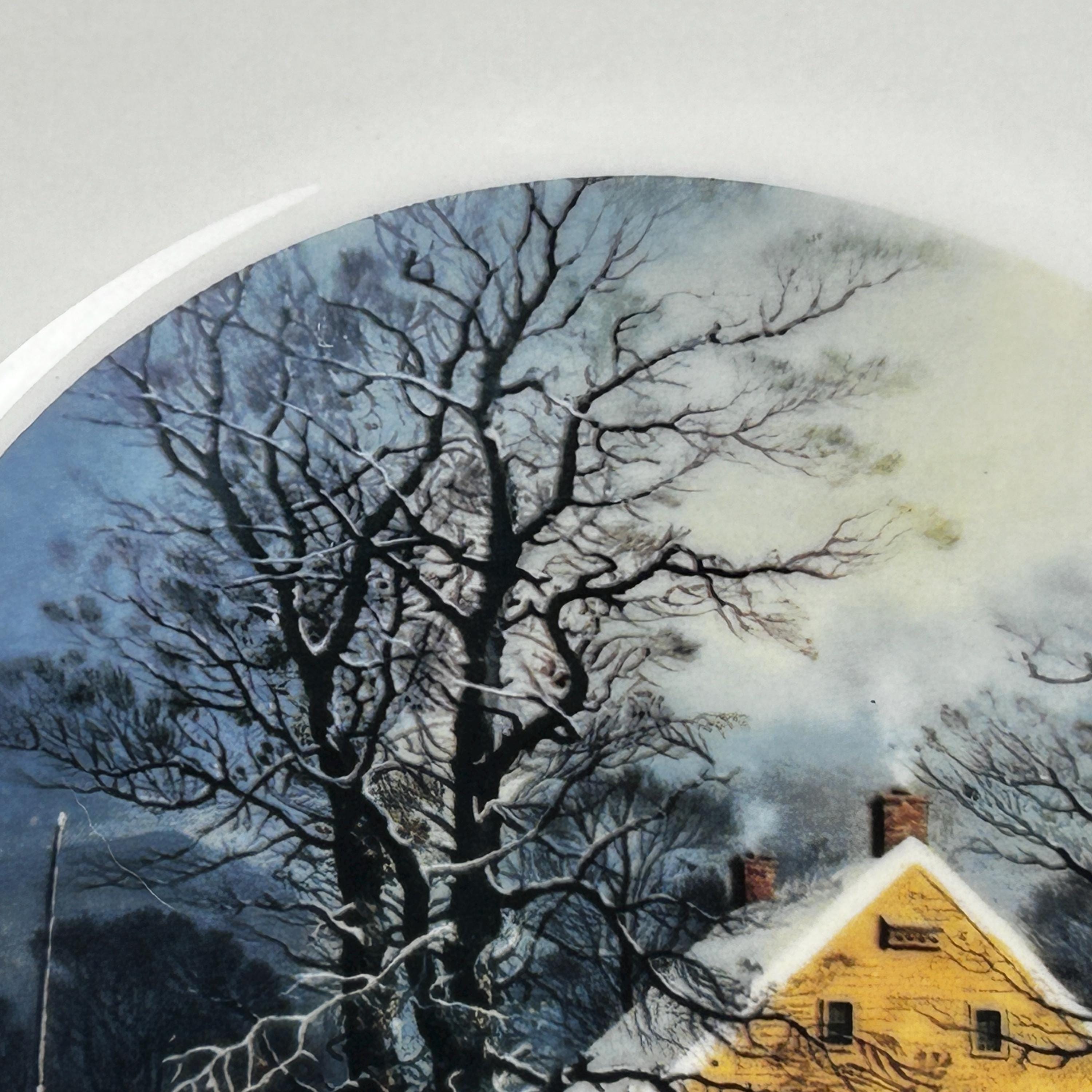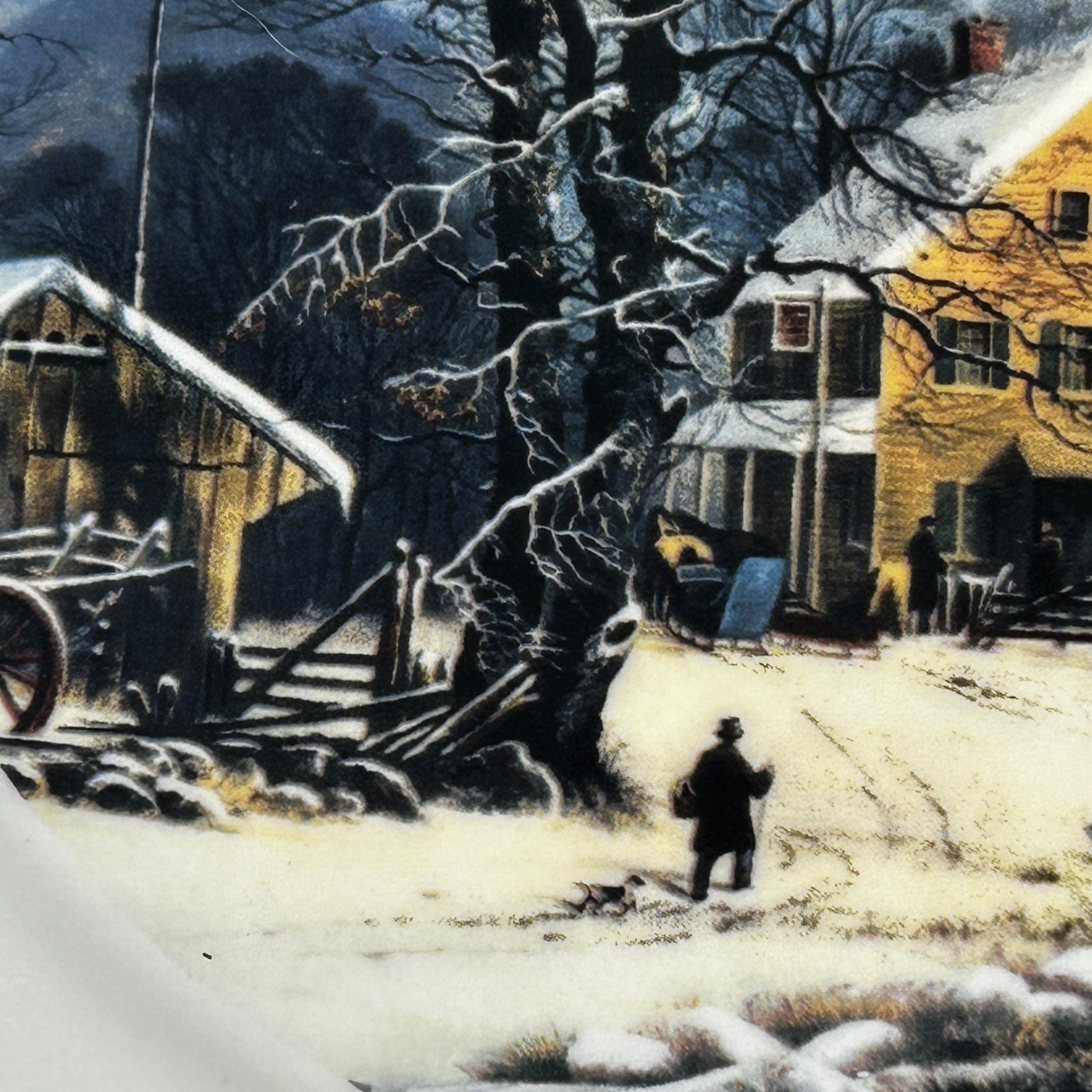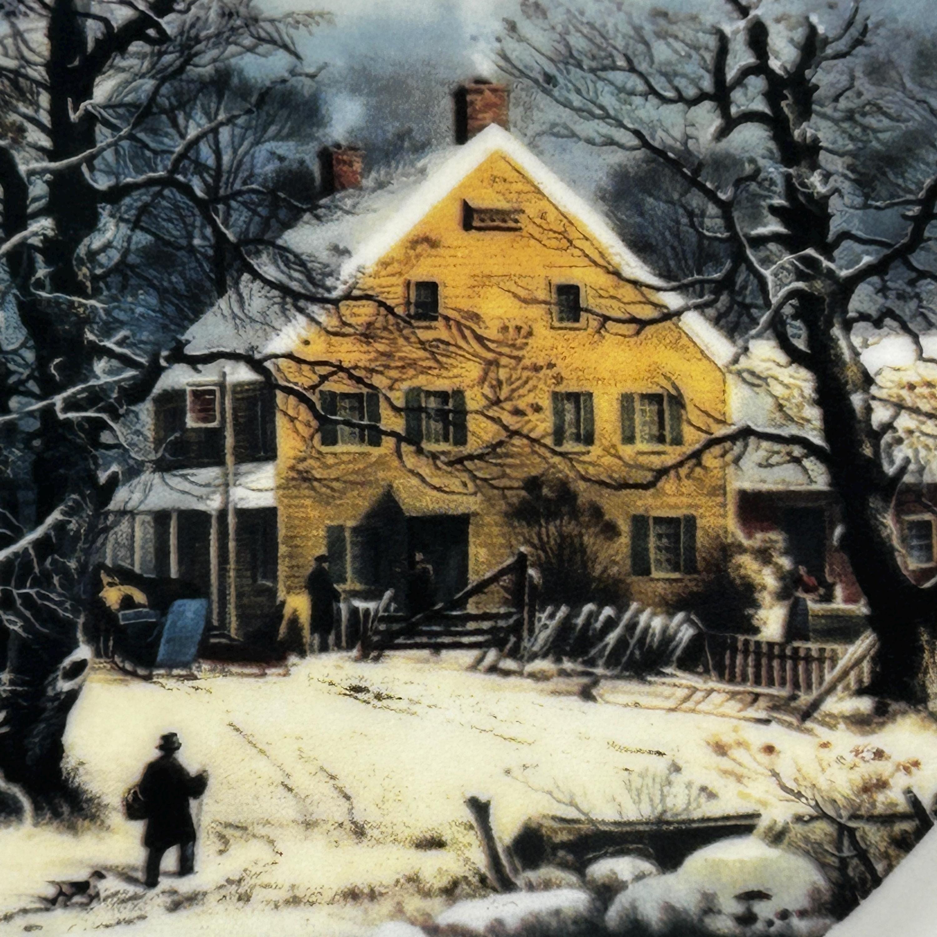 This plate depicts how life was in the late 1800's in the winter.An old farmstead covered in snow and a traveler coming to greet.