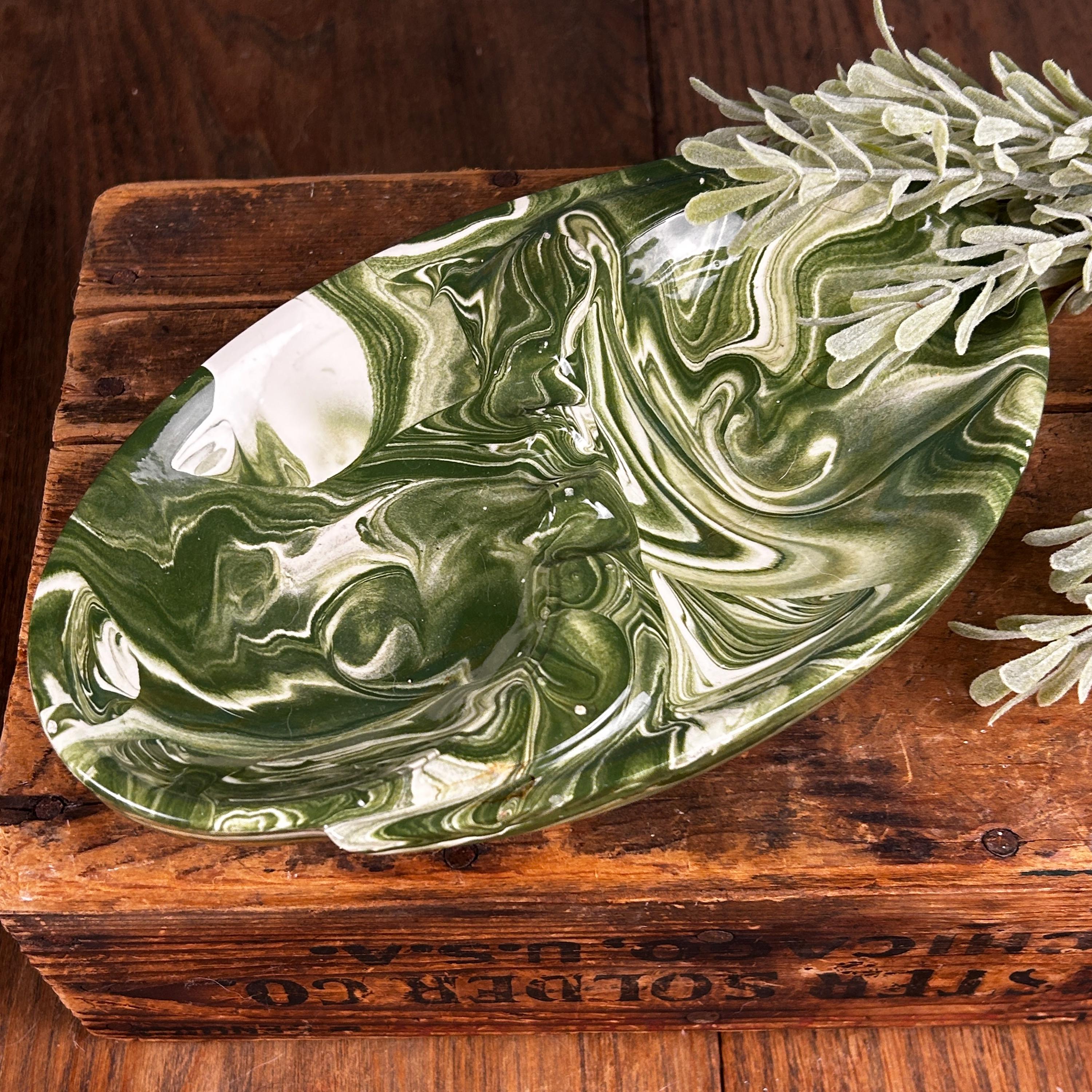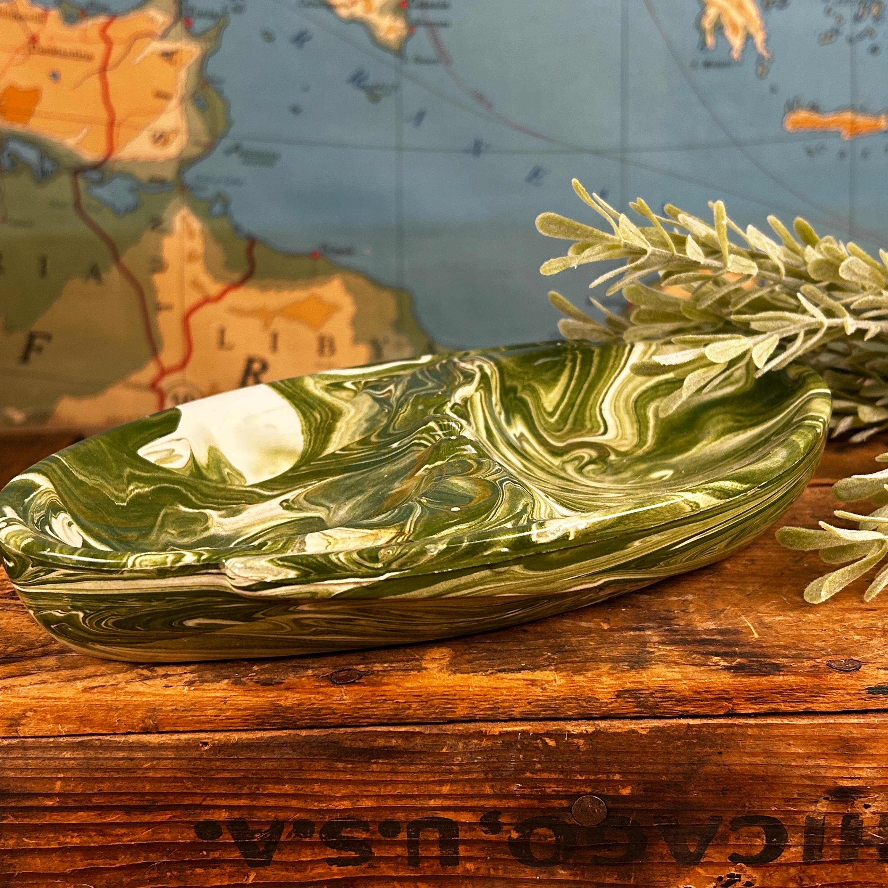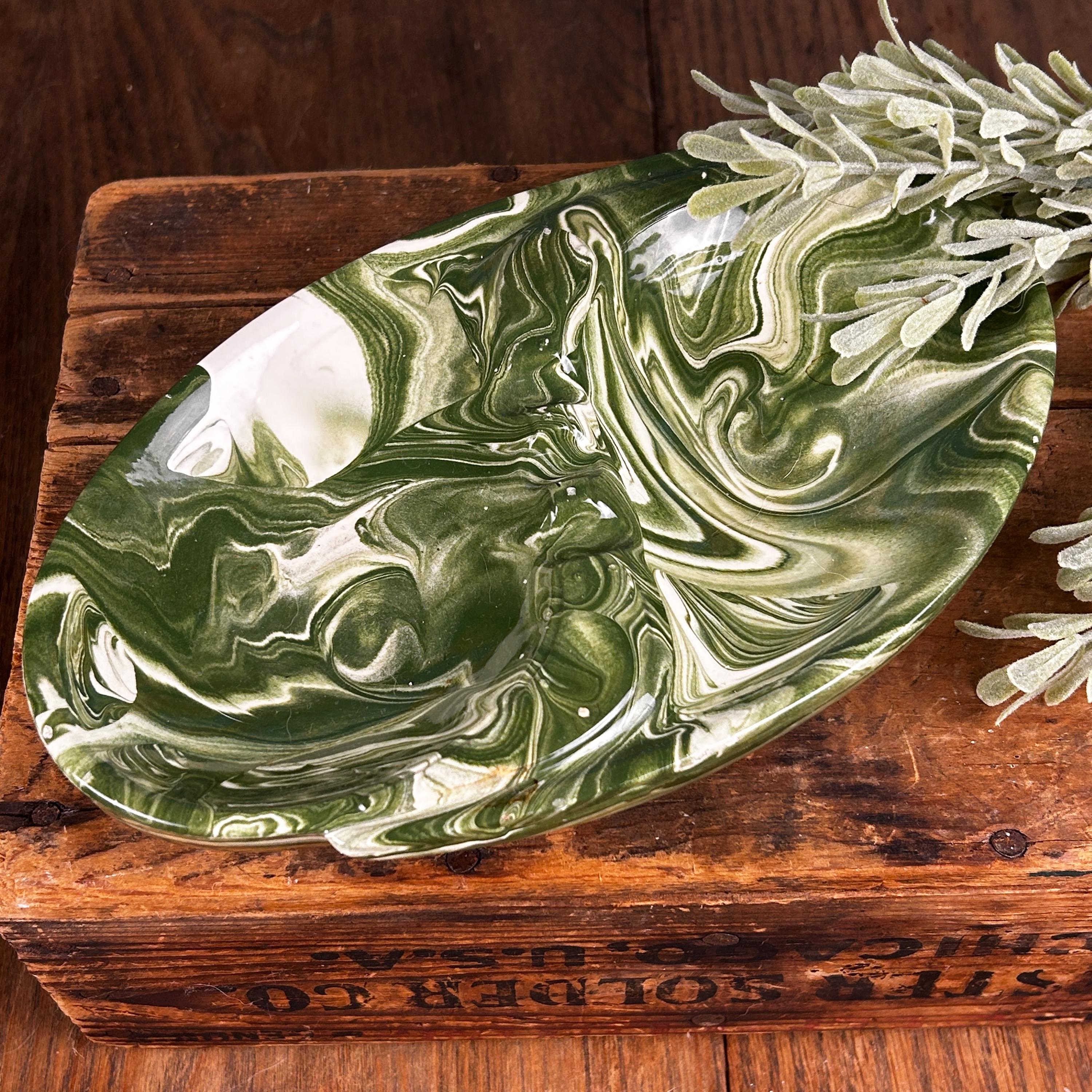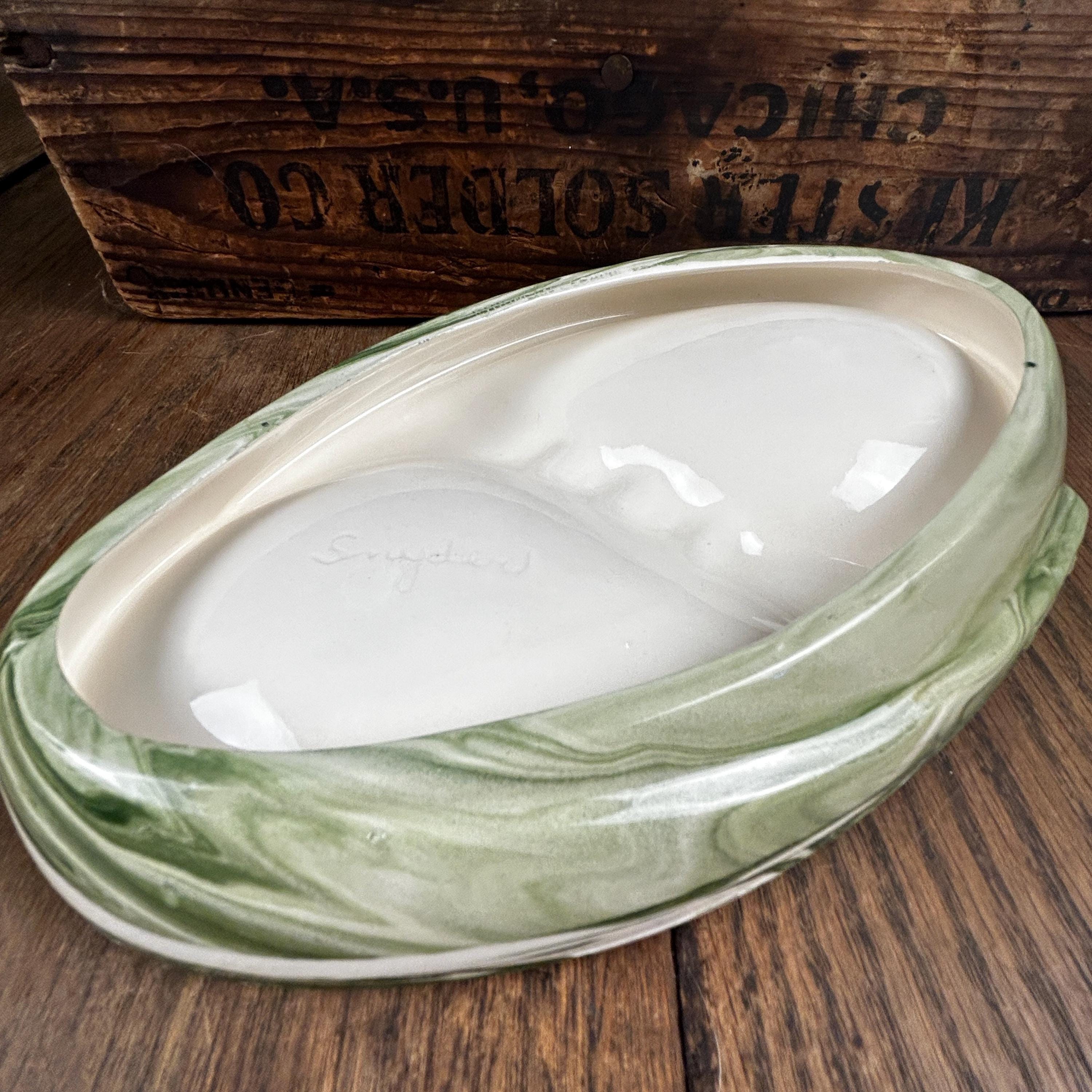 This is such a cool piece in the most fantastic green and white swirls. I believe this piece is studio made as it is signed by the artist "Snyder" on the back. Features two compartments, one on each side, and three places to hold cigars/cigarettes in the middle. A unique shape of oval, almost yin and yang, with areas that protrude near the edges. This piece is in good vintage condition. There is a tin chip on one end that is very tiny and not easily noticeable. There are some raised bumps that are symmetrical on both sides, apparently a part of the overall design.