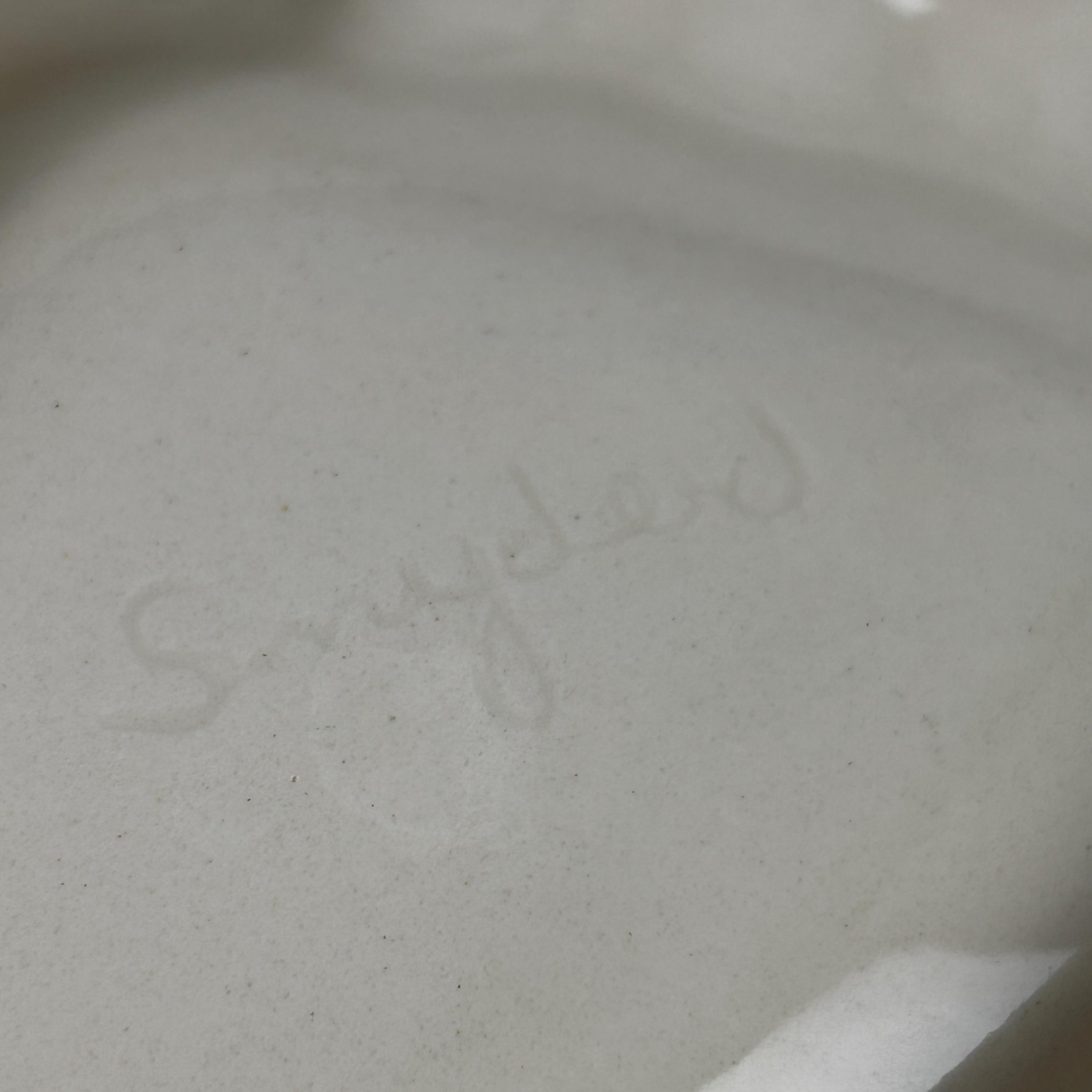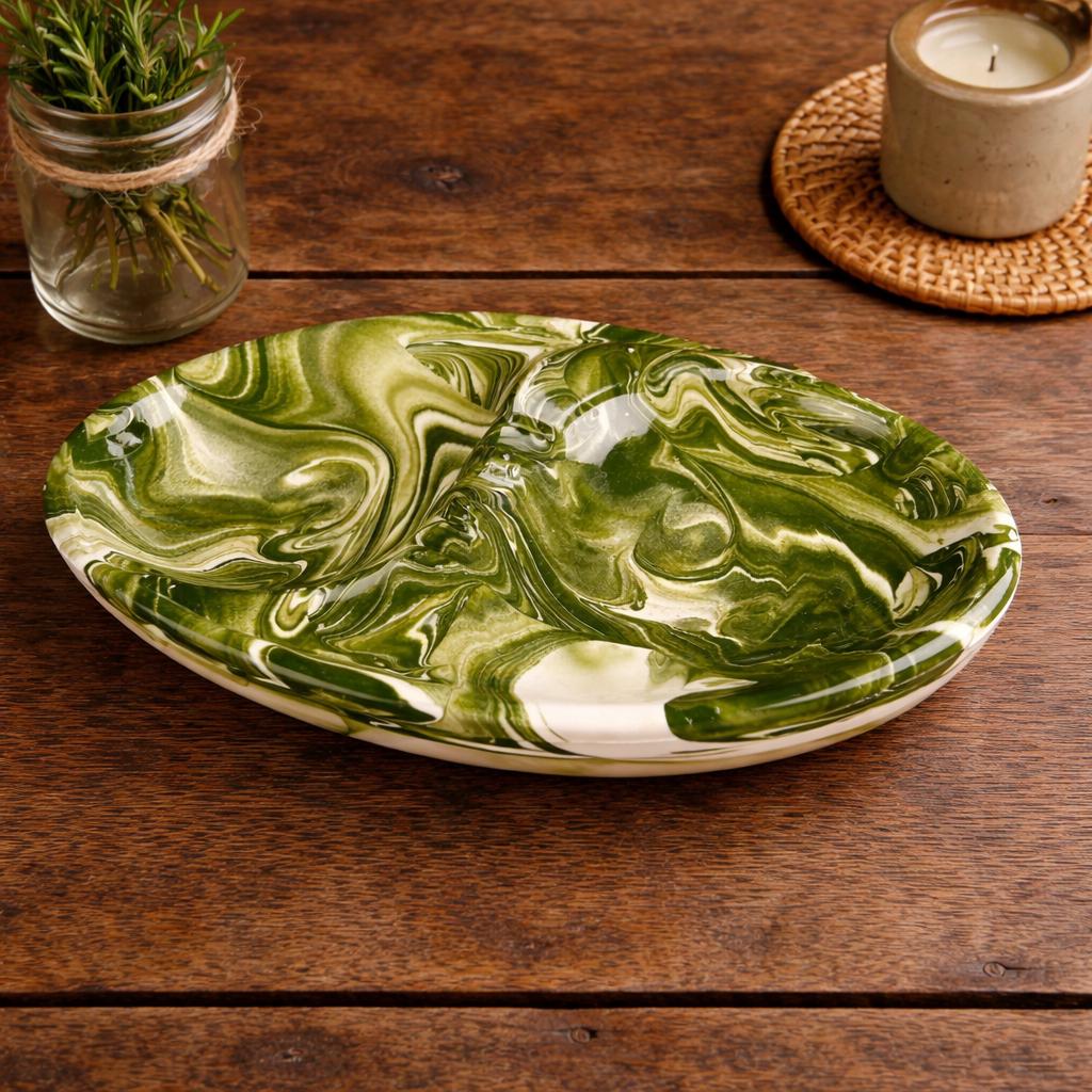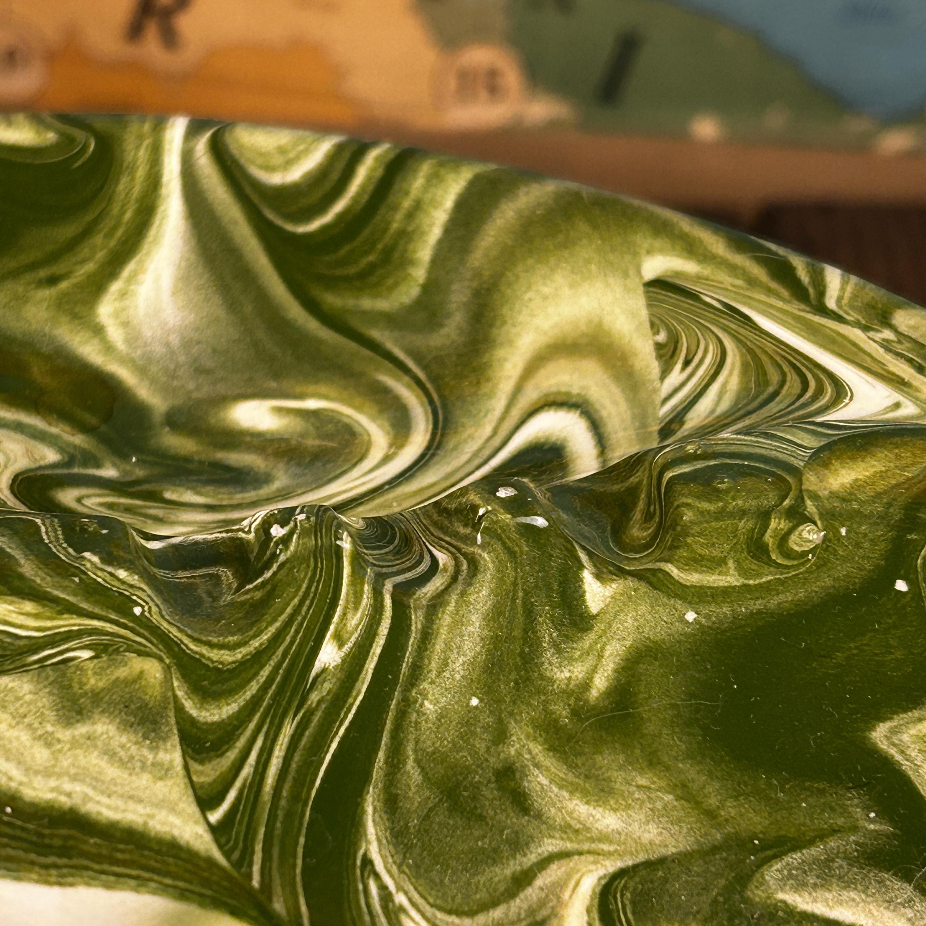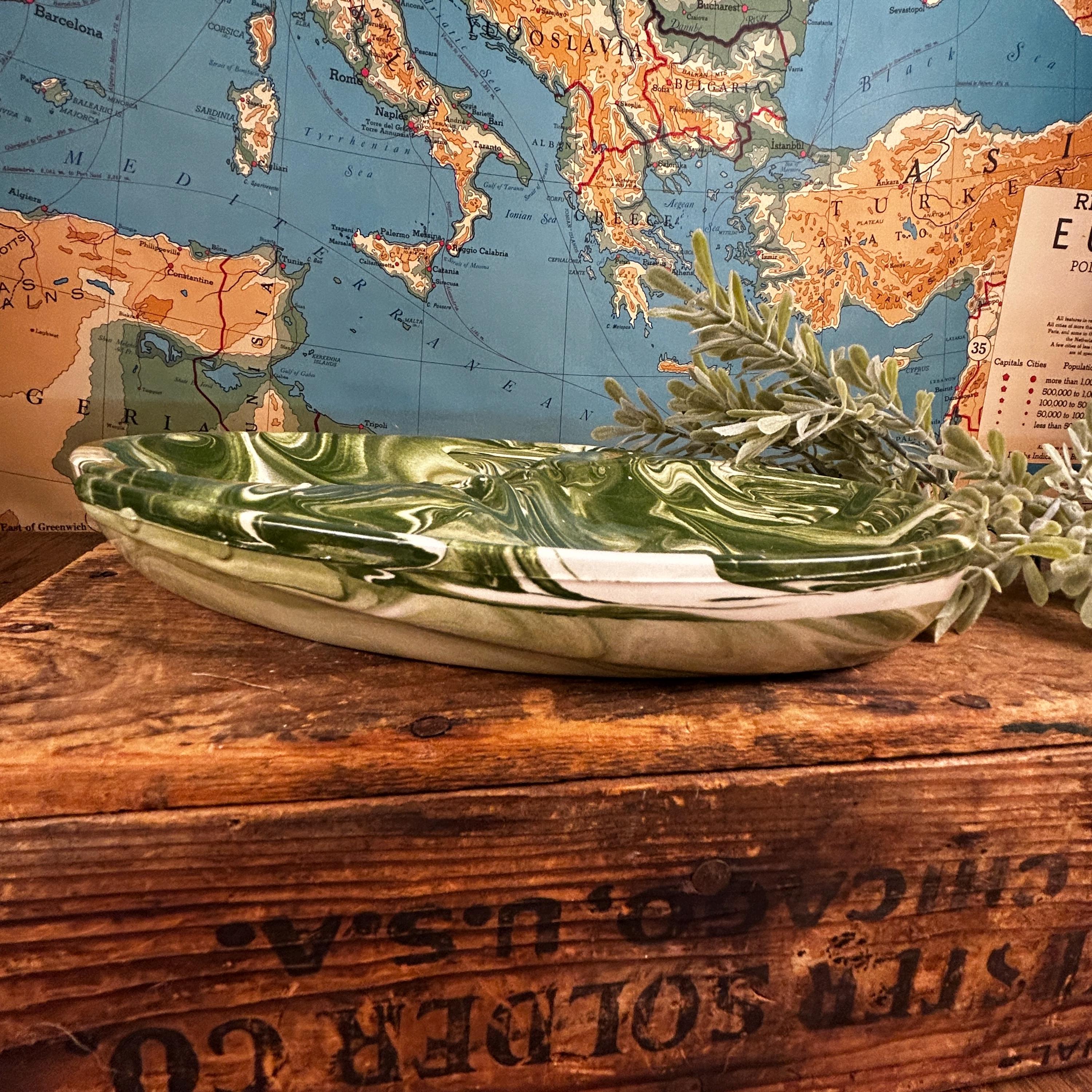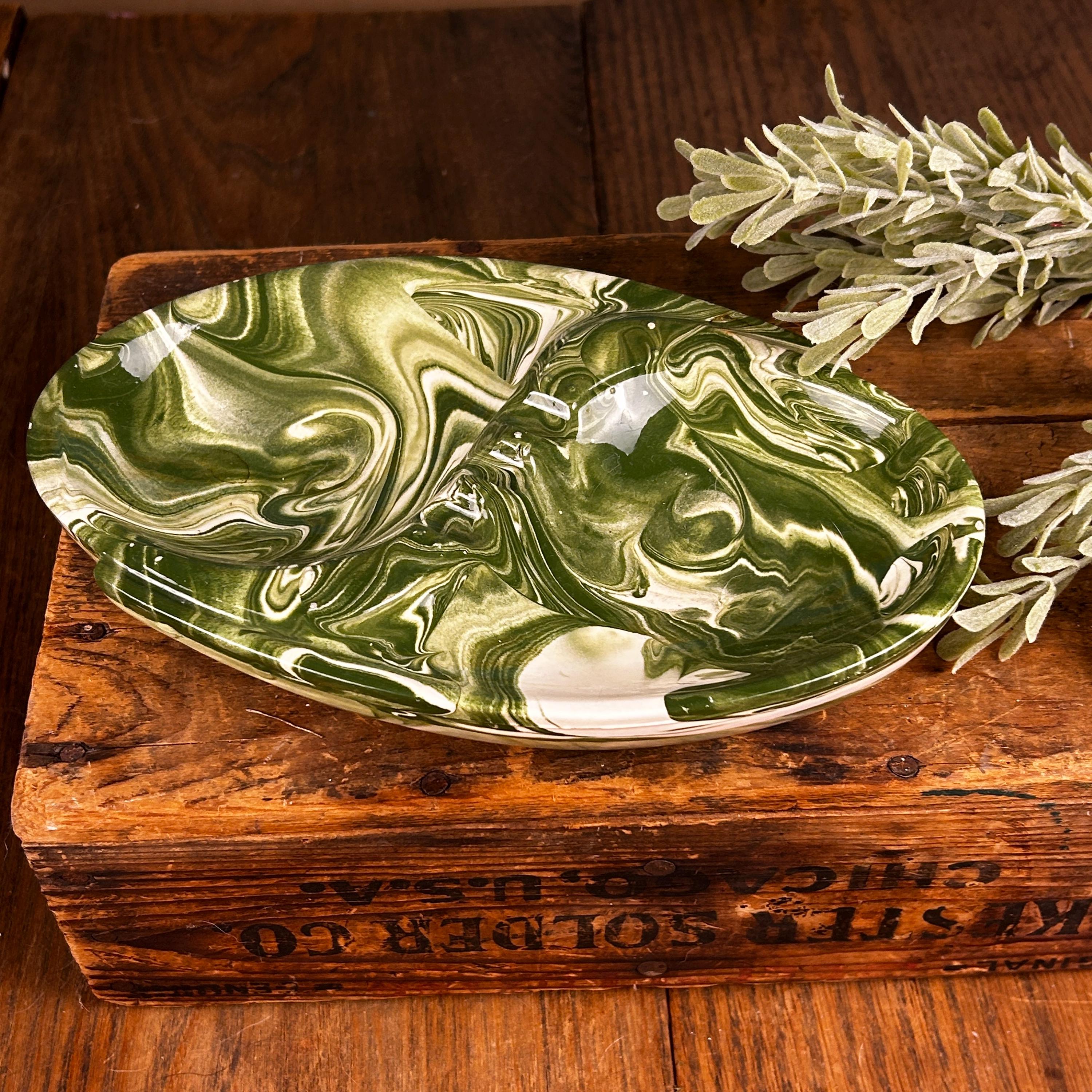 This is such a cool piece in the most fantastic green and white swirls. I believe this piece is studio made as it is signed by the artist "Snyder" on the back. Features two compartments, one on each side, and three places to hold cigars/cigarettes in the middle. A unique shape of oval, almost yin and yang, with areas that protrude near the edges. This piece is in good vintage condition. There is a tin chip on one end that is very tiny and not easily noticeable. There are some raised bumps that are symmetrical on both sides, apparently a part of the overall design.