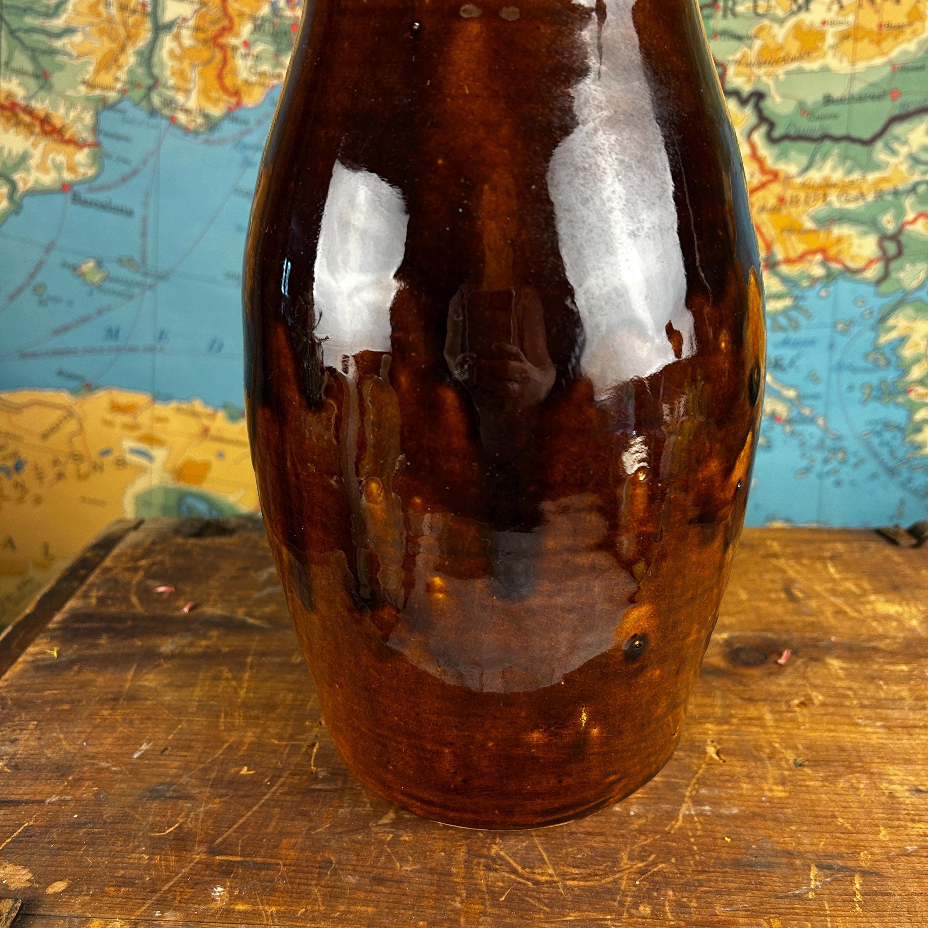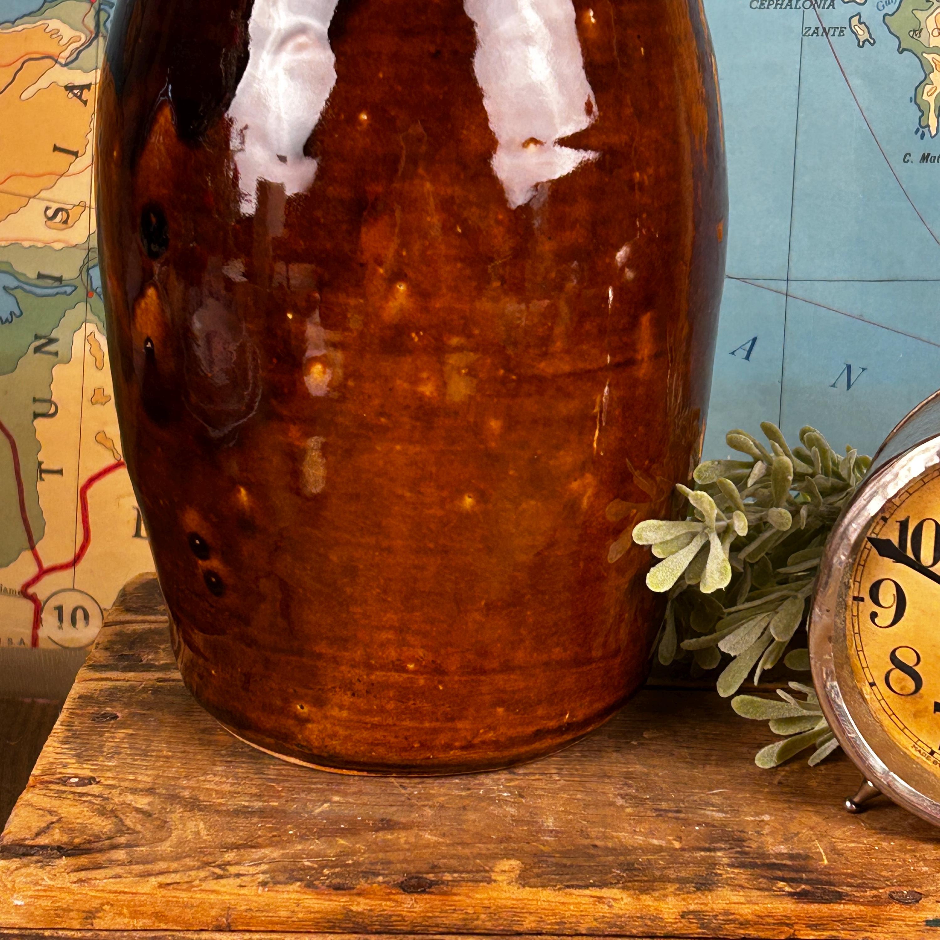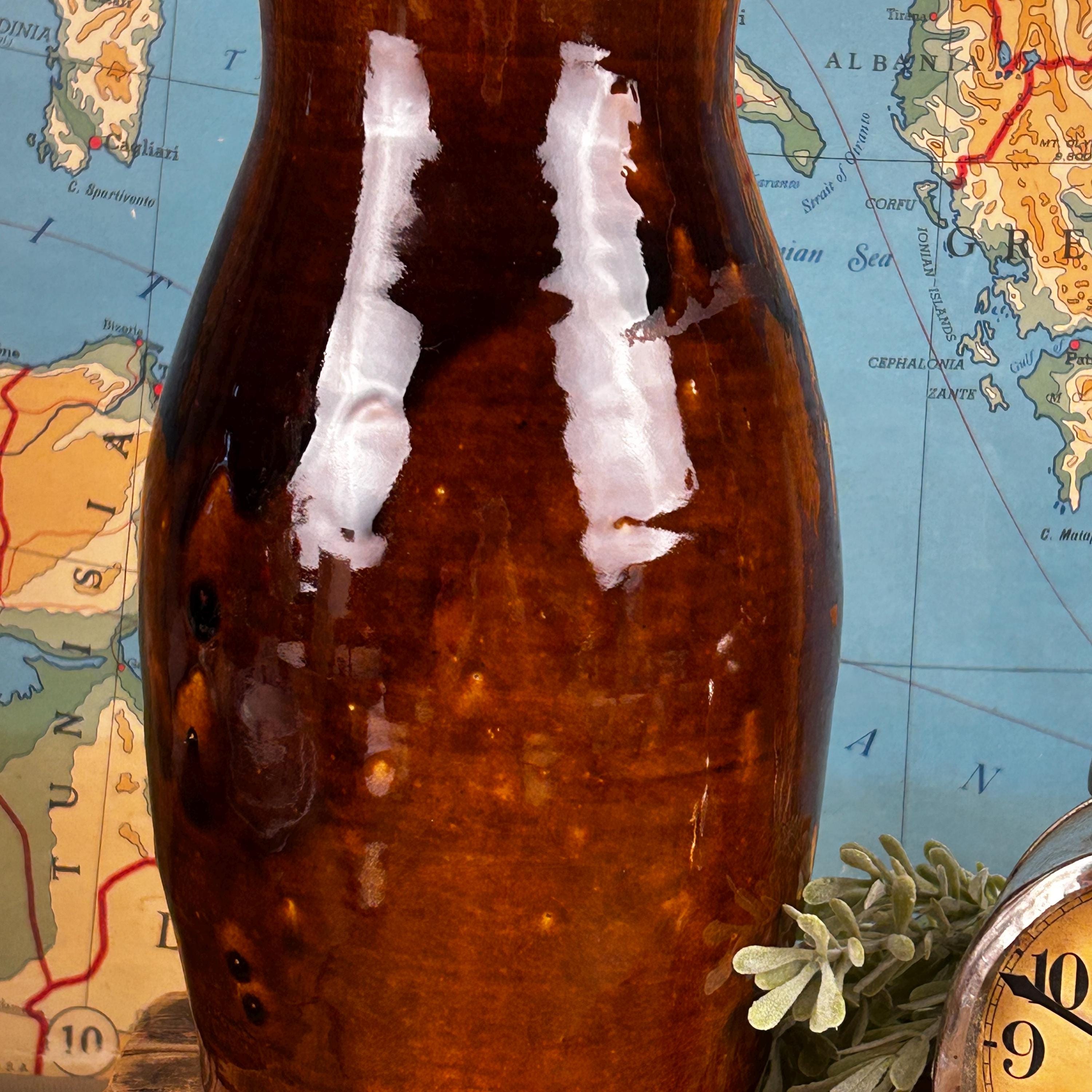 This absolutely beautiful studio made brown drip glaze tall vase was handmade at Brown's Pottery in Arden, North Carolina. This is in the Blue Ridge area of the state. Several artists craft at Brown's Pottery, including pottery, hand-built creations and more. The artist that made this piece is unknown, they are many crafters at Brown's Pottery. According to the Blue Ridge National Heritage Area, Brown's Pottery can only be bought at the Arden location.