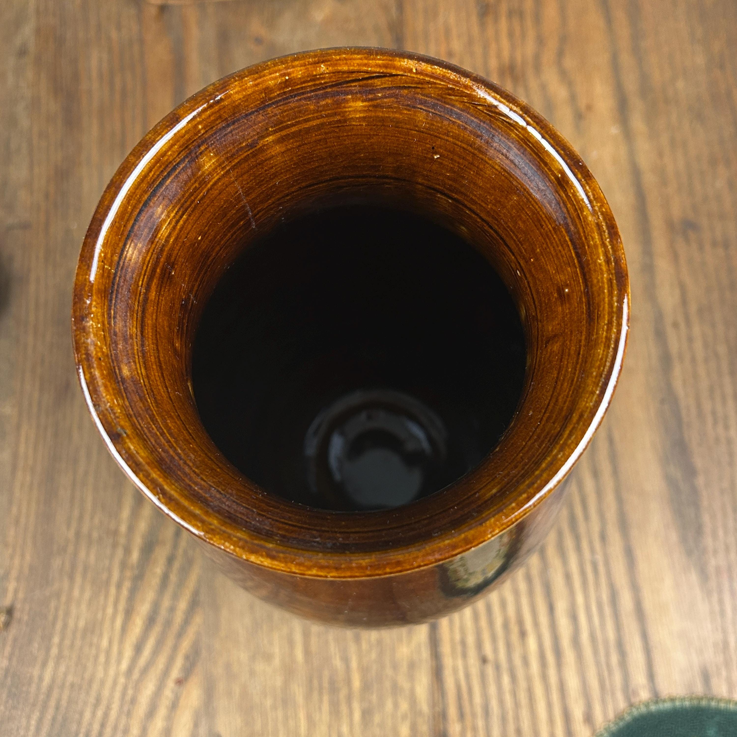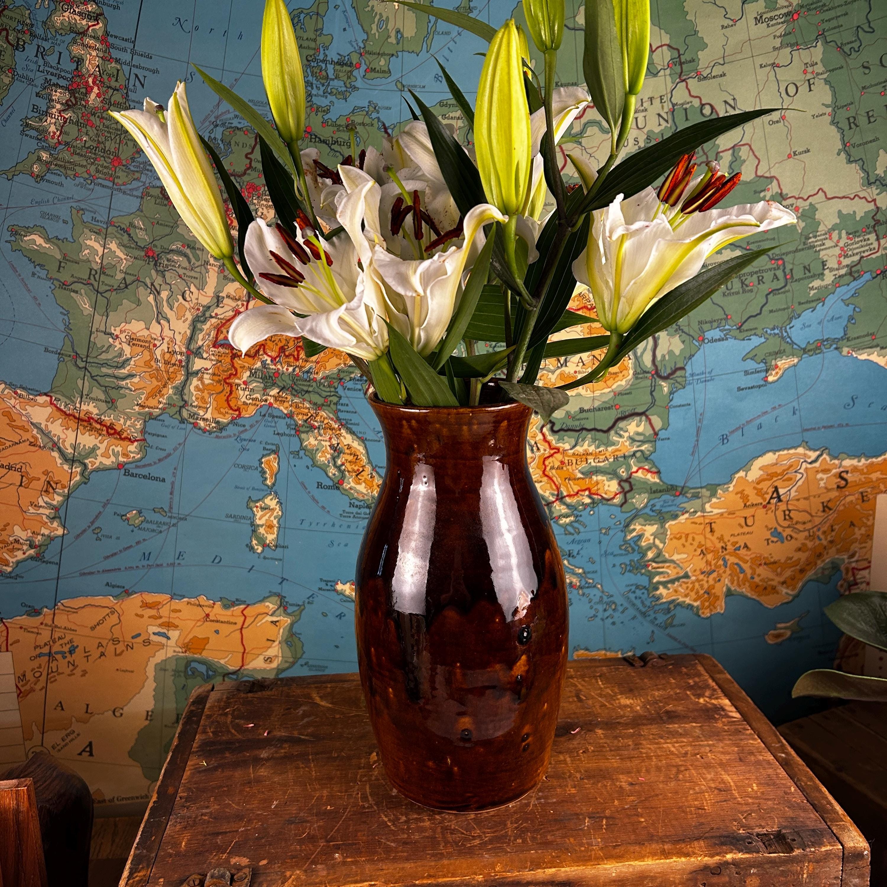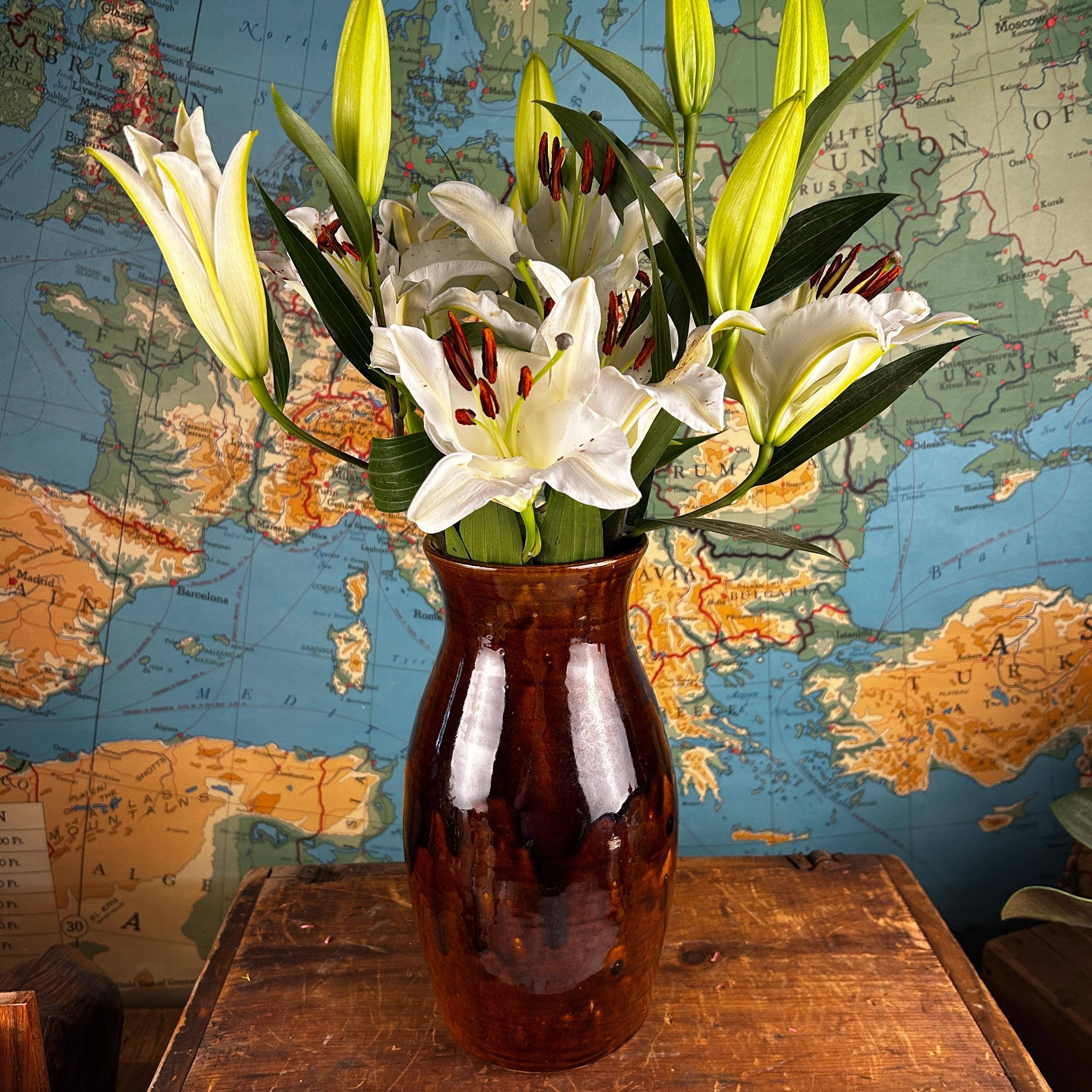 This absolutely beautiful studio made brown drip glaze tall vase was handmade at Brown's Pottery in Arden, North Carolina. This is in the Blue Ridge area of the state. Several artists craft at Brown's Pottery, including pottery, hand-built creations and more. The artist that made this piece is unknown, they are many crafters at Brown's Pottery. According to the Blue Ridge National Heritage Area, Brown's Pottery can only be bought at the Arden location.
