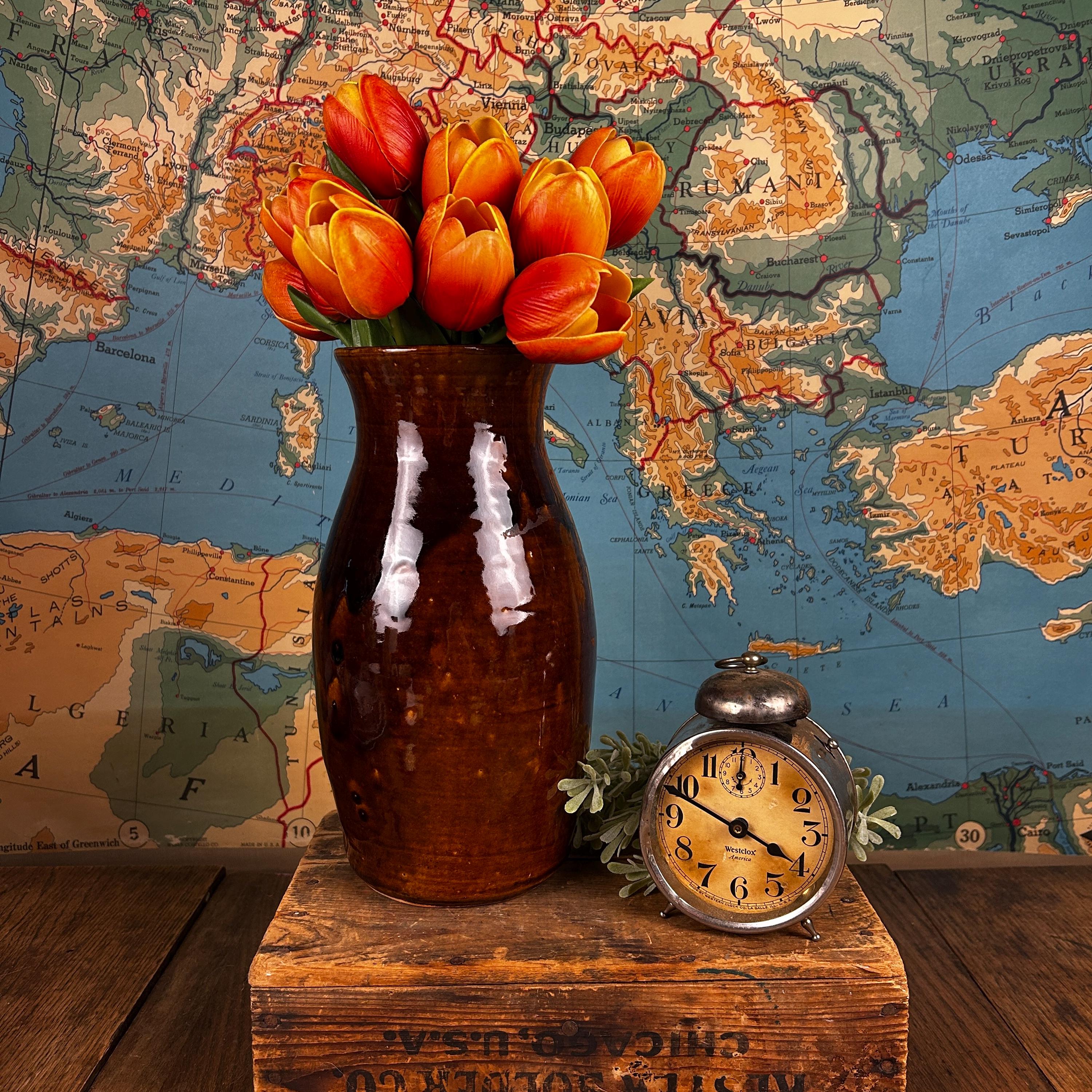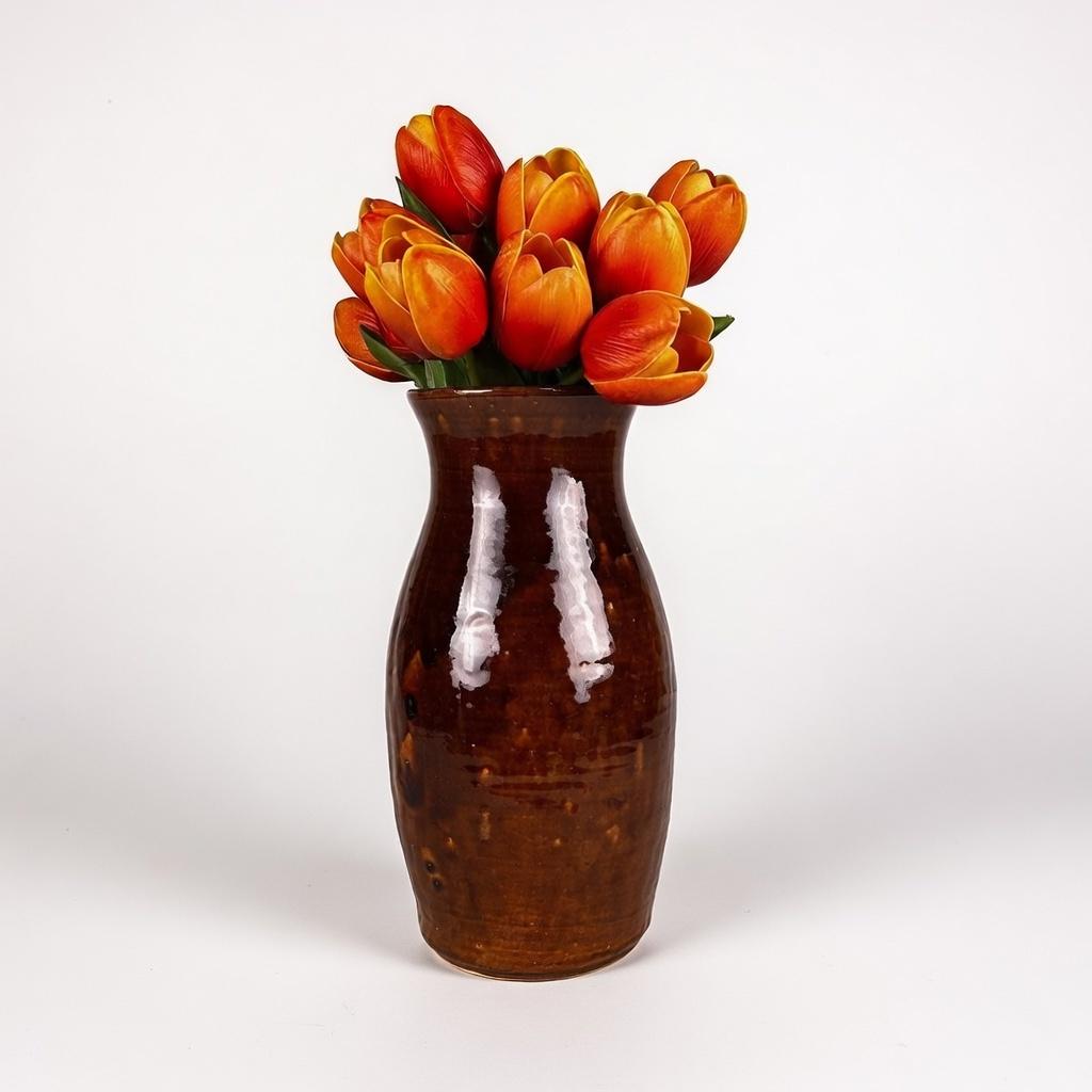 The dark and mid browns are beautiful on this piece and it is in impeccable condition. No chips, cracks, or crazing. The vessel measures 11 1/2" tall and the diameter at the mouth is 4 1/2". Beautiful with or without flowers, this piece will make a statement in your home.