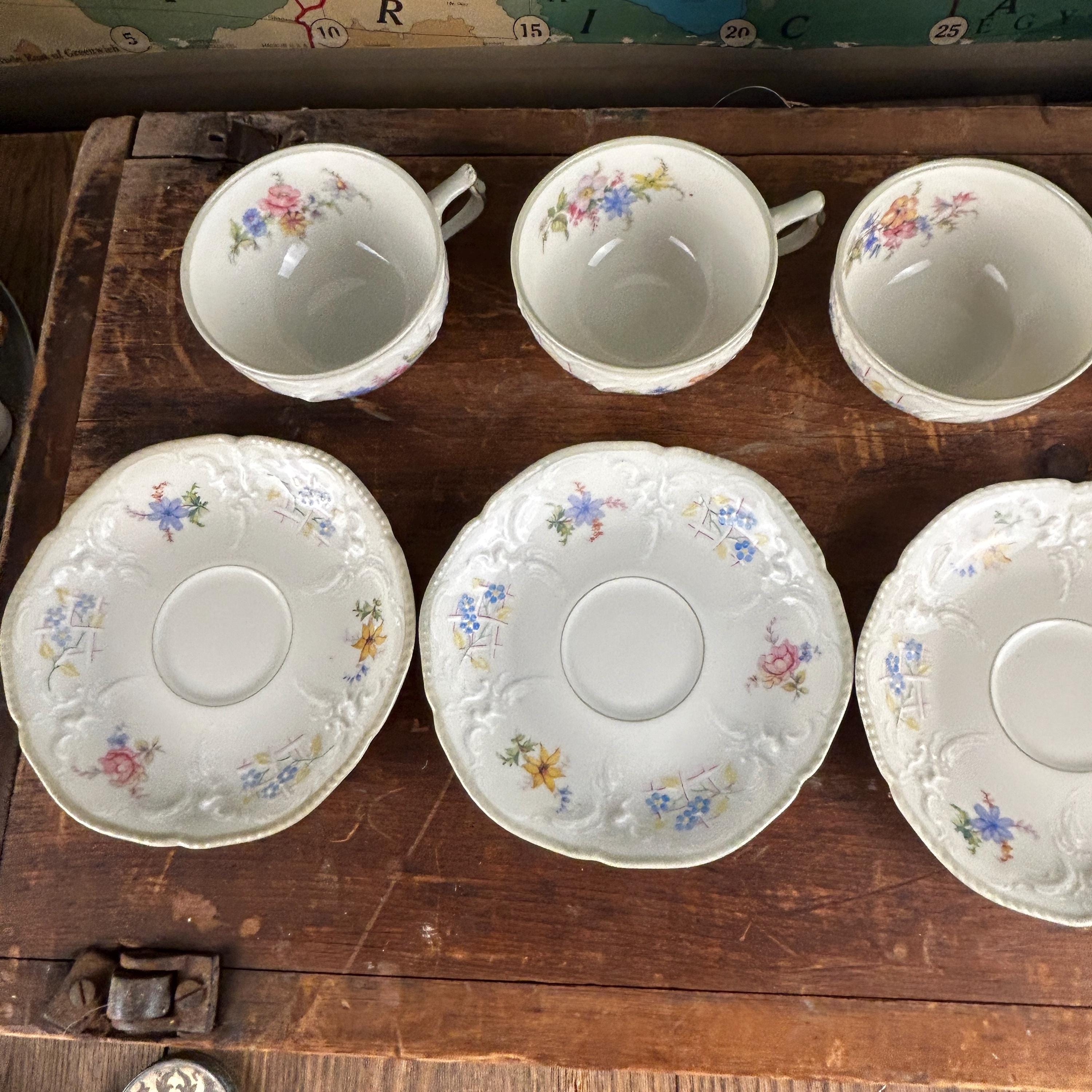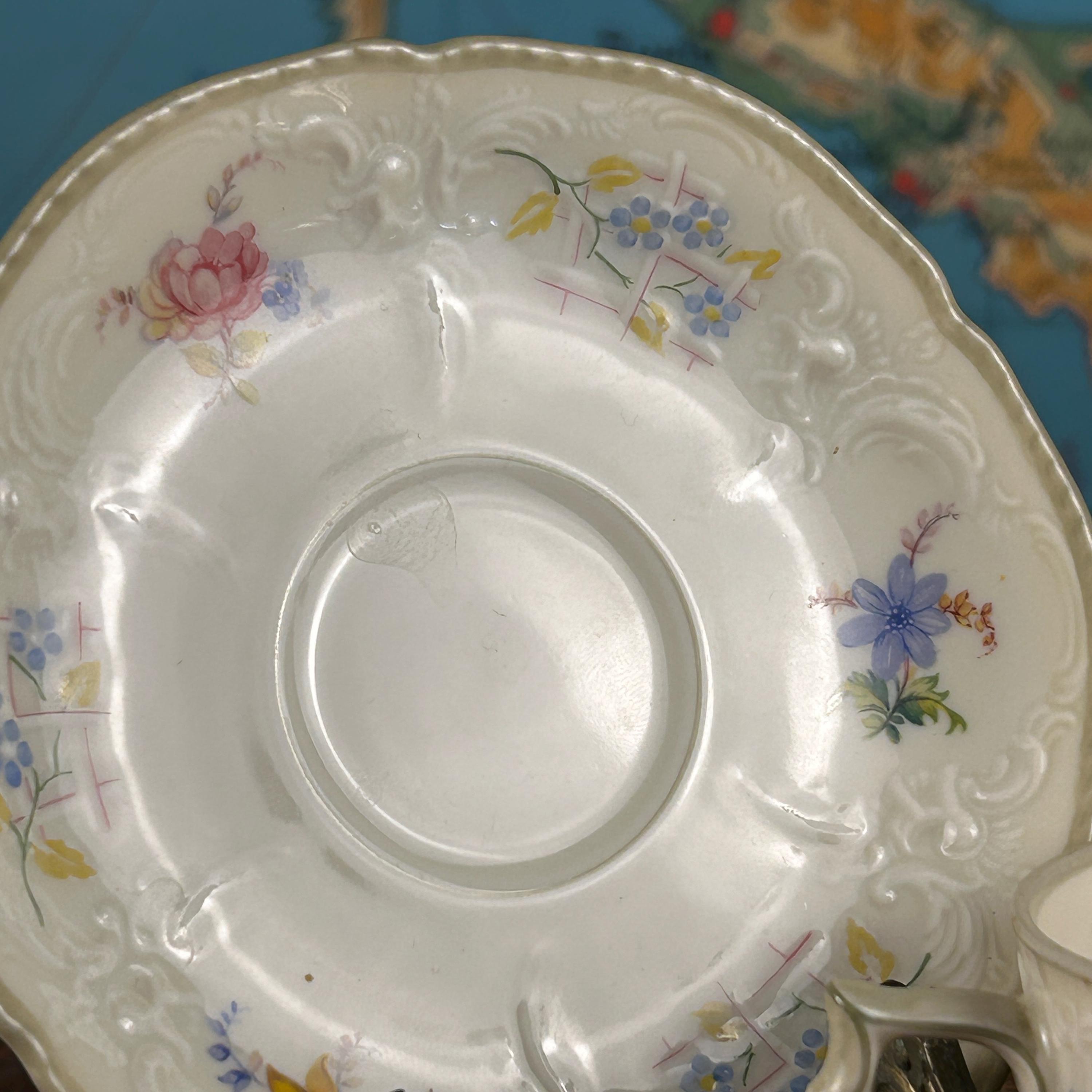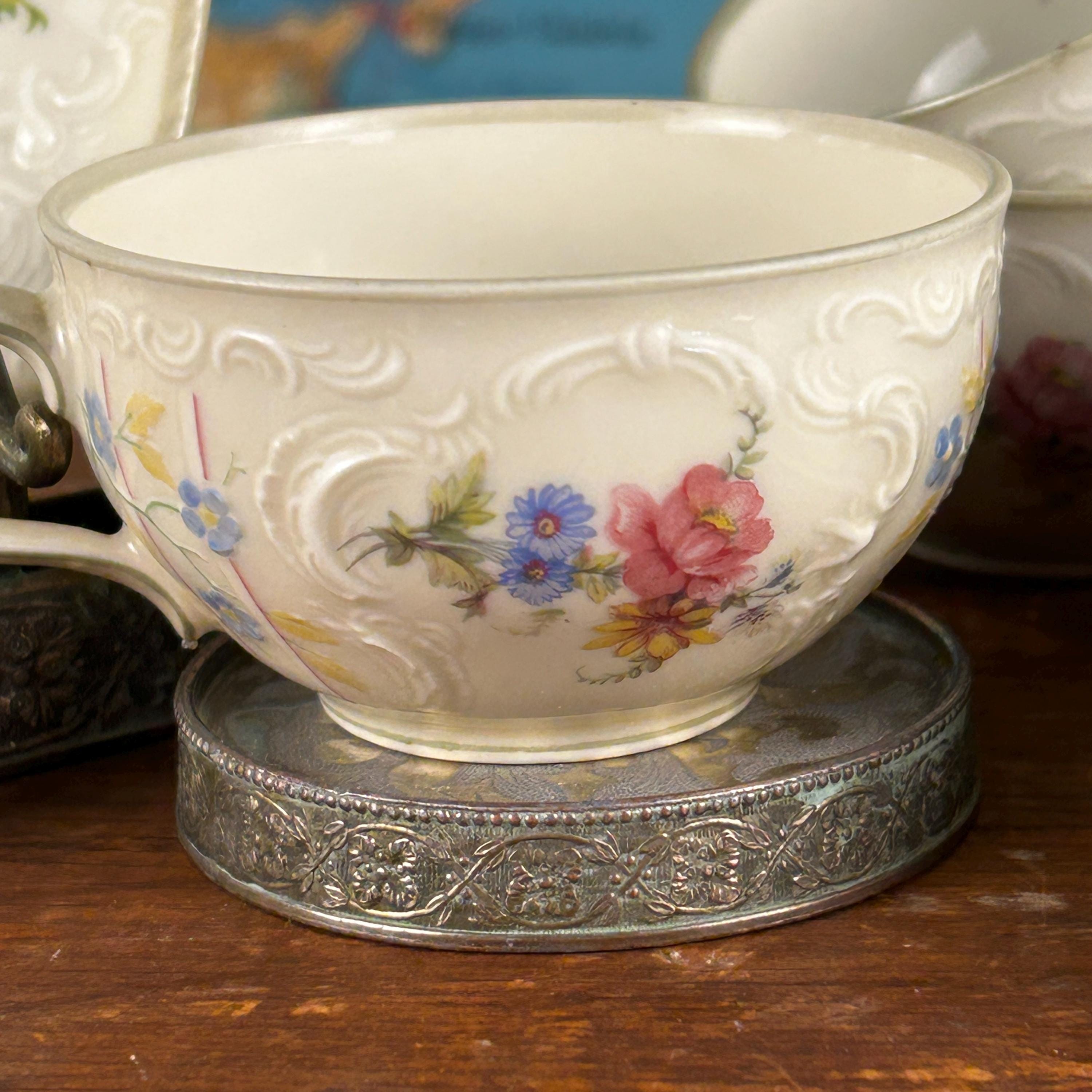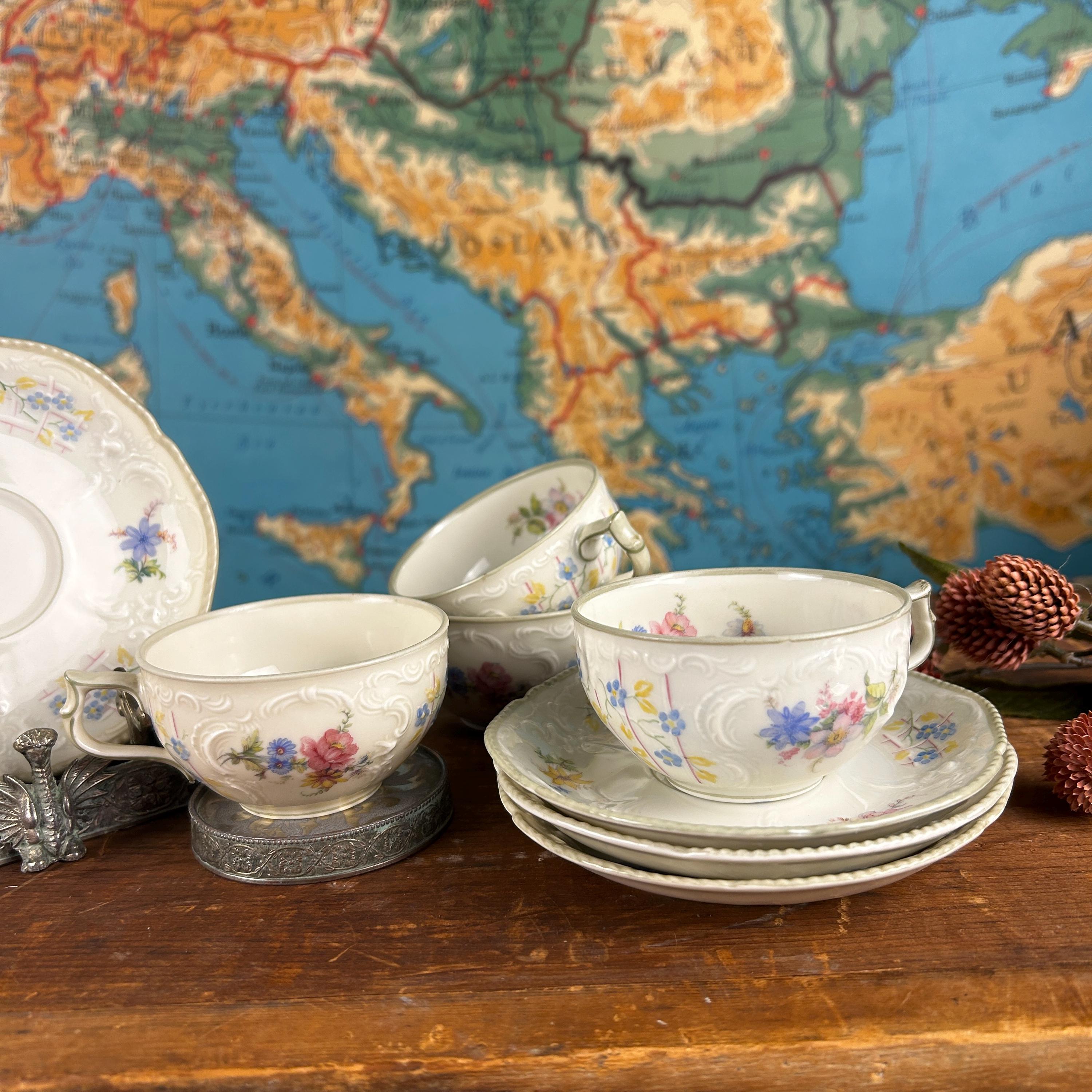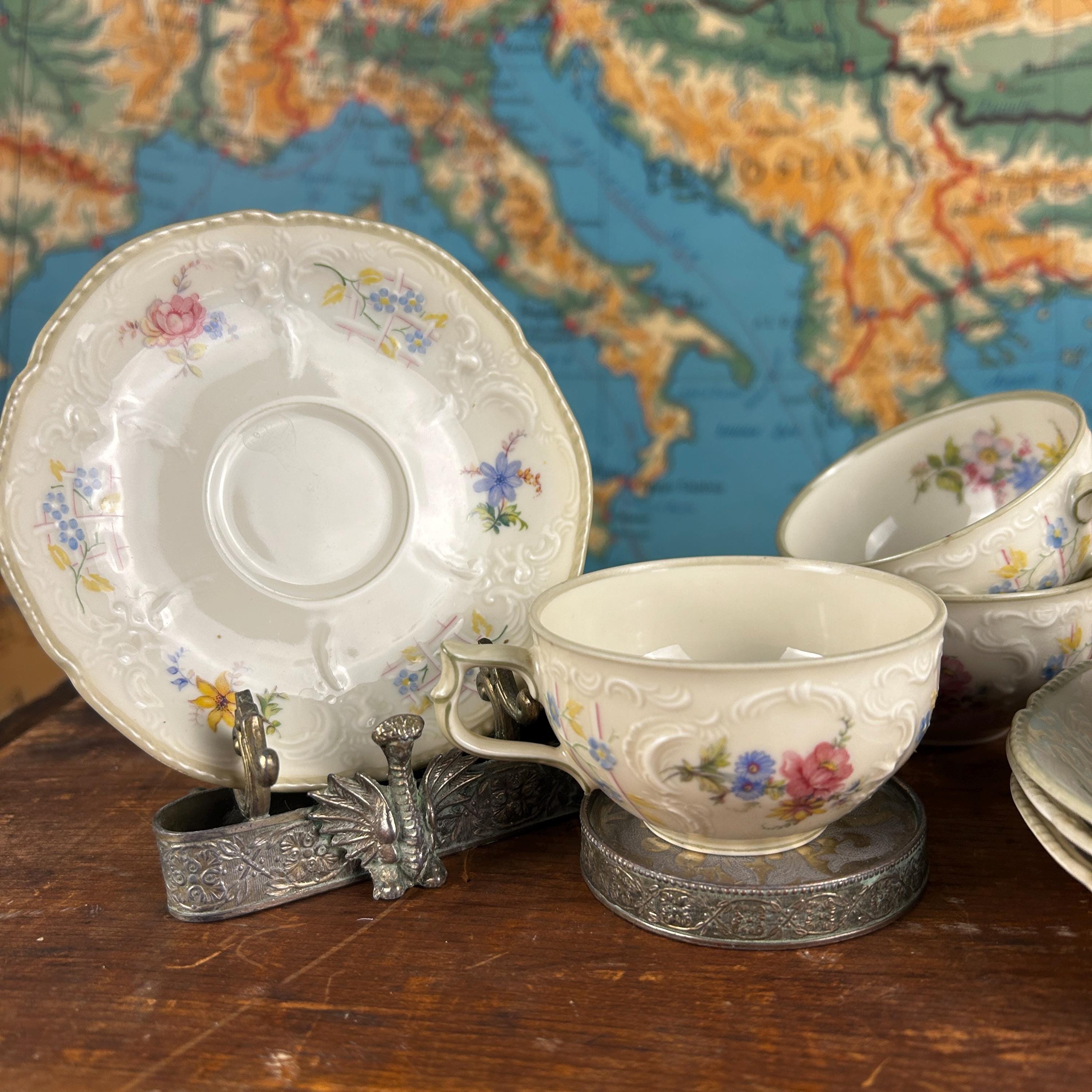 These beautiful little cups and saucers are delicate and detailed in both color and texture. With pinks, yellow, blues, and and greens, these will impress you with their craftsmanship. There are embossed details on both the cups and the saucers. Both are trimmed in the lightest of greens. The plates have tiny little dots that circle the ornate edges. Flowers are on all sides of the cups with a beautiful bouquet of flowers on the inside of the cups as well. Please zoom in on photos so that you may appreciate the details on these pieces.