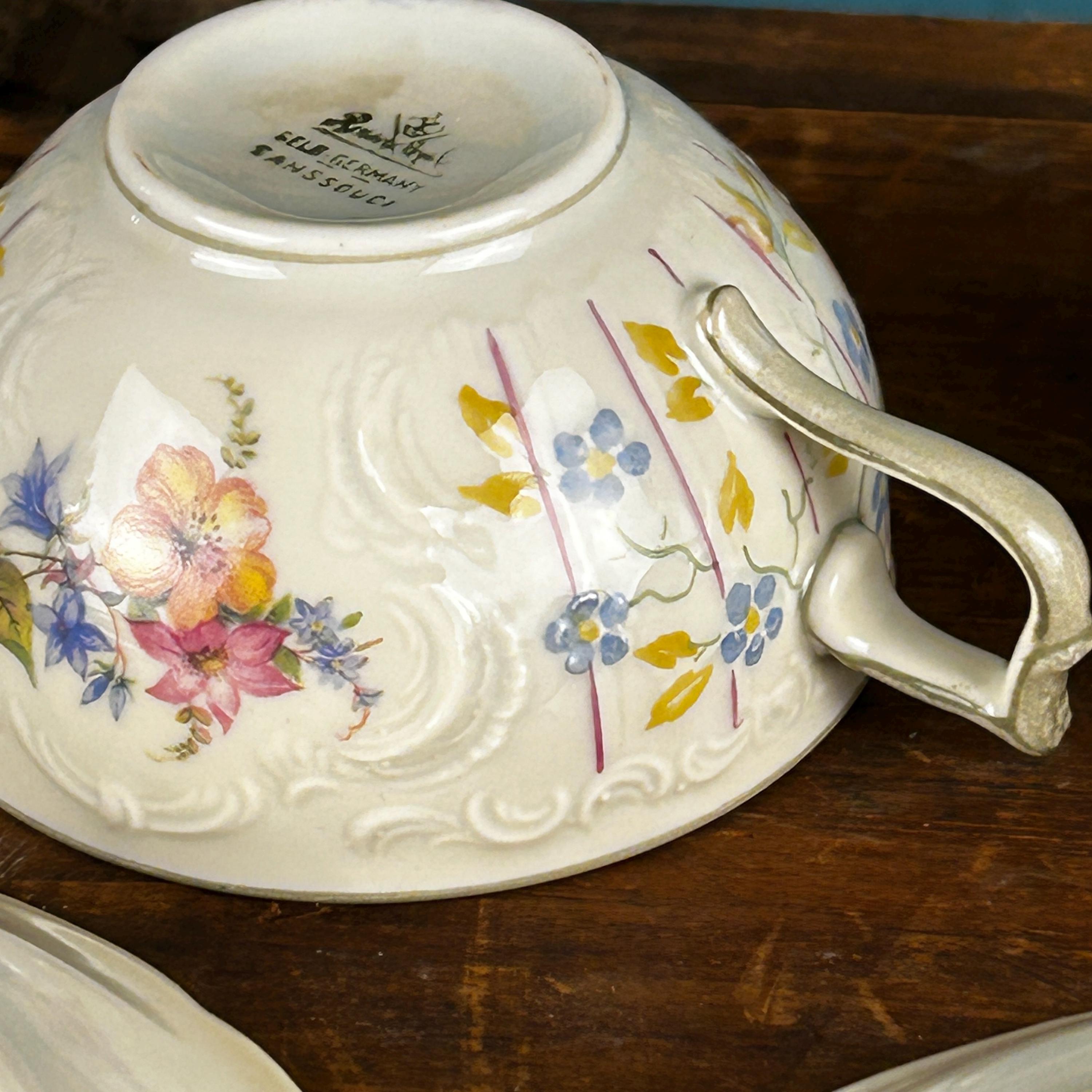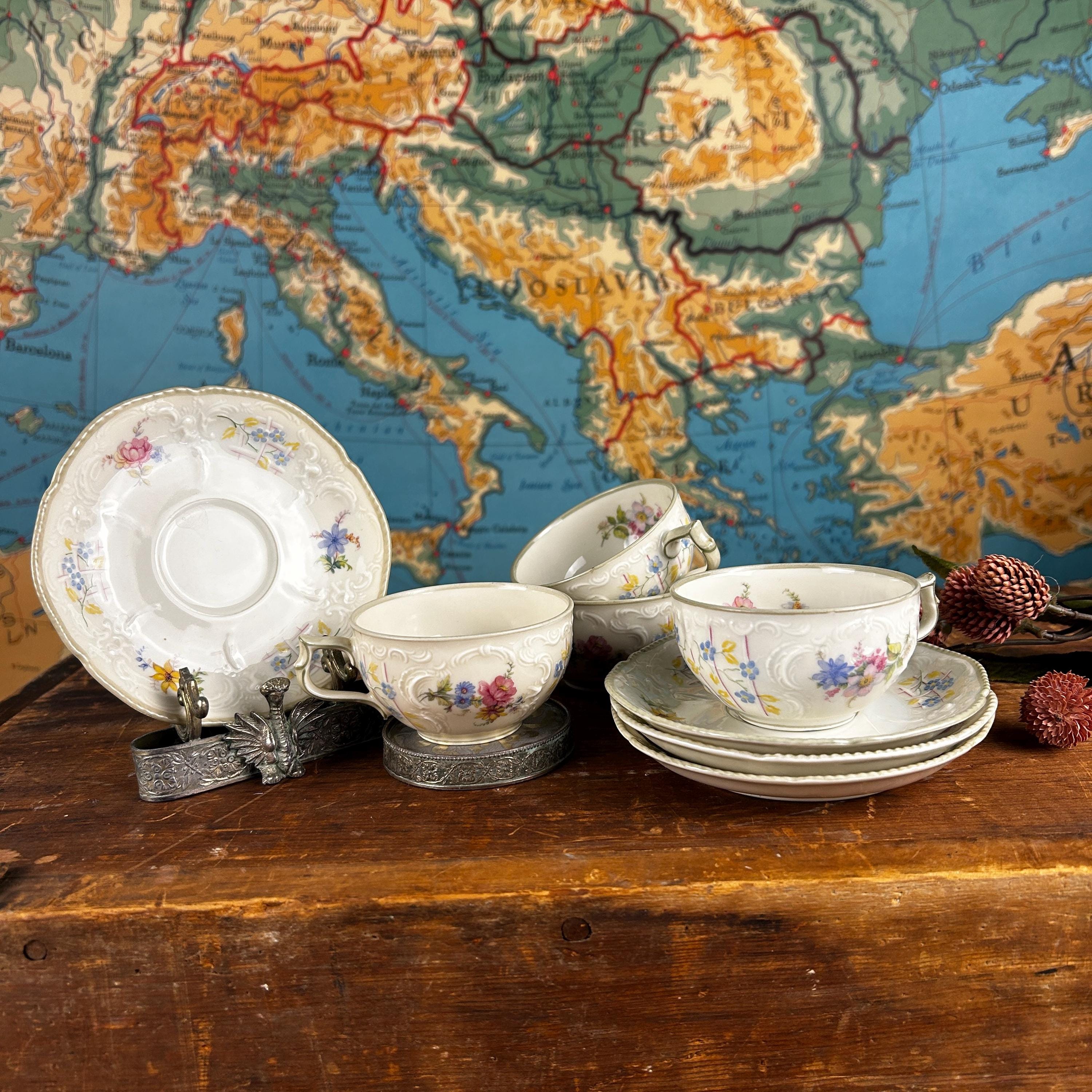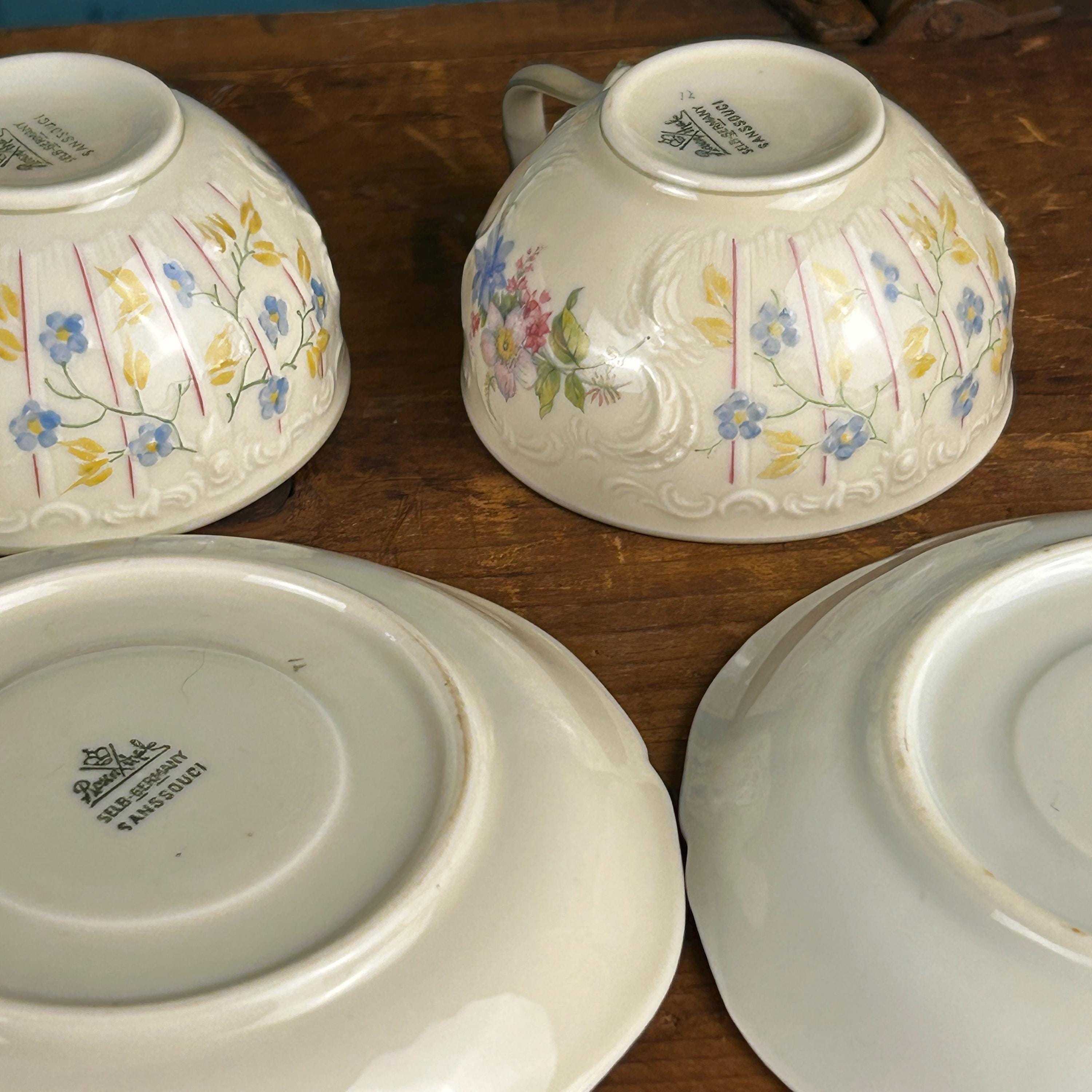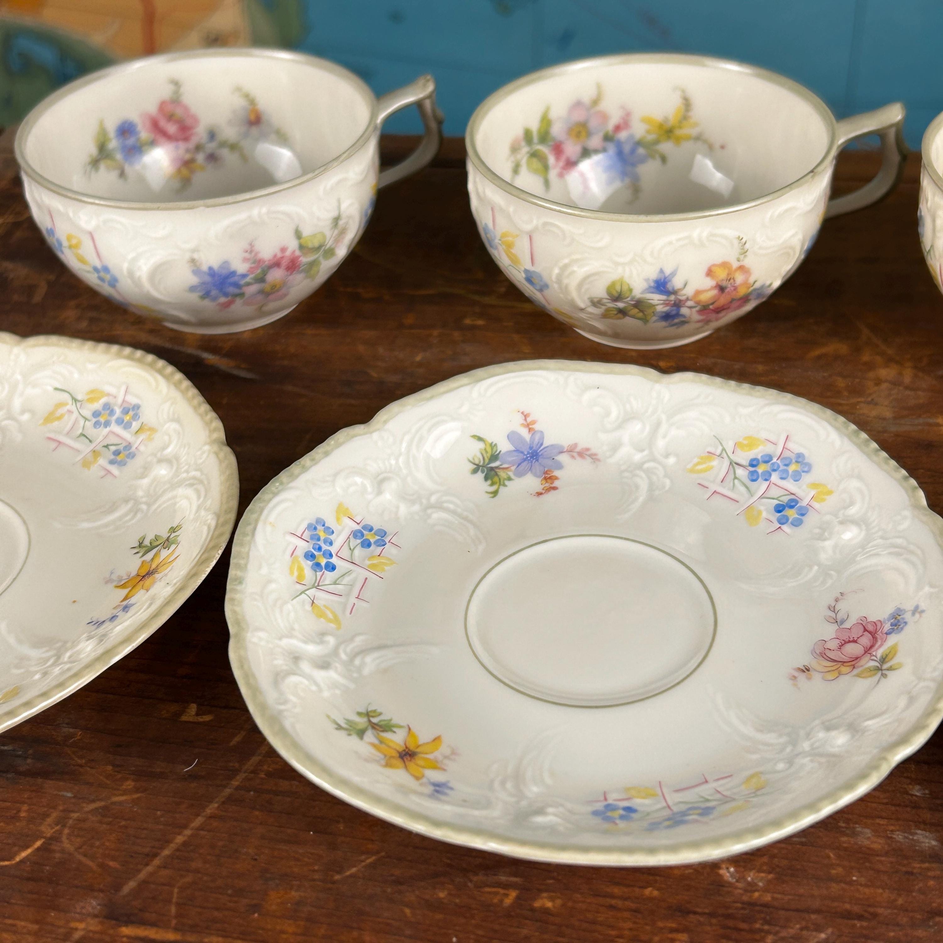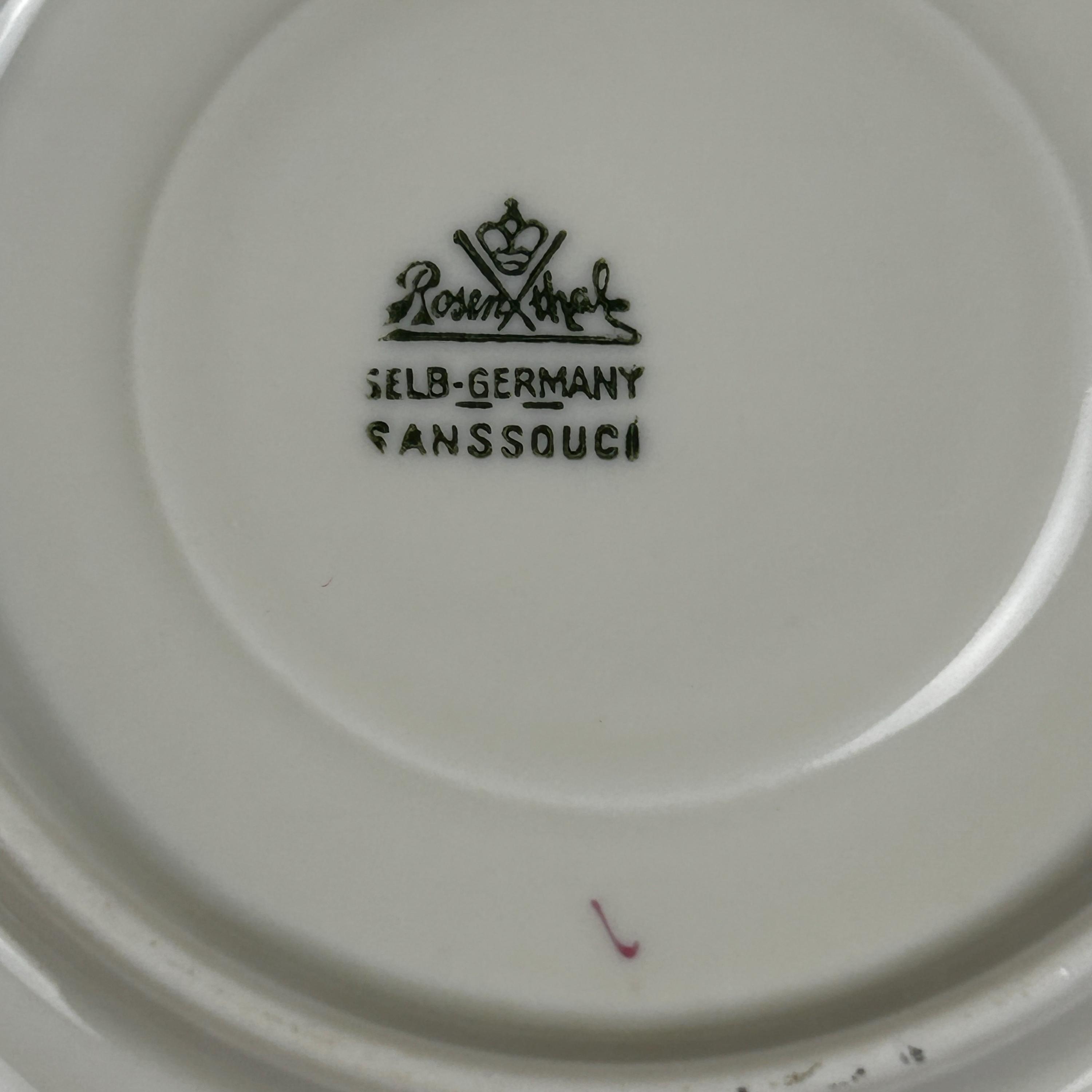 The cups and saucers were made by Rosenthal in Germany and have stamped makers' marks on the bottom.