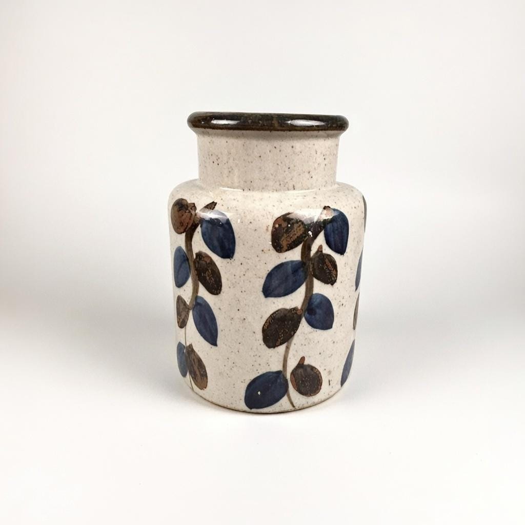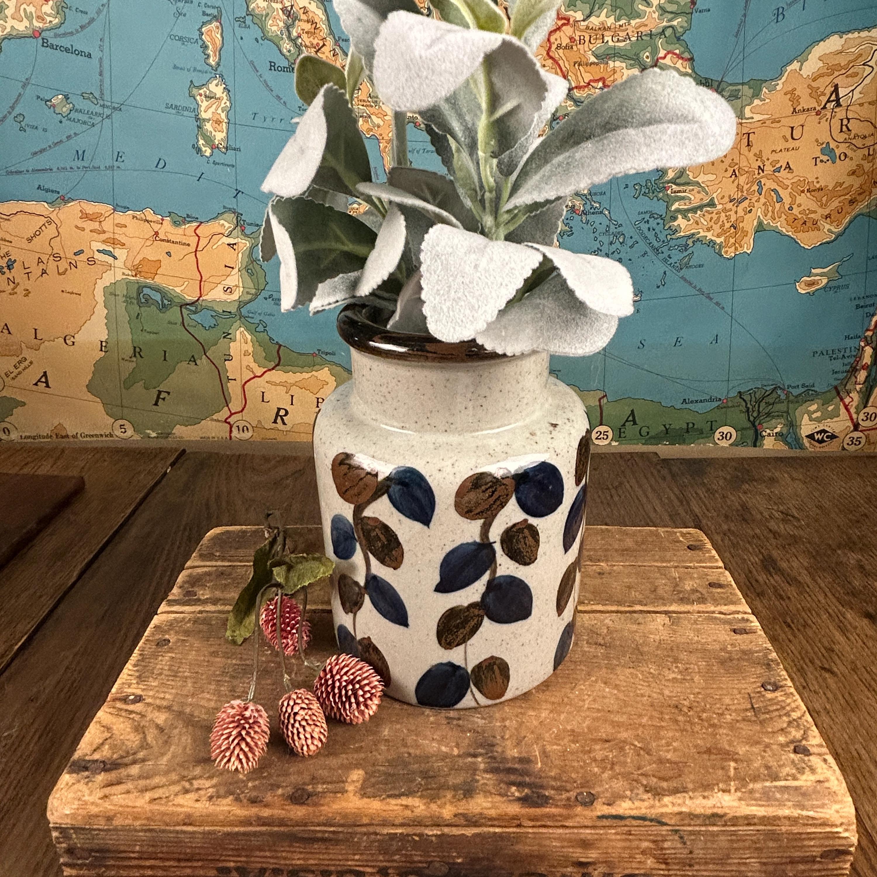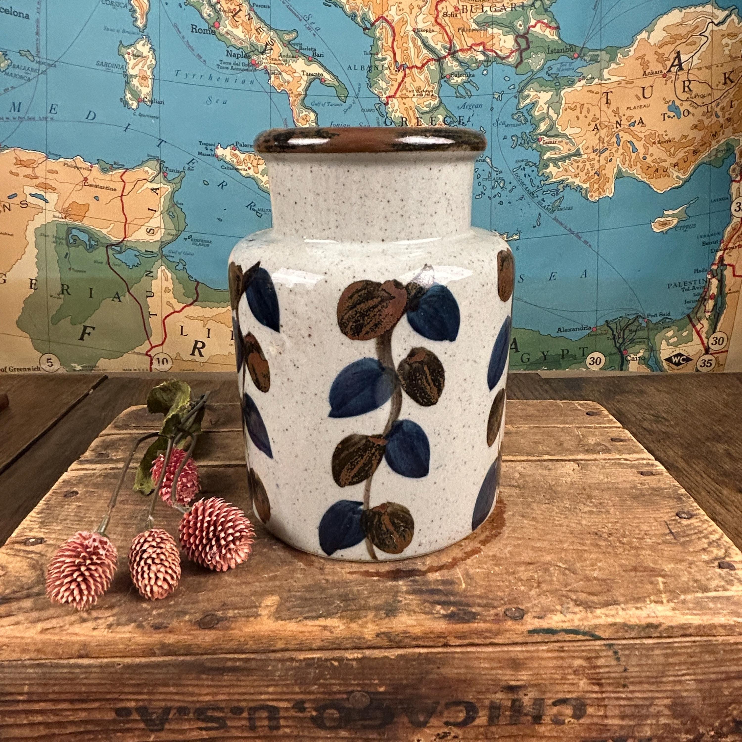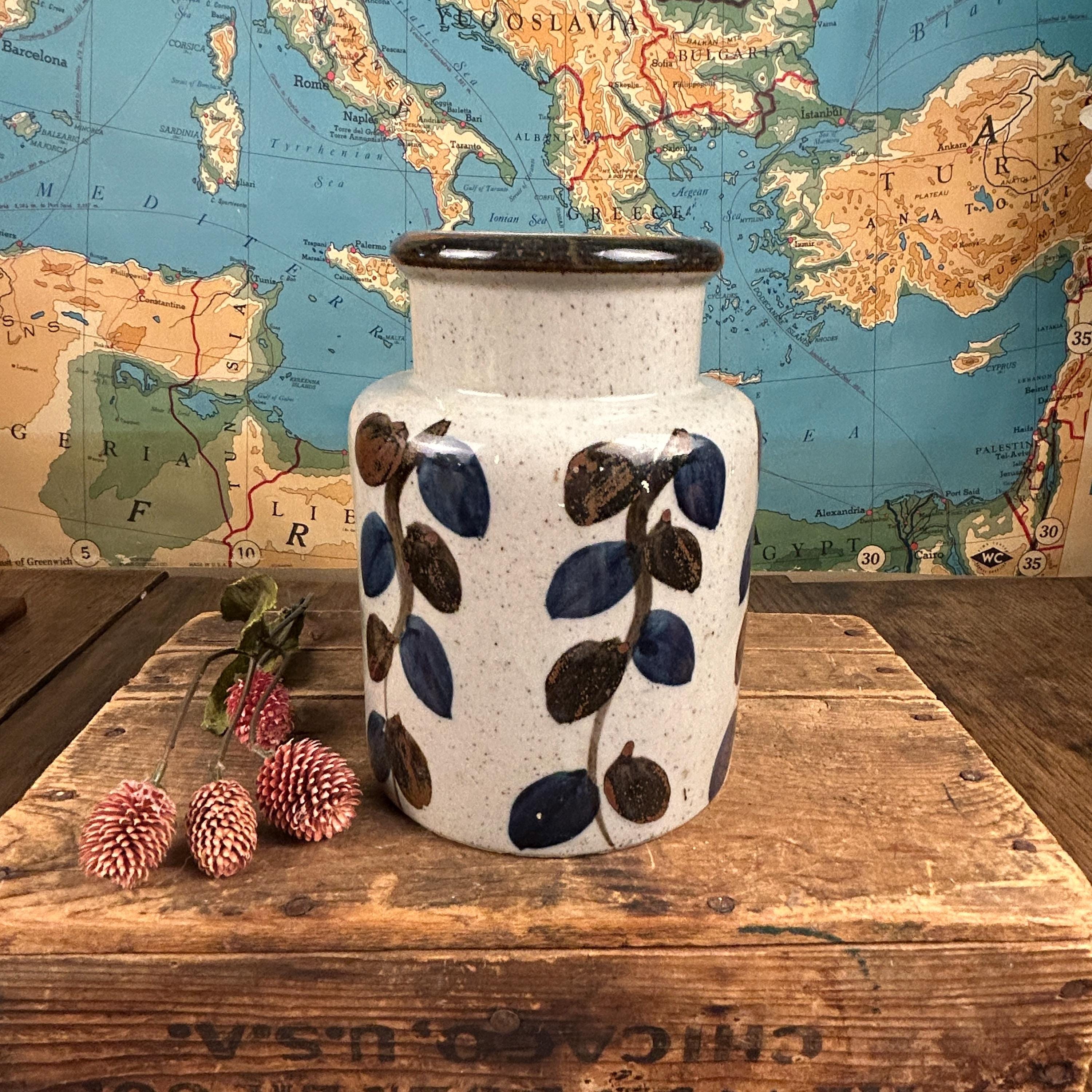 Stunning vintage stoneware vase by Ardco Fine Quality with a leaf/vine design all over. Handmade and hand-painted in Japan. The bottom still has felt covering. In great pre-loved vintage condition, no chips or cracks or crazing. Very clean. Please see all photos as they are part of the description.