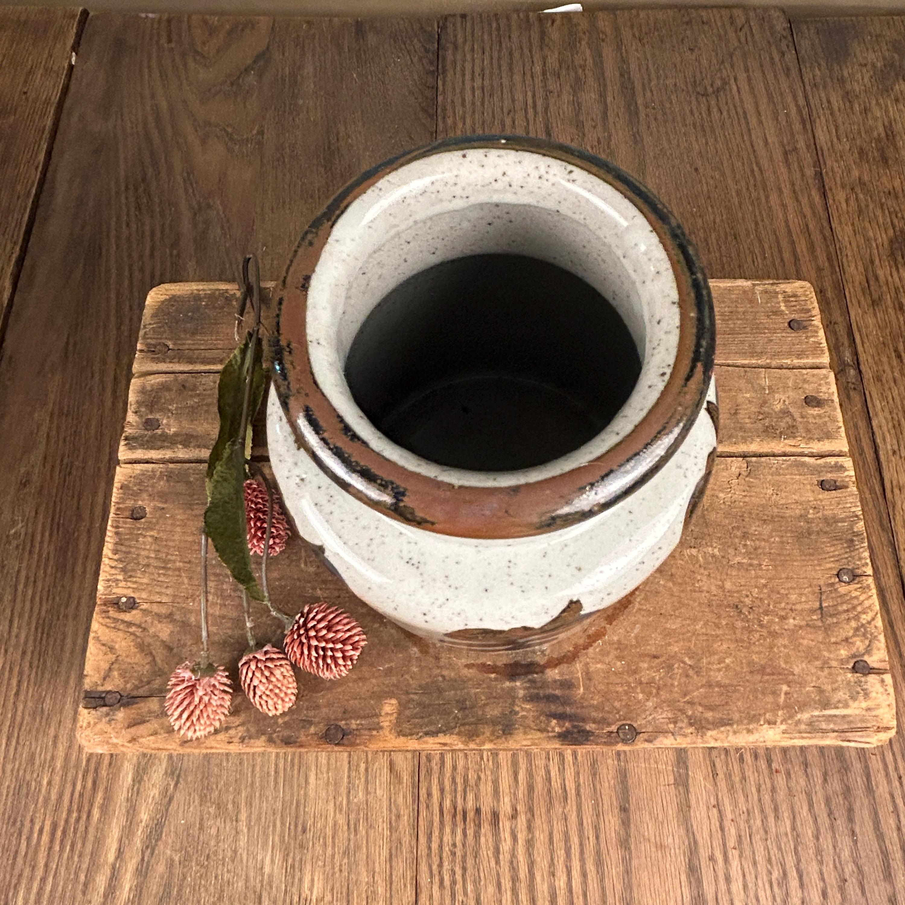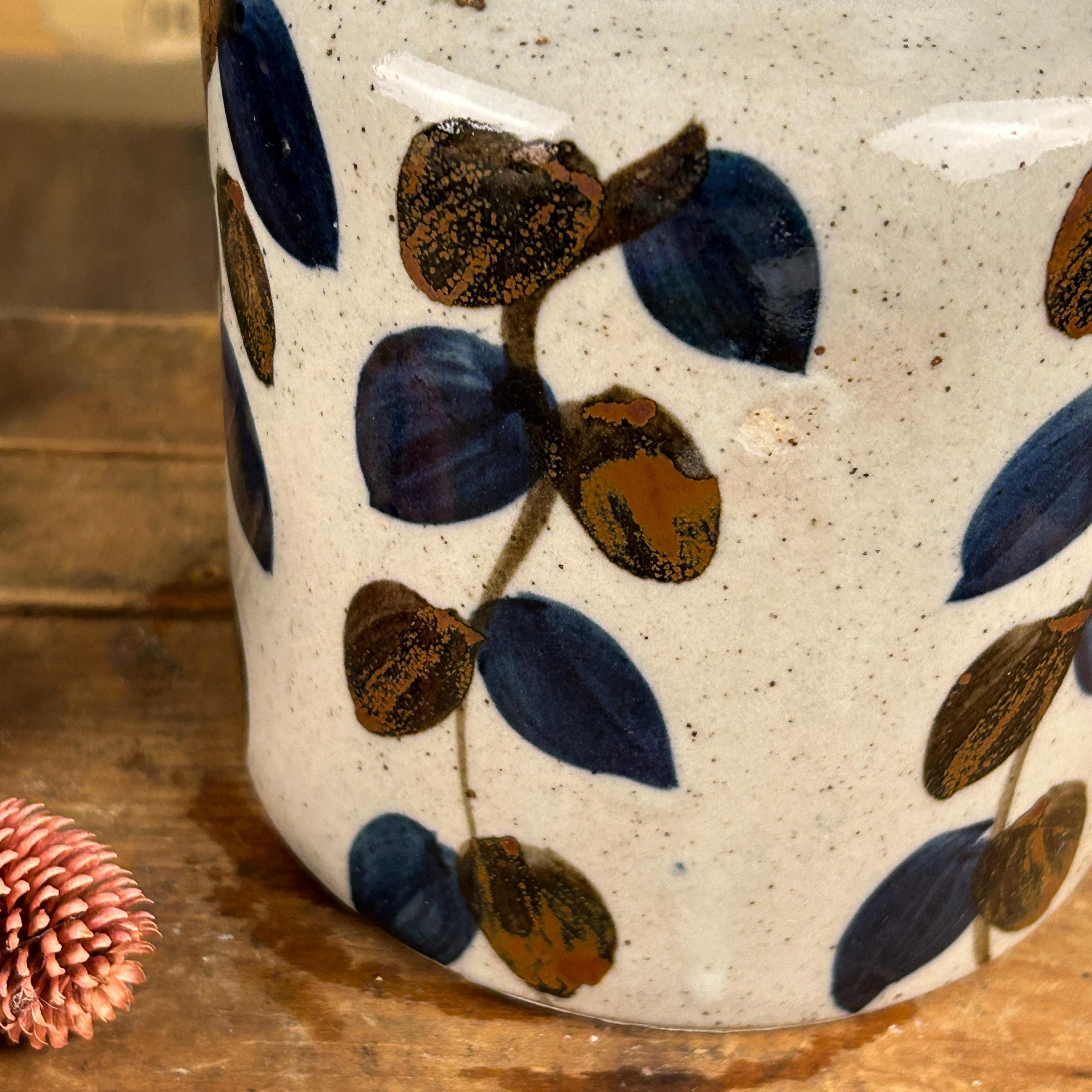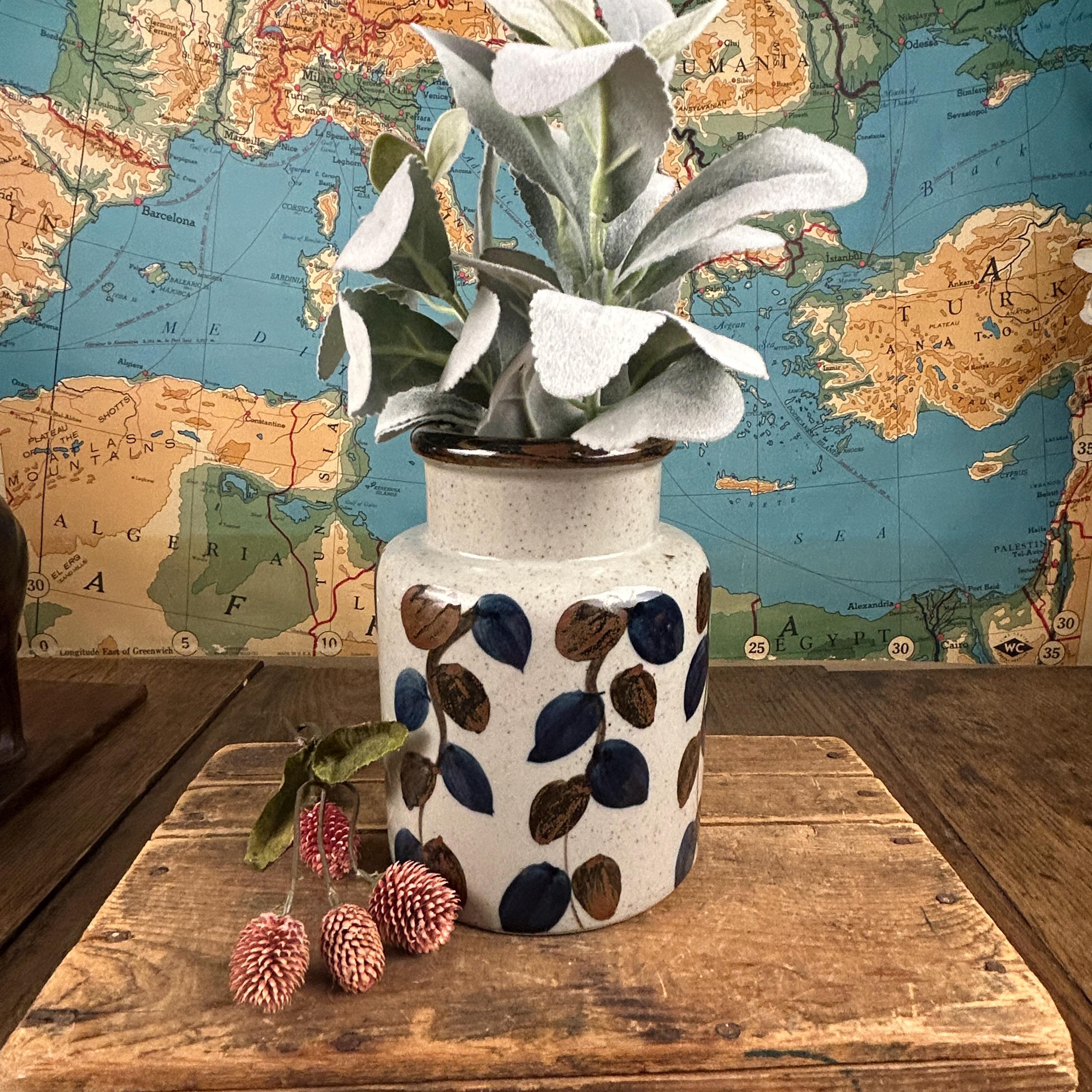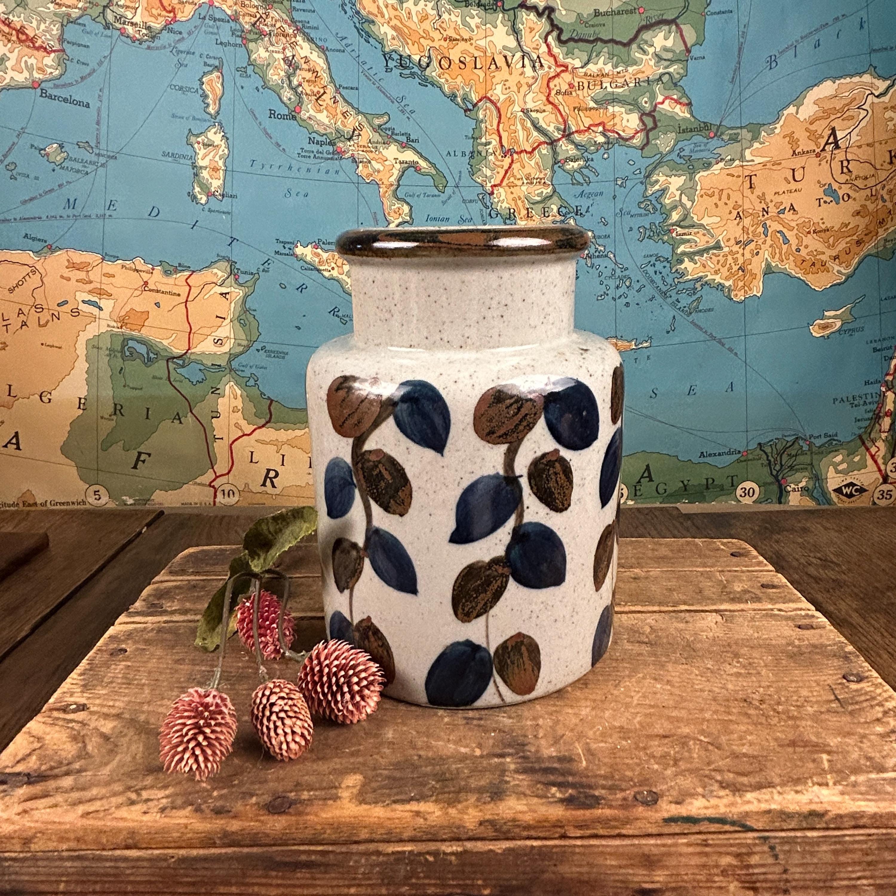 Stunning vintage stoneware vase by Ardco Fine Quality with a leaf/vine design all over. Handmade and hand-painted in Japan. The bottom still has felt covering. In great pre-loved vintage condition, no chips or cracks or crazing. Very clean. Please see all photos as they are part of the description.