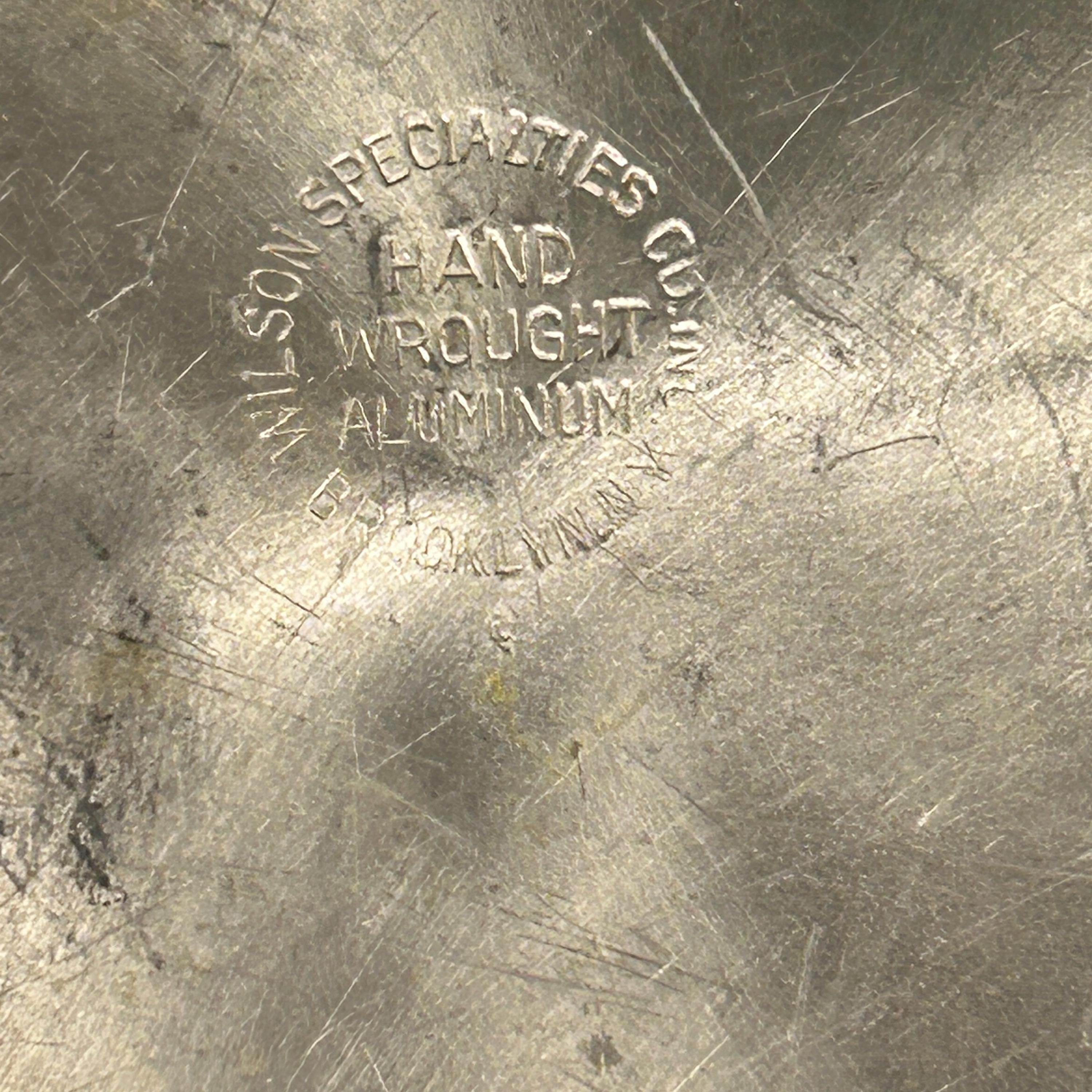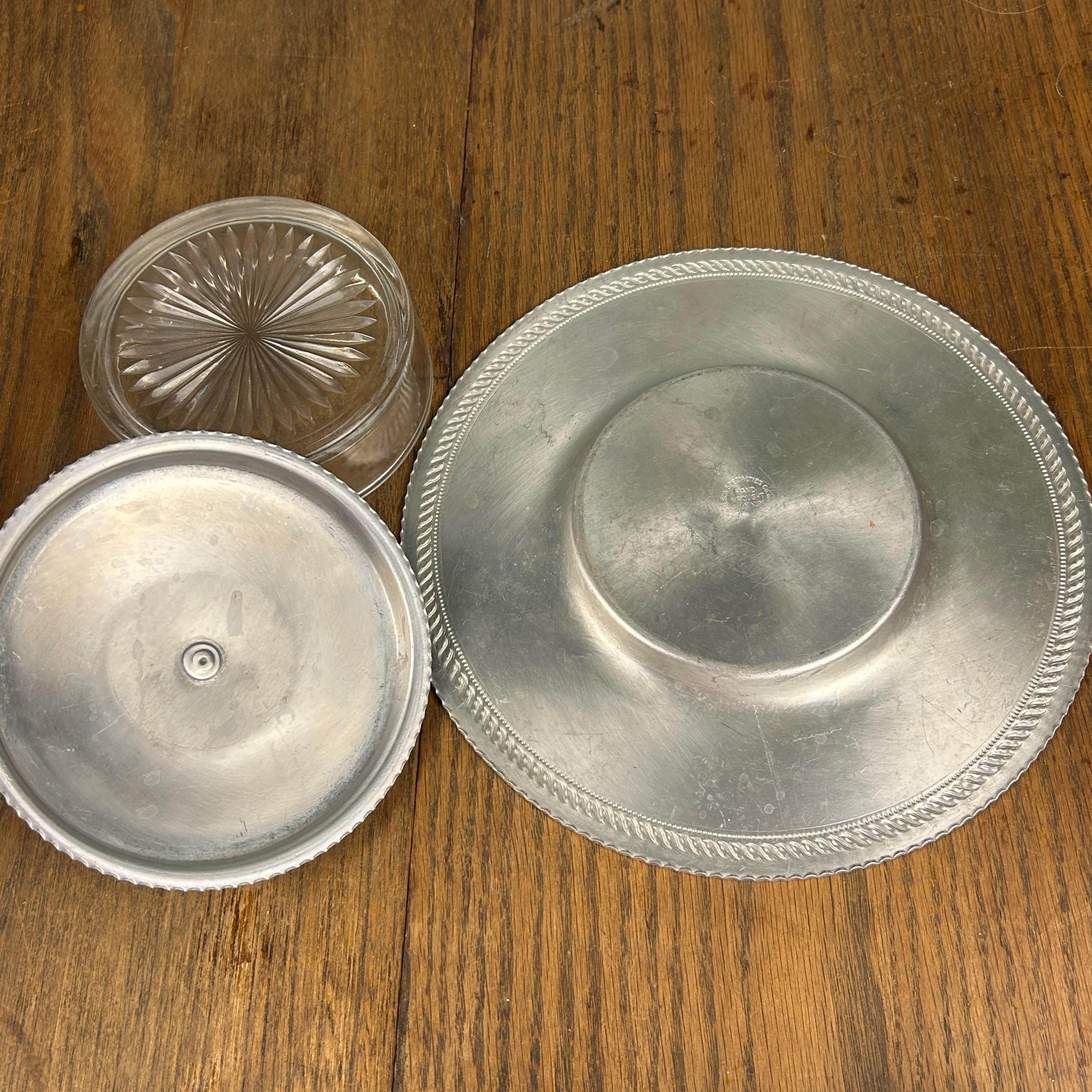 Plate underneath measures 9" in diameter and the glass dish sits perfectly inside the well of the plate. Marked on the back is Wilson Specialties Hand Wrought Aluminum.
