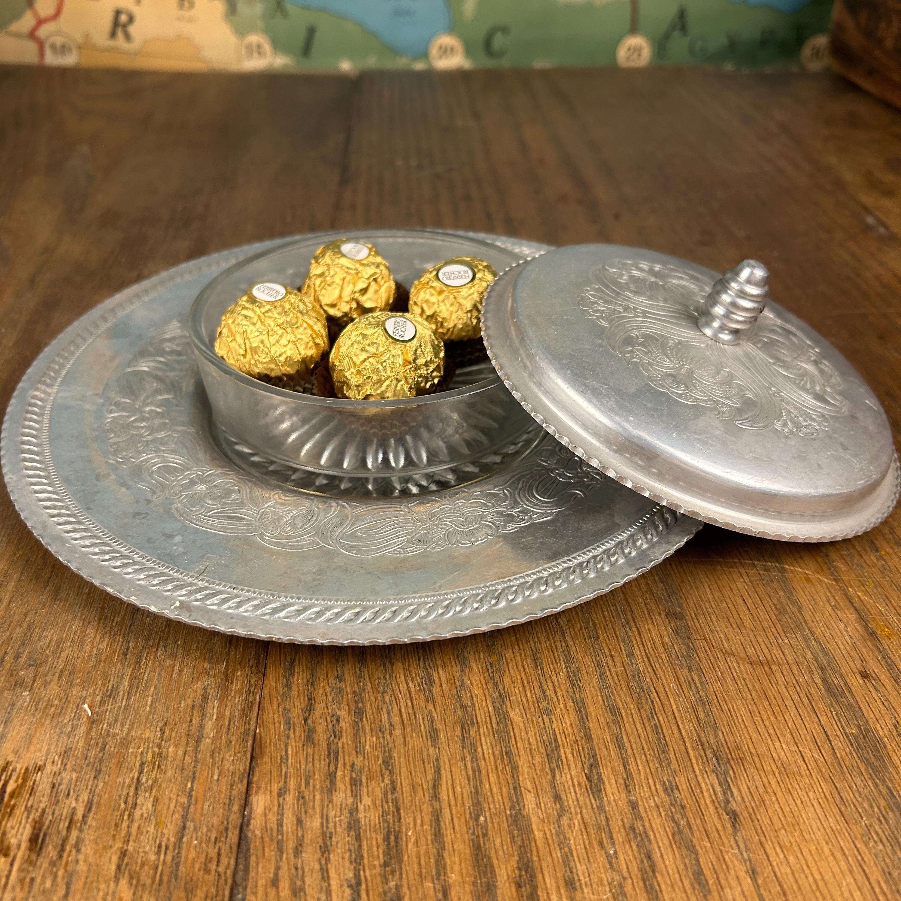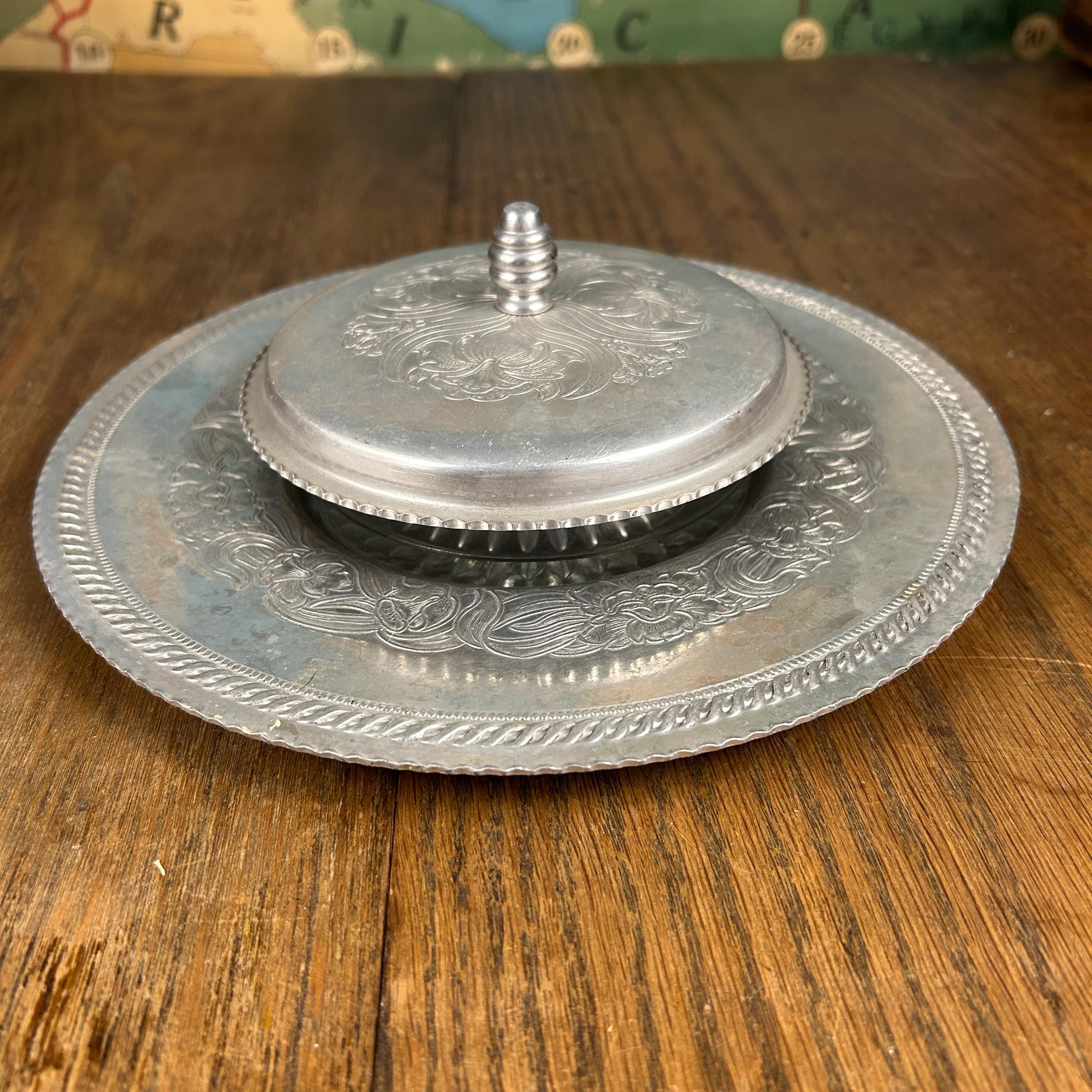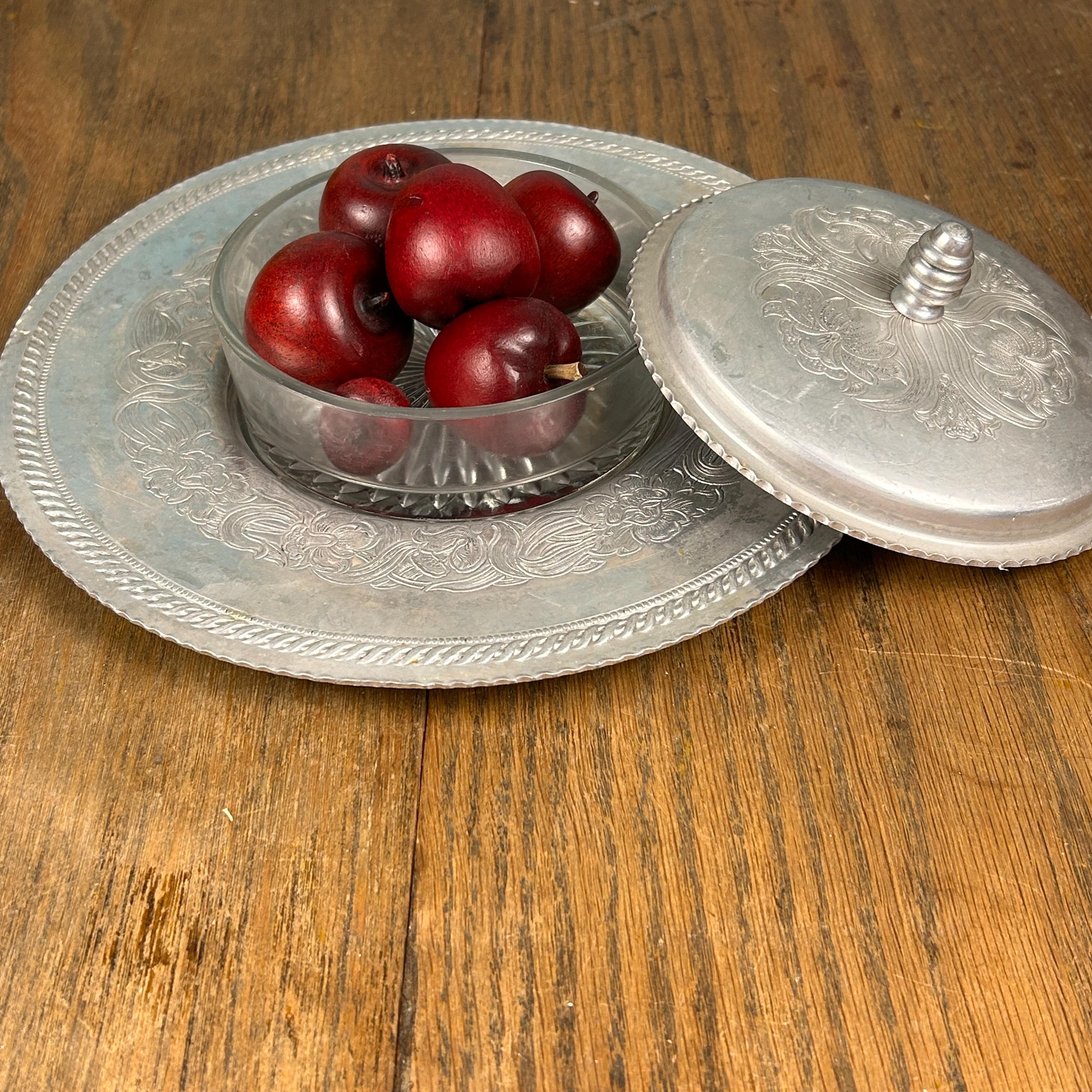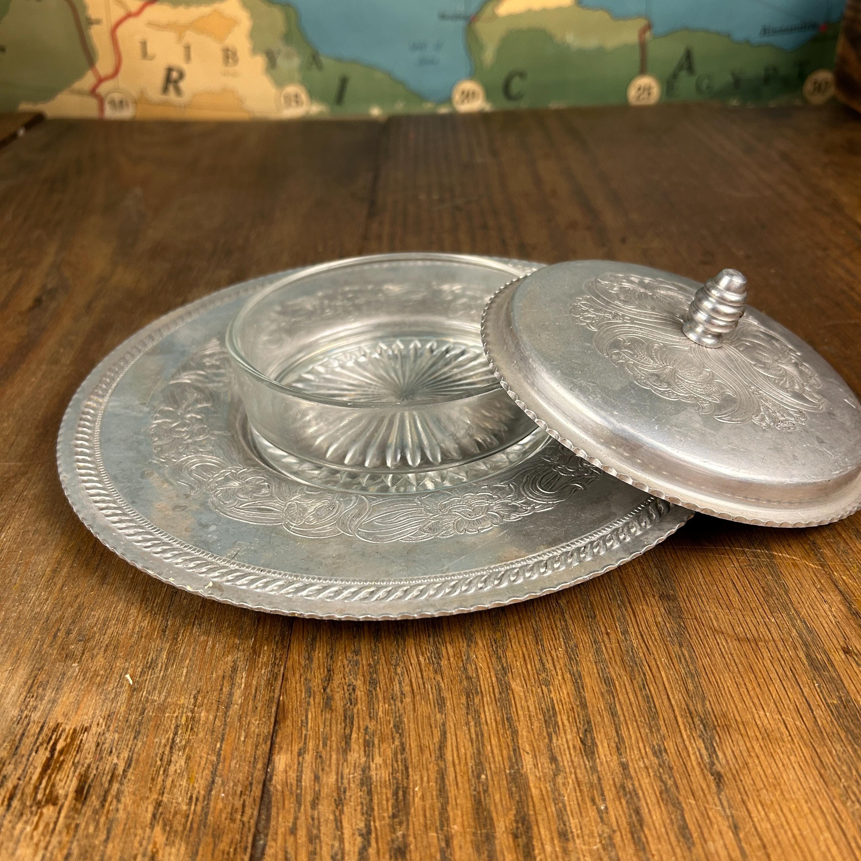 This vintage hand-wrought aluminum dish with lid is hammered with designs of florals and swirls. It has a well and a scalloped rim. The serving dish is made of glass and has a starburst pattern on the bottom.