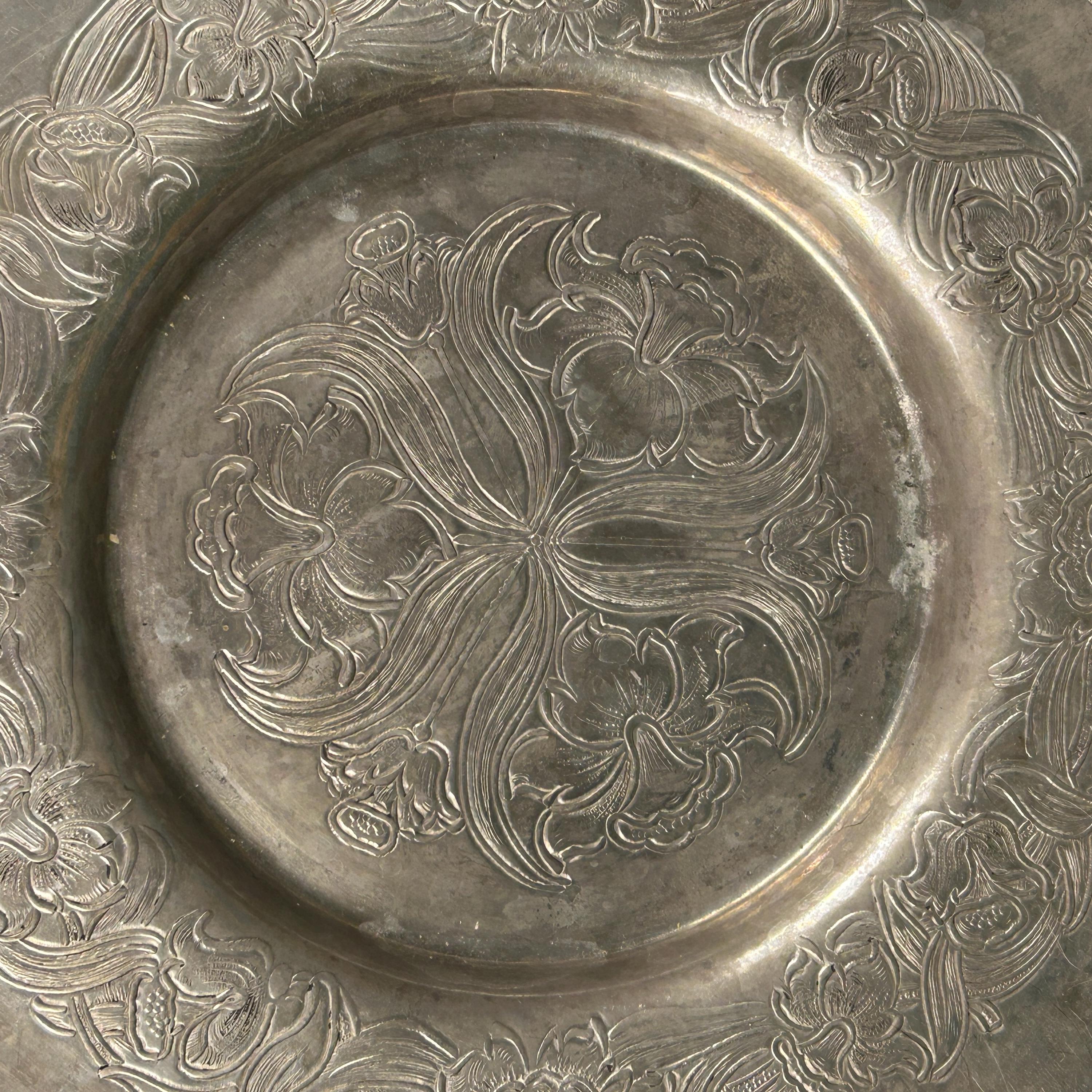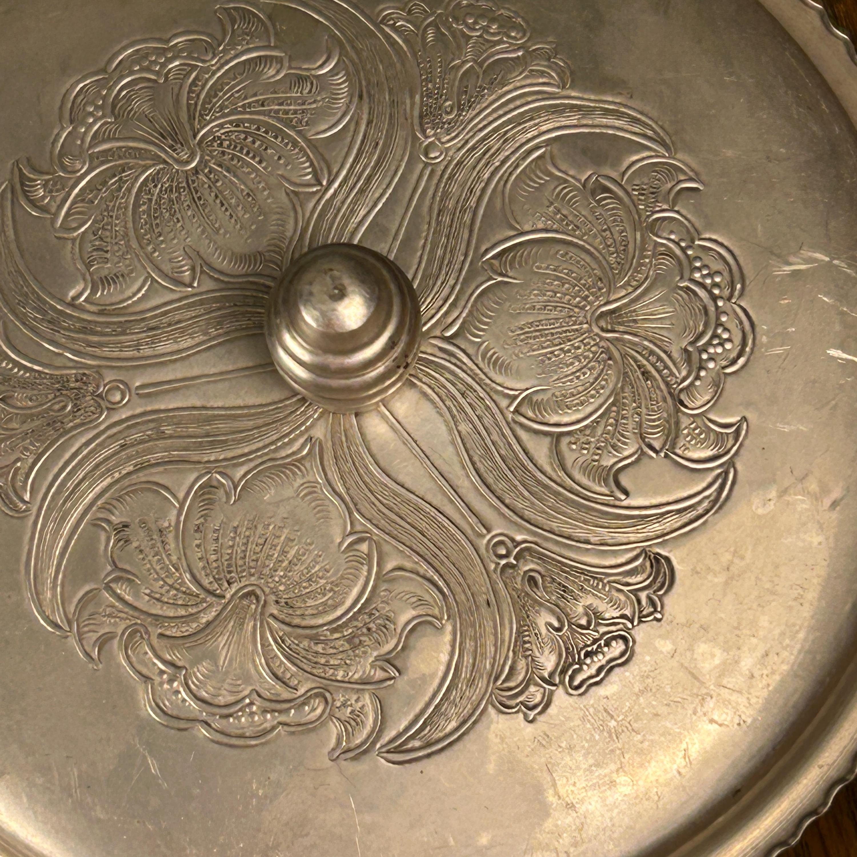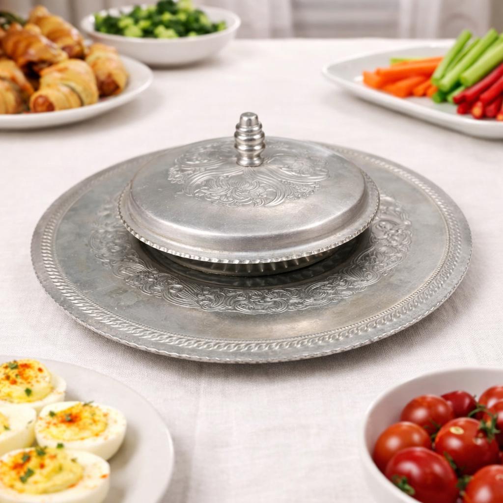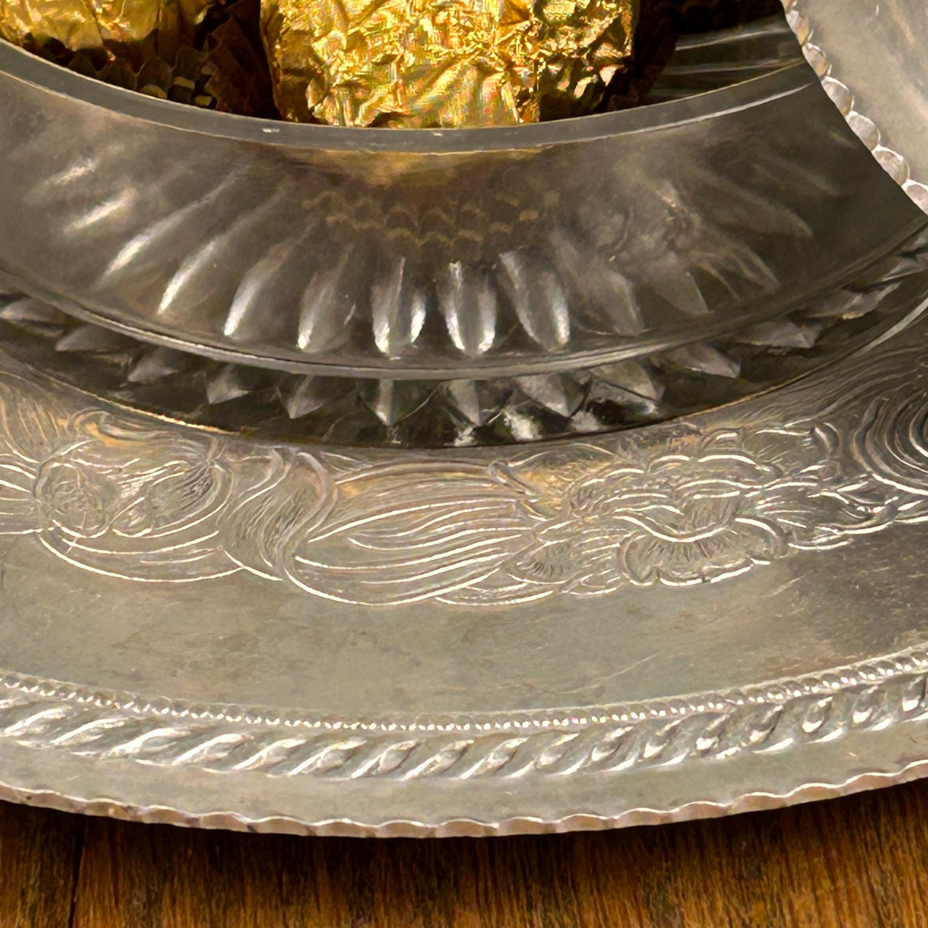 This vintage hand-wrought aluminum dish with lid is hammered with designs of florals and swirls. It has a well and a scalloped rim. The serving dish is made of glass and has a starburst pattern on the bottom.